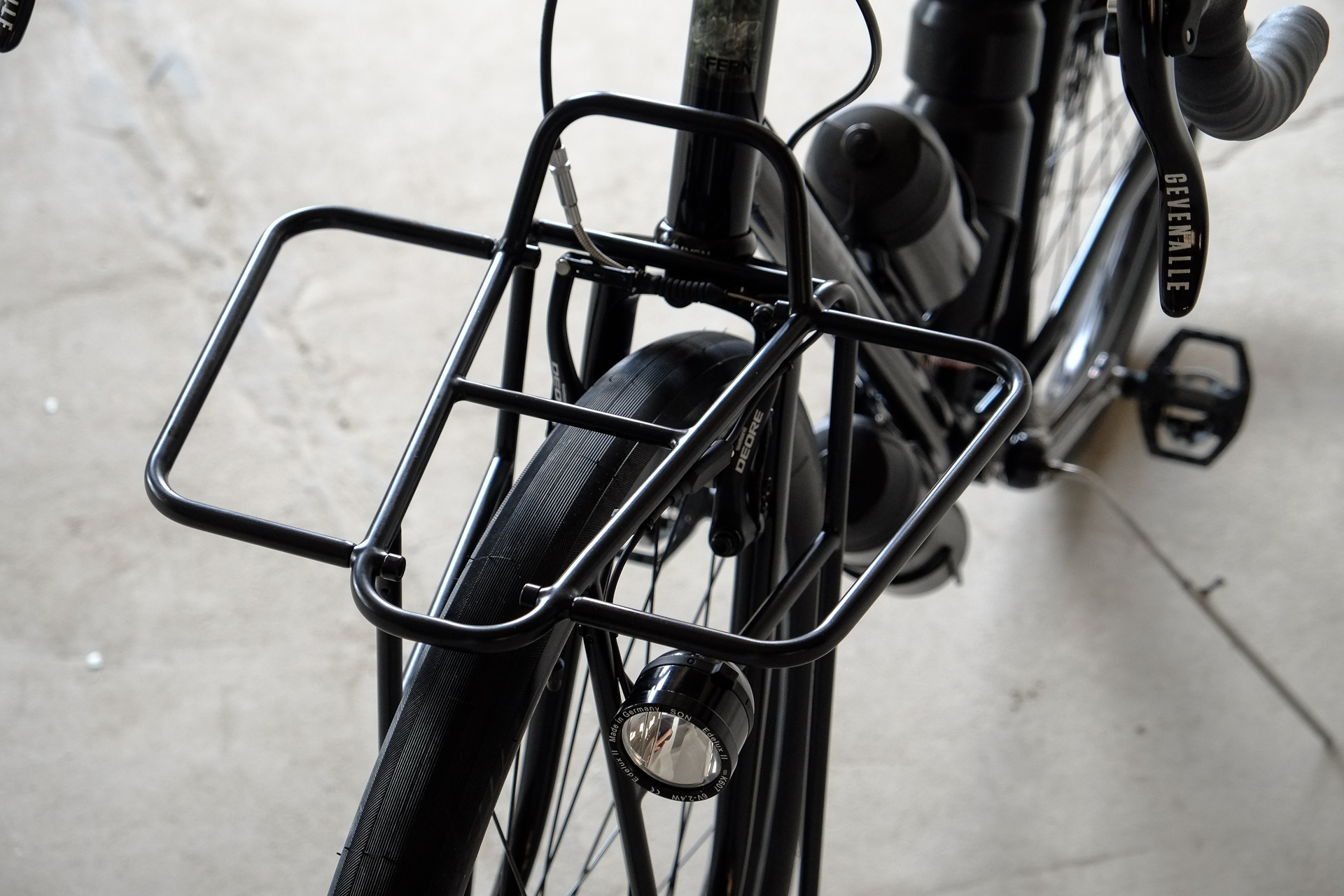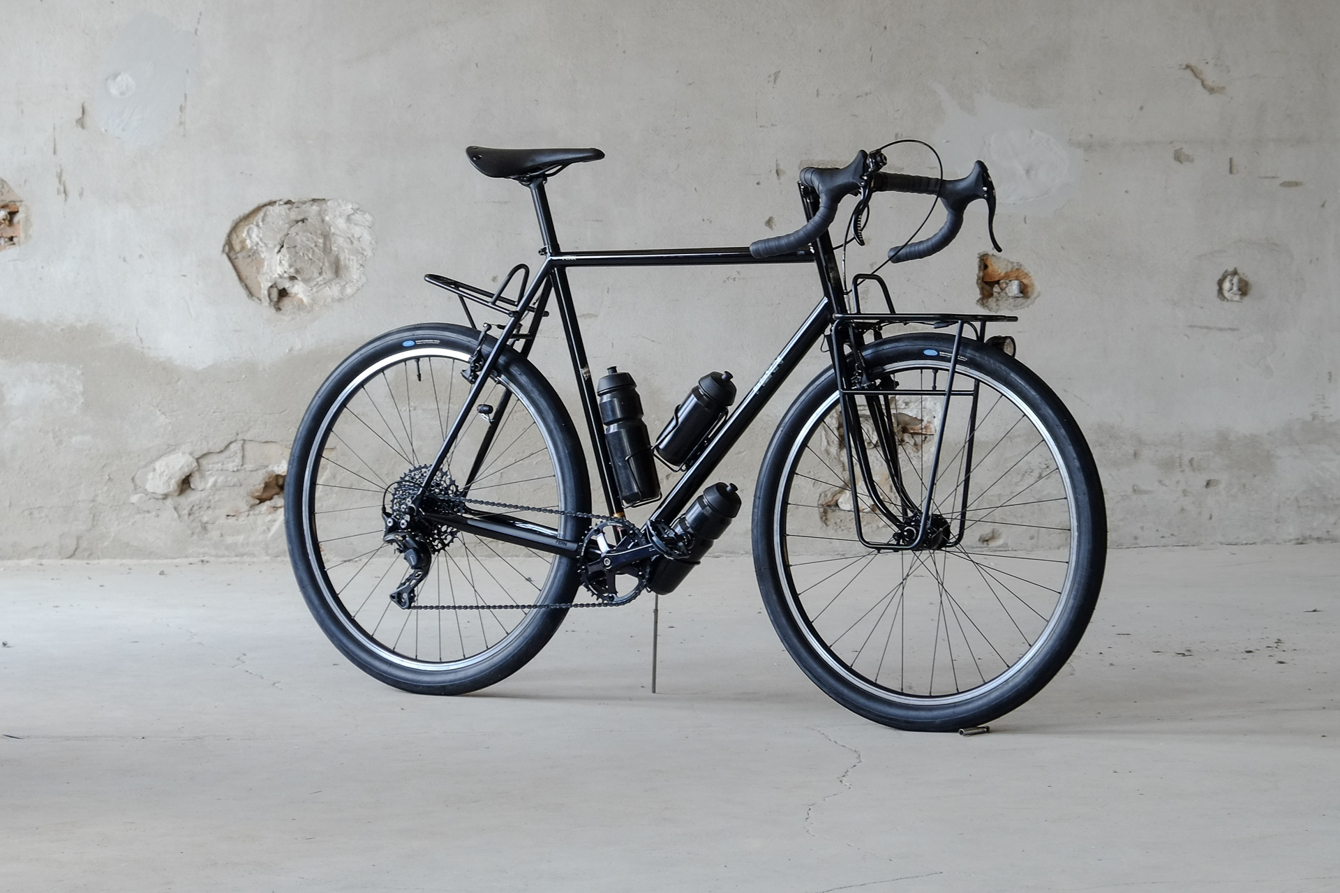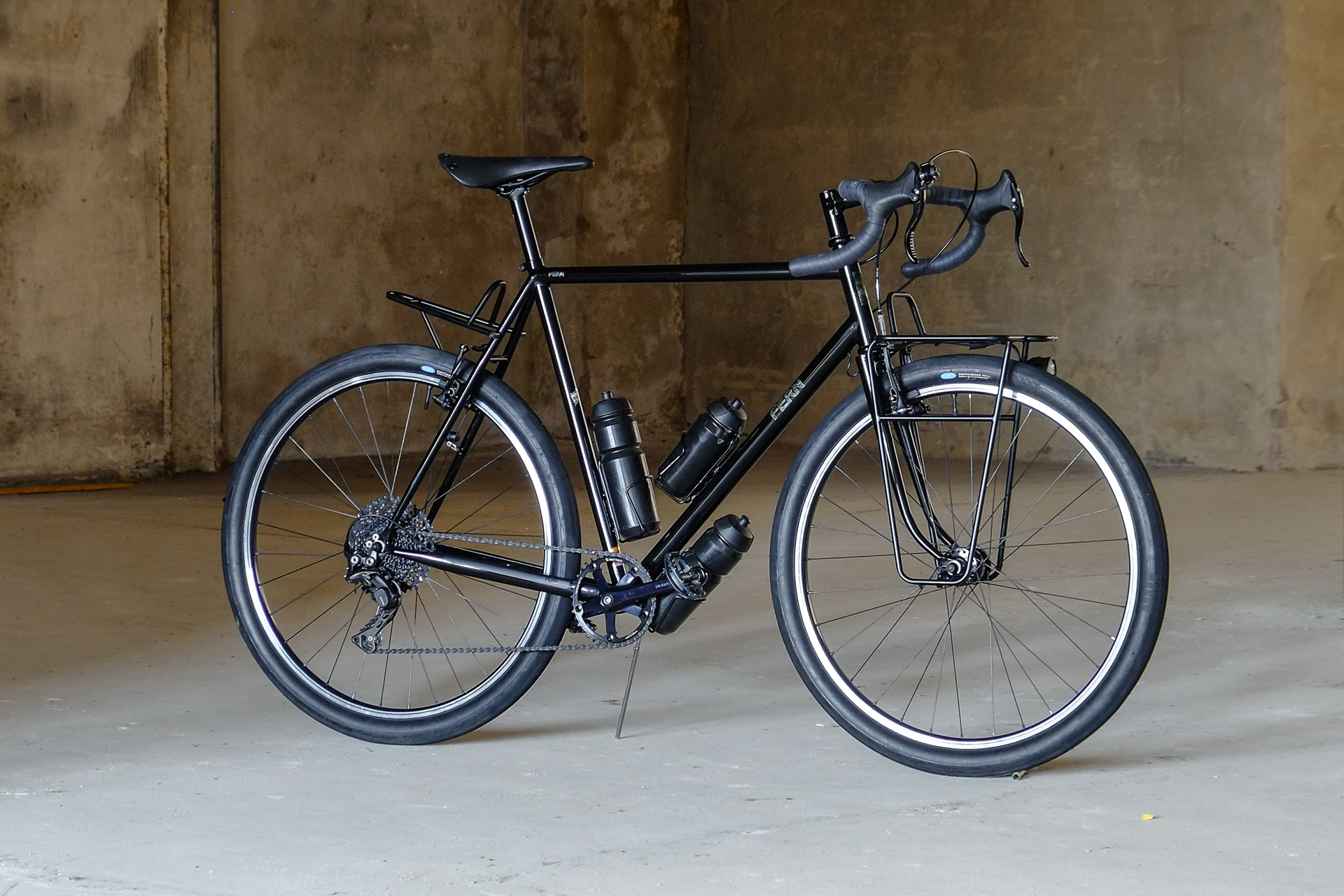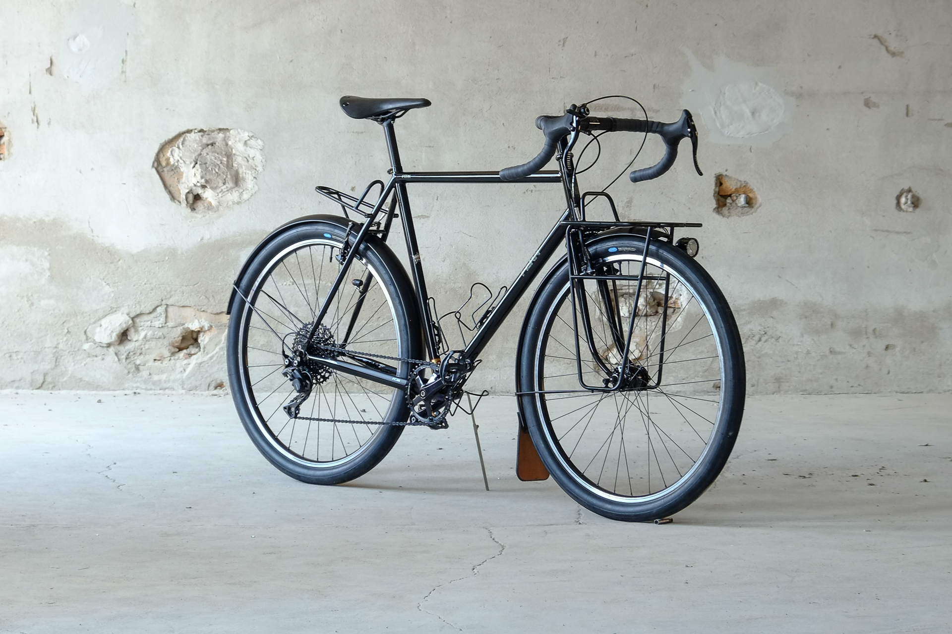 This aweseome steed we created for my man Valentin and is the newest addition to our line up of custom bikes, being a crossbreed of our infamous Chacha touring bike and the 650B Chuck allroadbike. Fully euipped with almost every Gramm bag available, you have ample room for whatever you need on long rides through the wild east. Supple galopping on Rene Herese Switchback Hill 48mm shoes, no matter if you're gravel riding through the prairie or back on smooth roads, you'll always be faster then the rest of the herd. The bike is equipped with a Gevenalle powered 1x11 Shimano drivetrain turned by a Wolftooth chainring mounted to a vintage custom anodized Dura Ace 7400 crankset. Fenders made by our friends at Cycles Berthoud, super comfy contact points by Brooks and ESI. Lights and power supply as usual by SON, Schmidt's Original Nabendynamo. Stems and racks are all made by Fern. Deep black fur made by our man Robert from Velociao . I can already see you riding into the sunset Valentin !