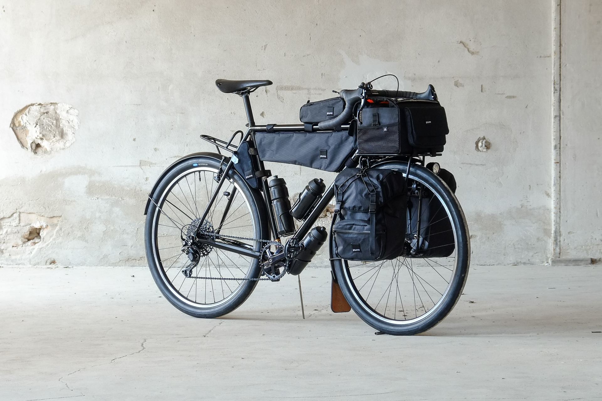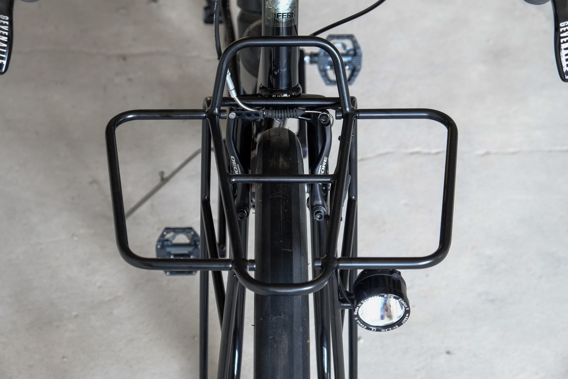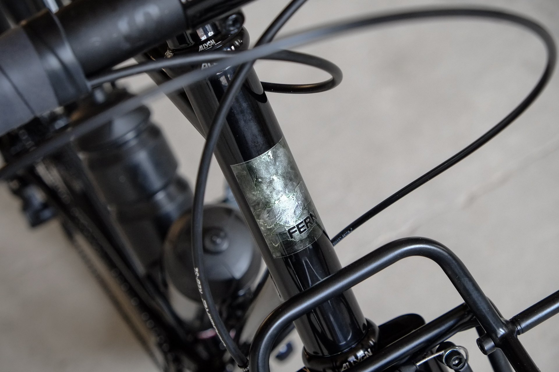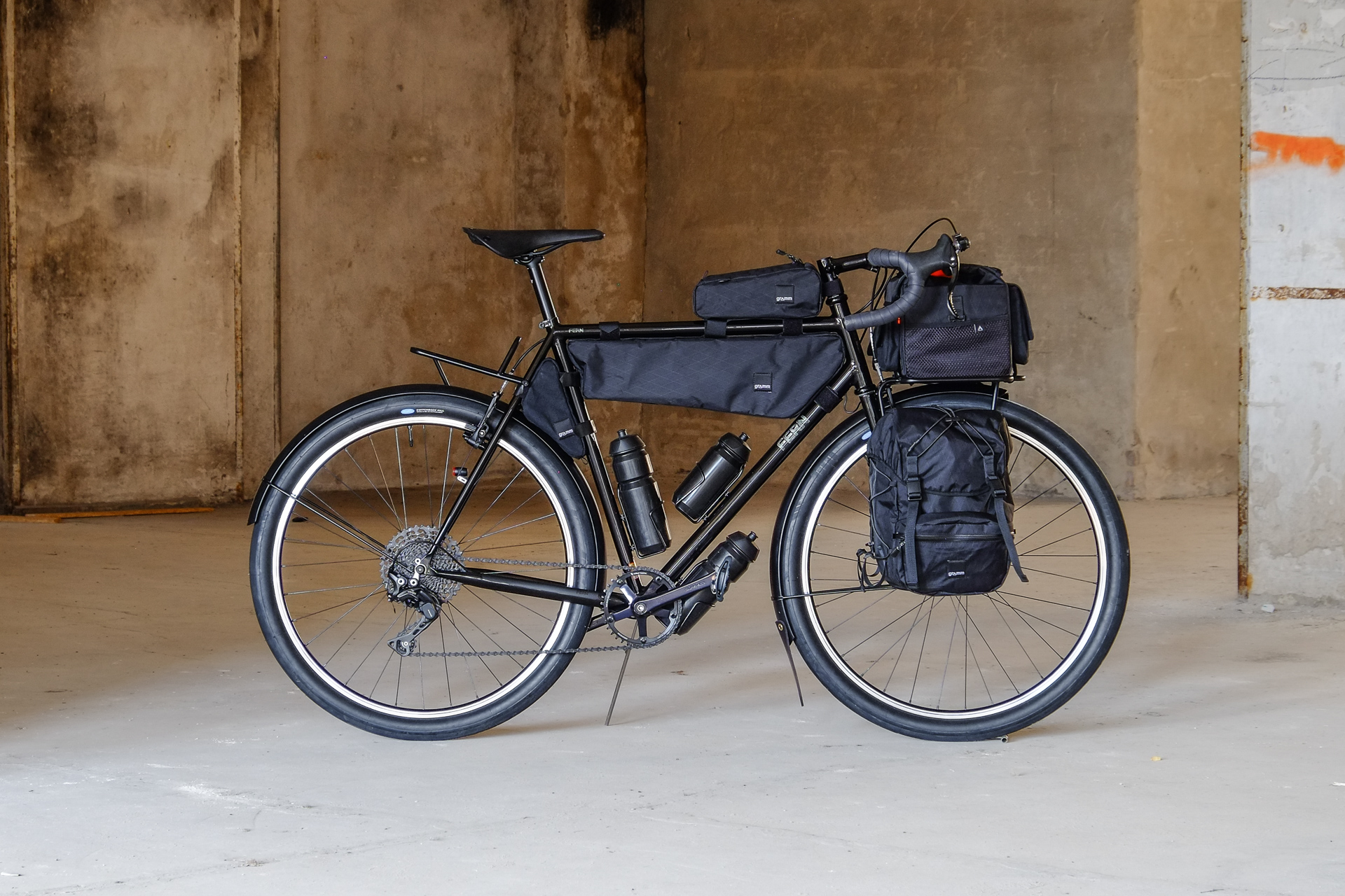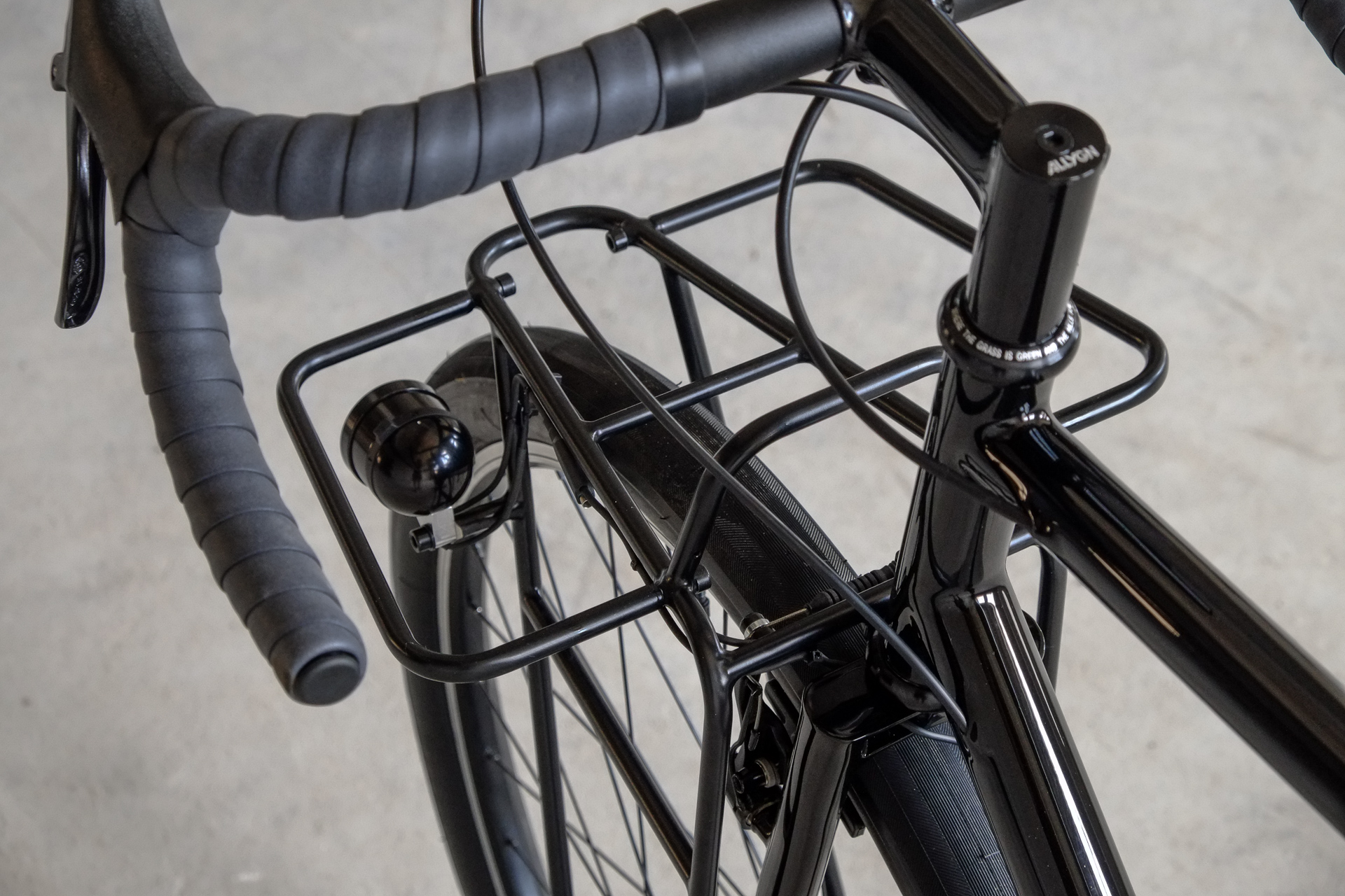 This aweseome steed we created for my man Valentin and is the newest addition to our line up of custom bikes, being a crossbreed of our infamous Chacha touring bike and the 650B Chuck allroadbike. Fully euipped with almost every Gramm bag available, you have ample room for whatever you need on long rides through the wild east. Supple galopping on Rene Herese Switchback Hill 48mm shoes, no matter if you're gravel riding through the prairie or back on smooth roads, you'll always be faster then the rest of the herd. The bike is equipped with a Gevenalle powered 1x11 Shimano drivetrain turned by a Wolftooth chainring mounted to a vintage custom anodized Dura Ace 7400 crankset. Fenders made by our friends at Cycles Berthoud, super comfy contact points by Brooks and ESI. Lights and power supply as usual by SON, Schmidt's Original Nabendynamo. Stems and racks are all made by Fern. Deep black fur made by our man Robert from Velociao . I can already see you riding into the sunset Valentin !