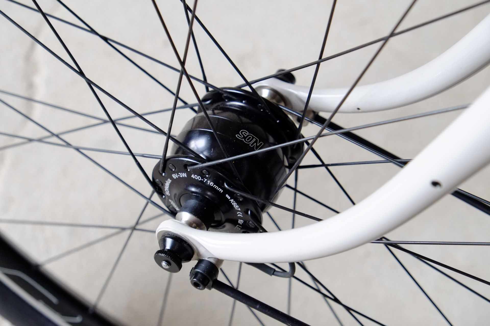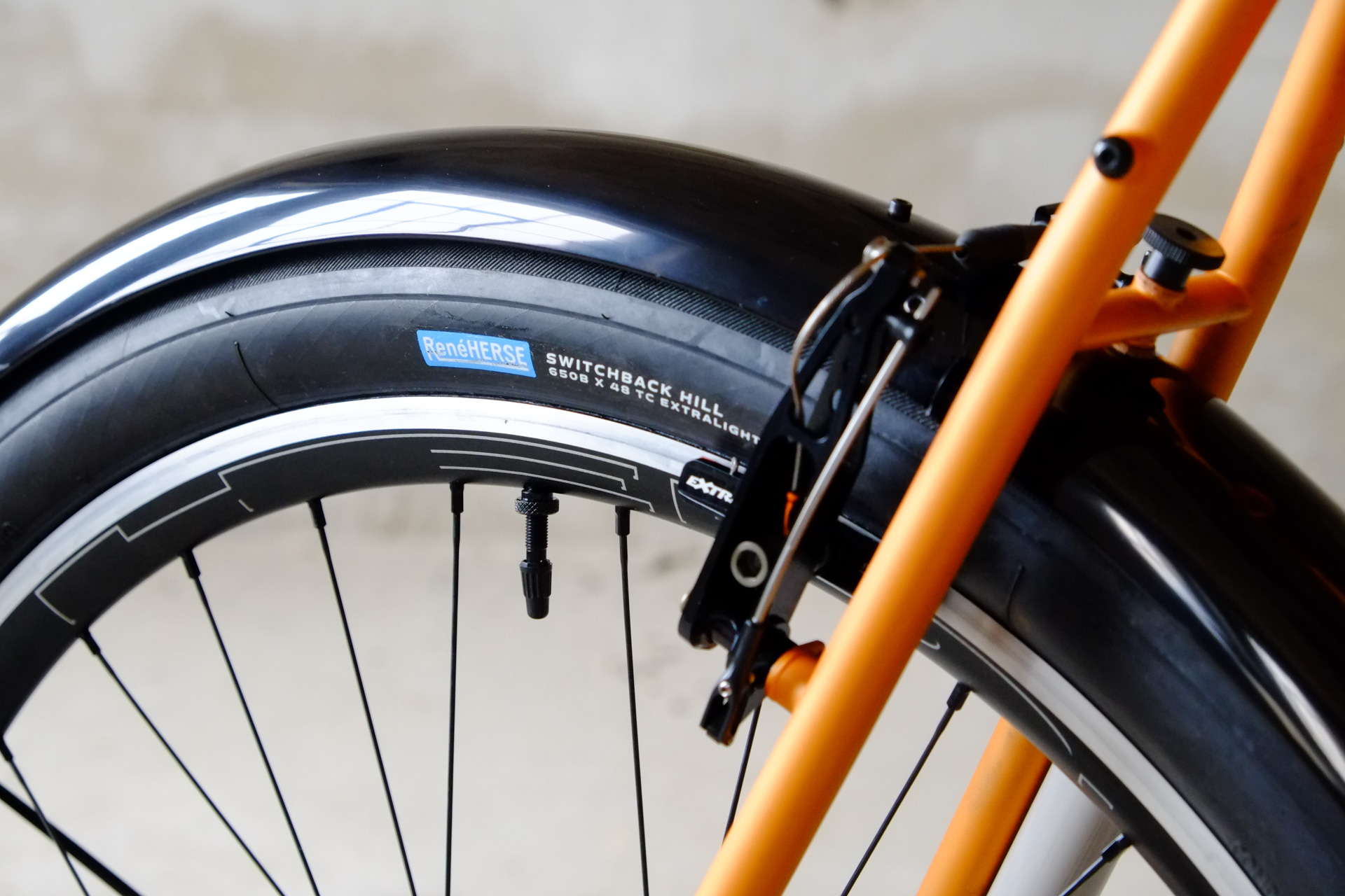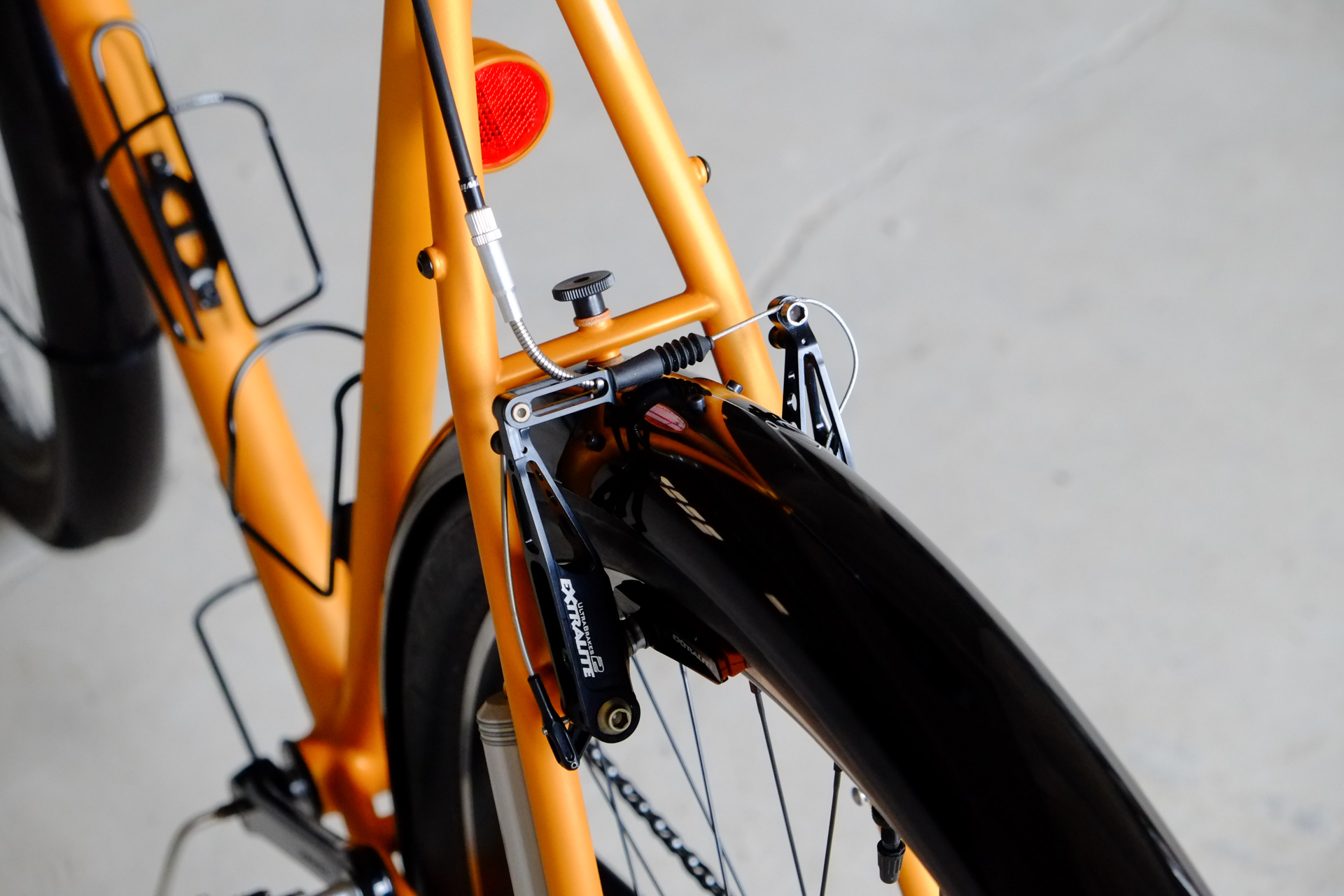 Superlight frame made from super thinwall Columbus life tubing, HED Belgium 650B rims with DT Swiss hub, rolling superfast on Rene Herse Switchback extralight tires, superbe V-brake performance made by Extralite, custom painted Rene Herse Tailight, rinkofied and custom black anodized Honjo fenders, custom black vintage Dura Ace crankset, shifting with Gevenalle, superlight Garbaruk cassette, Berthoud Cycles leather saddle, lights and power supply by SON, custom rinko downtube plug and so much more....