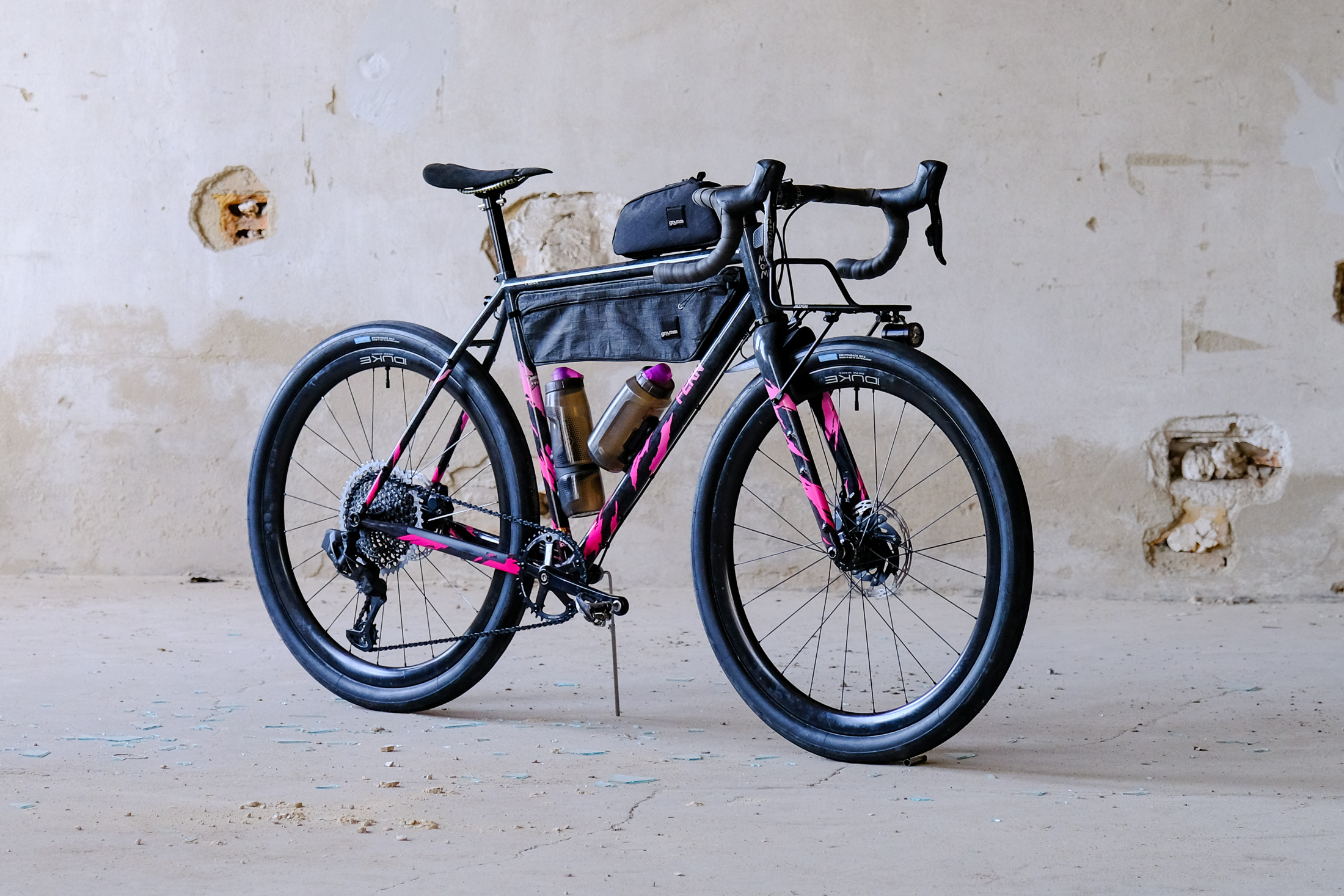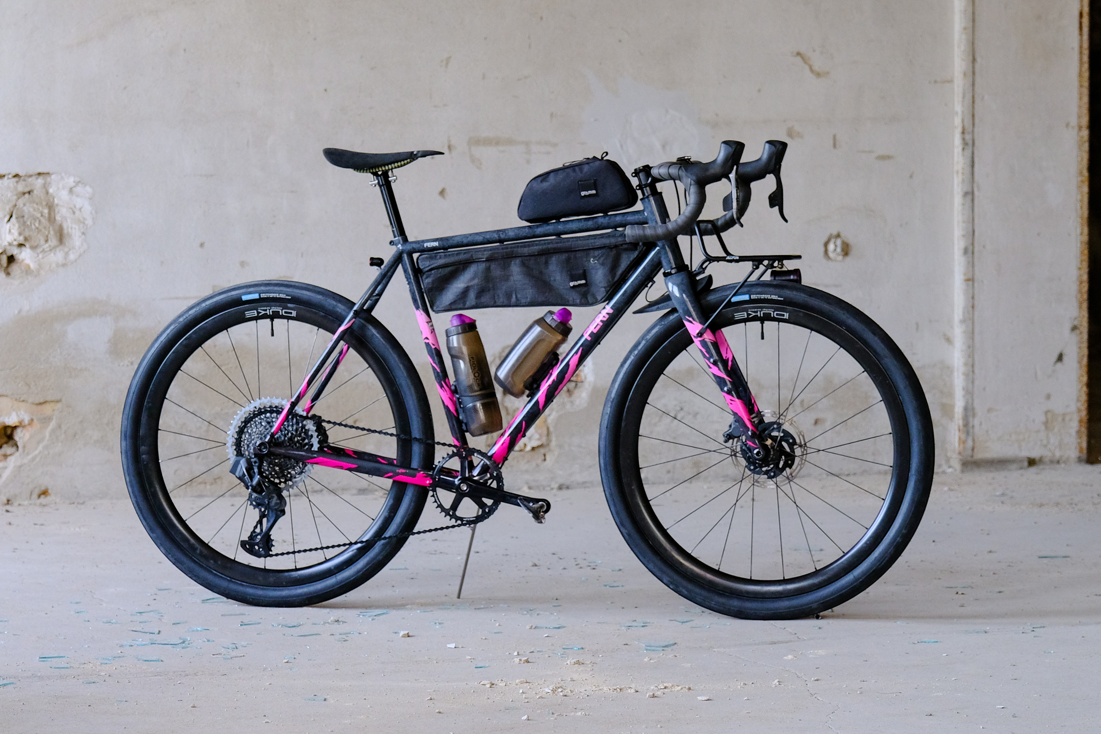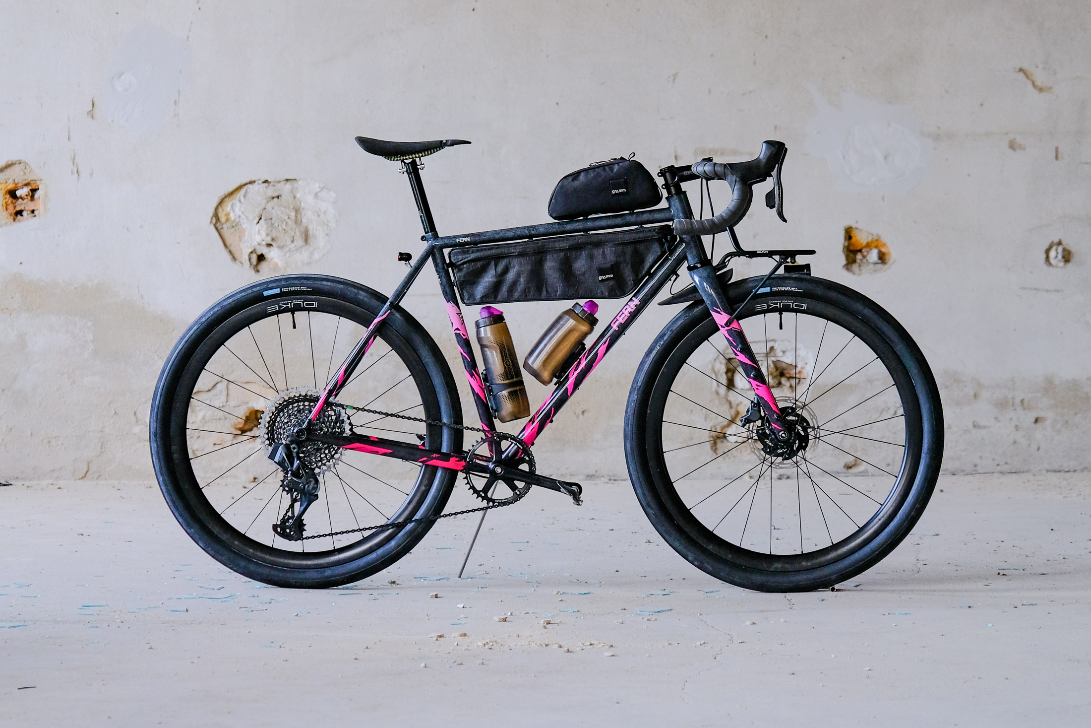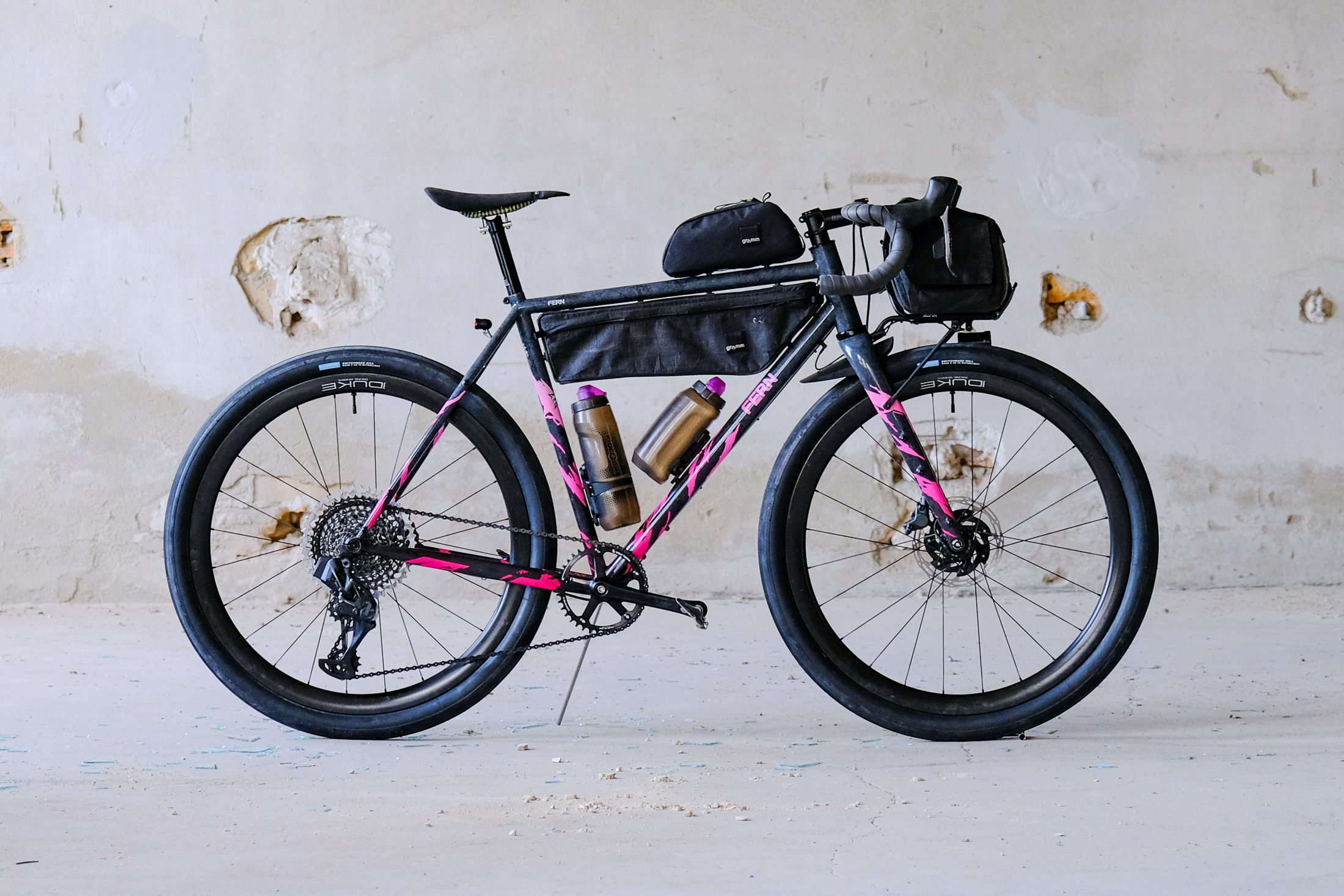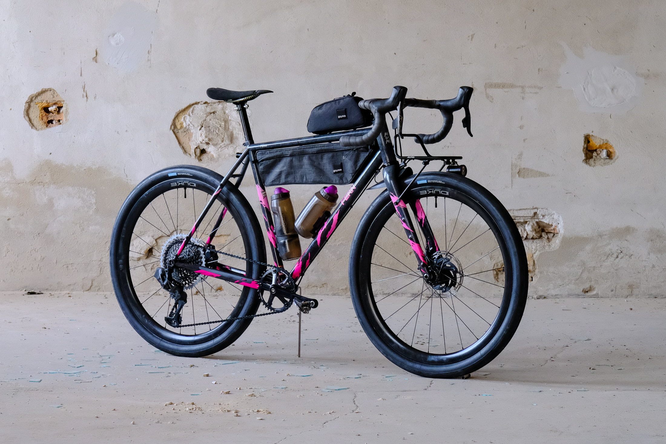 This fantastic bike I built for my long time friend Bengt Stiller, himself an avid ultra cyclist, photographer and book author. We met years ago back in 2016 at the Vienna Fahrradschau when Bengt was presenting the first issue of his new "Legends of Steel" book. We instantly became friends and it felt like we would have known each other already for years. Bengt moved here and there but we always kept in contact and so he became part of the Gramm and Fern family. Sponsored by Gramm Tourpacking, he successfully competed in many international ultra races such as the Silkroad-, Atlas Mountain Race and many others. For me it was always clear that at one point I would have to make a bike for Bengt and back in 2023 he decided to race the Hellenic Mountain Race and so we built a bike for that event. I threw in all my experience to make the very best all-road bike for him, light weight, fast and super versatile, as well as super comfortable for riding such ultra long distances as he does. His bike and geometry was a completely new development and after his extensive testing his prototype now became the blueprint for my latest generation of all-road bikes so far. The frame features super wide tire clearance for up to 2,4x650B tires which makes it technically into a mountain bike, but it could also be run with 700C and narrow tires which transforms it into a high performance gravel-, road- or randonneur bicycle. Truly a one-bike-for-everything concept and if you add all the racks and custom Gramm Tourpacking bags this bike will be your best travel companion for any longer bikepacking trip as well. The frame is made from the very best ultra thin wall tubing which Columbus has to offer and even though it's built for hard off-road riding I went for the limit in terms of making the lightest possible frame. Tune did its best to make the bike even lighter and threw in just the top of the line products they have to offer, sponsoring hubs, seatpost, saddle, stem and handlebar, pulling the weight of the complete build down to 9,9 kilograms. Not bad for a fully equipped steel bike with racks, lights and dynamo (mandatory it's a SON). After riding the bike now for more than two years without paint in order to be able to change some details on the frame if necessary, it became time to finally put some color on it. And here our friend Mario of Wideways, who works closely together with our buddies at Dlouhy Cycles, came into the game. Mario is a true artist and he did an amazing job of painting Bengt's bike in a flashy grey structure with bright pink flashy flash flashes, as only he could do! So Bengt my friend, I wish you many happy miles to come on your beautiful little Biest of the East, you little beast! ;) Special thanks go to Goetz at Dailybread Cycles and Rene Herse Tires, thanks to SON, SRAM and Duke for additional support.