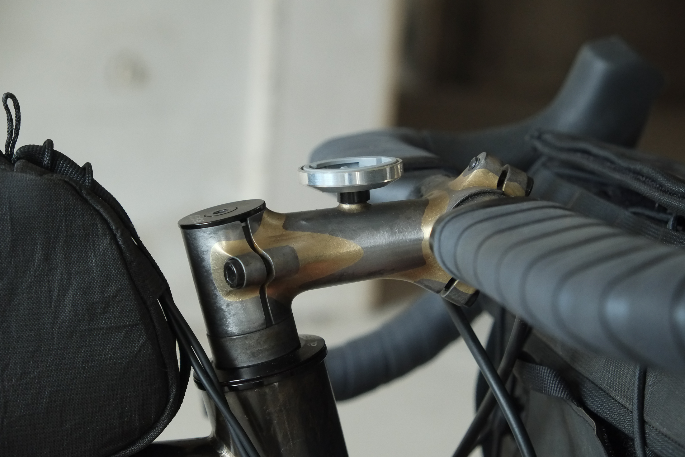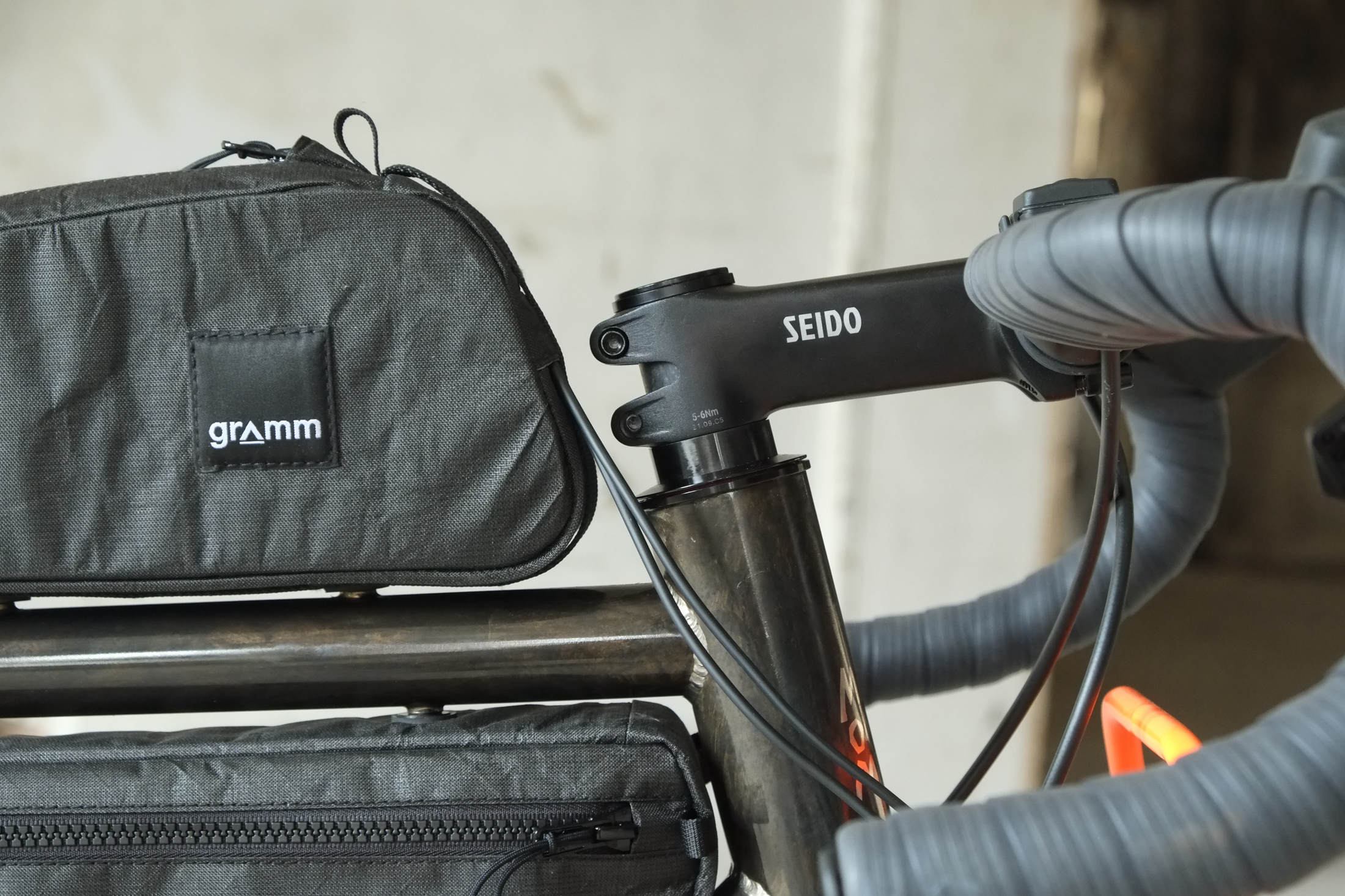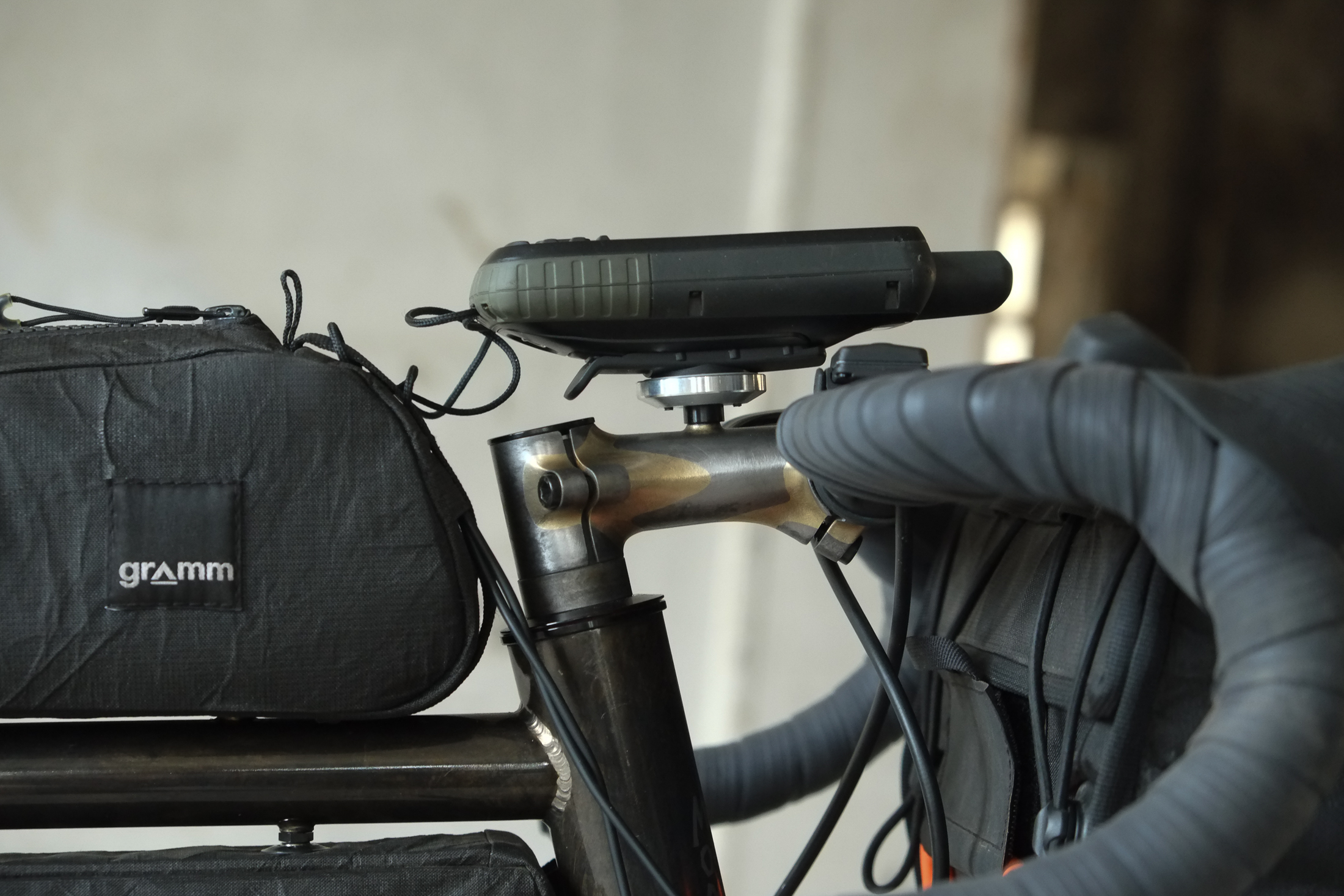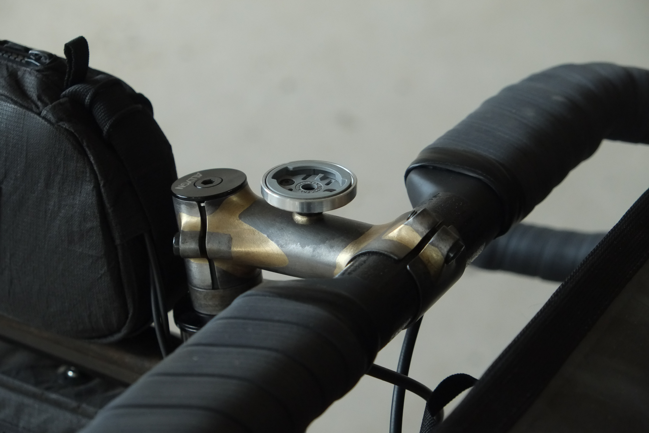 app. Obligatory Fern rinko downtube quick connector for easy frame packing on travels. The hand made custom fillet brazed stem features a integrated Garmin mount. The bike features just the very finest components available out there such as Tune seating parts, Deda cockpit, Seido carbon rims, Onyx silent rear hub, Sram AXS drivetrain, Ultradynamico tires, Hope brakes and not to forget, a complete set of the best bags in the world, made by Tine of Gramm Tourpacking! ;)