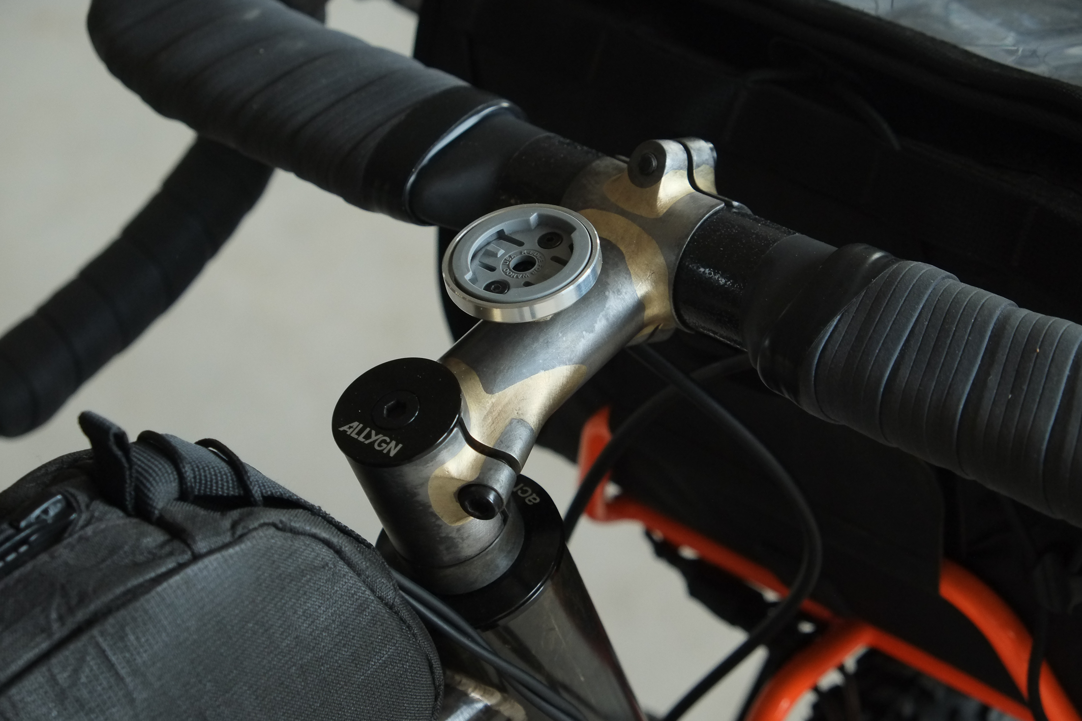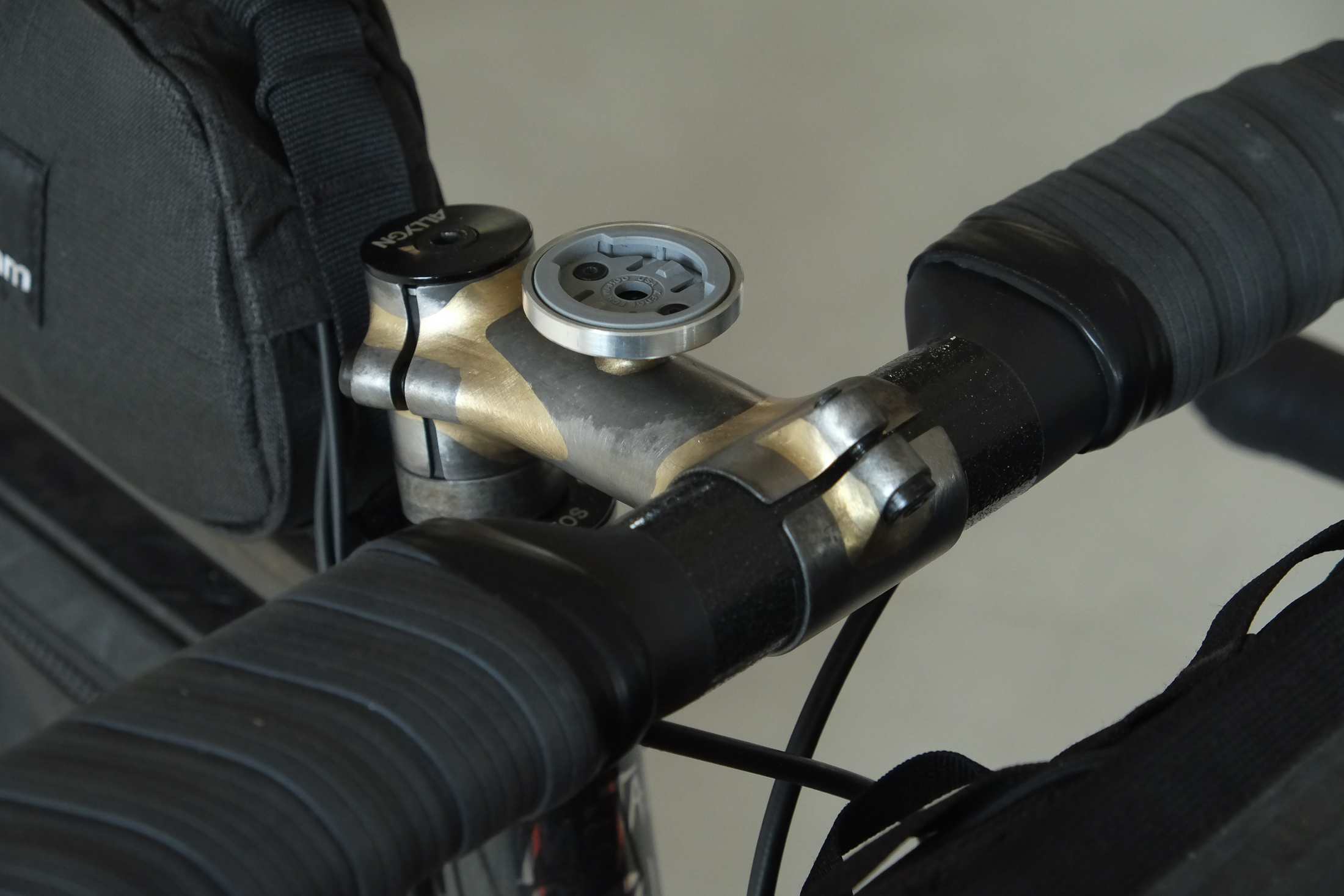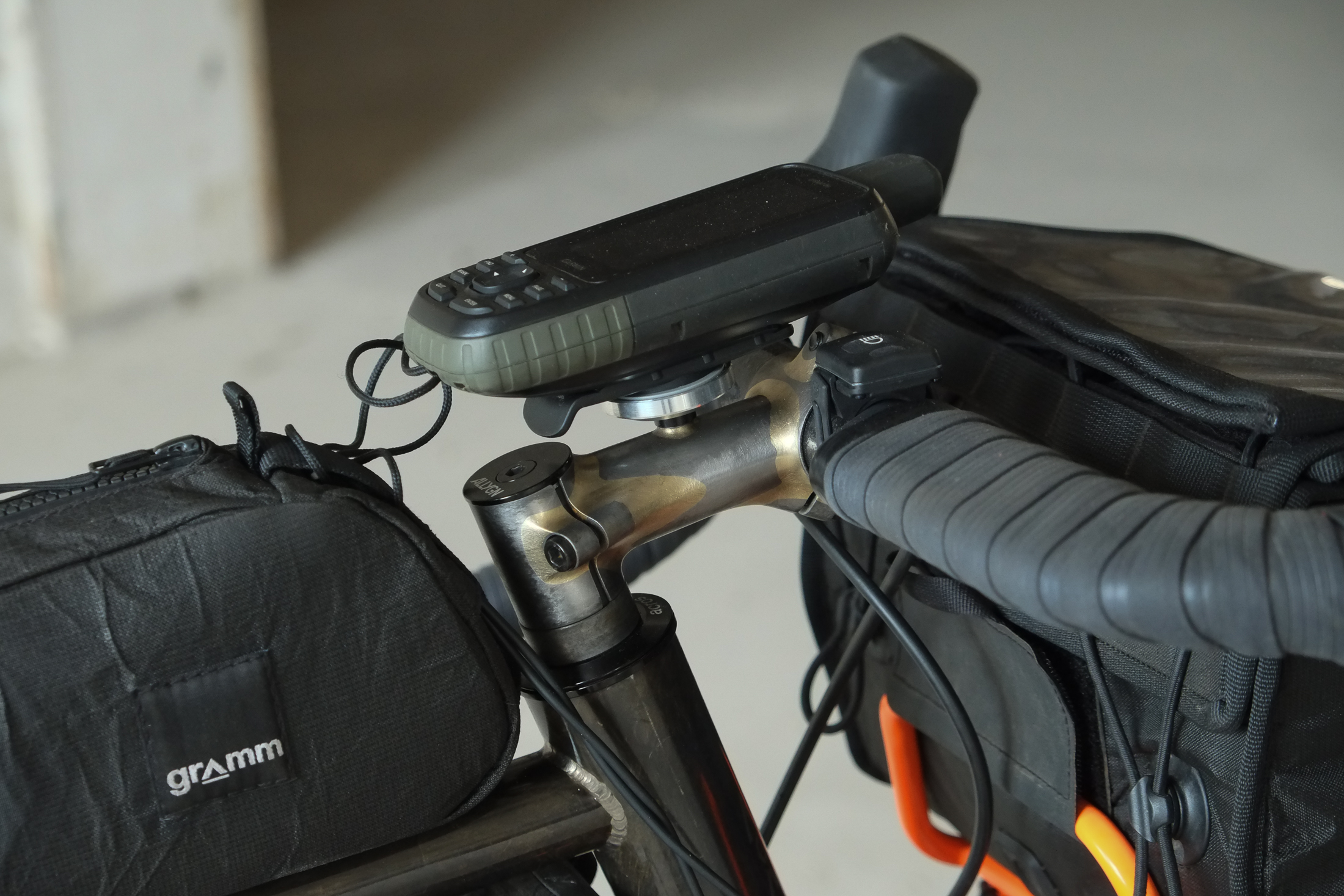 app. Obligatory Fern rinko downtube quick connector for easy frame packing on travels. The hand made custom fillet brazed stem features a integrated Garmin mount. The bike features just the very finest components available out there such as Tune seating parts, Deda cockpit, Seido carbon rims, Onyx silent rear hub, Sram AXS drivetrain, Ultradynamico tires, Hope brakes and not to forget, a complete set of the best bags in the world, made by Tine of Gramm Tourpacking! ;)