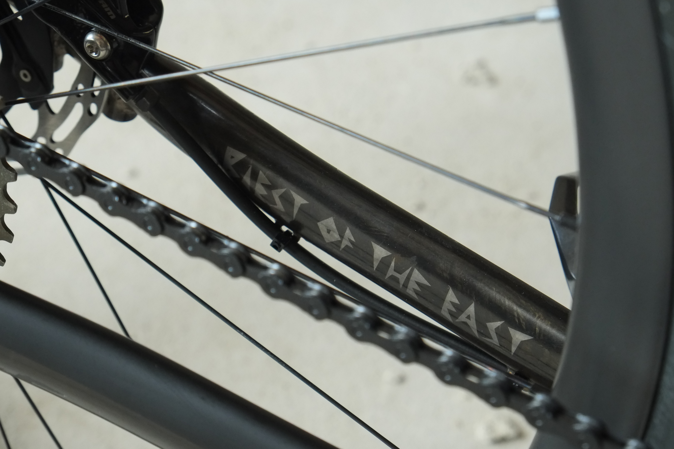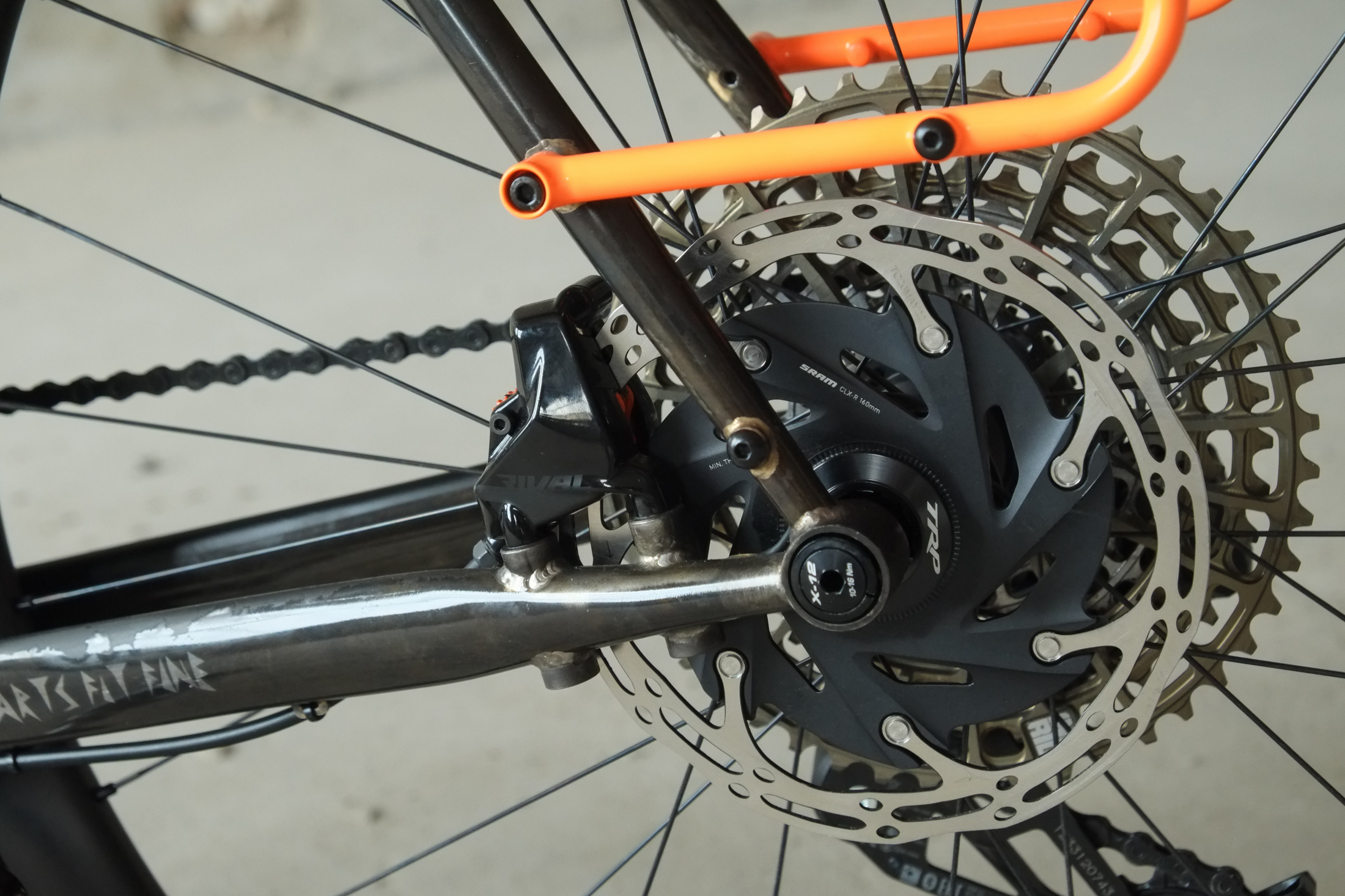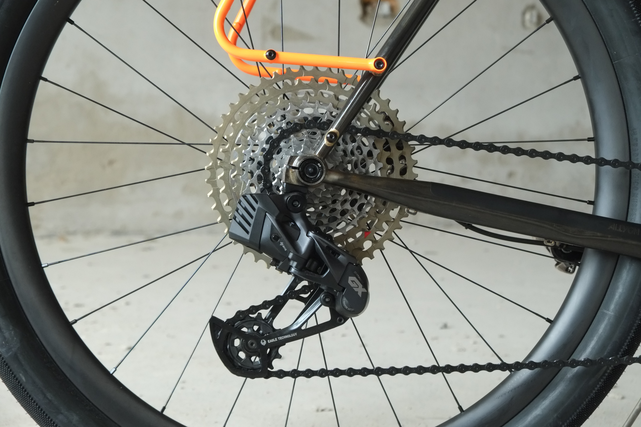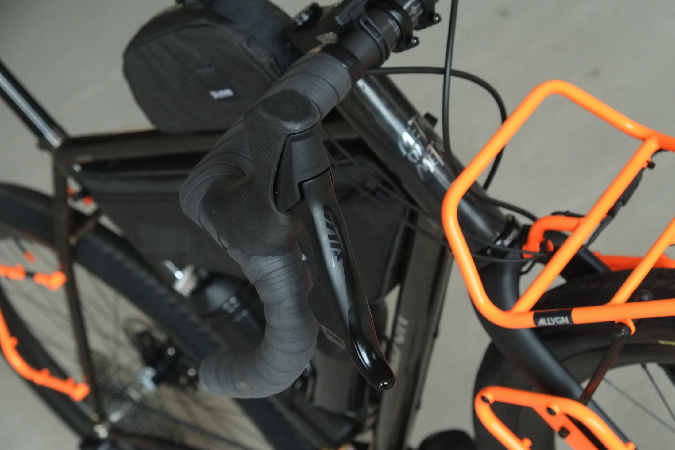app. Obligatory Fern rinko downtube quick connector for easy frame packing on travels. The hand made custom fillet brazed stem features a integrated Garmin mount. The bike features just the very finest components available out there such as Tune seating parts, Deda cockpit, Seido carbon rims, Onyx silent rear hub, Sram AXS drivetrain, Ultradynamico tires, Hope brakes and not to forget, a complete set of the best bags in the world, made by Tine of Gramm Tourpacking! ;)