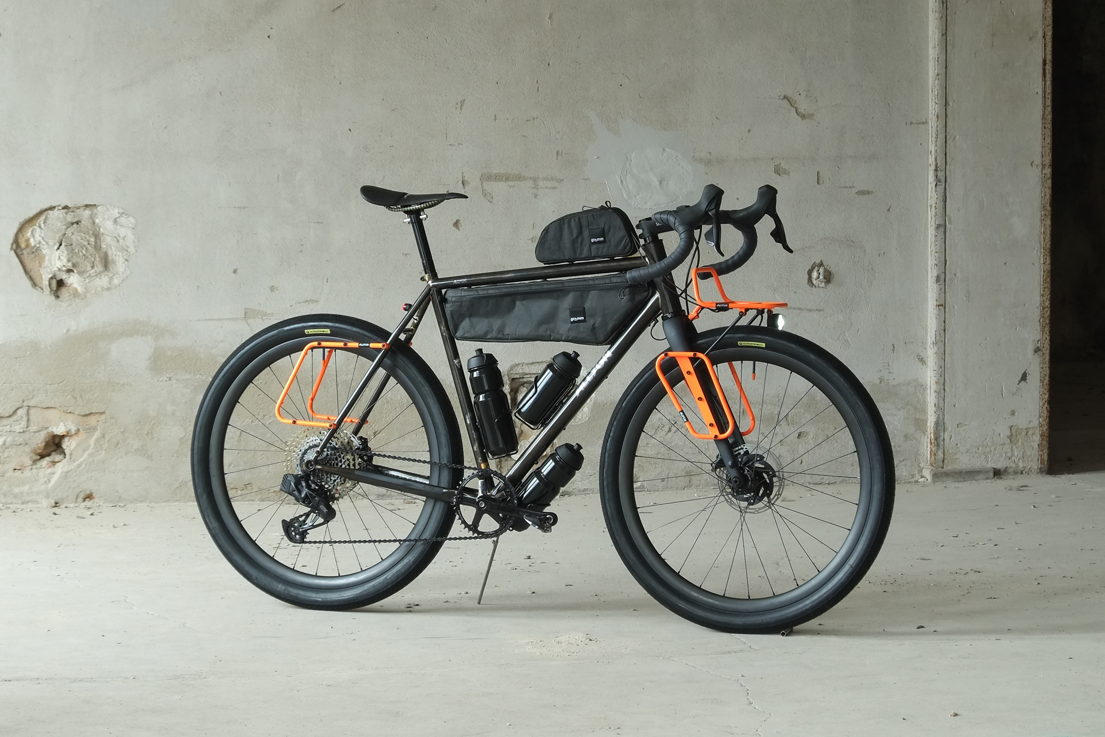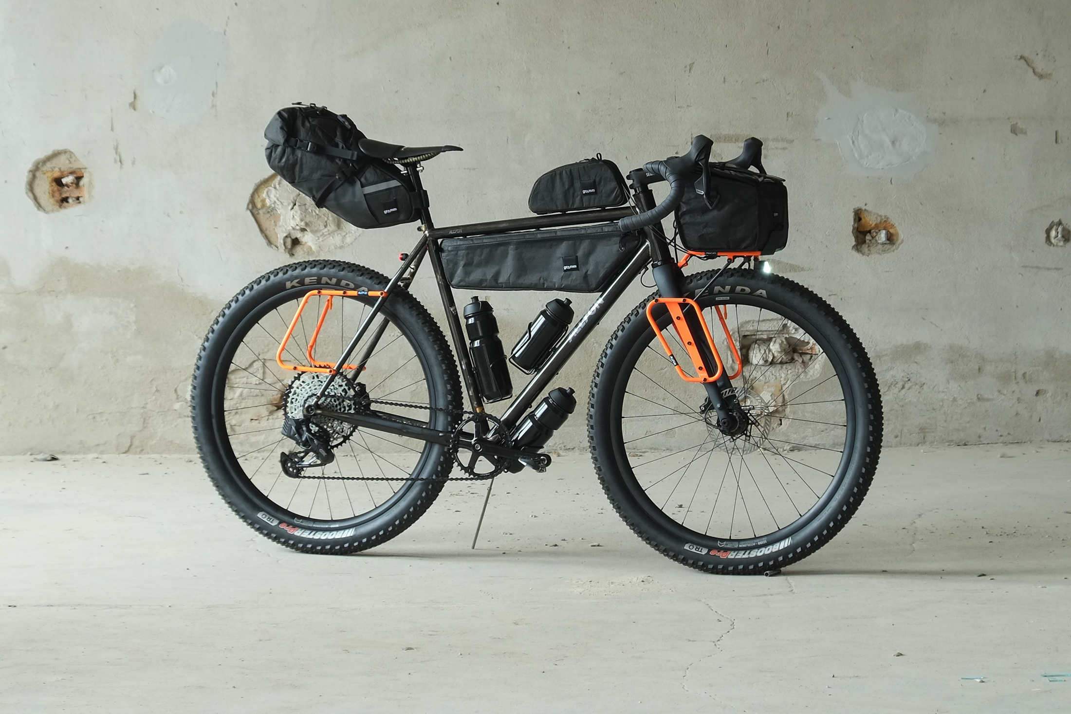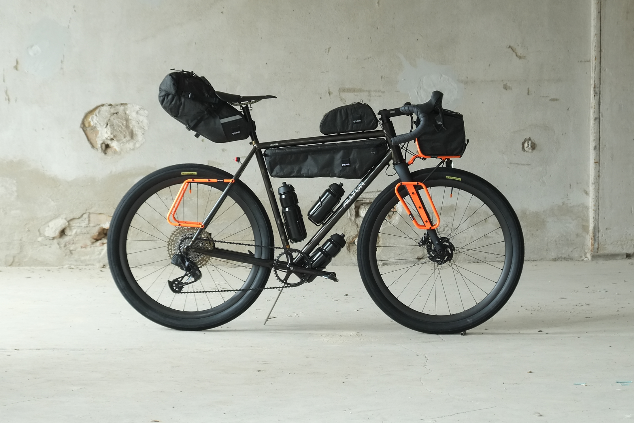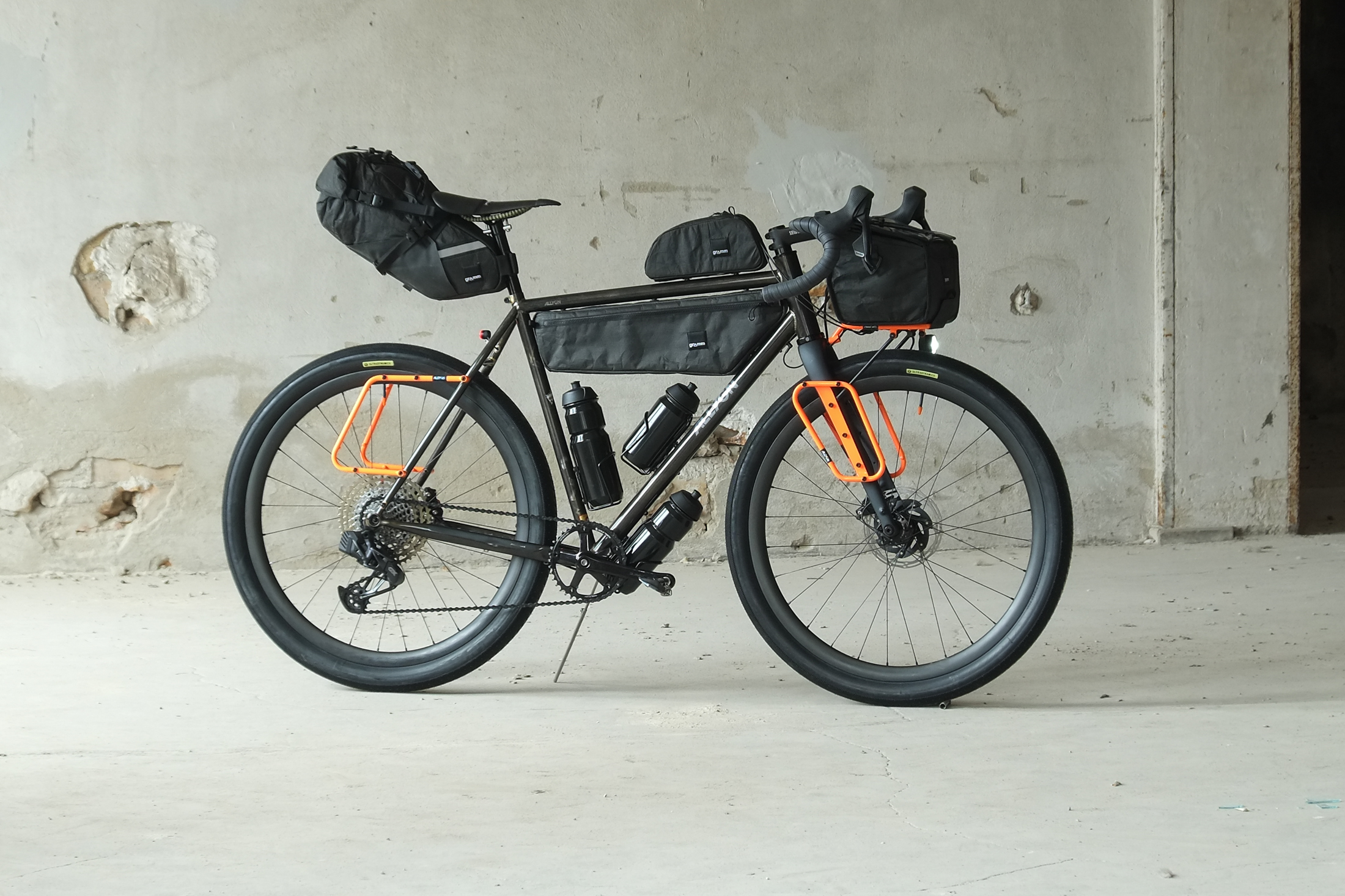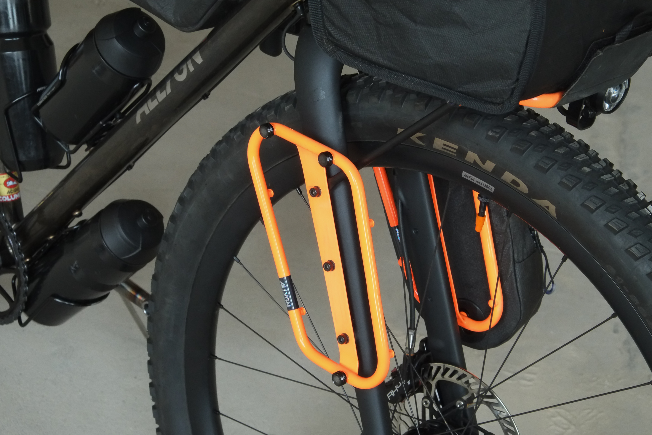 But the front Microrider racks will fit on every bike which features at least 2 eyelets on the fork legs with a 64mm spacing. The rack can be used like a normal anything cage rack or much better, in combination with the ingenious magnetic mount system Gramm Tourpacking Micro-Pannier bags. The bags have a volume of 3 liters each and are made from super light weight challenge ultra series material. This system will give you all the comfort and increased load capacity of a classic lowrider/pannier touring rig, but will allow you to go all out on really challenging hardcore off road rides. We hope to have the new Micro Rider Bag & Rack system available in our online shops early springtime 2024.