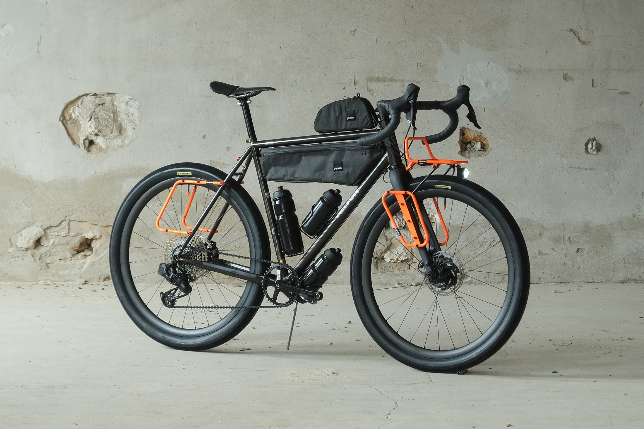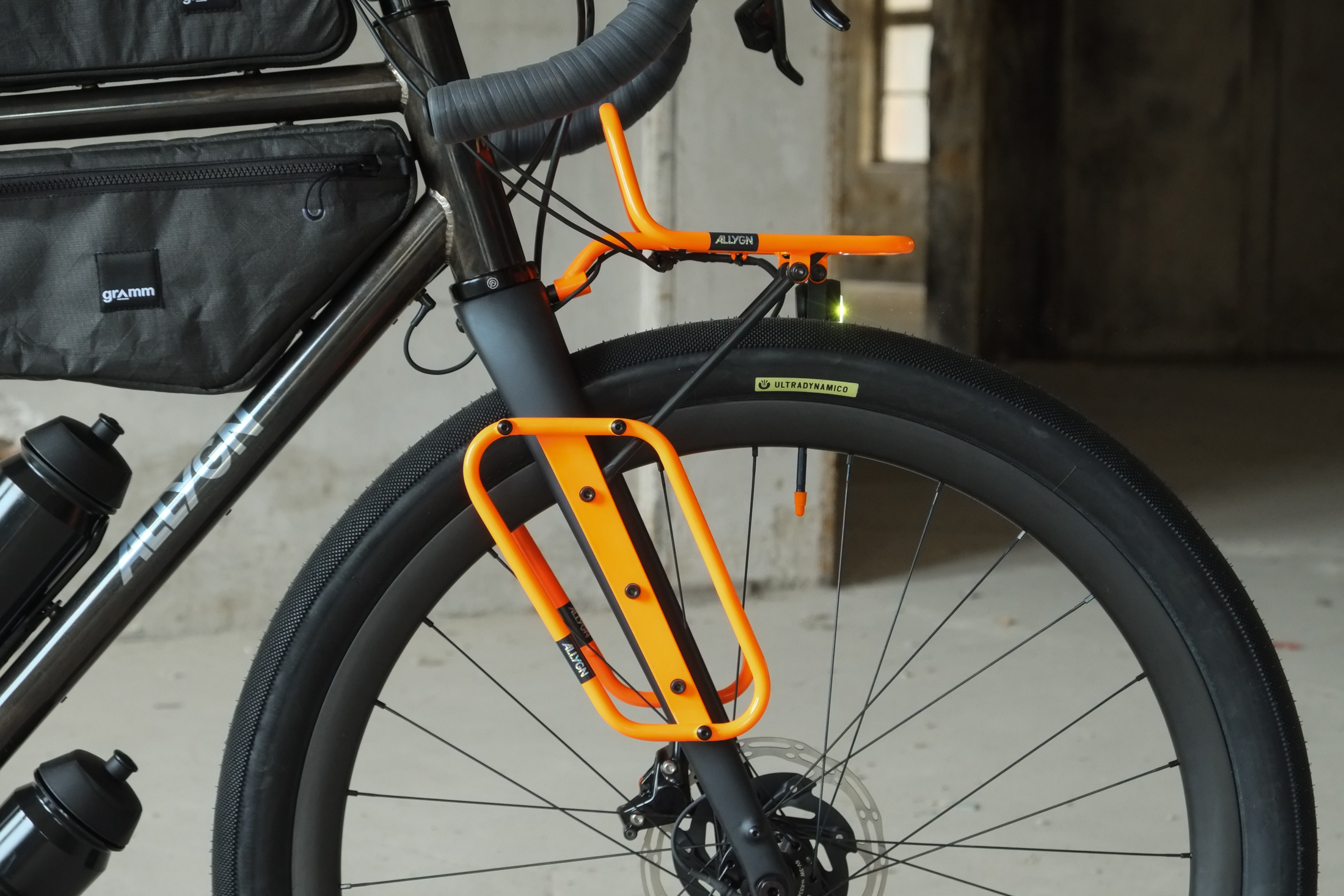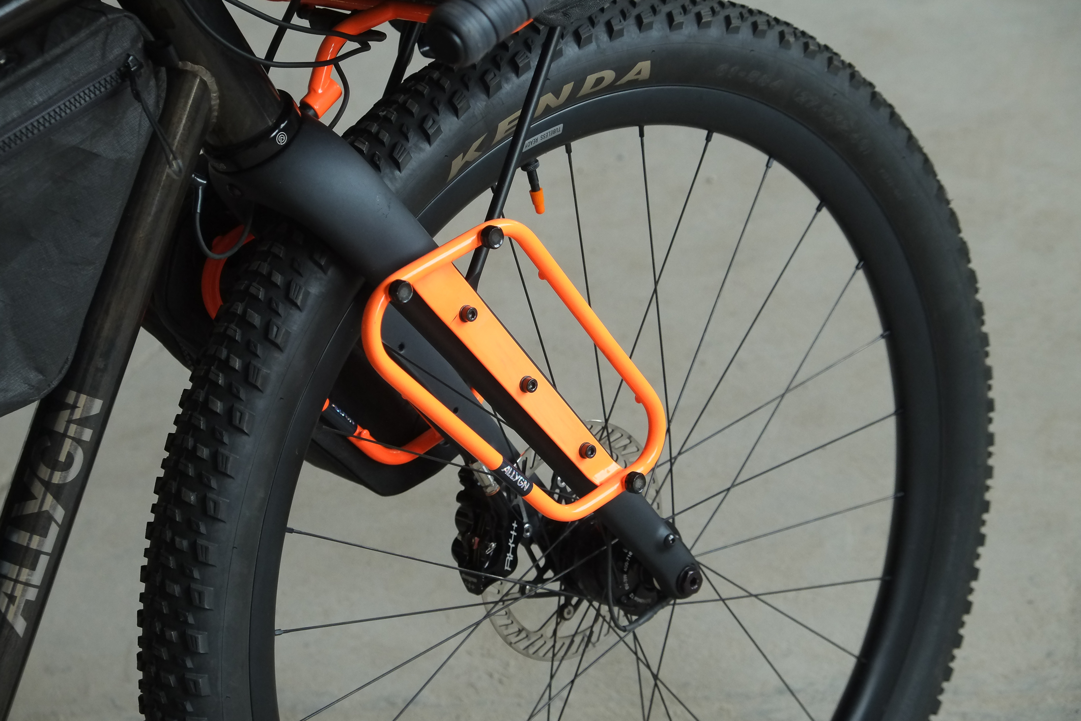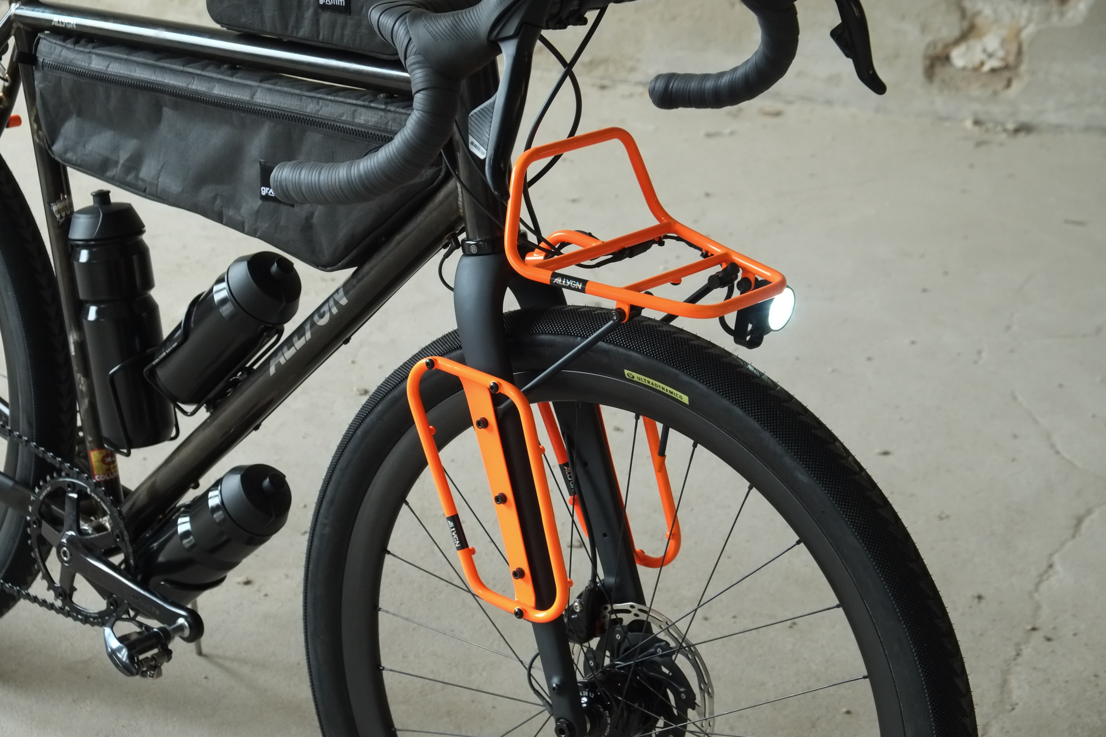 But the front Microrider racks will fit on every bike which features at least 2 eyelets on the fork legs with a 64mm spacing. The rack can be used like a normal anything cage rack or much better, in combination with the ingenious magnetic mount system Gramm Tourpacking Micro-Pannier bags. The bags have a volume of 3 liters each and are made from super light weight challenge ultra series material. This system will give you all the comfort and increased load capacity of a classic lowrider/pannier touring rig, but will allow you to go all out on really challenging hardcore off road rides. We hope to have the new Micro Rider Bag & Rack system available in our online shops early springtime 2024.