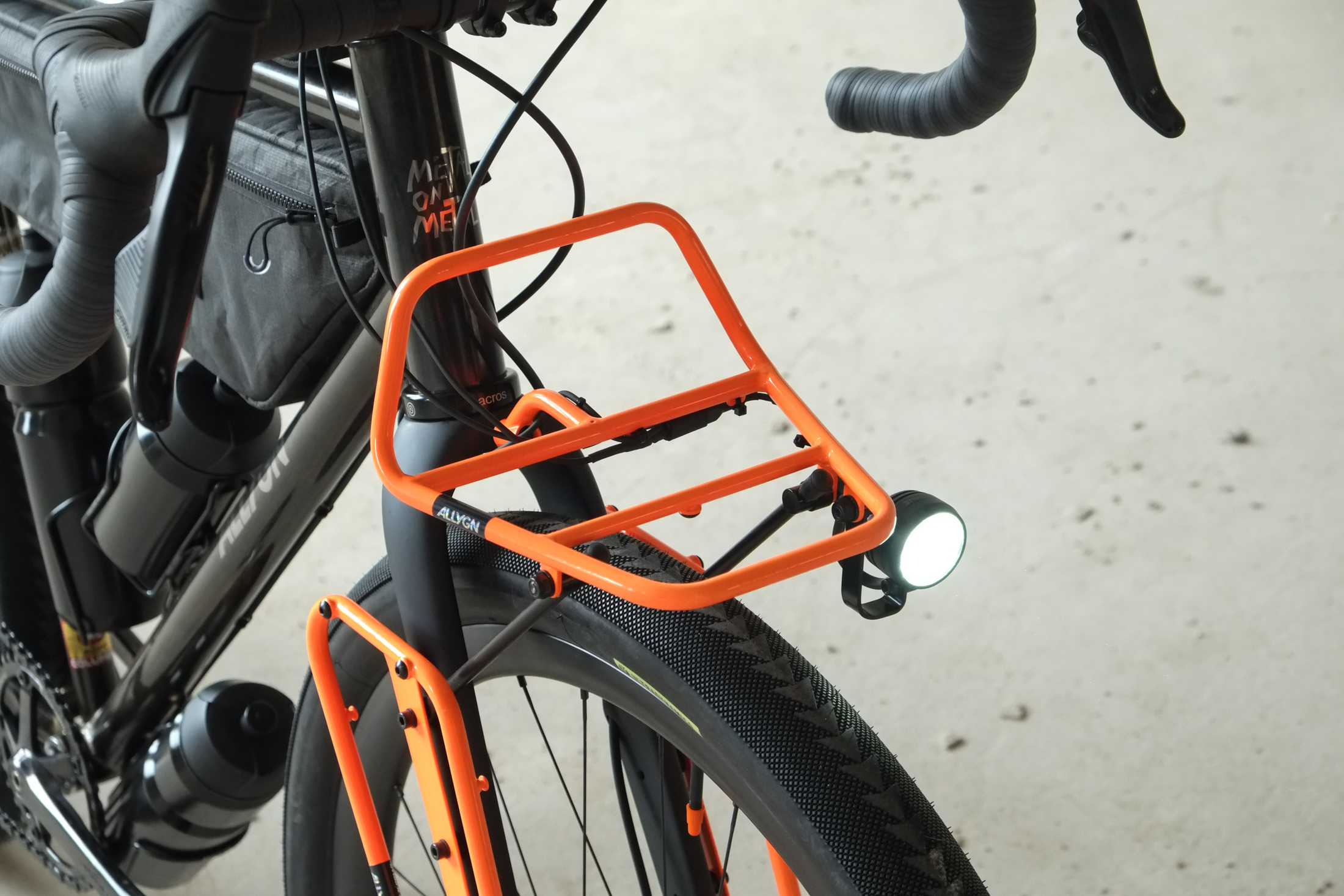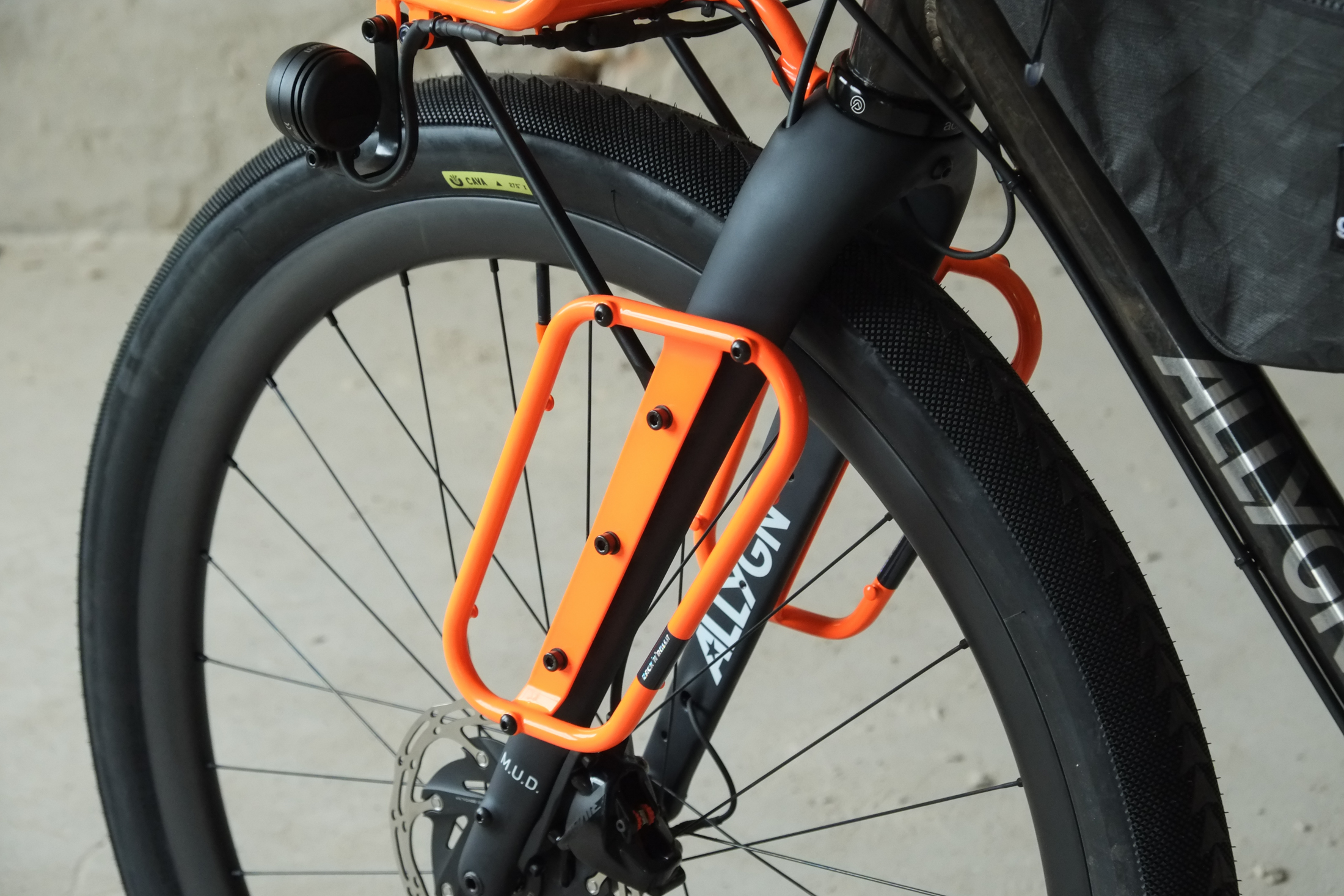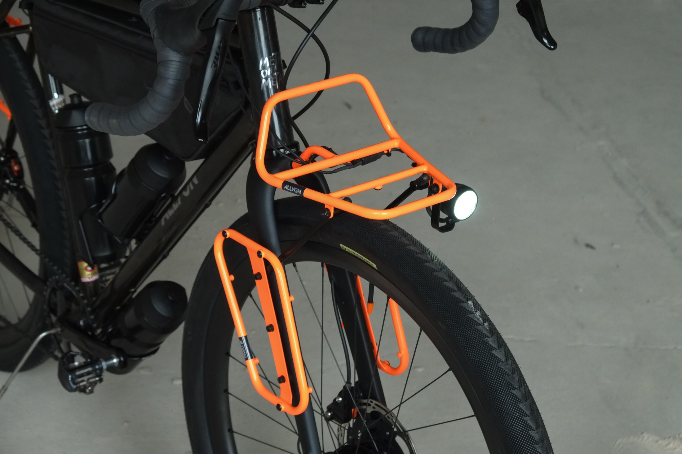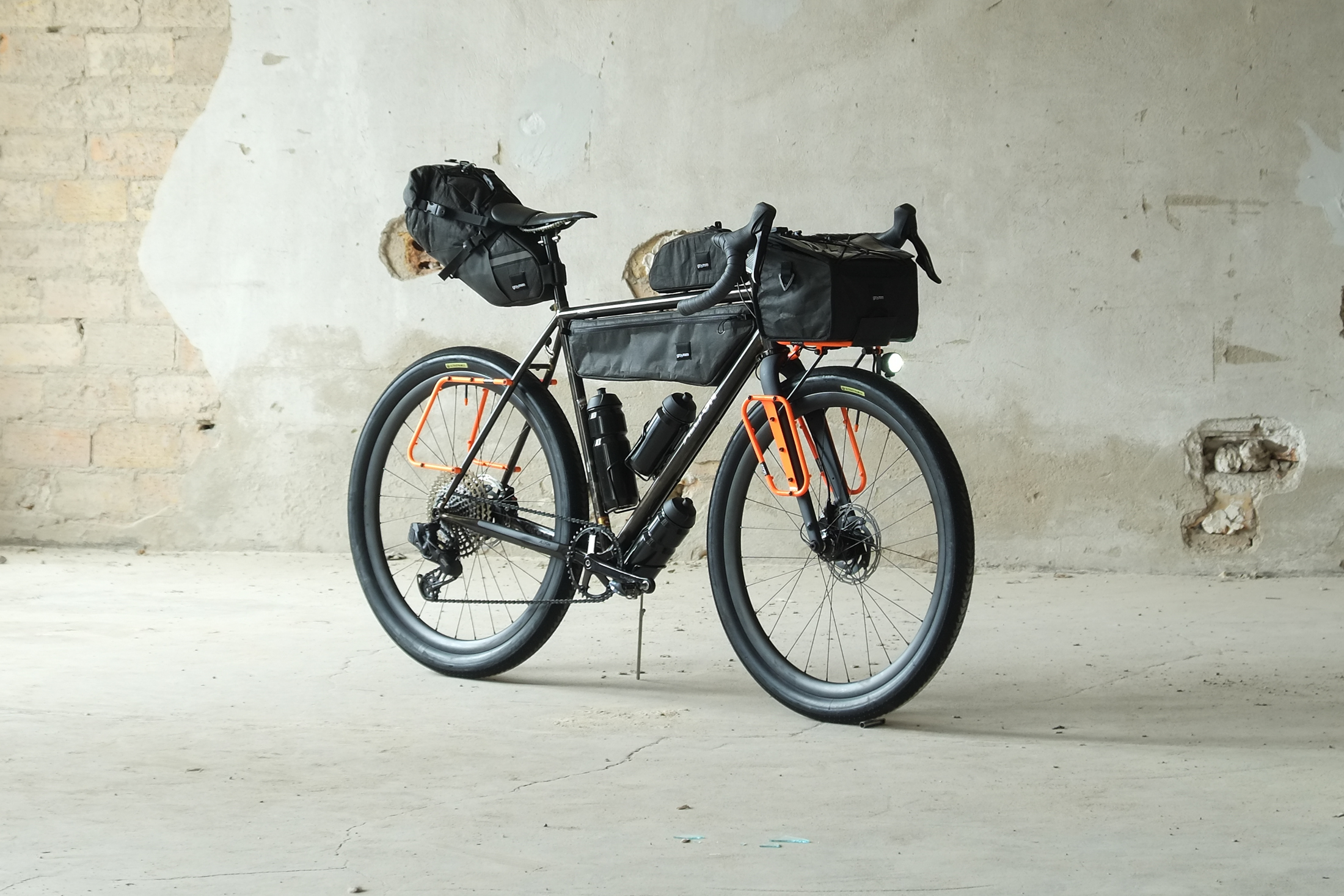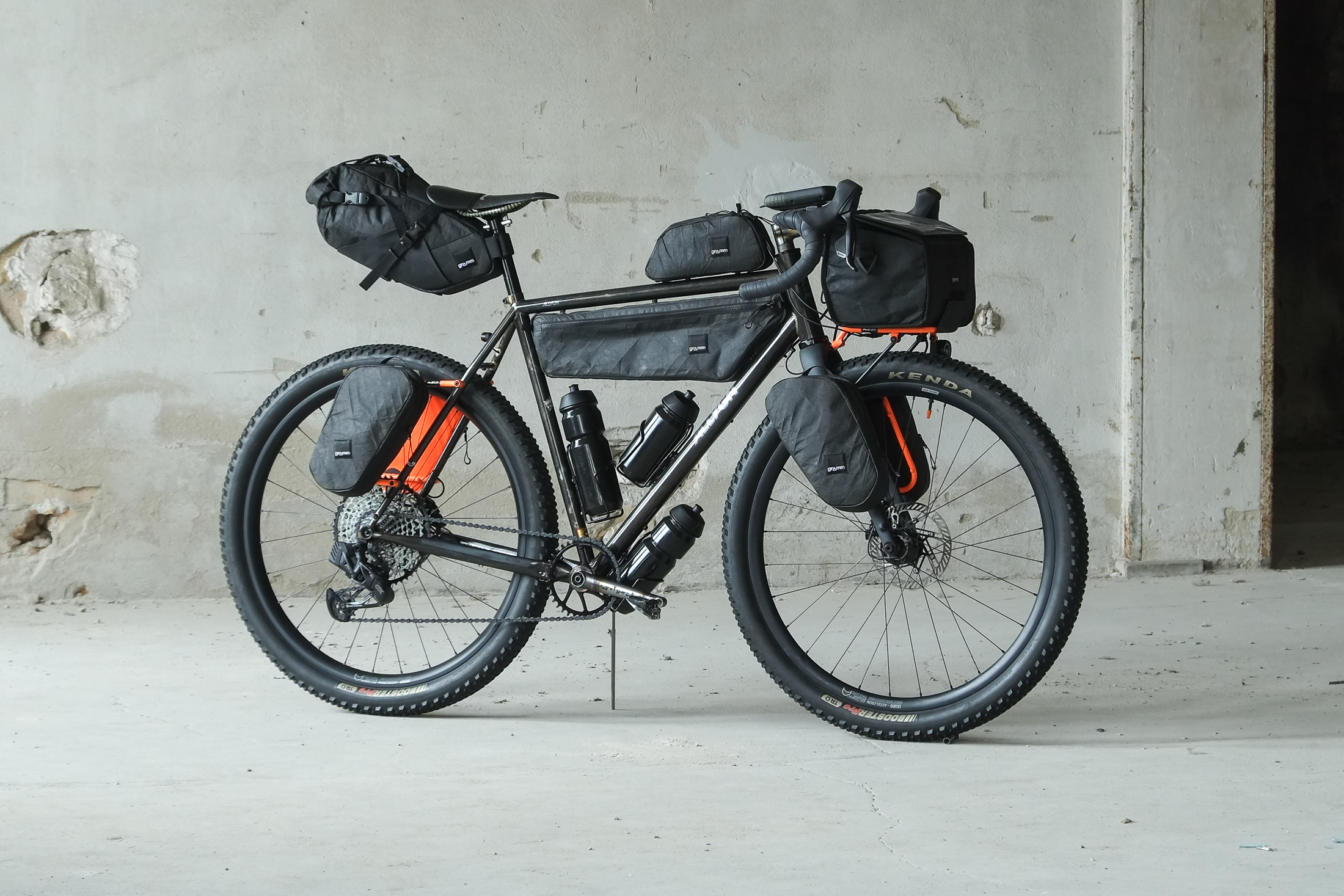 But the front Microrider racks will fit on every bike which features at least 2 eyelets on the fork legs with a 64mm spacing. The rack can be used like a normal anything cage rack or much better, in combination with the ingenious magnetic mount system Gramm Tourpacking Micro-Pannier bags. The bags have a volume of 3 liters each and are made from super light weight challenge ultra series material. This system will give you all the comfort and increased load capacity of a classic lowrider/pannier touring rig, but will allow you to go all out on really challenging hardcore off road rides. We hope to have the new Micro Rider Bag & Rack system available in our online shops early springtime 2024.