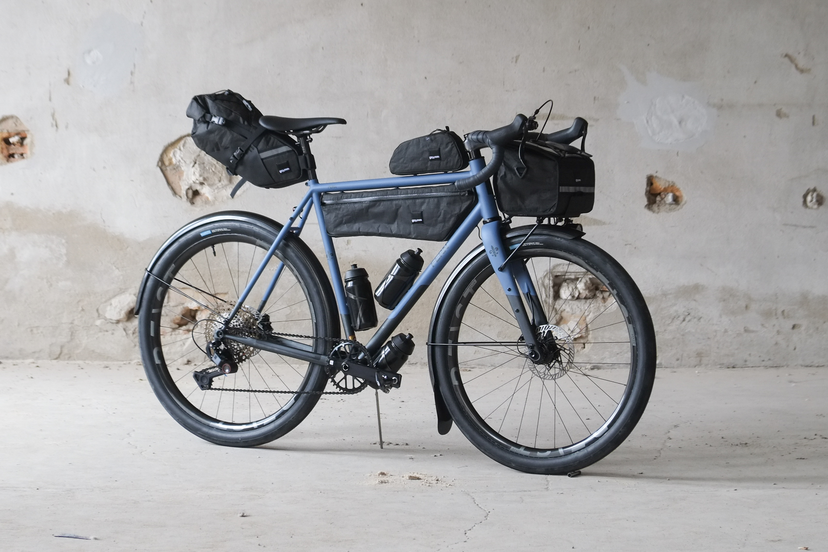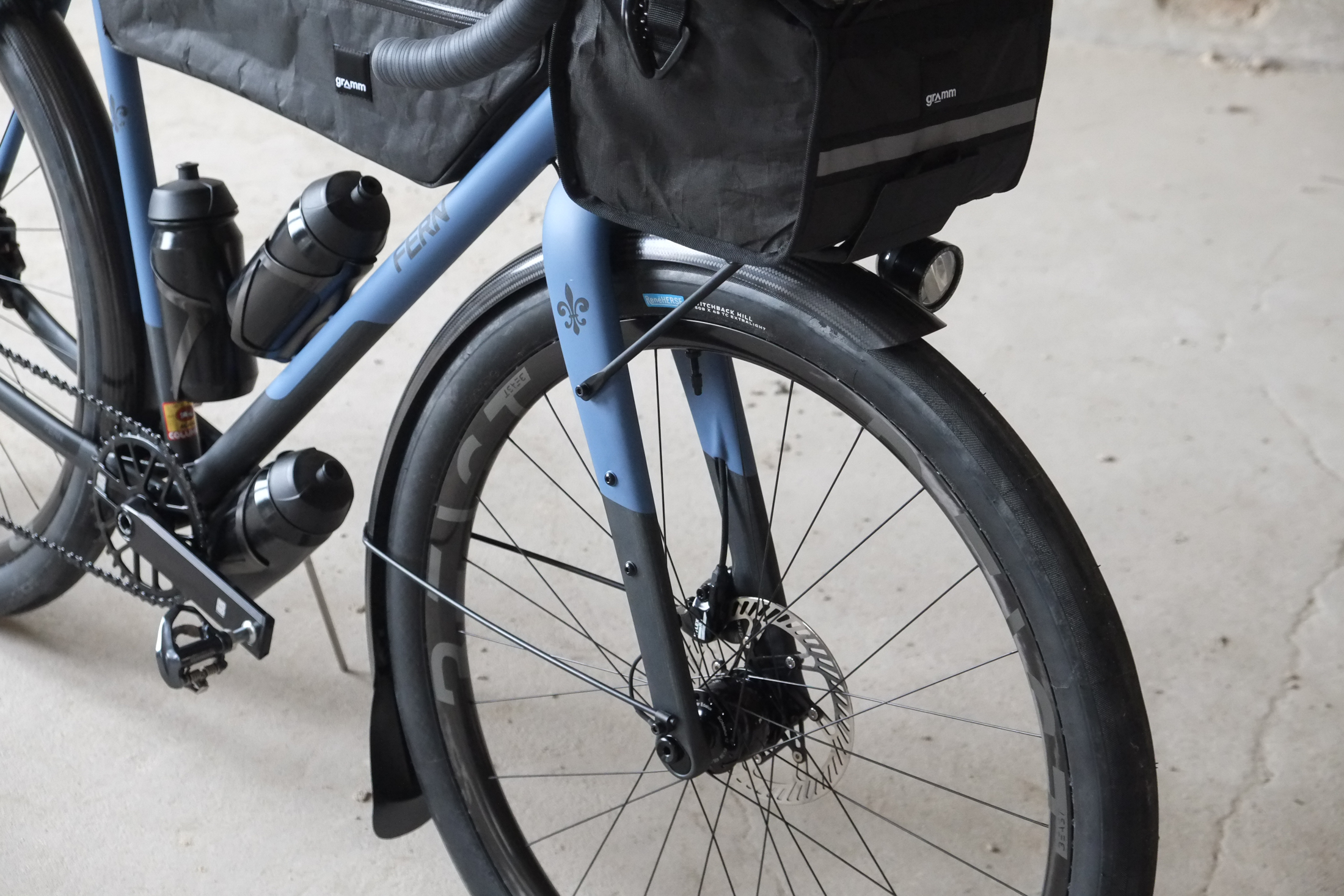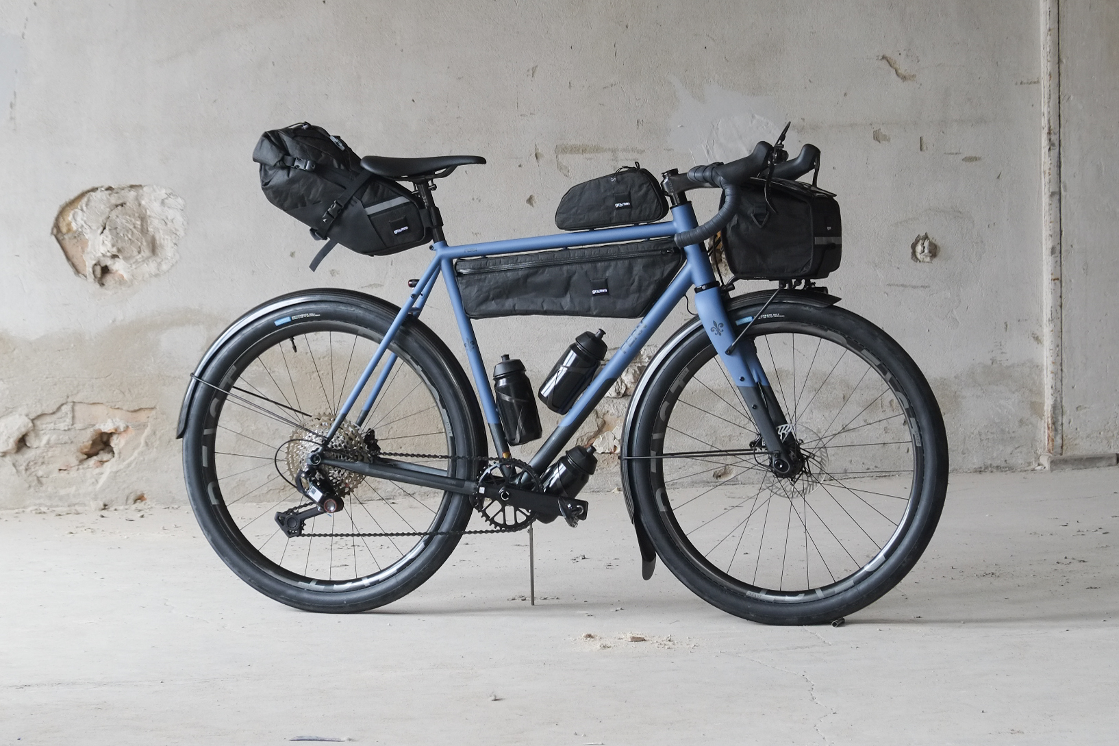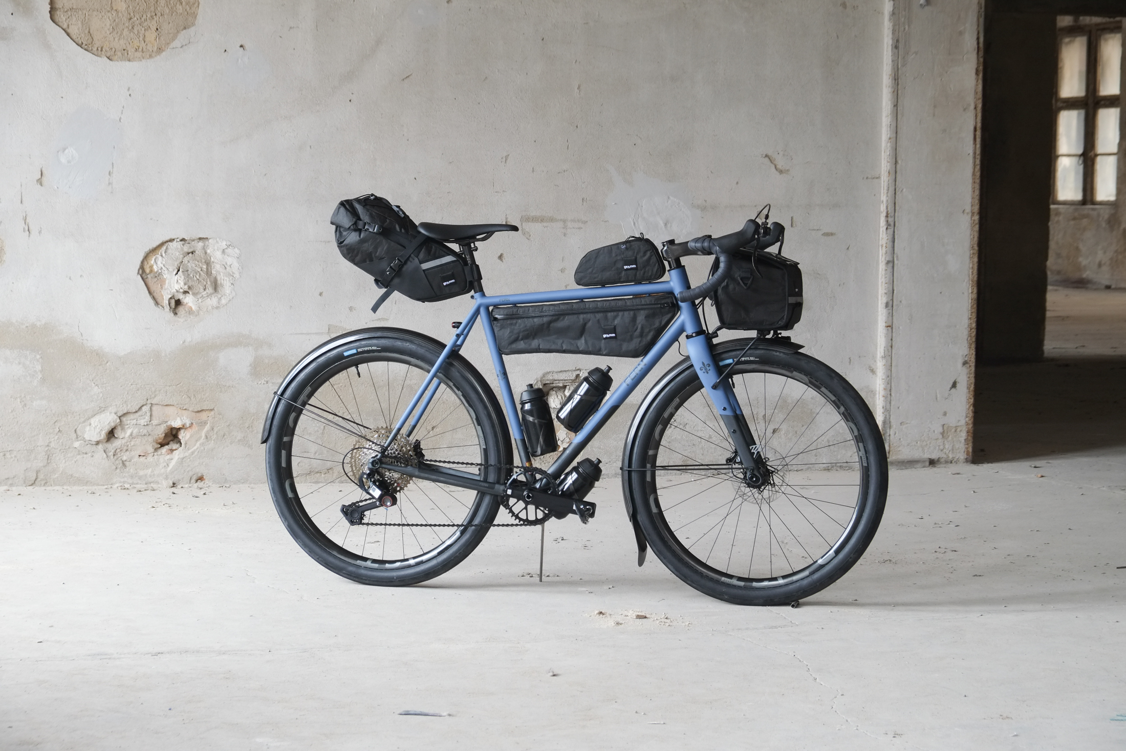 This amazing #candoeverything modern rando / gravel bike we build for Jan from Switzerland who came to Berlin by train to pick up his dream machine and rode his brand new bike all the way back to the swiss mountains, how ccolis that! This bike features just the finest parts and components made by our friends at Ingrid Components, Beast Components, Campagnolo, Gevenalle, Rene Herse, Son Nabendynamo, etc. Superbe blue Lily paintjob as usual by Mr. Paint aka Velociao! Fantastic bag set up by Gramm Tourpacking, matching Diamond Bags and Allygn Components Diamond Front Rack, available in our online shop now!