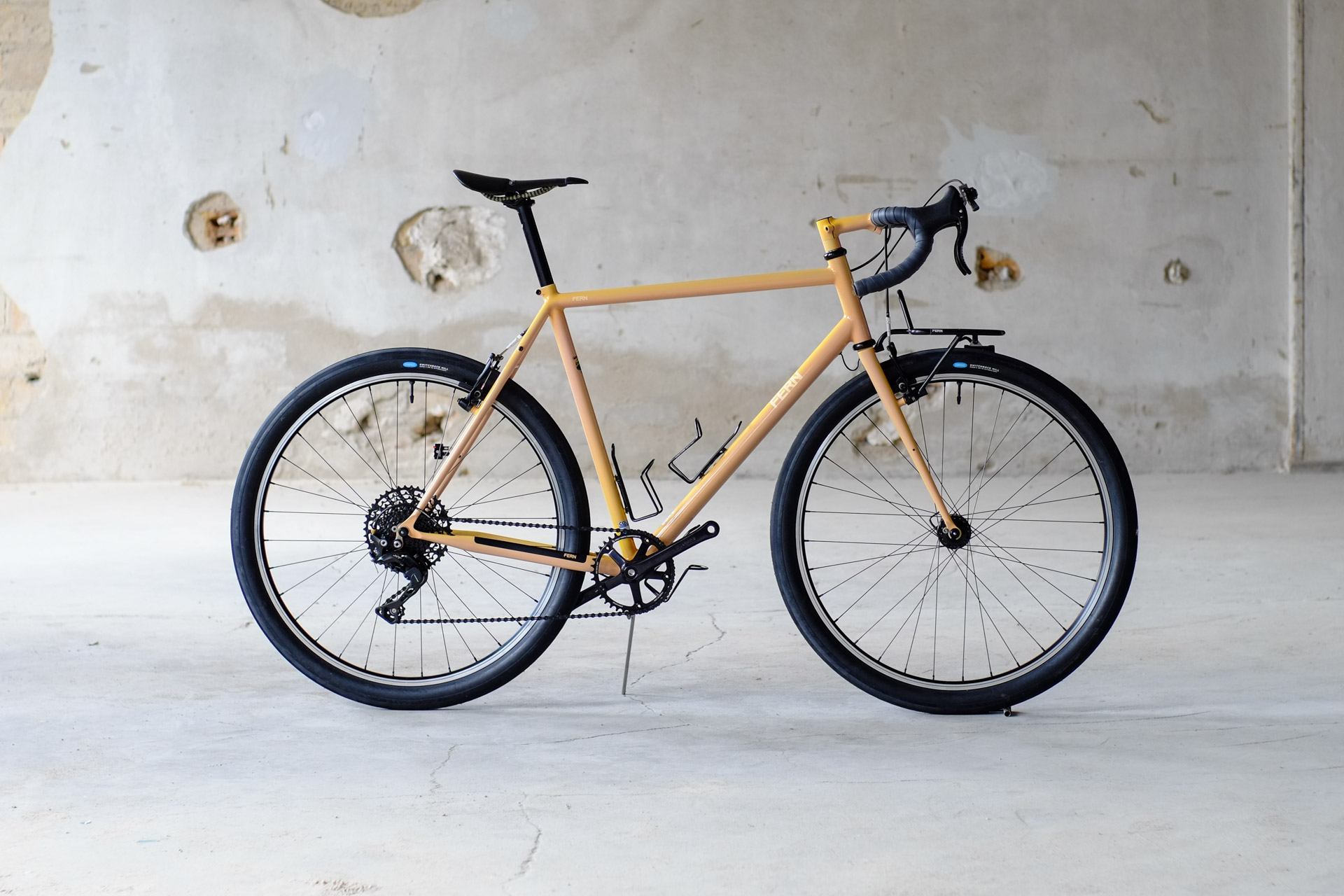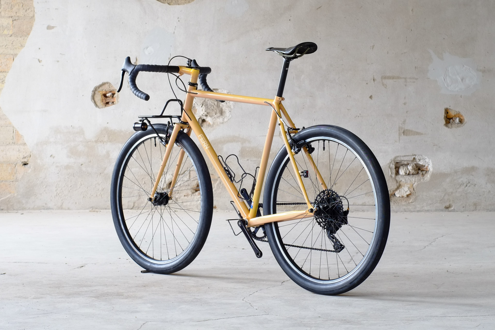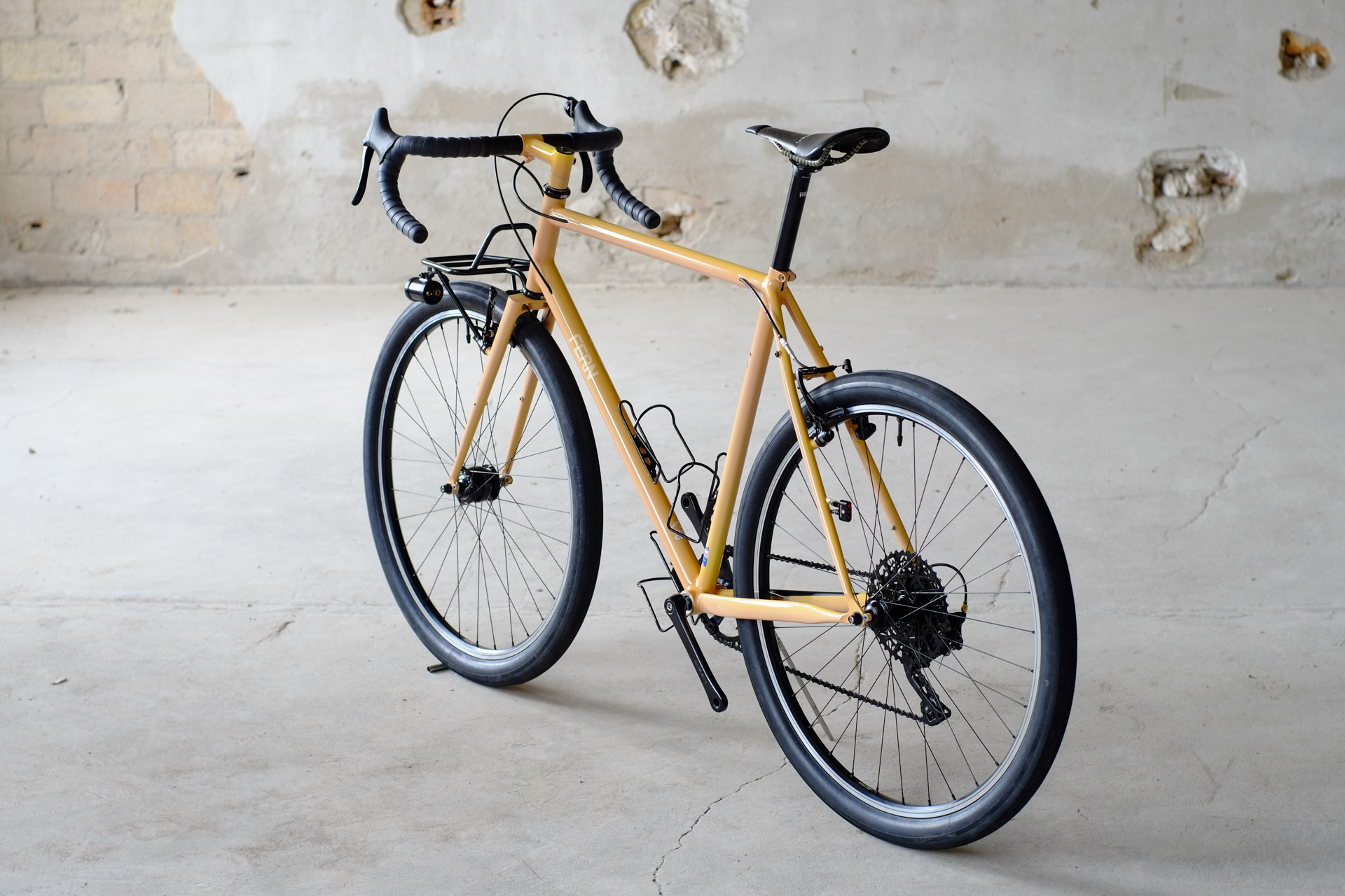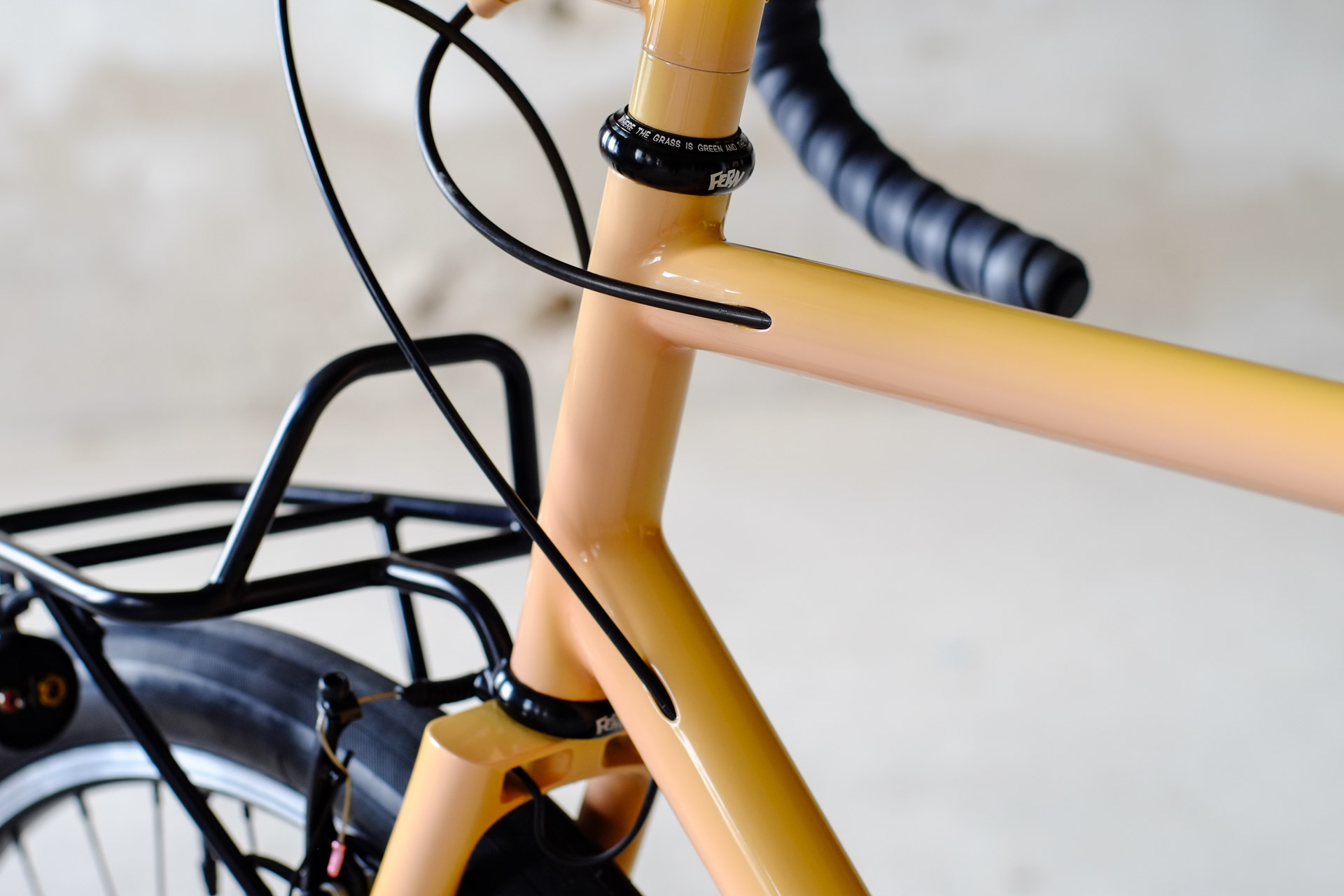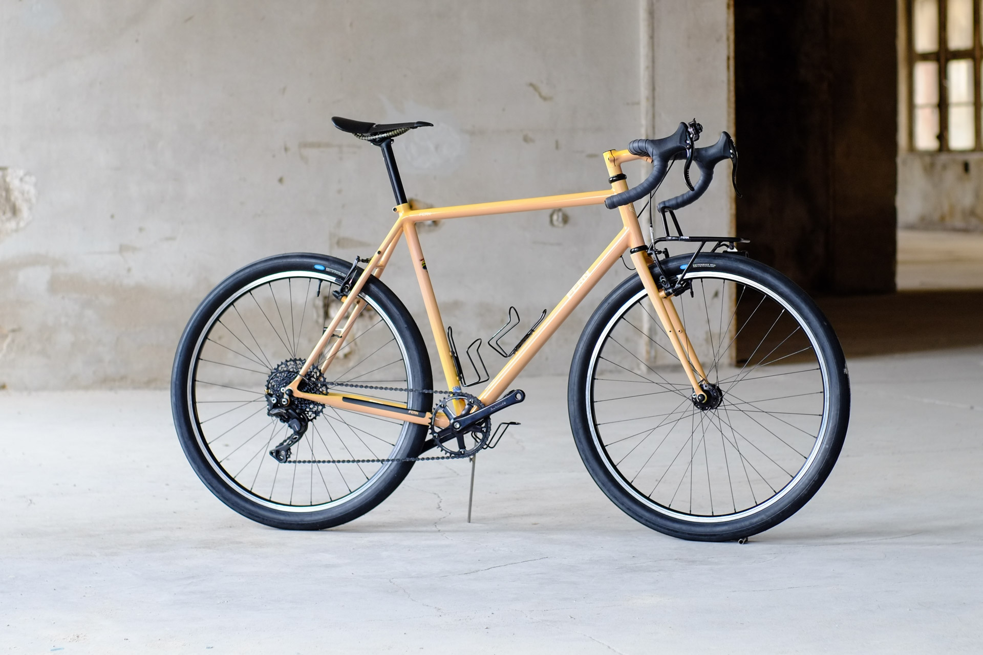 This is our latest new breed,...a cross of the classic randonneur bike CHICO and the rough terrain allroad bike CHUCK. When we created this new type of bike for Nils, we had in mind that this one should be equally capable to handle long distance rides such as Paris-Brest-Paris, but should also absolutely perform on hard offroad- and gravelrides. Fat 650B / 48mm Rene Herse Switchback tires provide a cushy ride even under roughest conditions without making any sacifices in speed. Put on Honjo Fenders for Brevet riding, take them off and you will have room for up 52mm wide tires.