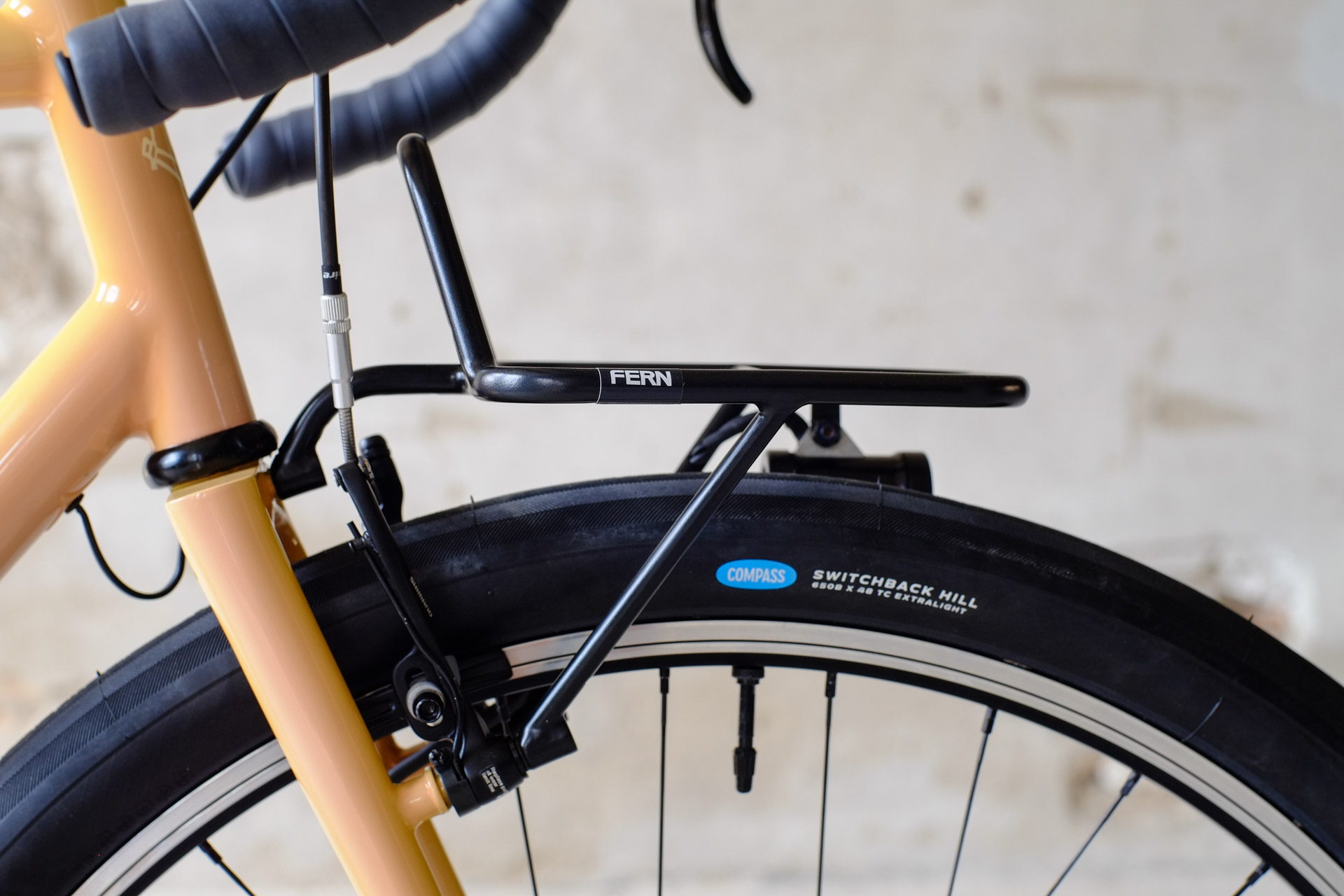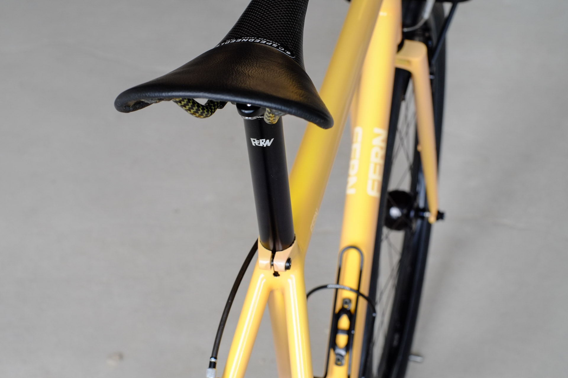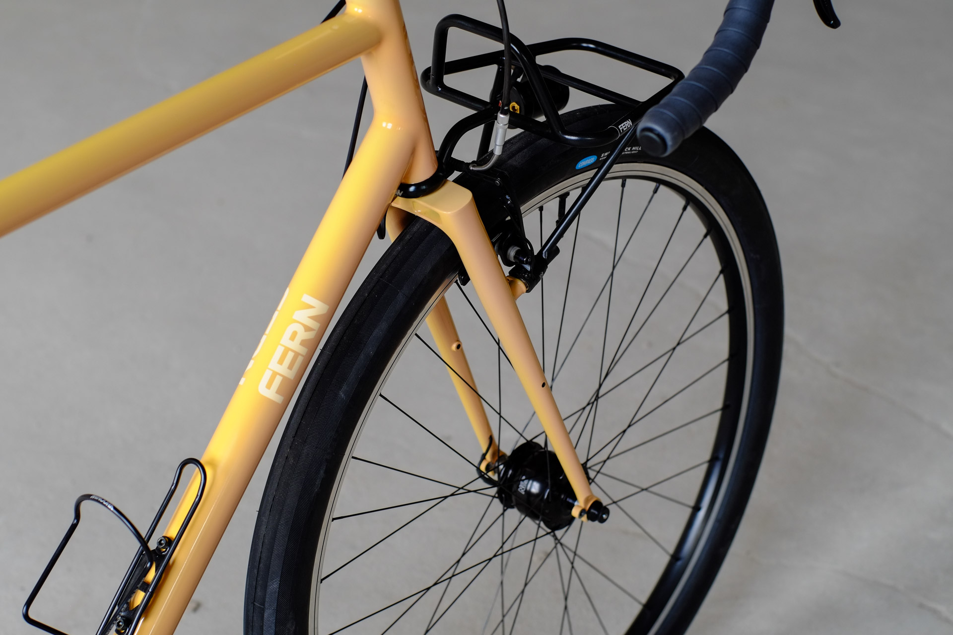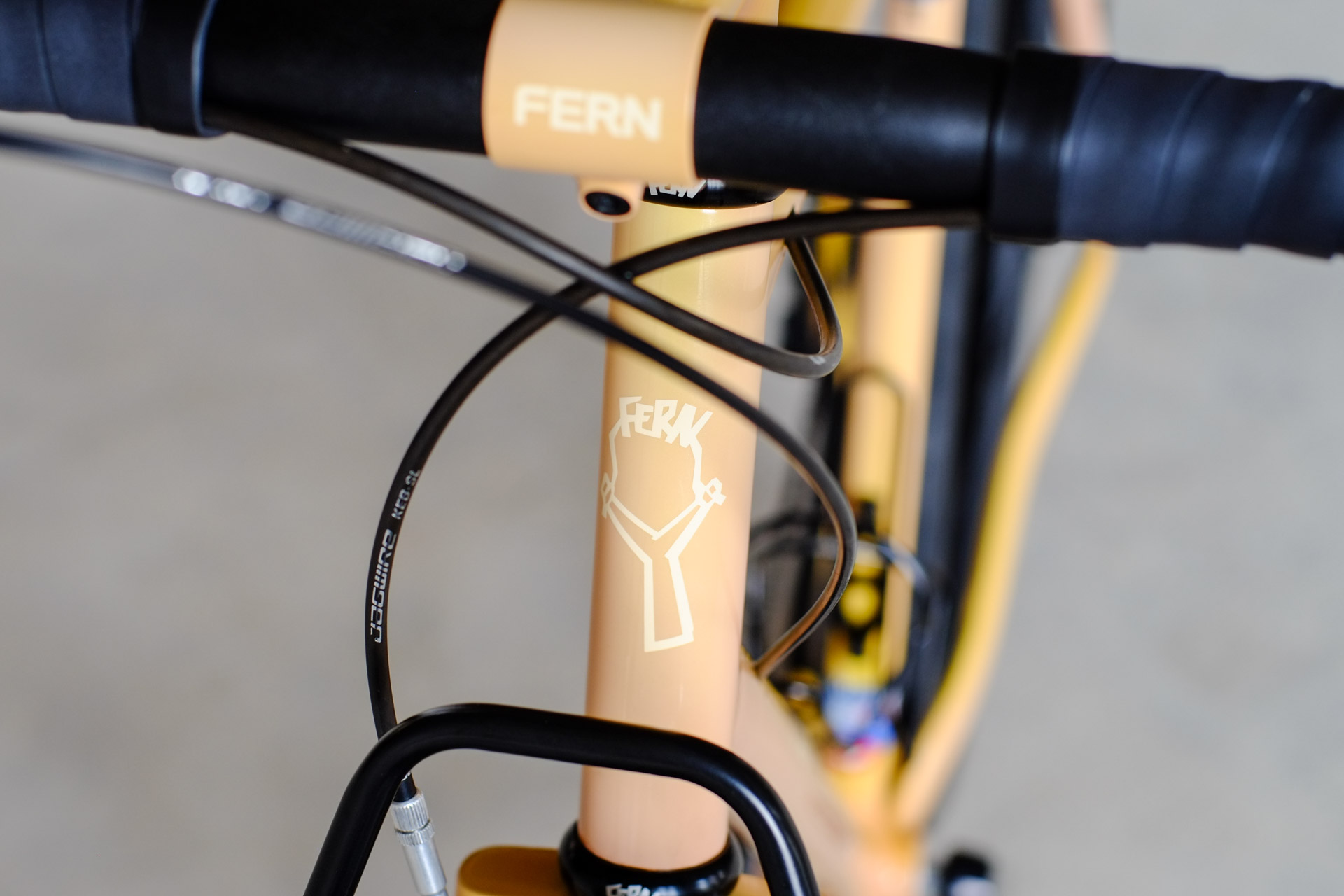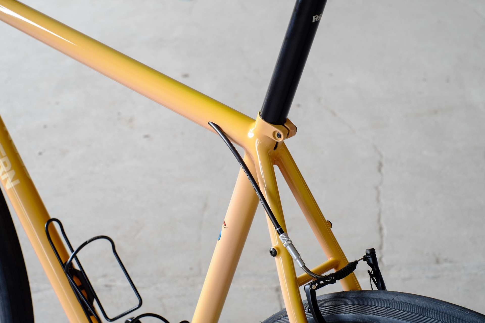 This is our latest new breed,...a cross of the classic randonneur bike CHICO and the rough terrain allroad bike CHUCK. When we created this new type of bike for Nils, we had in mind that this one should be equally capable to handle long distance rides such as Paris-Brest-Paris, but should also absolutely perform on hard offroad- and gravelrides. Fat 650B / 48mm Rene Herse Switchback tires provide a cushy ride even under roughest conditions without making any sacifices in speed. Put on Honjo Fenders for Brevet riding, take them off and you will have room for up 52mm wide tires.