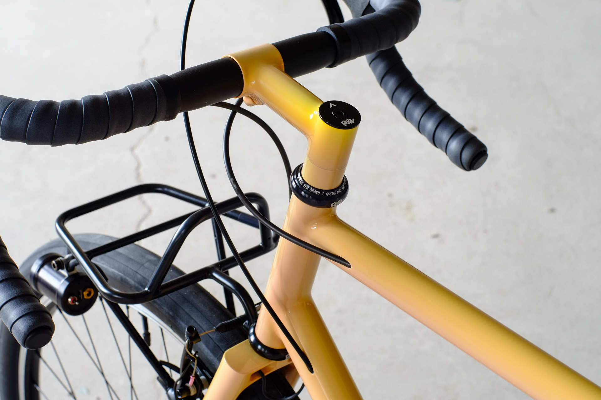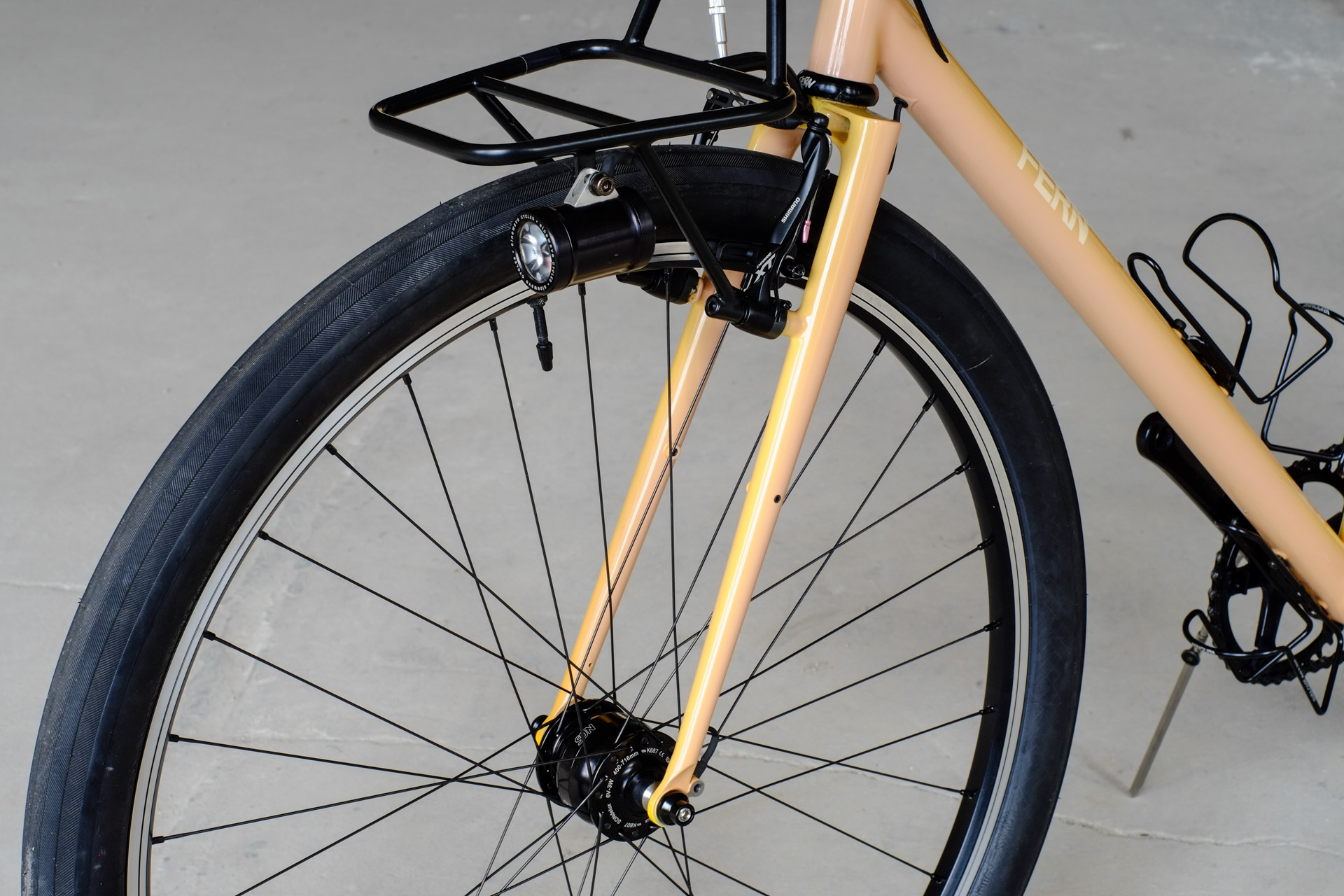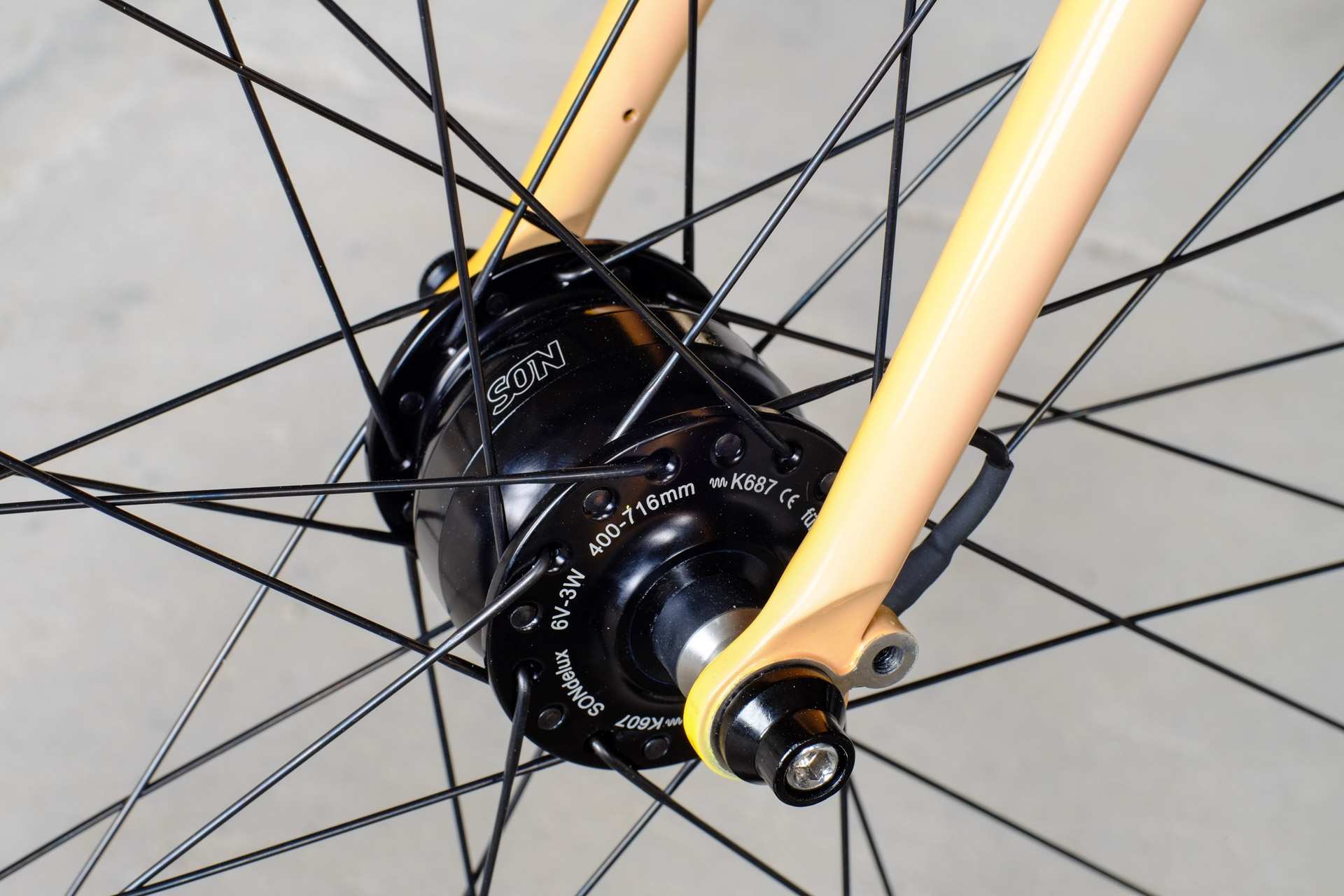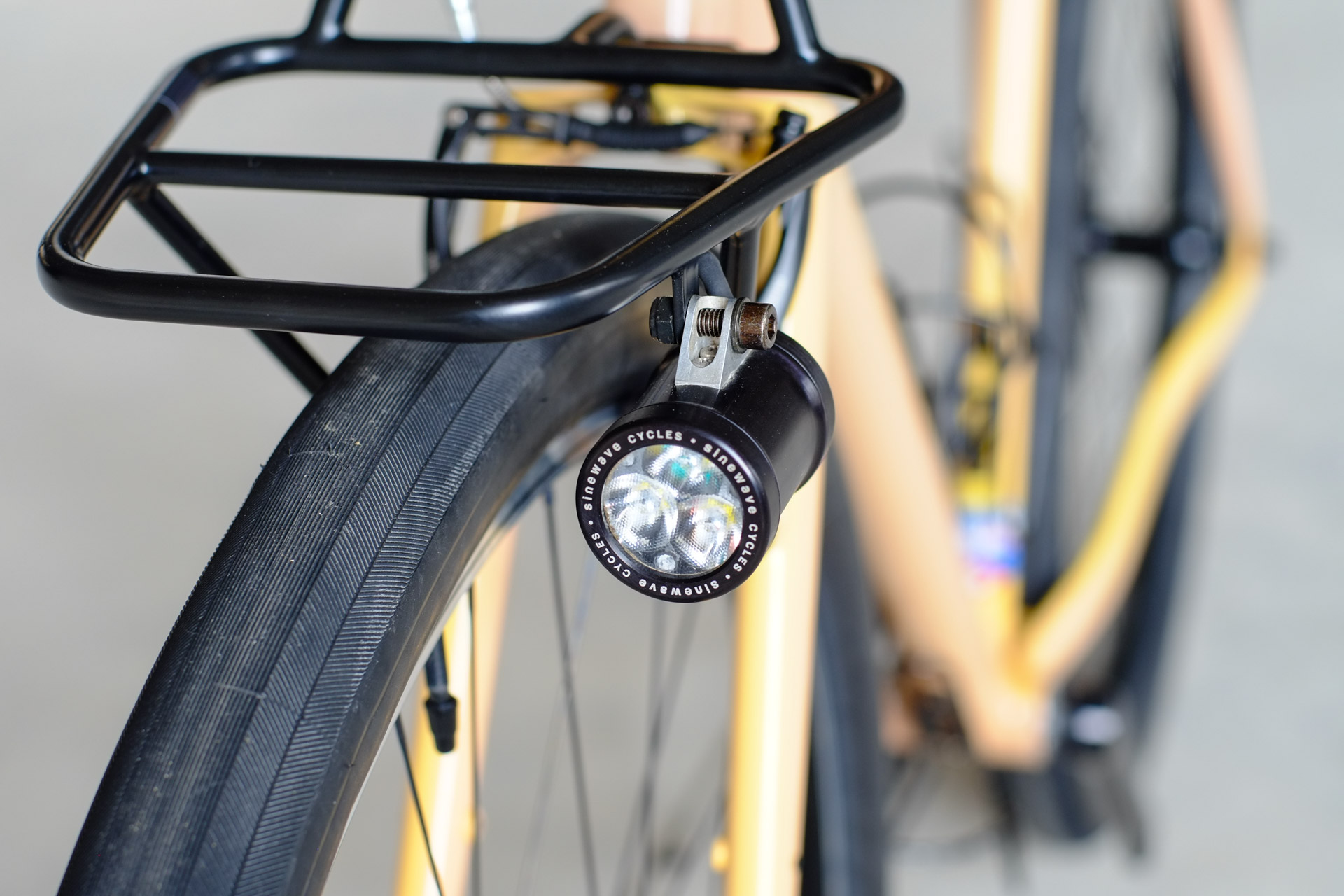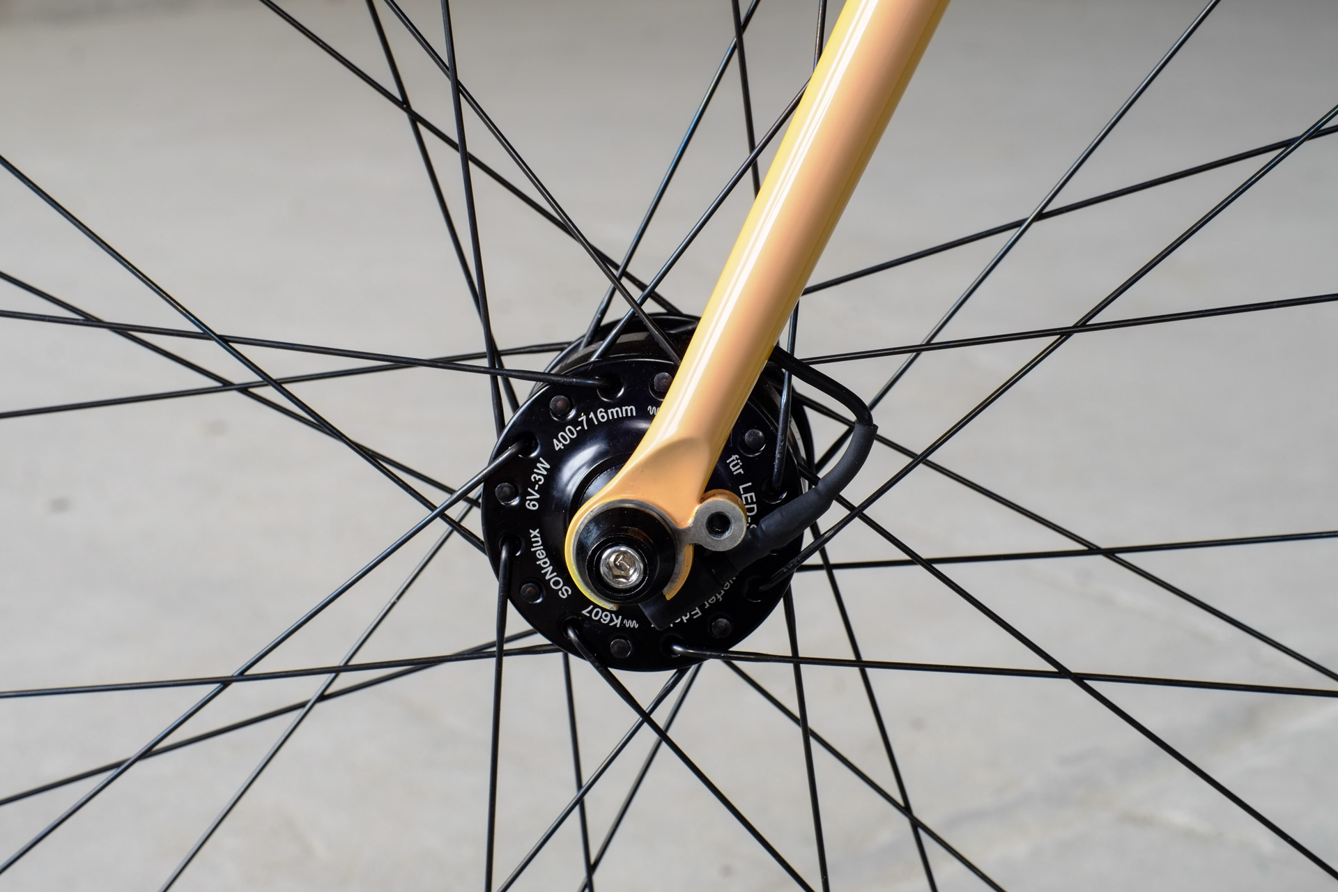 Vintage custom anodized Dura Ace crankset with an incredible low Q-Factor of 142mm. Son hub dynamo and Sinewave headlight for all night long riding, including USB charging.