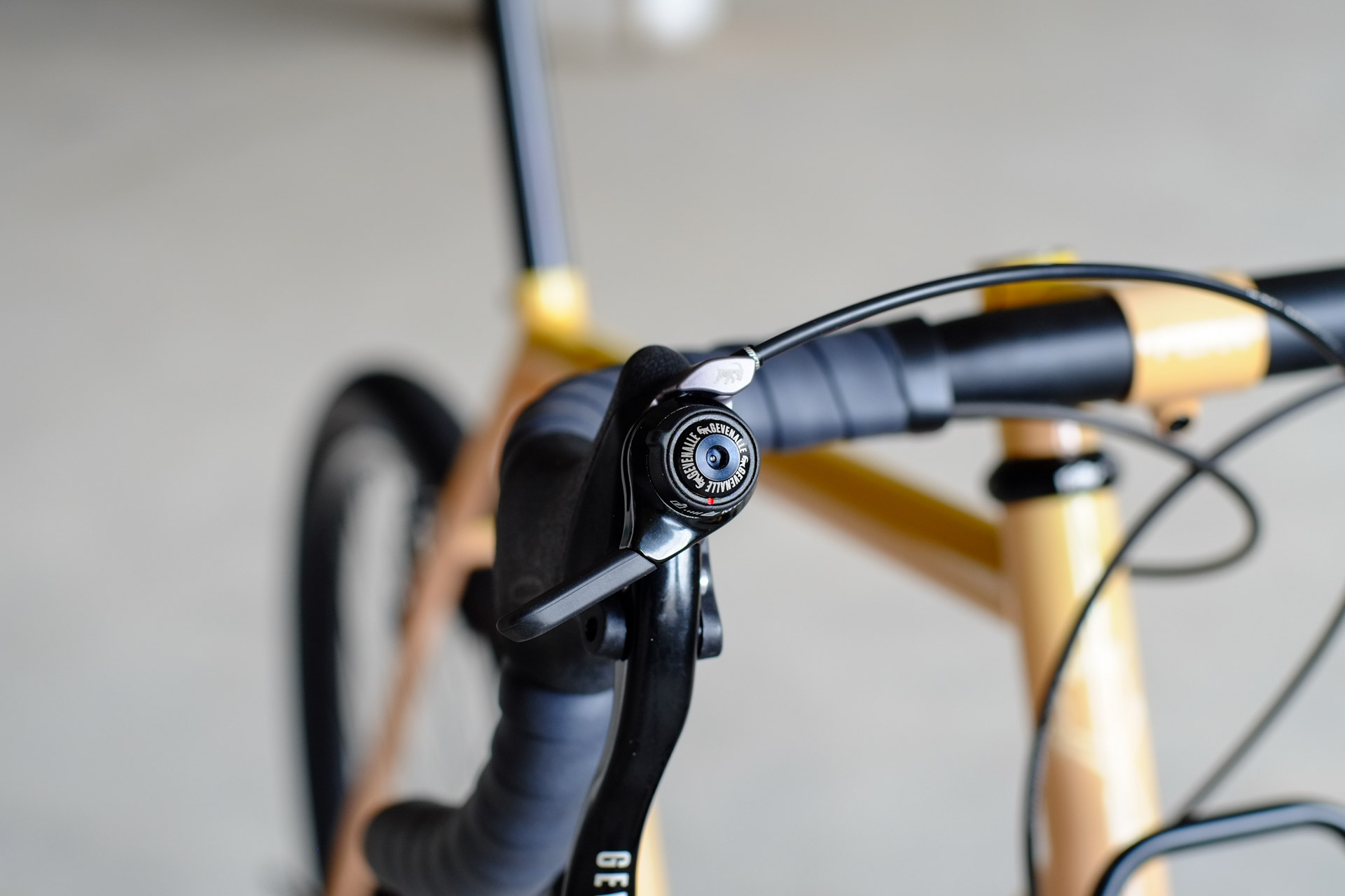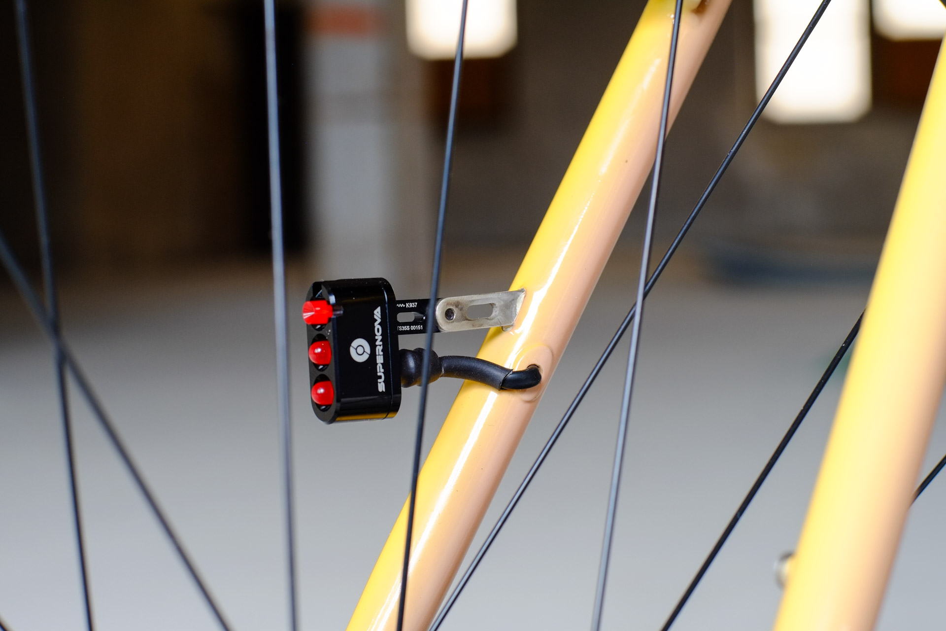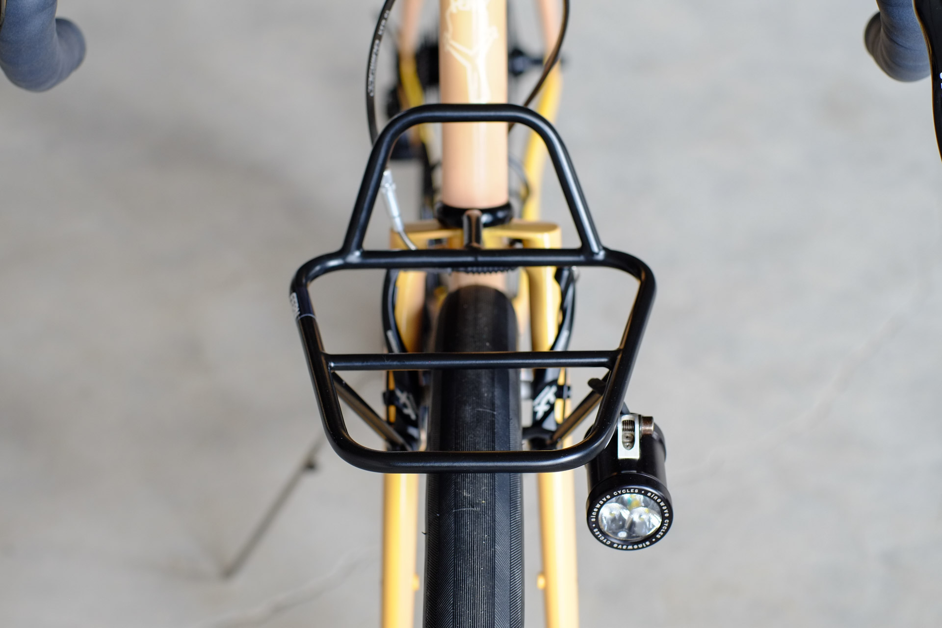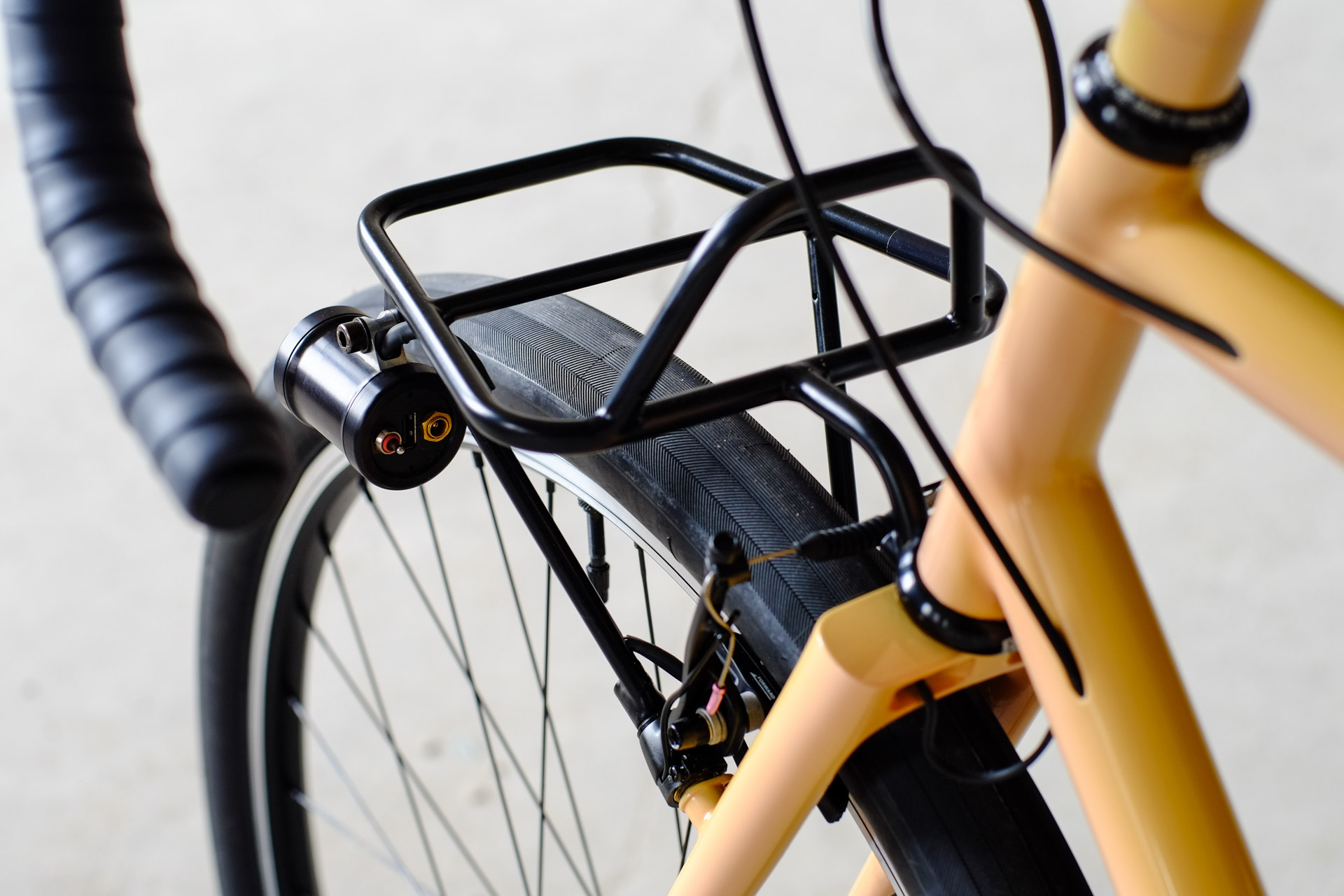 Vintage custom anodized Dura Ace crankset with an incredible low Q-Factor of 142mm. Son hub dynamo and Sinewave headlight for all night long riding, including USB charging.