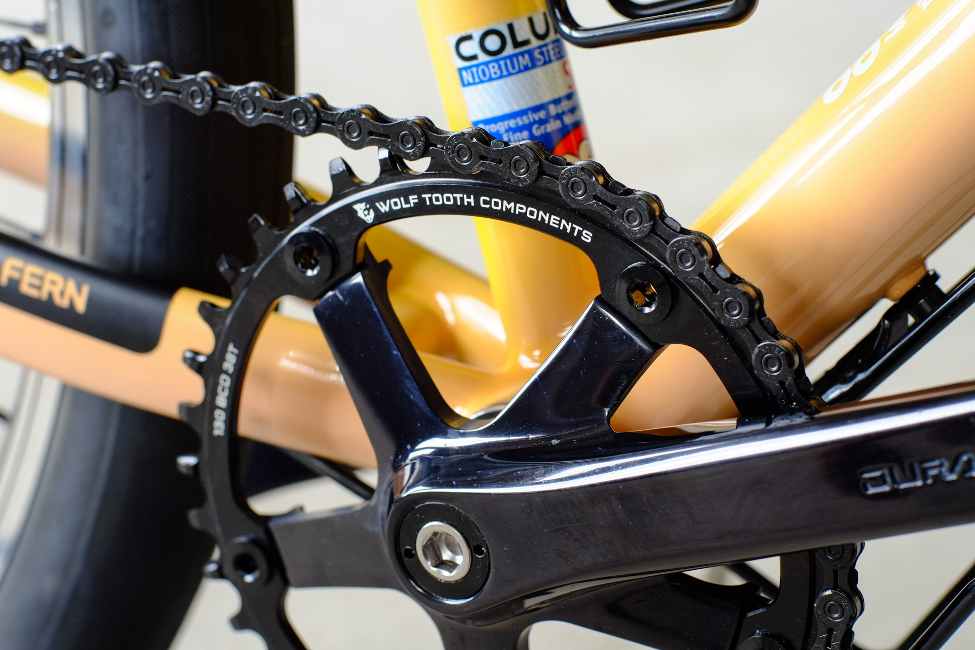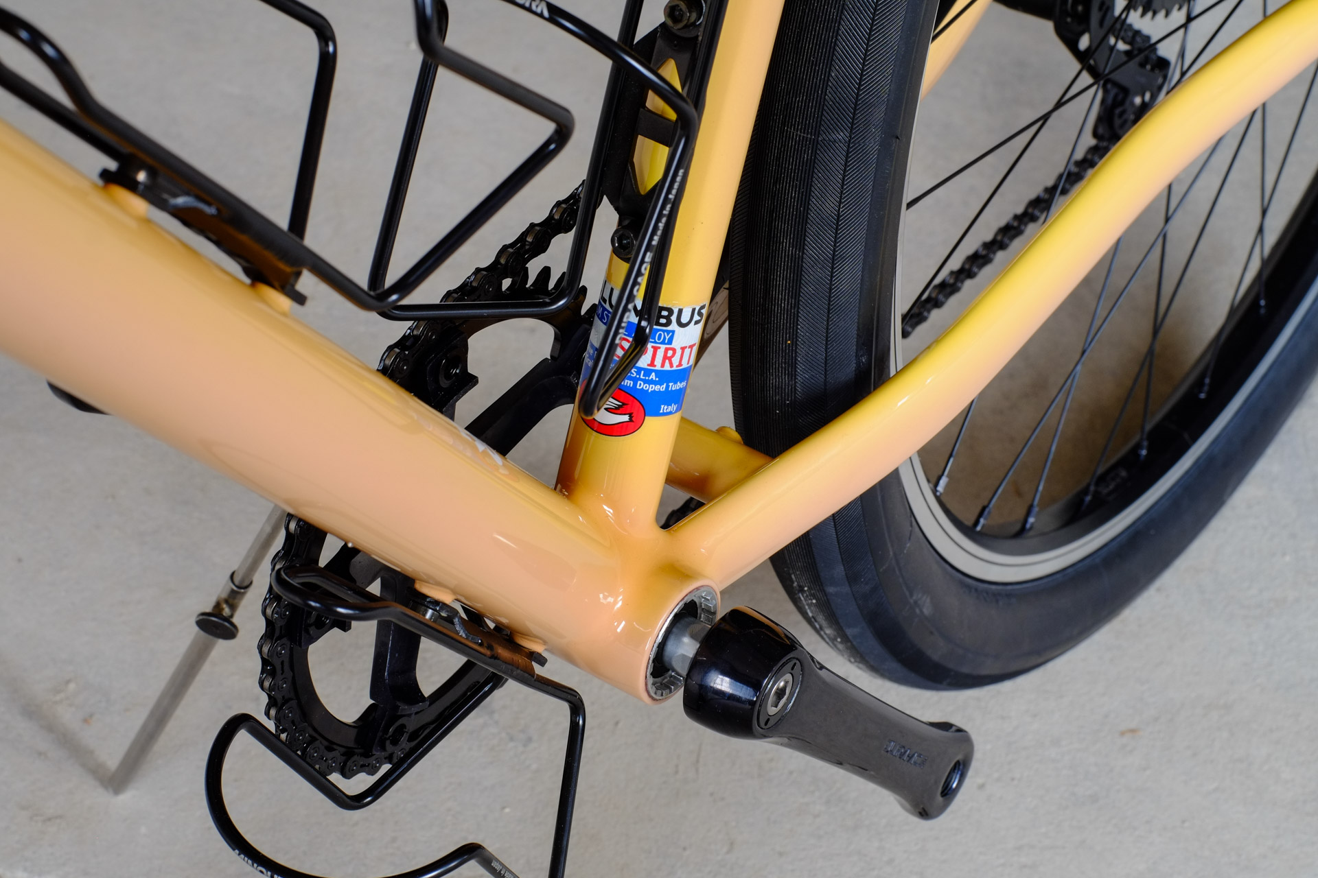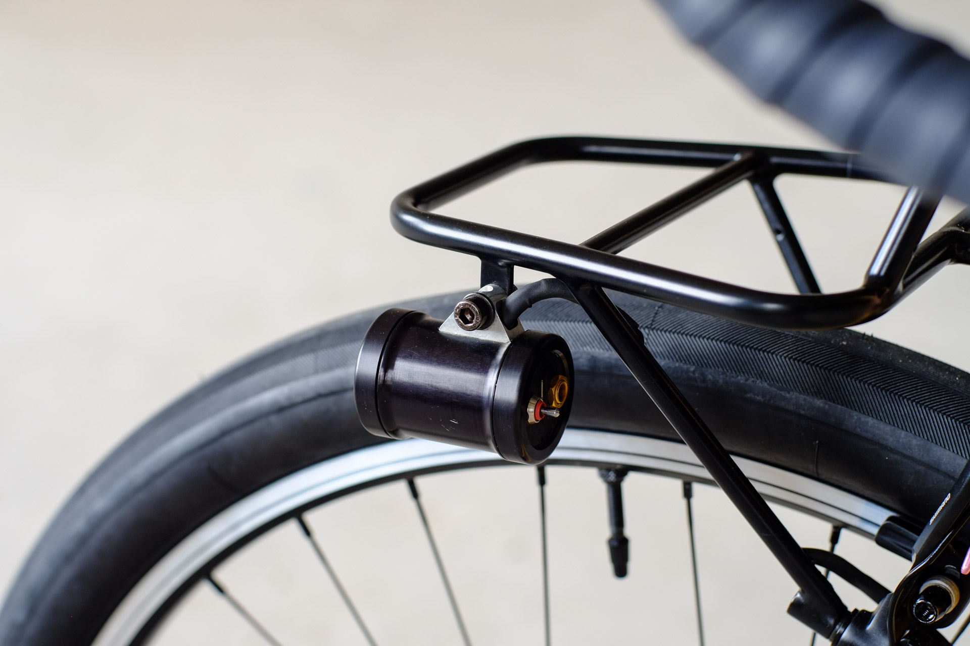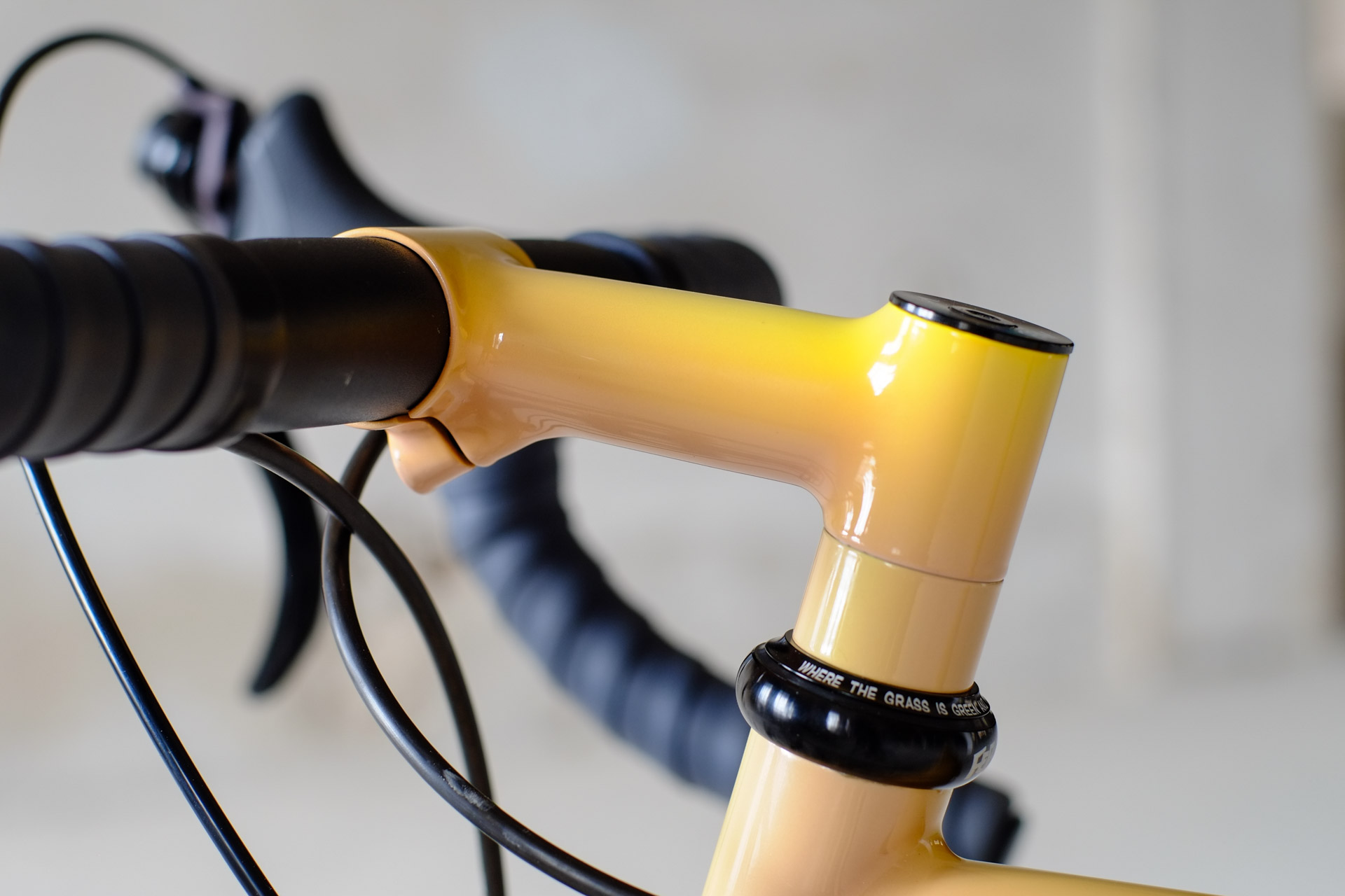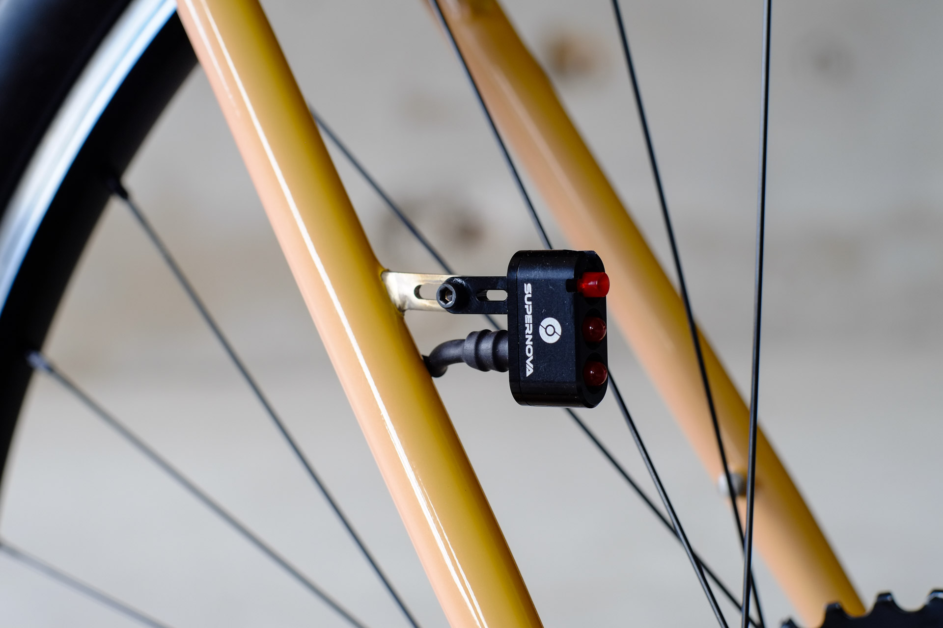 Vintage custom anodized Dura Ace crankset with an incredible low Q-Factor of 142mm. Son hub dynamo and Sinewave headlight for all night long riding, including USB charging.