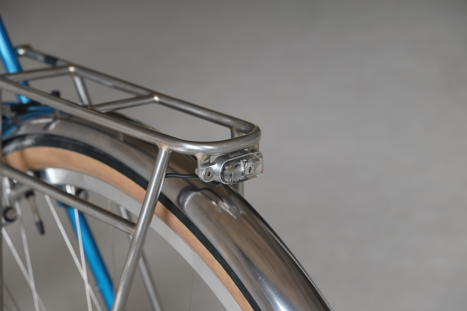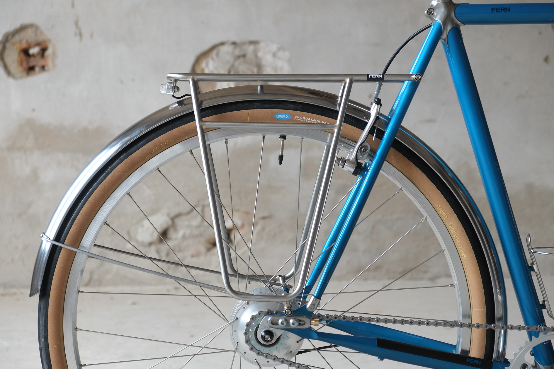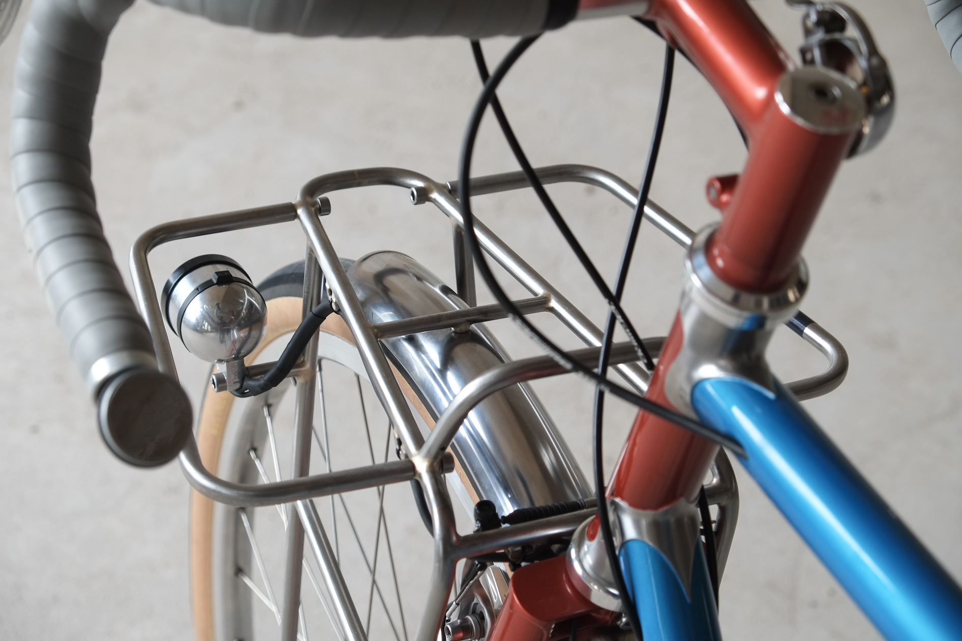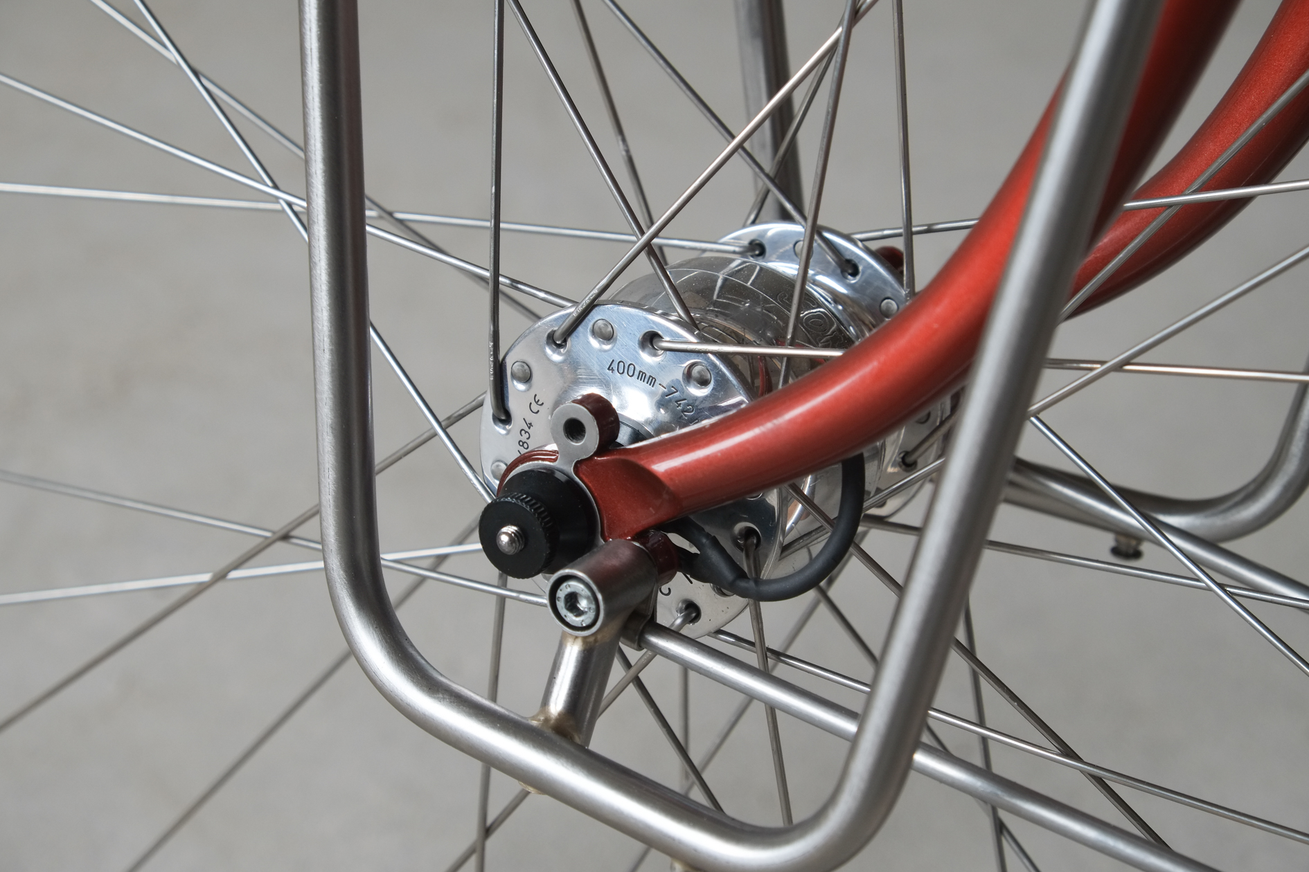 The Chacha touring bike in a classic and refined look. Beautiful handcarved stainless lugs matching the special stainless custom racks. Despite it’s classic appeal this bike is a modern and fully capable world traveller, providing a stable ride with it’s oversized high end tubing even when heavy loaded. We combined the famous Rohloff internally geared hub with special customized Gevenalle shifters to give you the best shifting performance ever to be found on a dropbar Rohloff bike.
