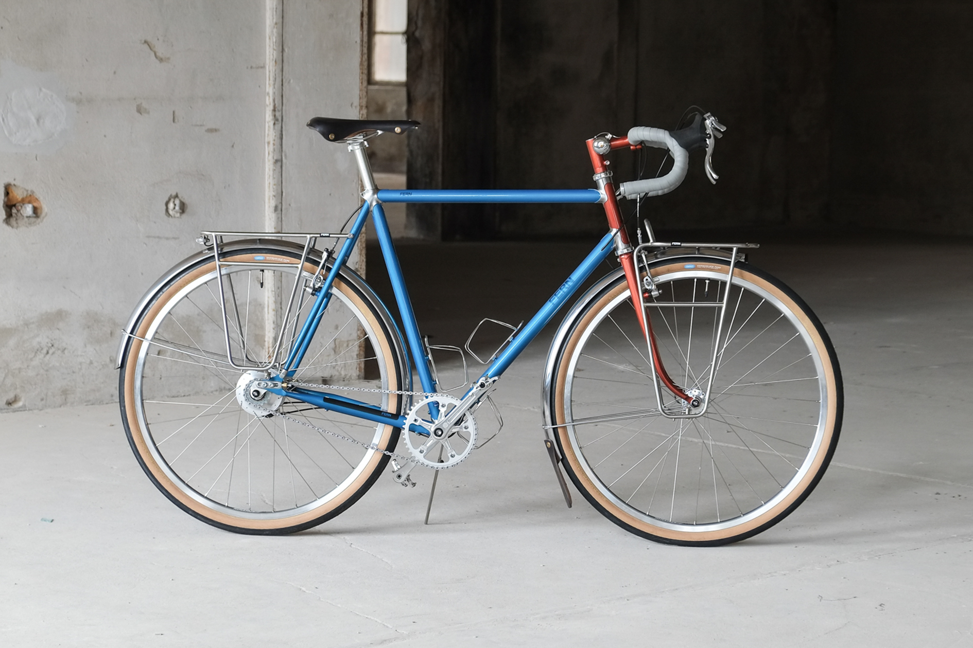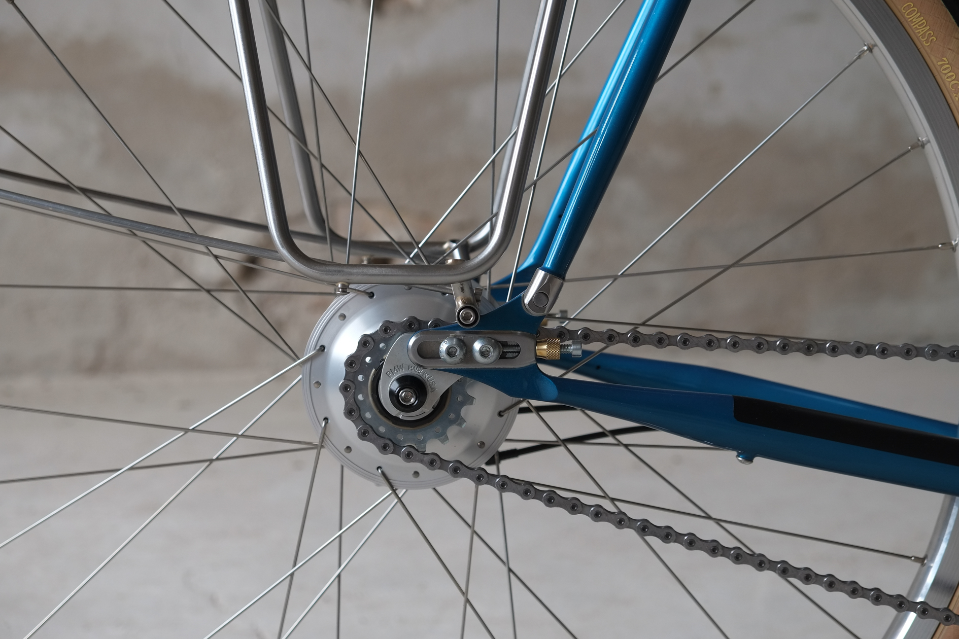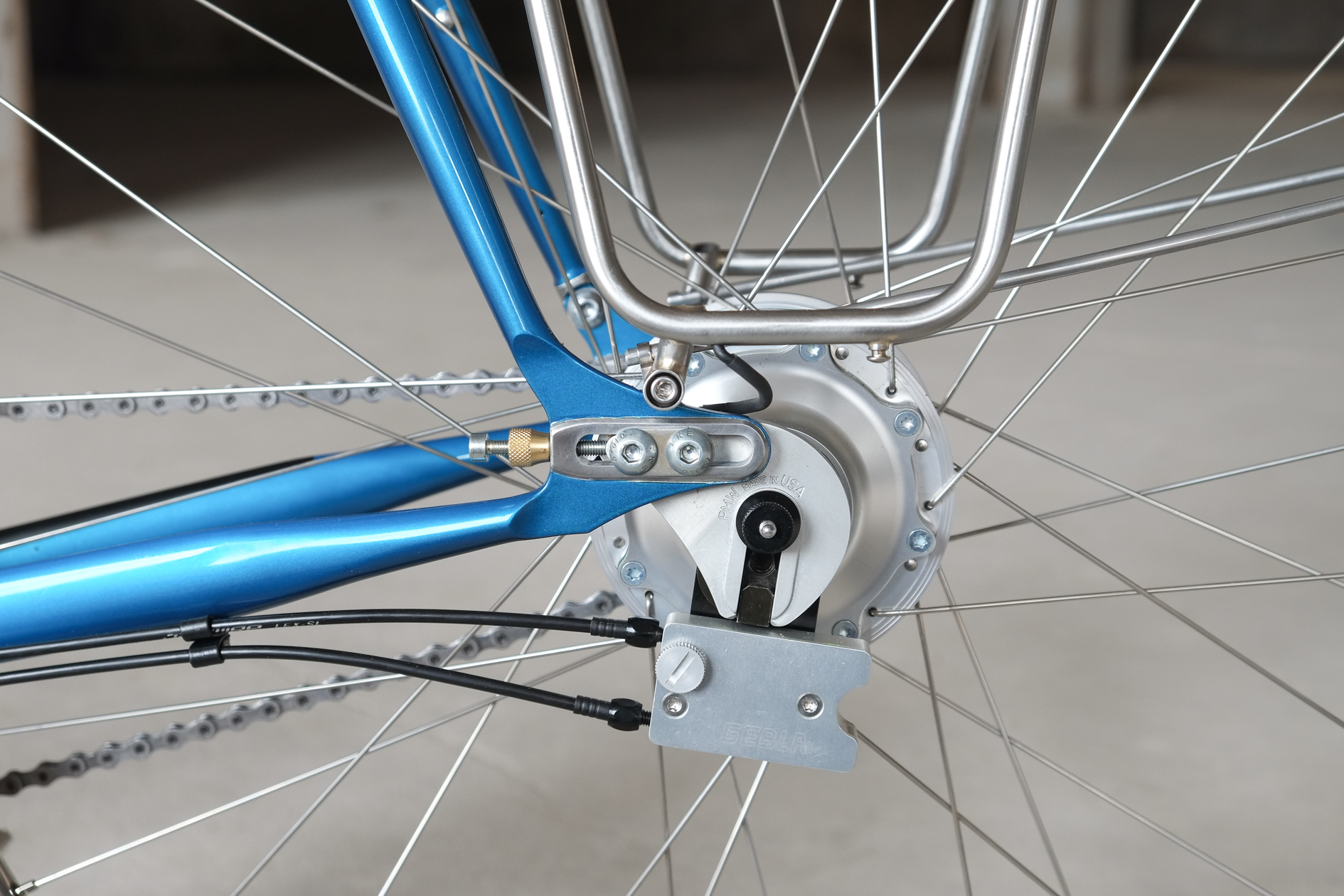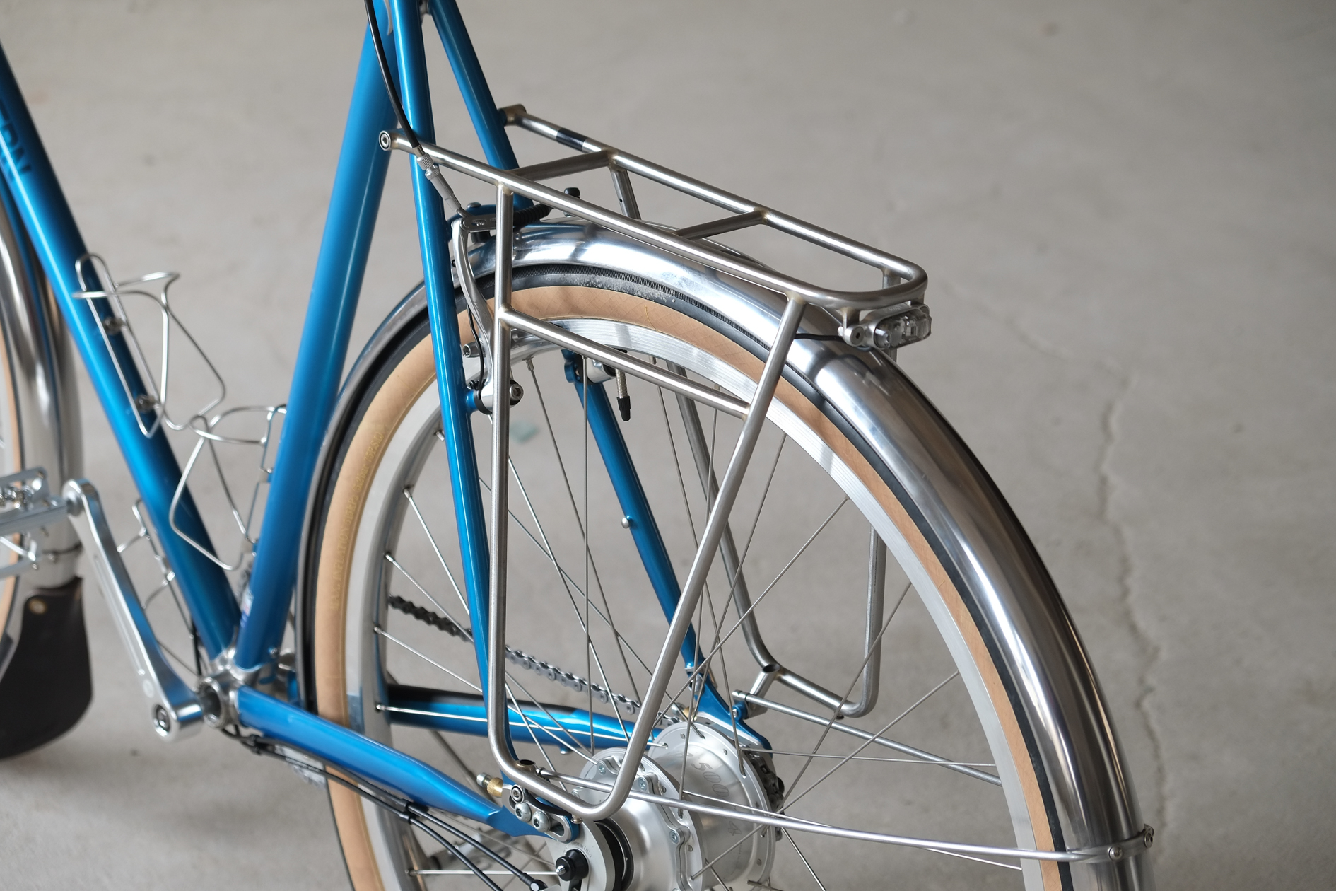 The Chacha touring bike in a classic and refined look. Beautiful handcarved stainless lugs matching the special stainless custom racks. Despite it’s classic appeal this bike is a modern and fully capable world traveller, providing a stable ride with it’s oversized high end tubing even when heavy loaded. We combined the famous Rohloff internally geared hub with special customized Gevenalle shifters to give you the best shifting performance ever to be found on a dropbar Rohloff bike.