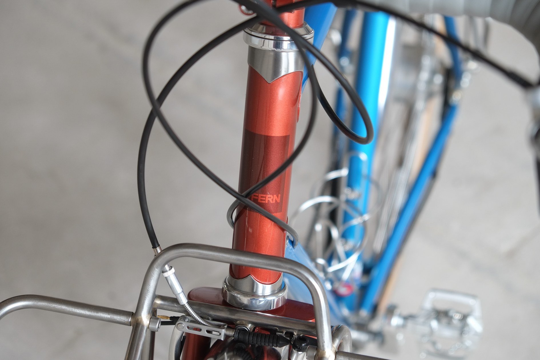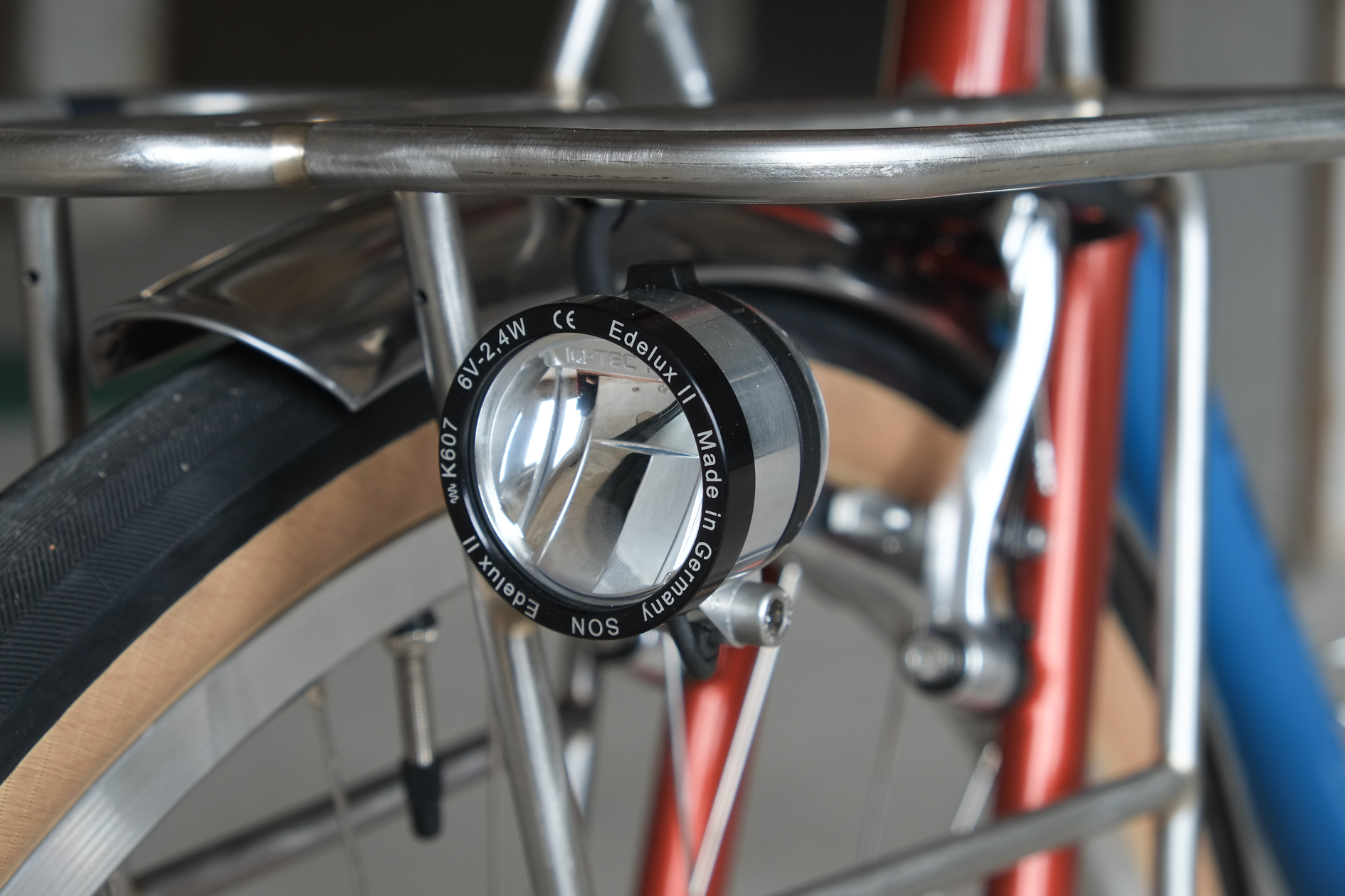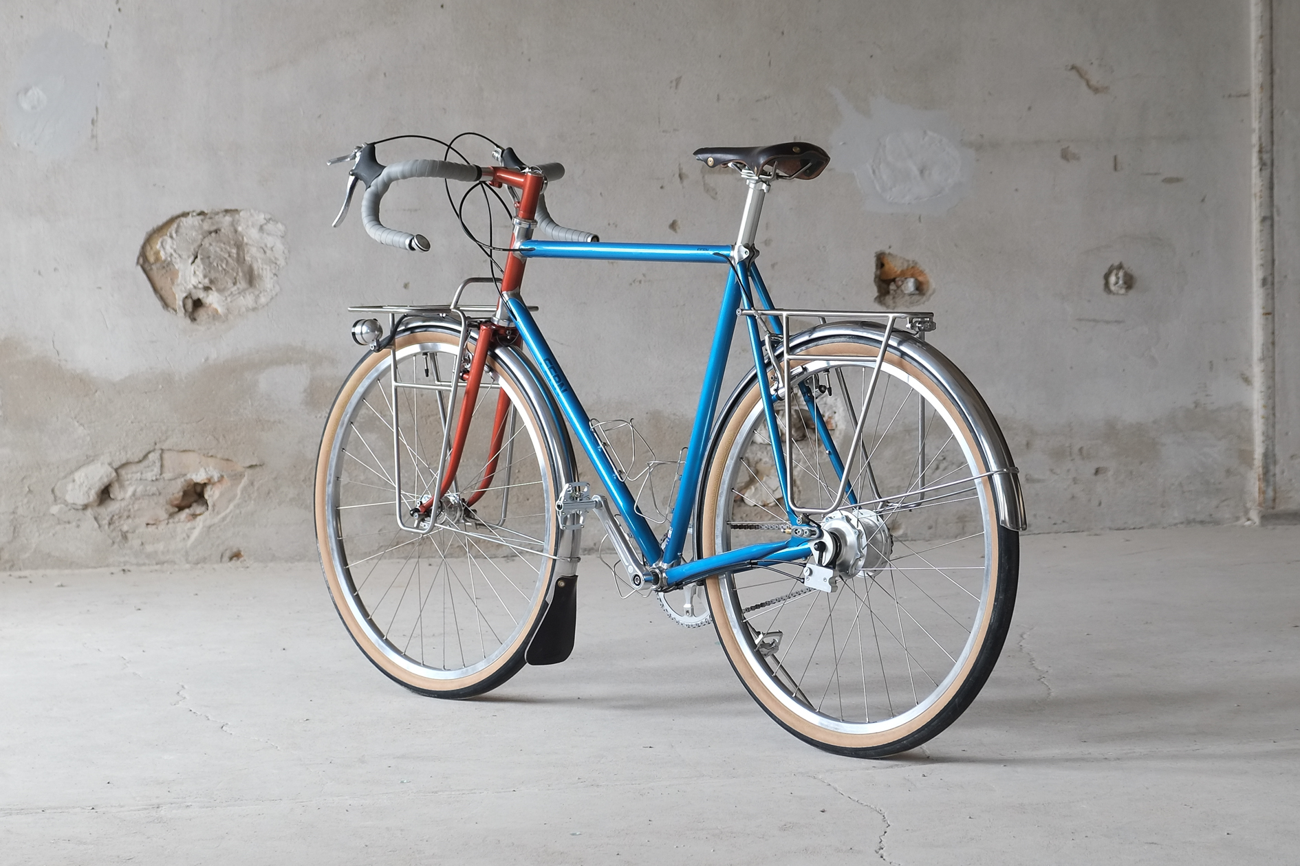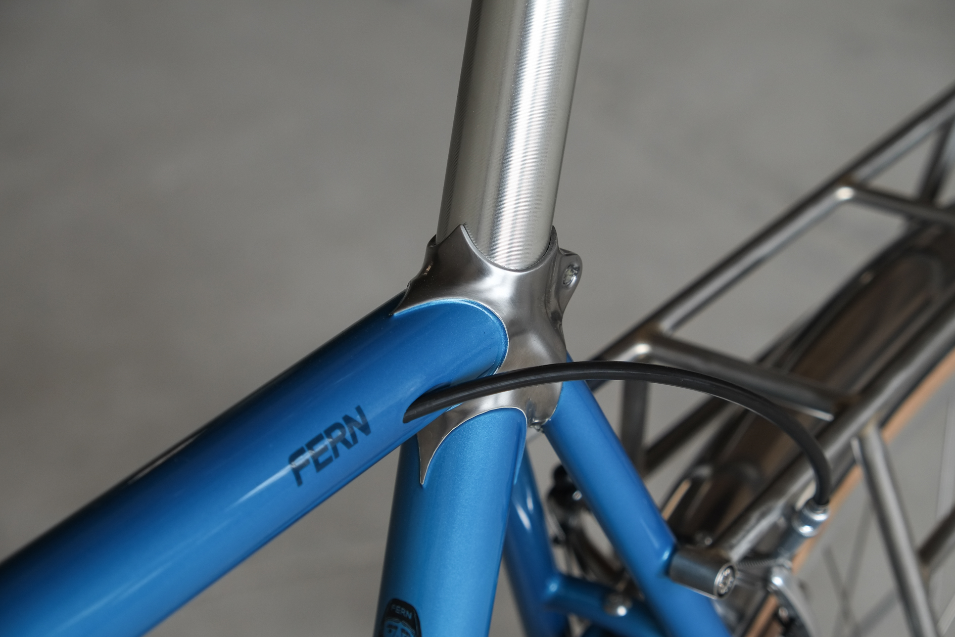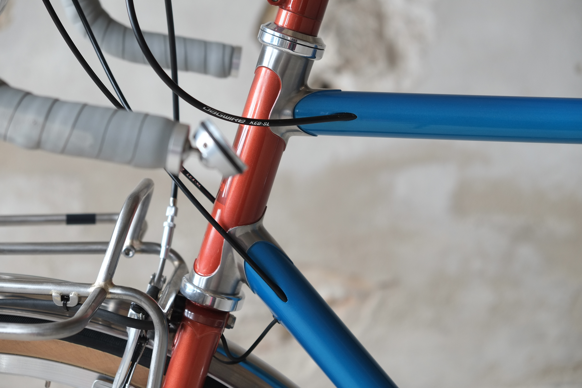 The Chacha touring bike in a classic and refined look. Beautiful handcarved stainless lugs matching the special stainless custom racks. Despite it’s classic appeal this bike is a modern and fully capable world traveller, providing a stable ride with it’s oversized high end tubing even when heavy loaded. We combined the famous Rohloff internally geared hub with special customized Gevenalle shifters to give you the best shifting performance ever to be found on a dropbar Rohloff bike.