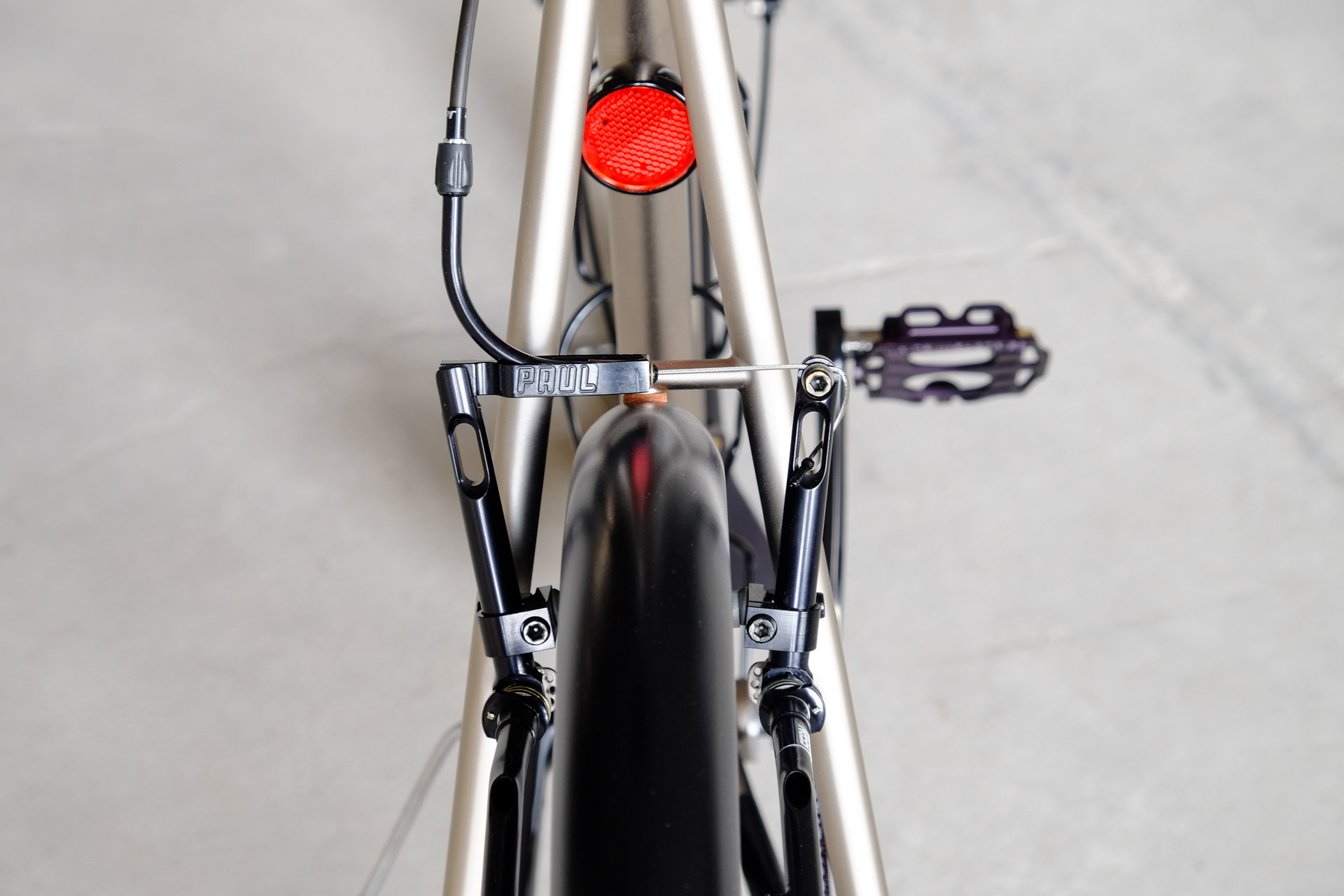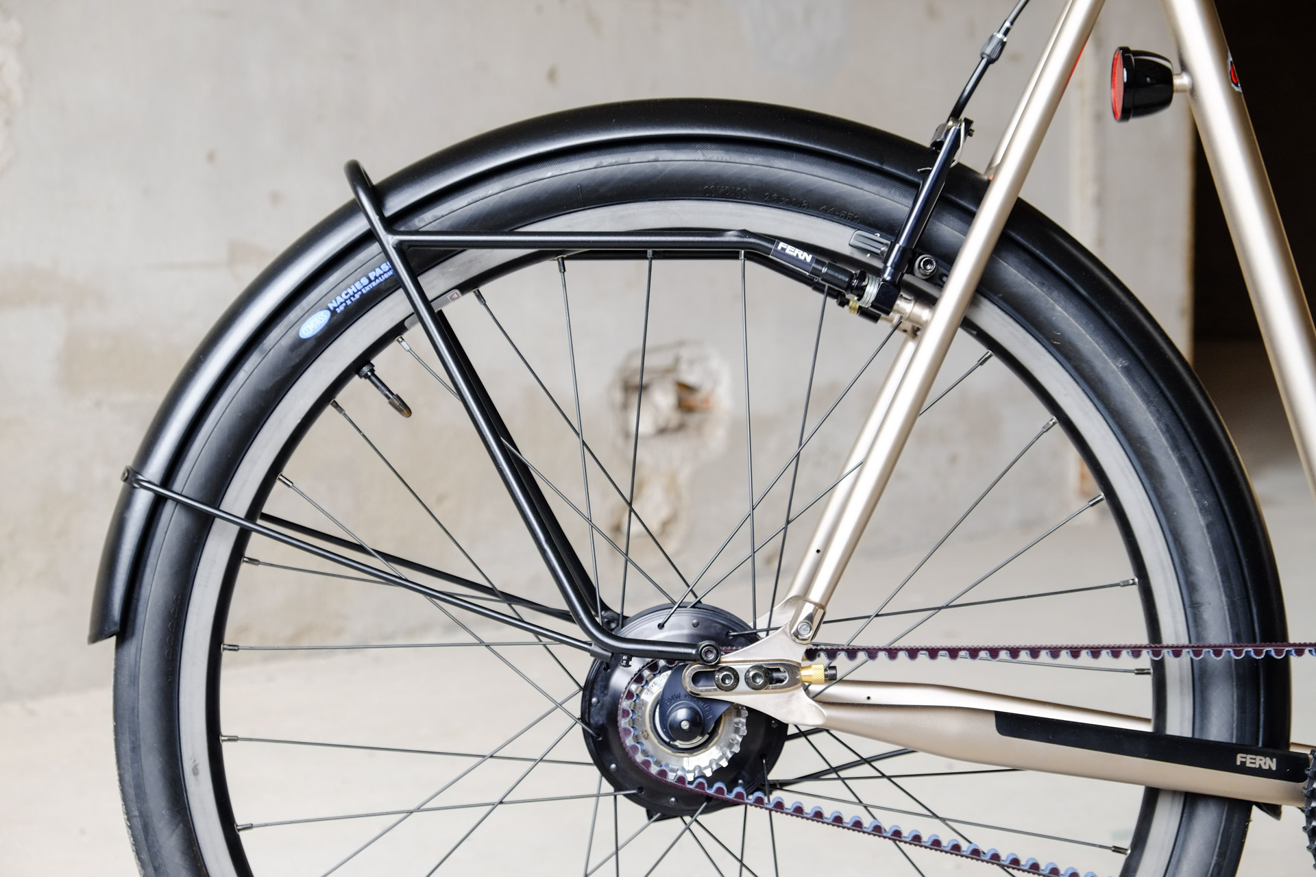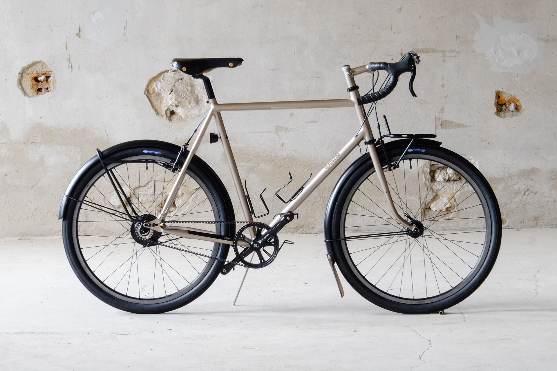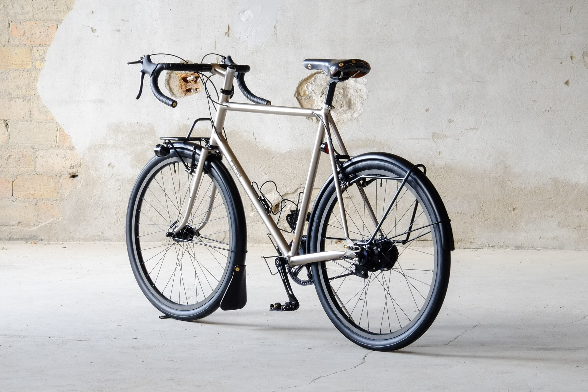 ...rien ne va plus!! This nickel plated dream features only the finest selction of components you can put on a bicycle. Fully internal cable routed custom frame made from finest Columbus life tubing, double plate randonneur fork, deluxe stem, and a set of very special custom made racks. We teamed up some Gevenalle levers, custom ceramic painted Dia-Compe downtube shifters and the ingenious Gebla Rohbox for perfect shifting action with a internally geared Rohloff rear hub. Trouble free belt driven transmisson provided by Gates and smoothest rolling on Rene Herse Naches Pass tires mounted on carbide coated CSS Ryde rims. Front hub dynamo, Headlight and charging all made in Germany by SON and a wonderful custom painted Rene Herse taillight to be switched on and off with a stem mounted switch made by Velolumino. Thanks alot to Paul components, who made a pair of complete black custom anodized Moto Lite brakes for us! The Mighty comp Sugino crankset is spinned by one of the last black pairs of White Industries urban platform pedals we could finally find in Japan. Wonderful details like handlebartape, bar end plugs, mudflap and fenders all made by our friends at Gilles Berthoud!
