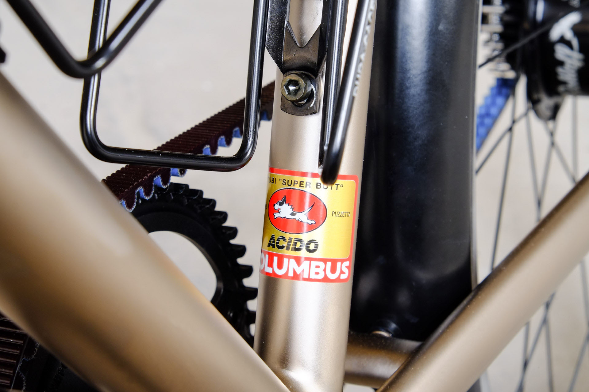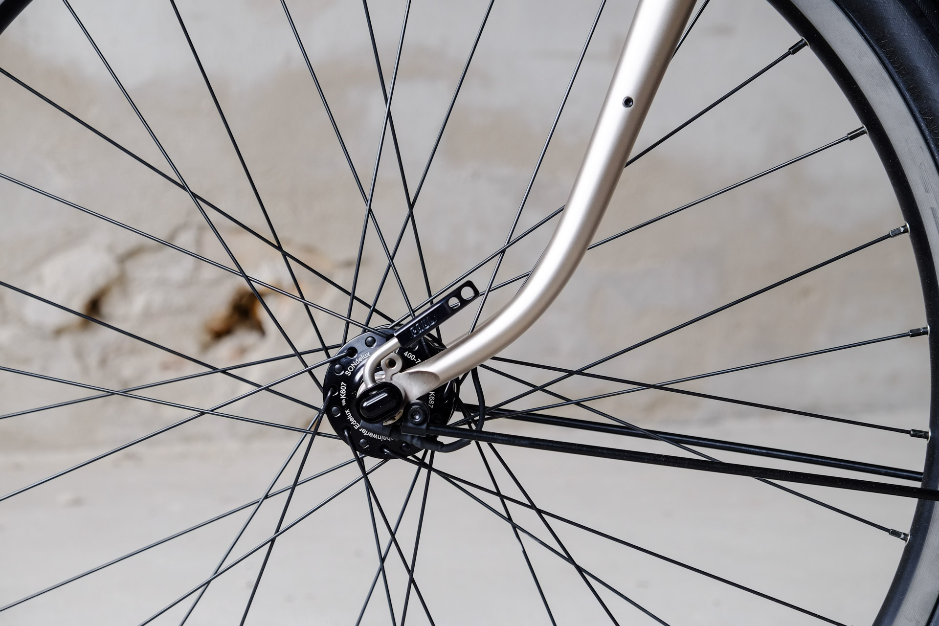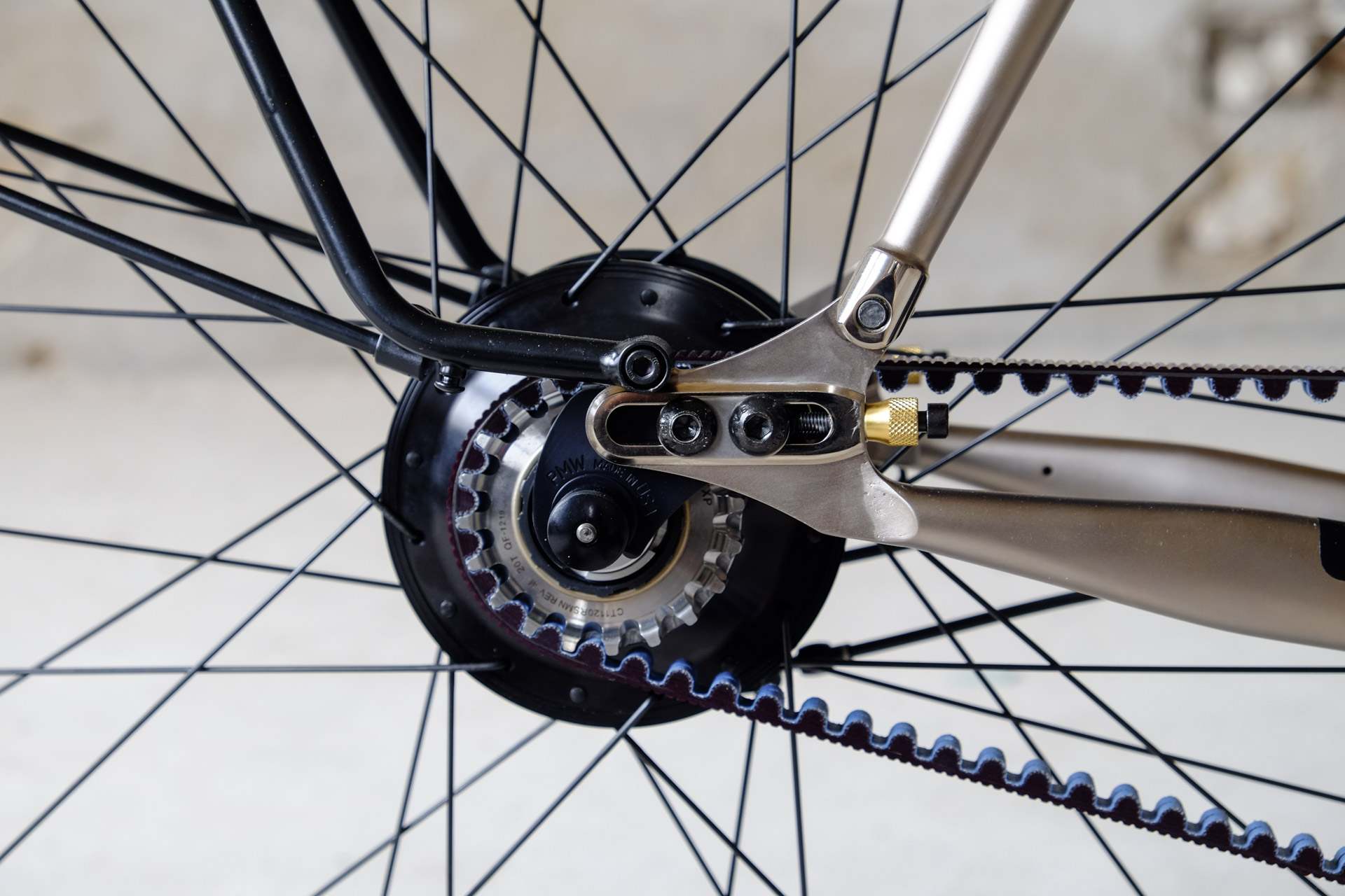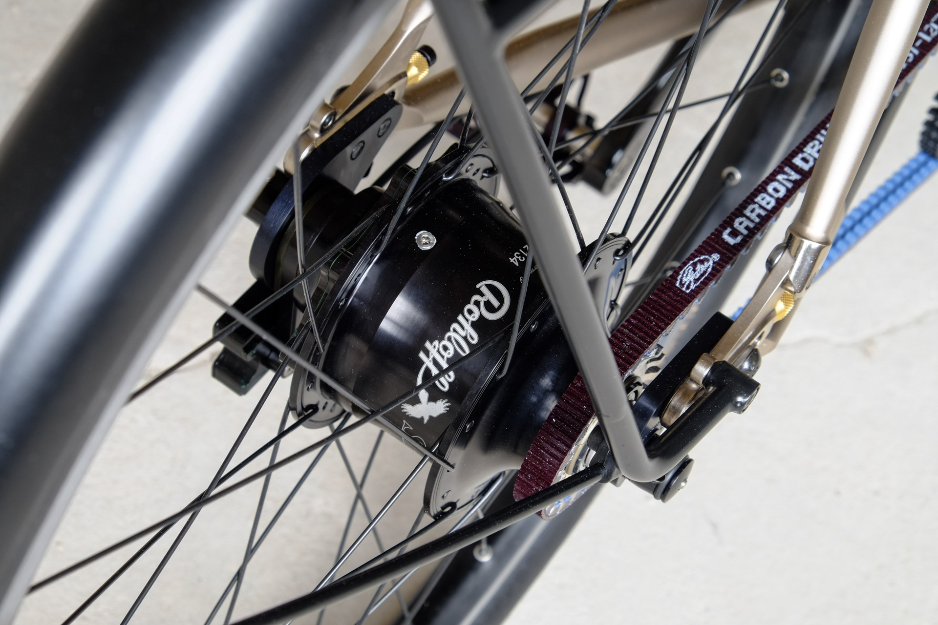 ...rien ne va plus!! This nickel plated dream features only the finest selction of components you can put on a bicycle. Fully internal cable routed custom frame made from finest Columbus life tubing, double plate randonneur fork, deluxe stem, and a set of very special custom made racks. We teamed up some Gevenalle levers, custom ceramic painted Dia-Compe downtube shifters and the ingenious Gebla Rohbox for perfect shifting action with a internally geared Rohloff rear hub. Trouble free belt driven transmisson provided by Gates and smoothest rolling on Rene Herse Naches Pass tires mounted on carbide coated CSS Ryde rims. Front hub dynamo, Headlight and charging all made in Germany by SON and a wonderful custom painted Rene Herse taillight to be switched on and off with a stem mounted switch made by Velolumino. Thanks alot to Paul components, who made a pair of complete black custom anodized Moto Lite brakes for us! The Mighty comp Sugino crankset is spinned by one of the last black pairs of White Industries urban platform pedals we could finally find in Japan. Wonderful details like handlebartape, bar end plugs, mudflap and fenders all made by our friends at Gilles Berthoud!