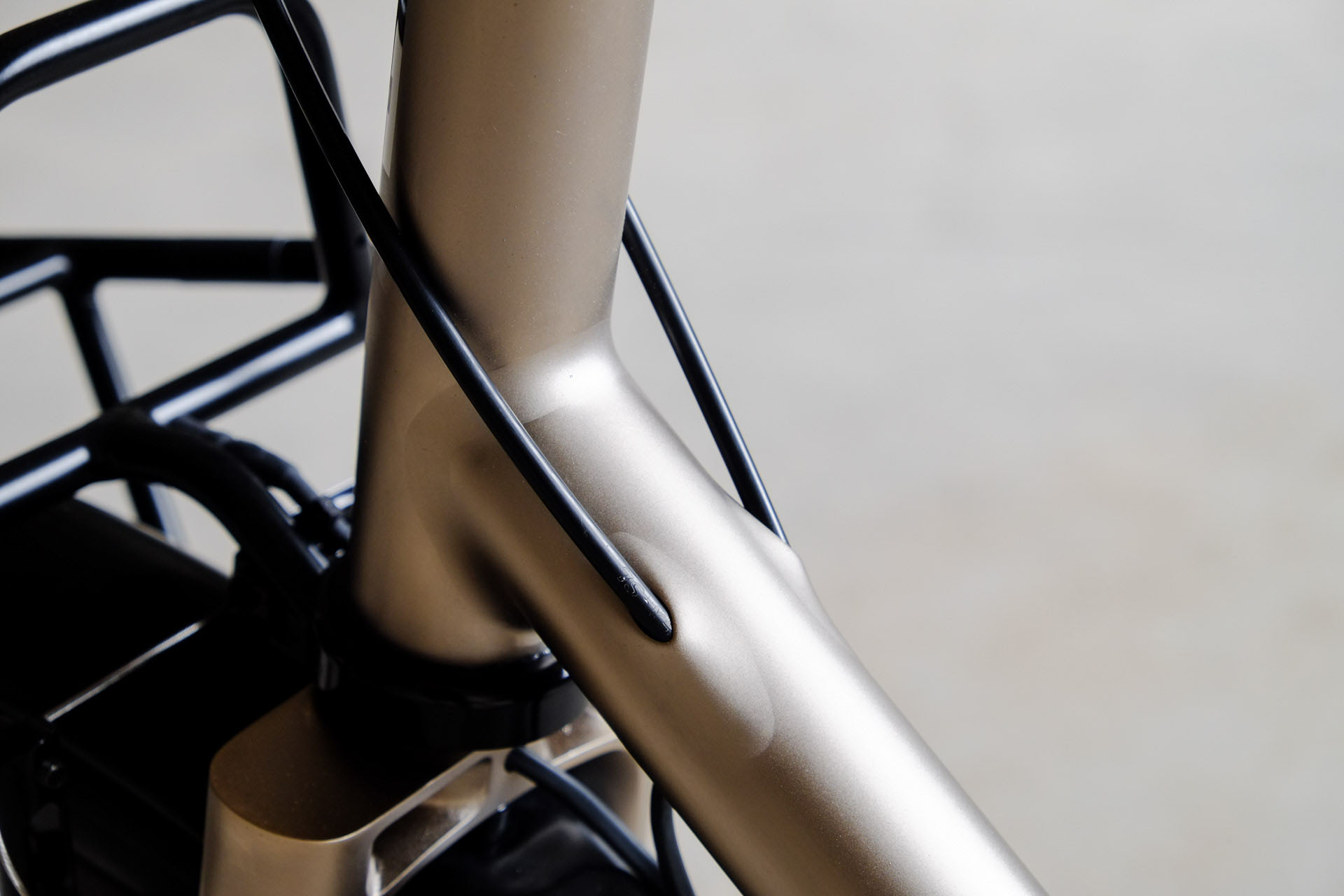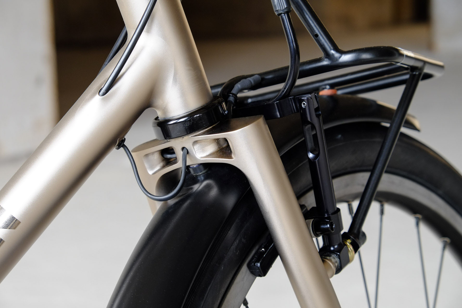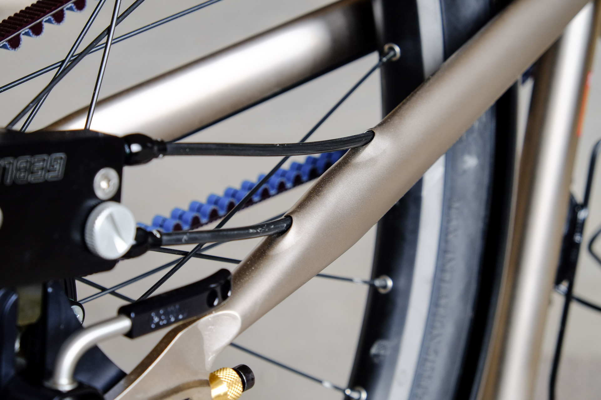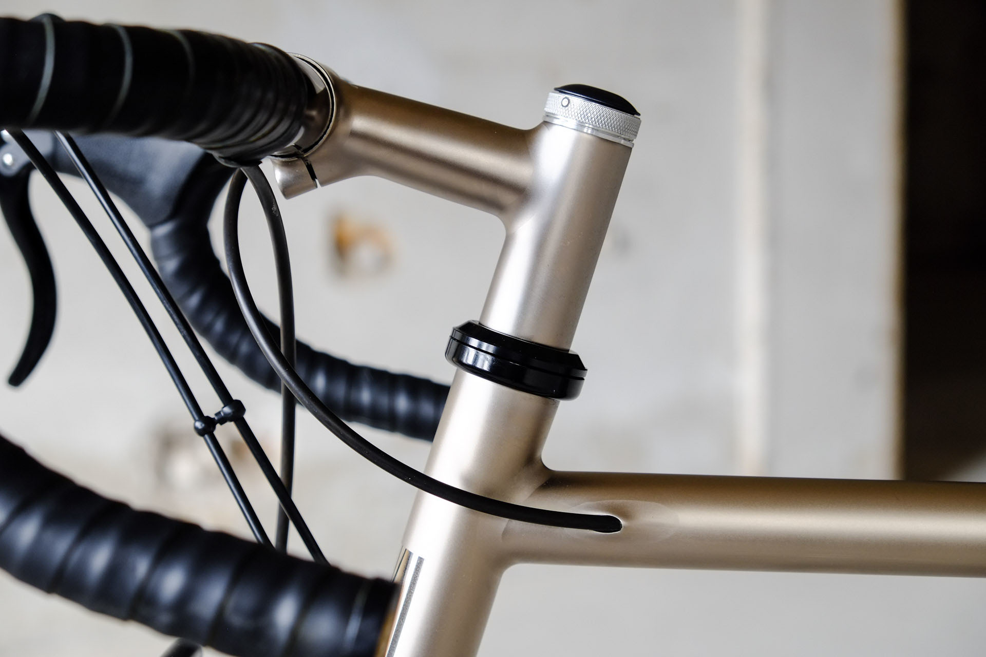 ...rien ne va plus!! This nickel plated dream features only the finest selction of components you can put on a bicycle. Fully internal cable routed custom frame made from finest Columbus life tubing, double plate randonneur fork, deluxe stem, and a set of very special custom made racks. We teamed up some Gevenalle levers, custom ceramic painted Dia-Compe downtube shifters and the ingenious Gebla Rohbox for perfect shifting action with a internally geared Rohloff rear hub. Trouble free belt driven transmisson provided by Gates and smoothest rolling on Rene Herse Naches Pass tires mounted on carbide coated CSS Ryde rims. Front hub dynamo, Headlight and charging all made in Germany by SON and a wonderful custom painted Rene Herse taillight to be switched on and off with a stem mounted switch made by Velolumino. Thanks alot to Paul components, who made a pair of complete black custom anodized Moto Lite brakes for us! The Mighty comp Sugino crankset is spinned by one of the last black pairs of White Industries urban platform pedals we could finally find in Japan. Wonderful details like handlebartape, bar end plugs, mudflap and fenders all made by our friends at Gilles Berthoud!