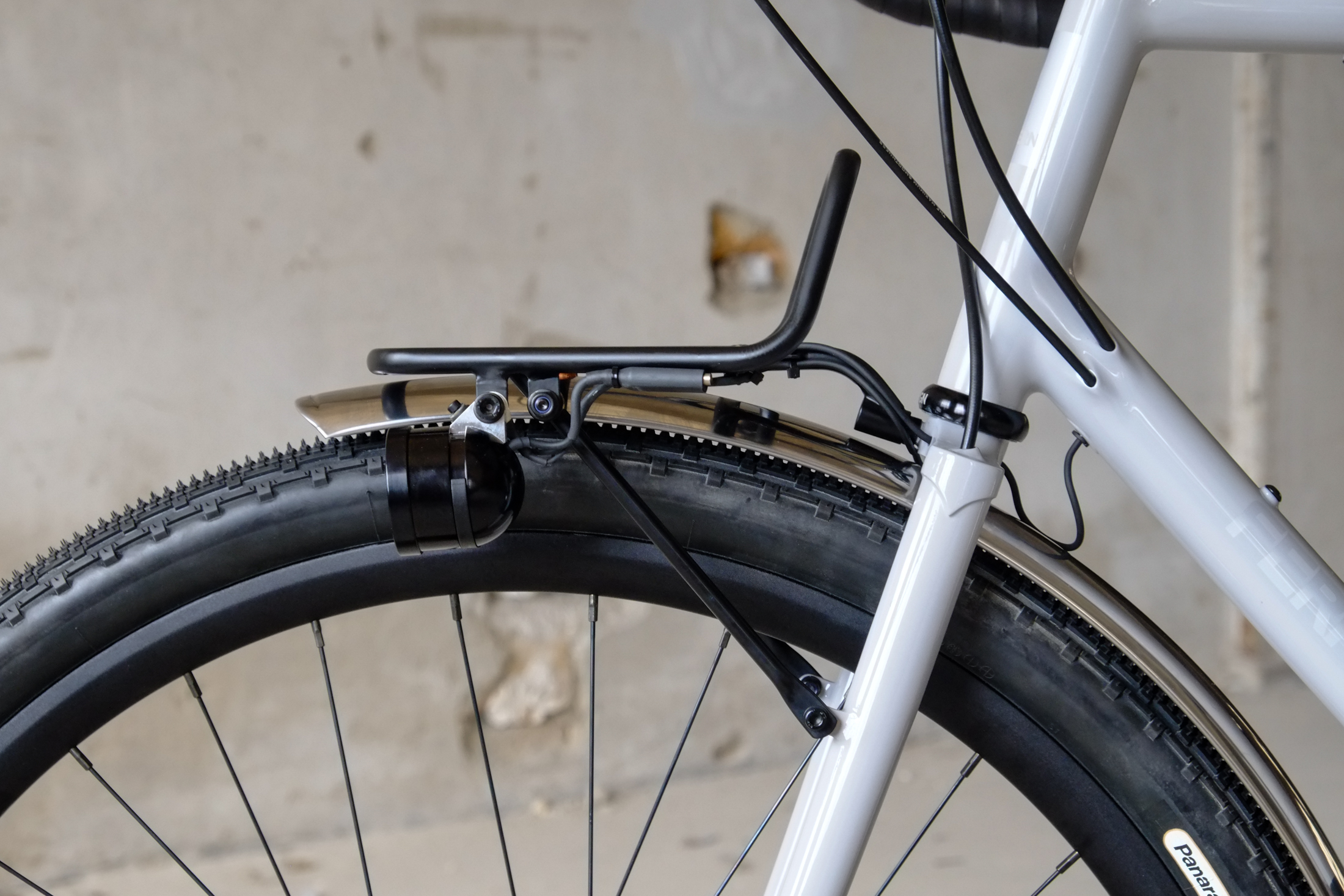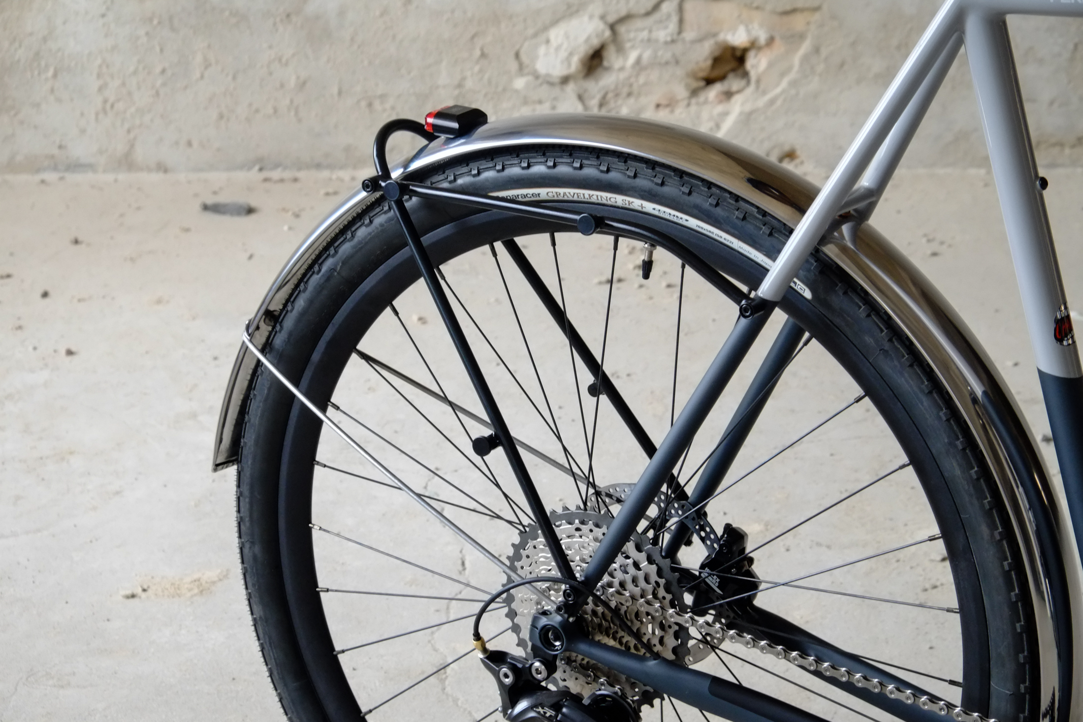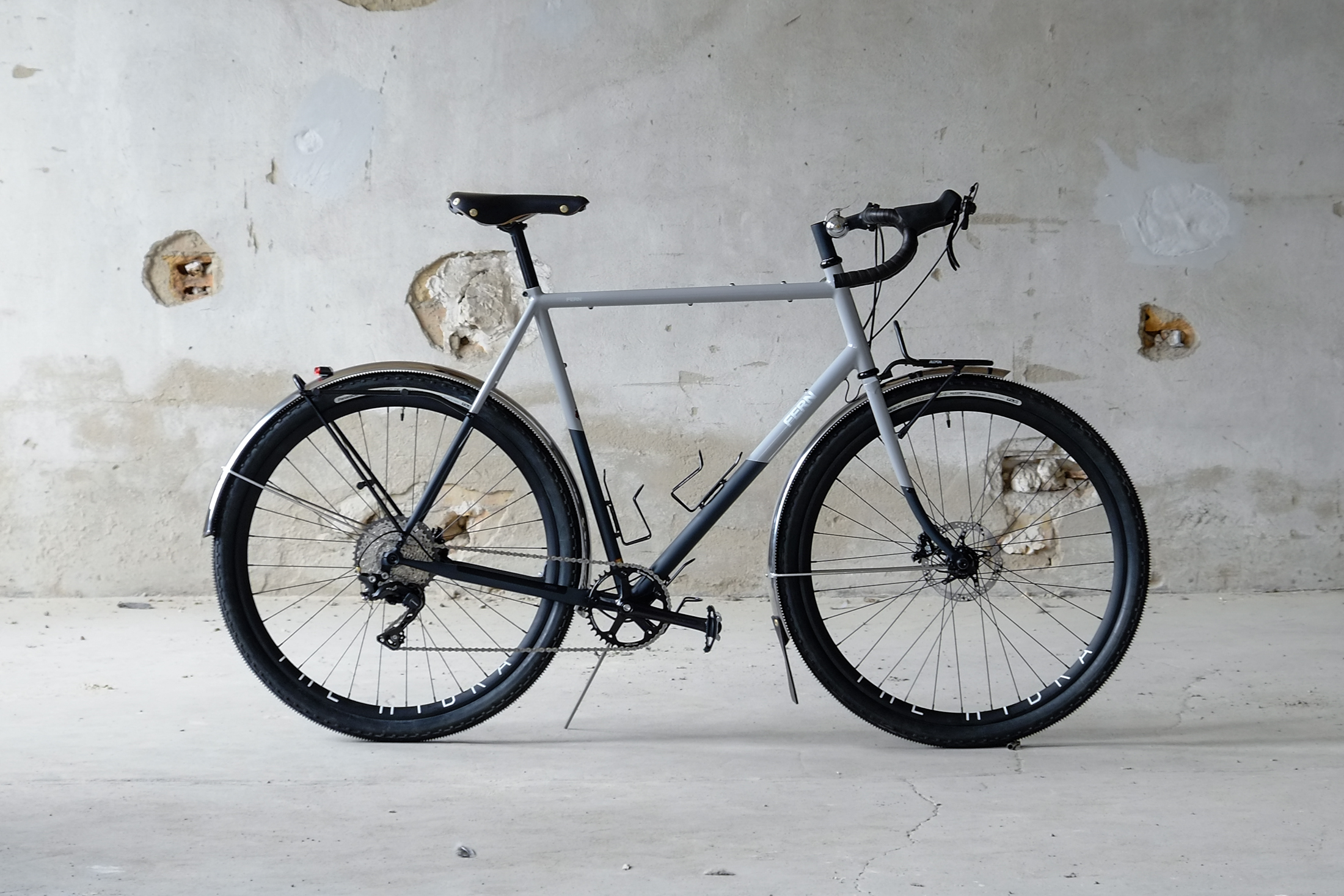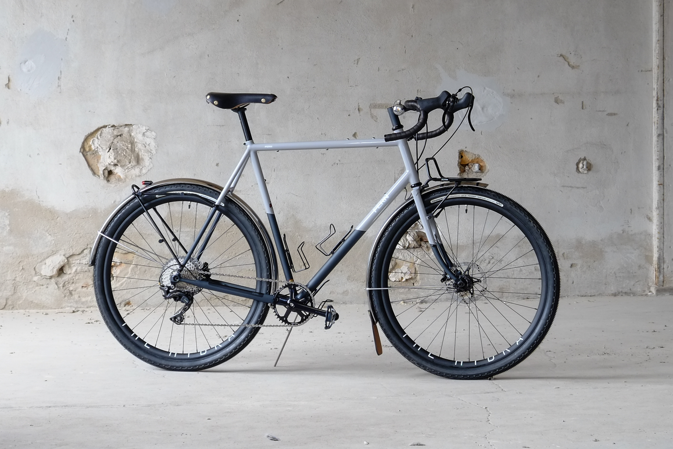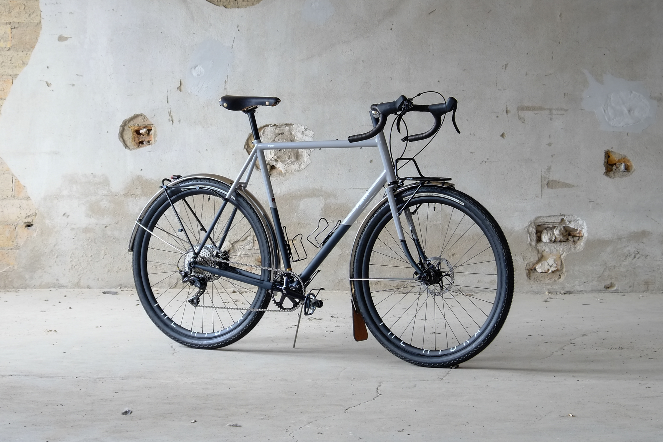 We created a very special bike for Sascha blending modern components such as direct mount flatmount TRP Hylex Disc brakes and 1x Gevenalle drivetrain with the classic silhouette of a fully equipped randonner bike. Wonderful parts made by our friends at Gilles Berthoud are clearly the icing on the cake! To make a really super versatile bike we build in enough clearance for super wide 700cx50mm tires so you can ride this monster really everywhere!