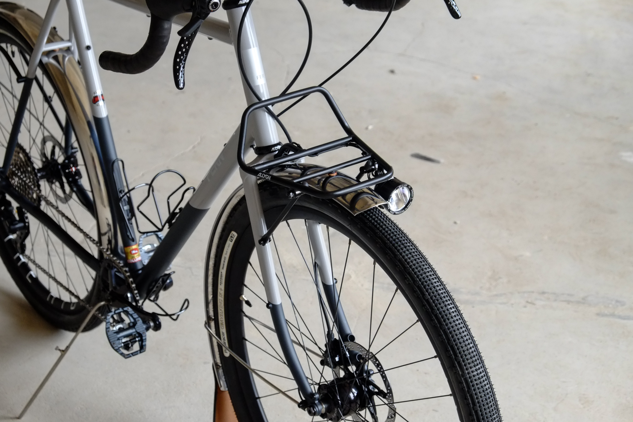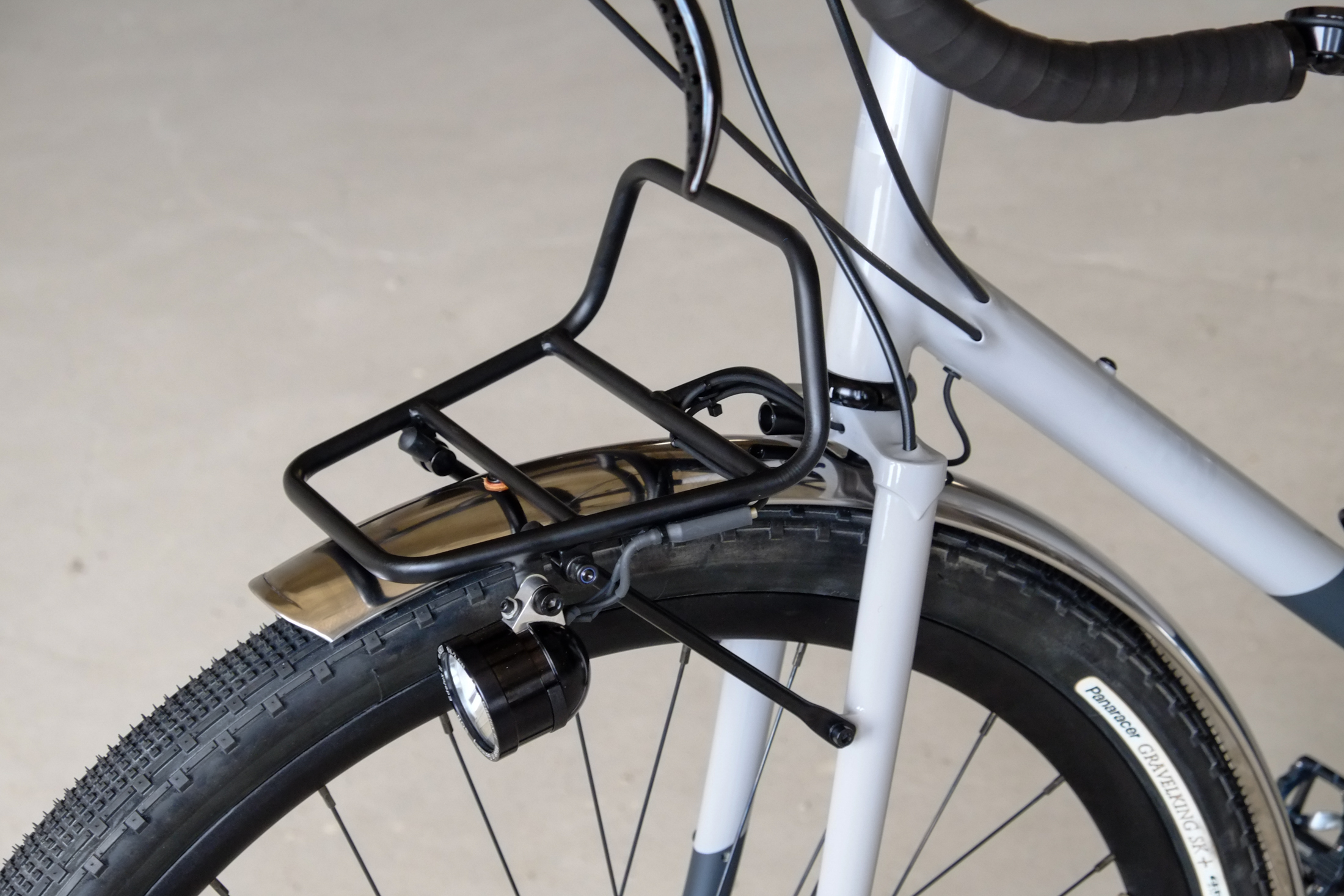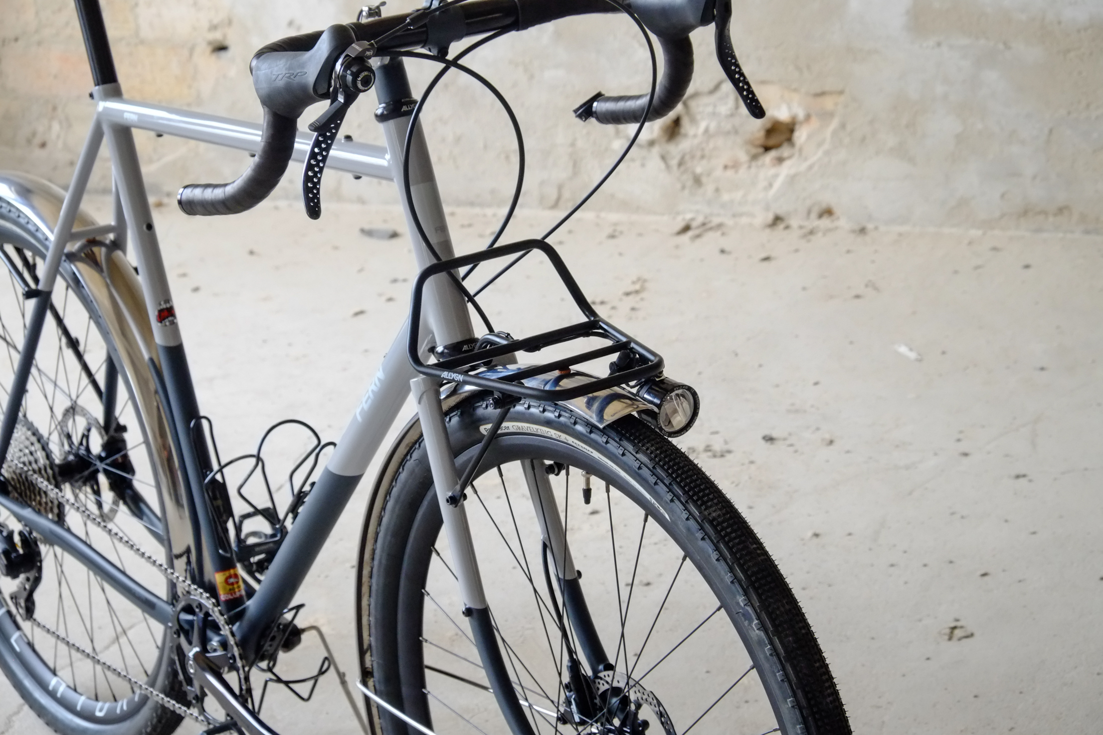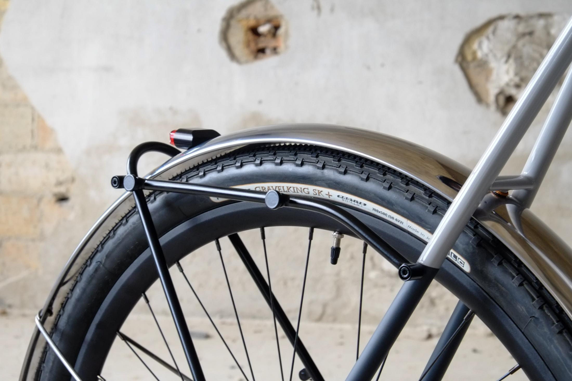 We created a very special bike for Sascha blending modern components such as direct mount flatmount TRP Hylex Disc brakes and 1x Gevenalle drivetrain with the classic silhouette of a fully equipped randonner bike. Wonderful parts made by our friends at Gilles Berthoud are clearly the icing on the cake! To make a really super versatile bike we build in enough clearance for super wide 700cx50mm tires so you can ride this monster really everywhere!