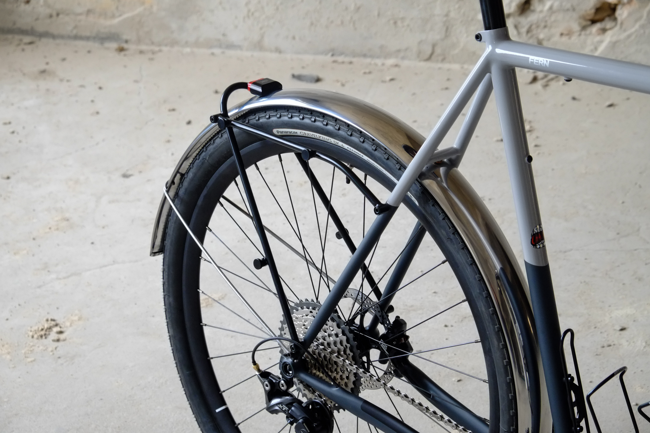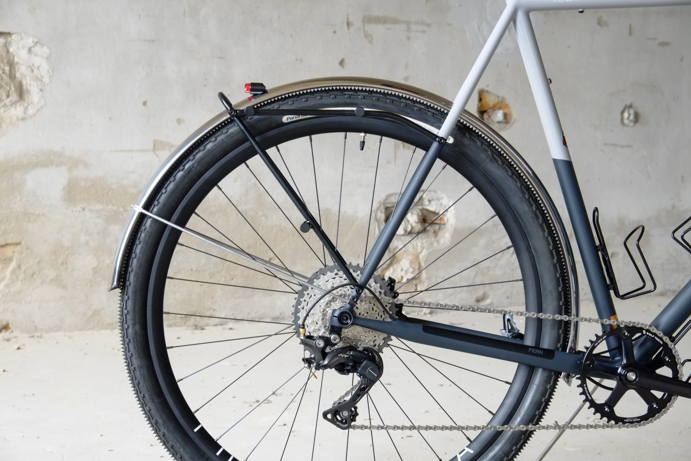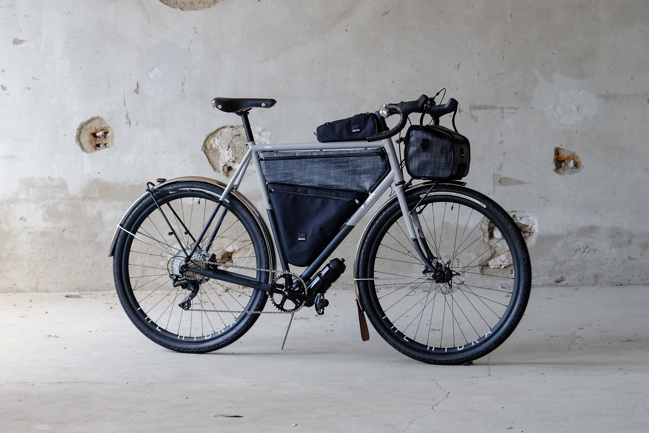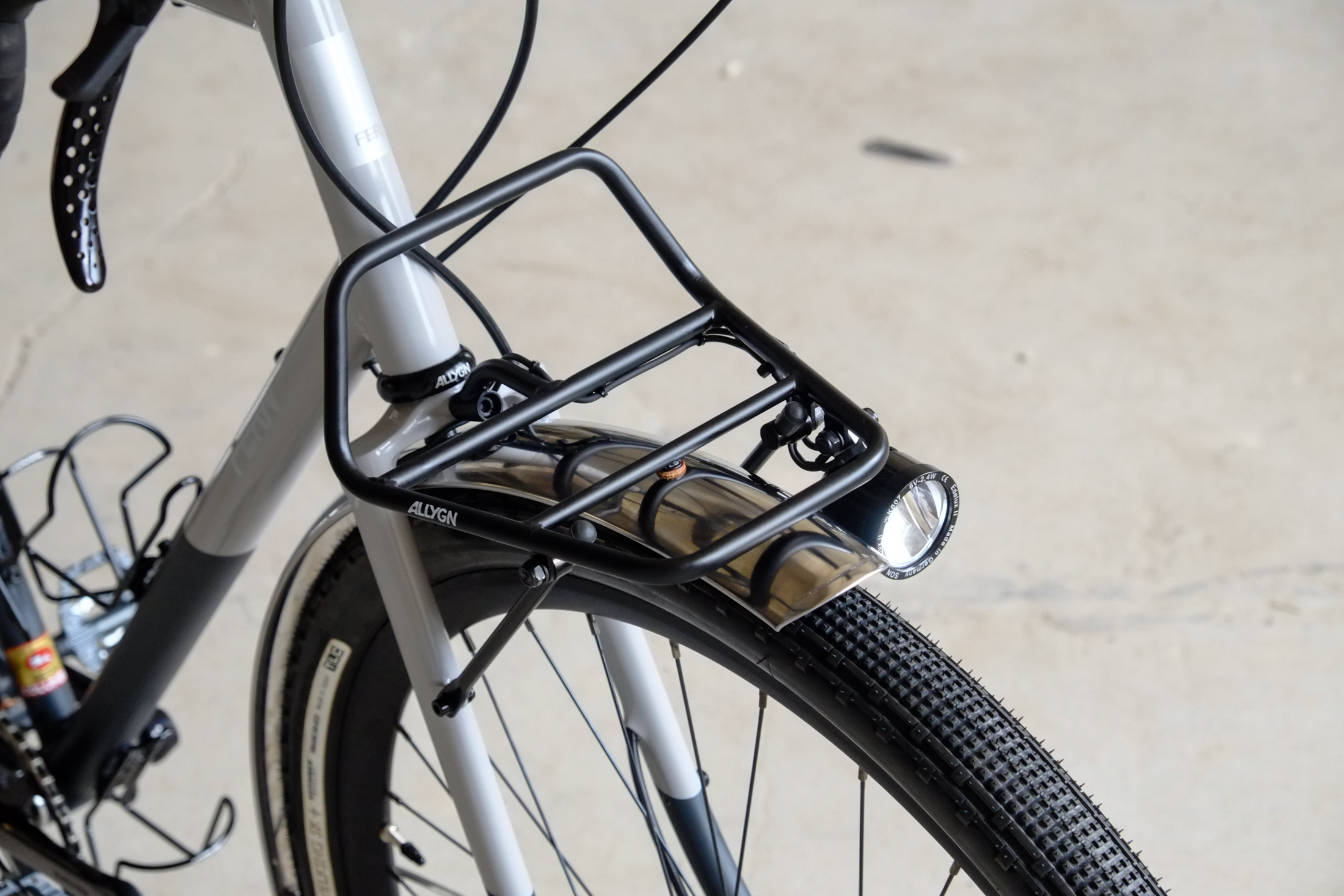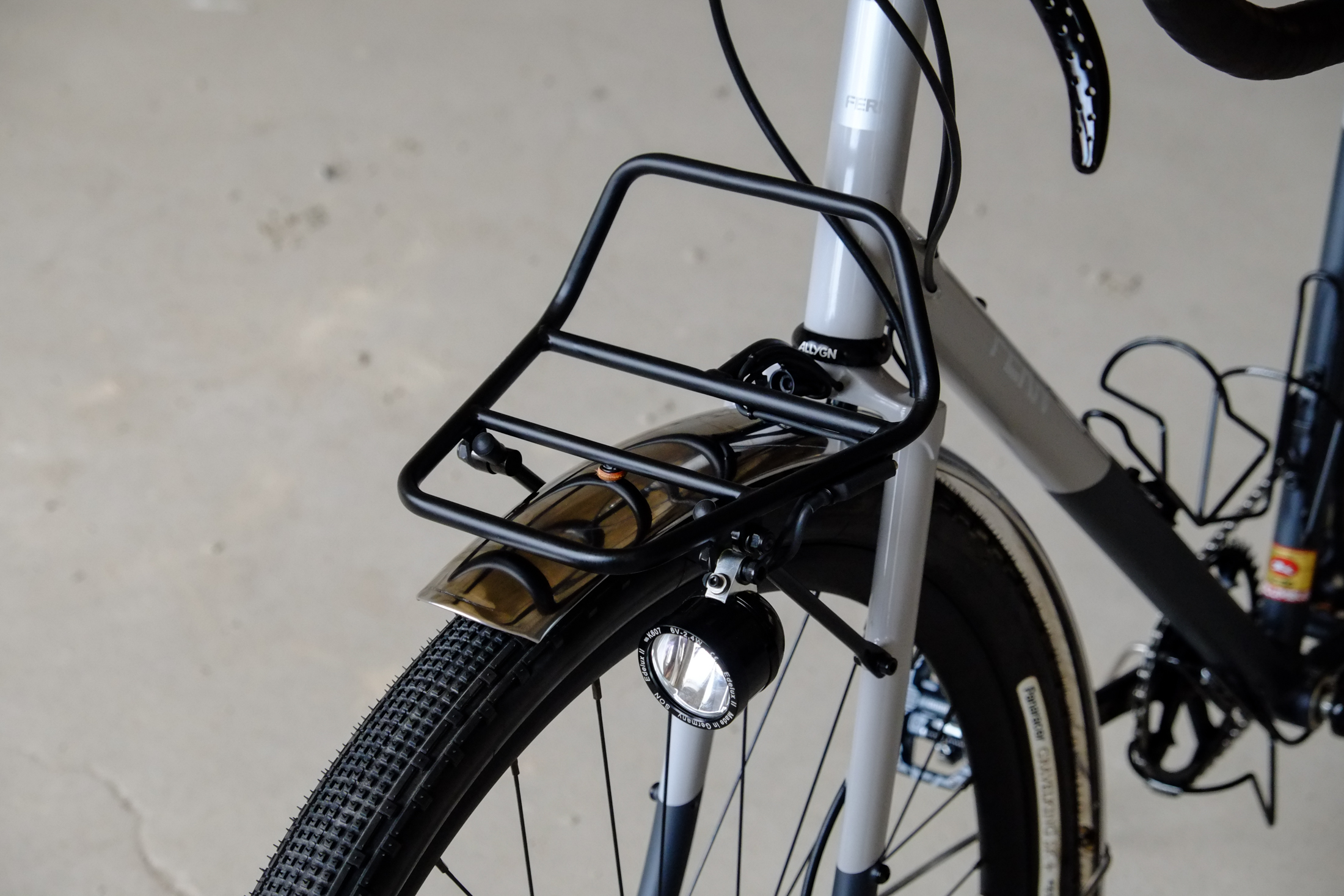 We created a very special bike for Sascha blending modern components such as direct mount flatmount TRP Hylex Disc brakes and 1x Gevenalle drivetrain with the classic silhouette of a fully equipped randonner bike. Wonderful parts made by our friends at Gilles Berthoud are clearly the icing on the cake! To make a really super versatile bike we build in enough clearance for super wide 700cx50mm tires so you can ride this monster really everywhere!
