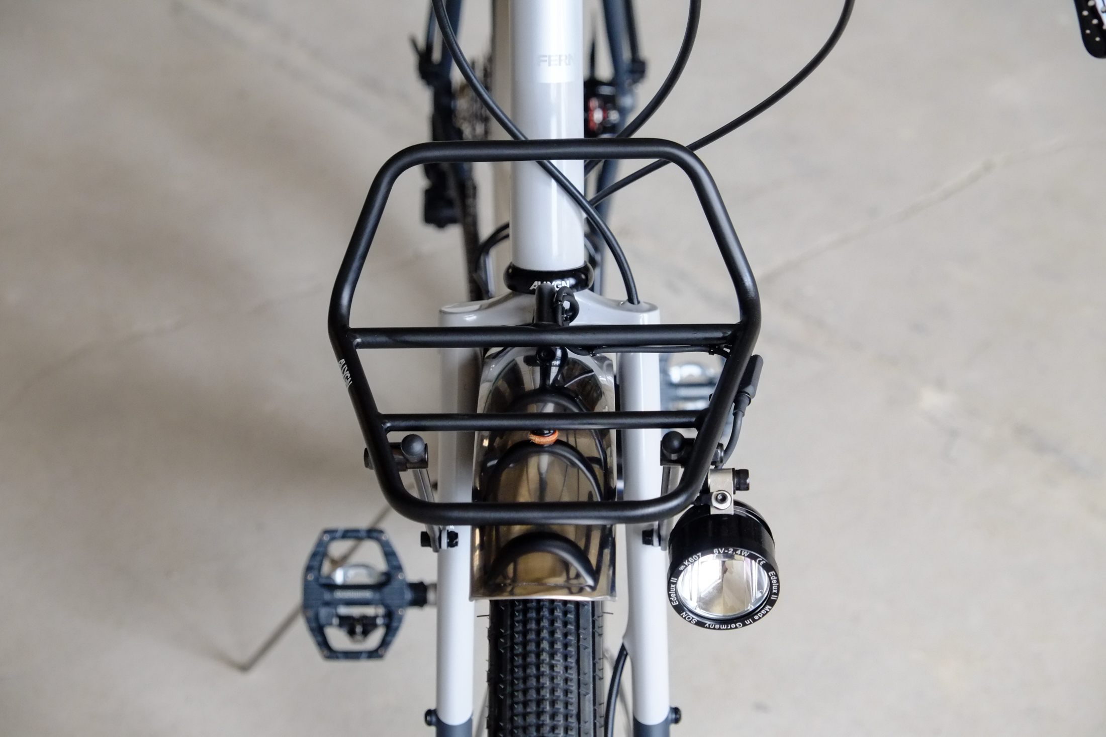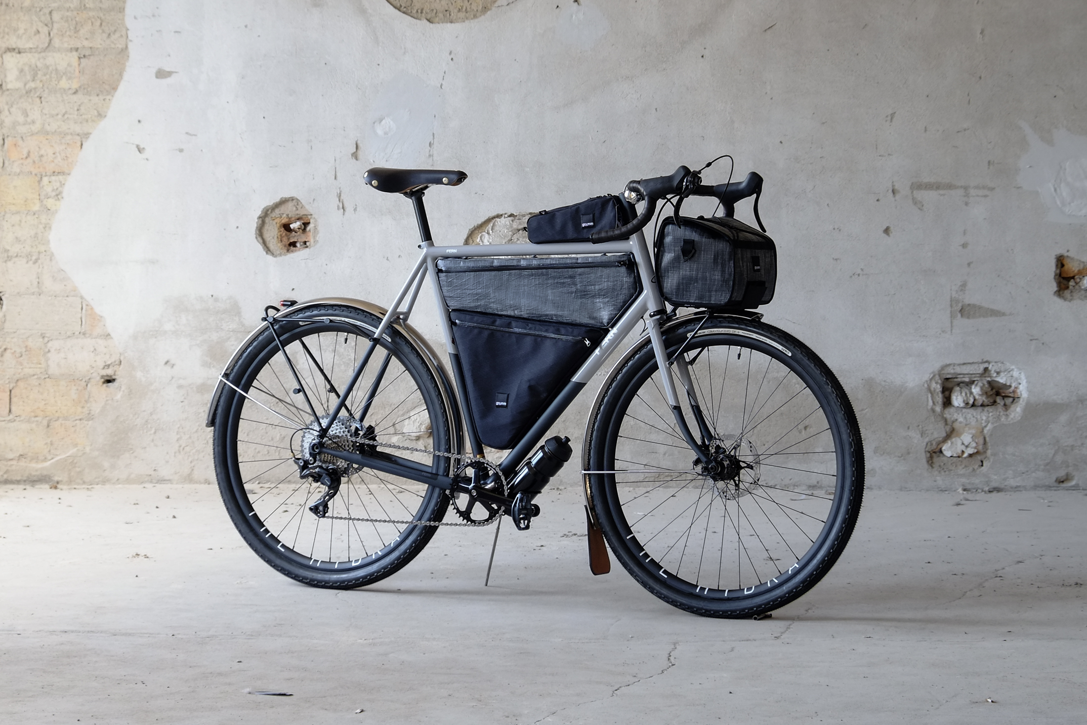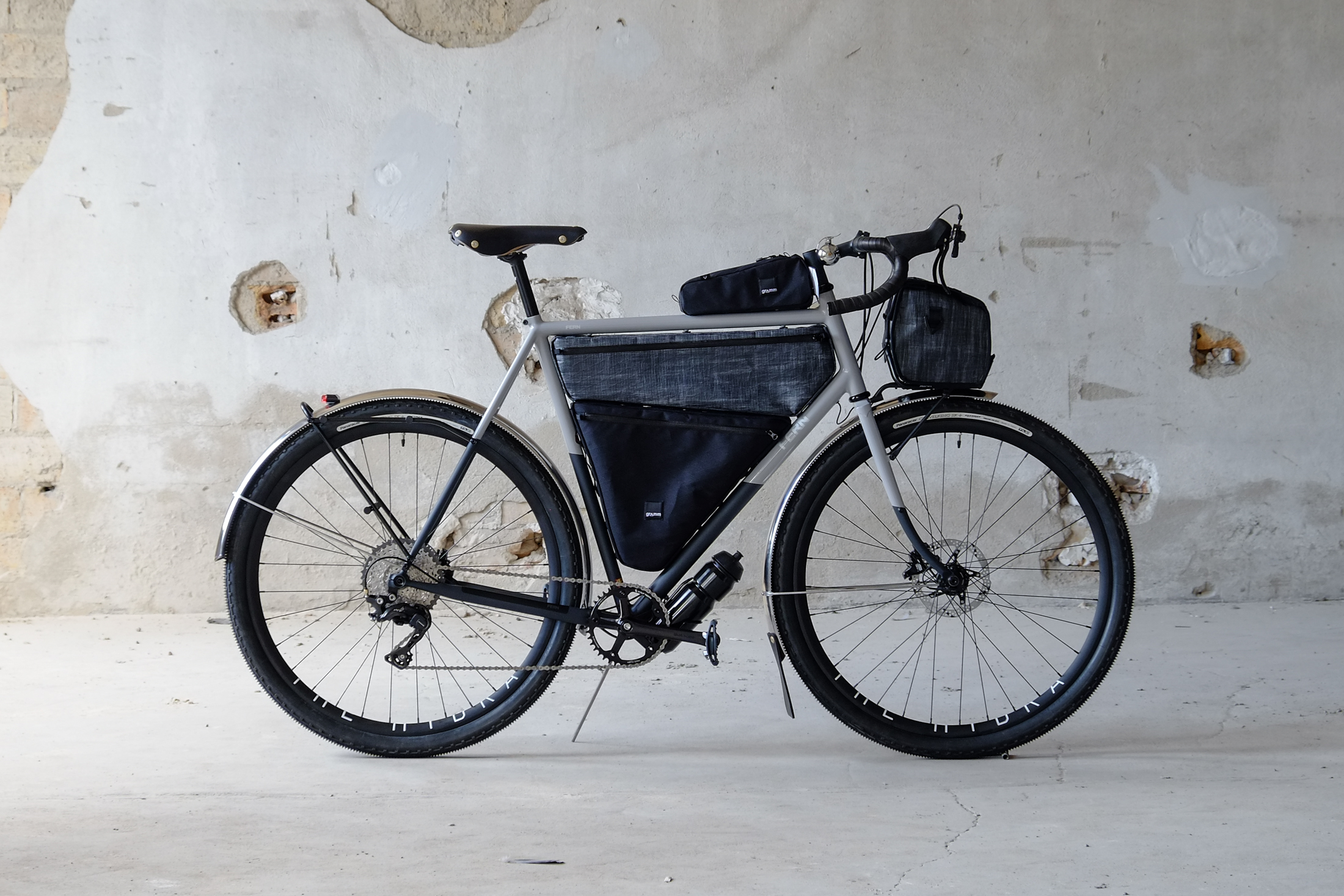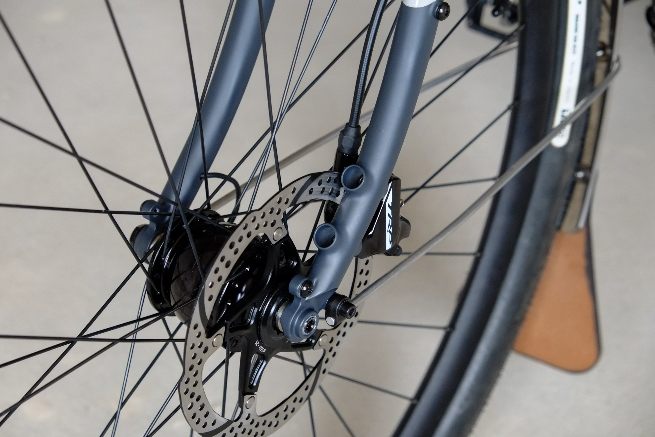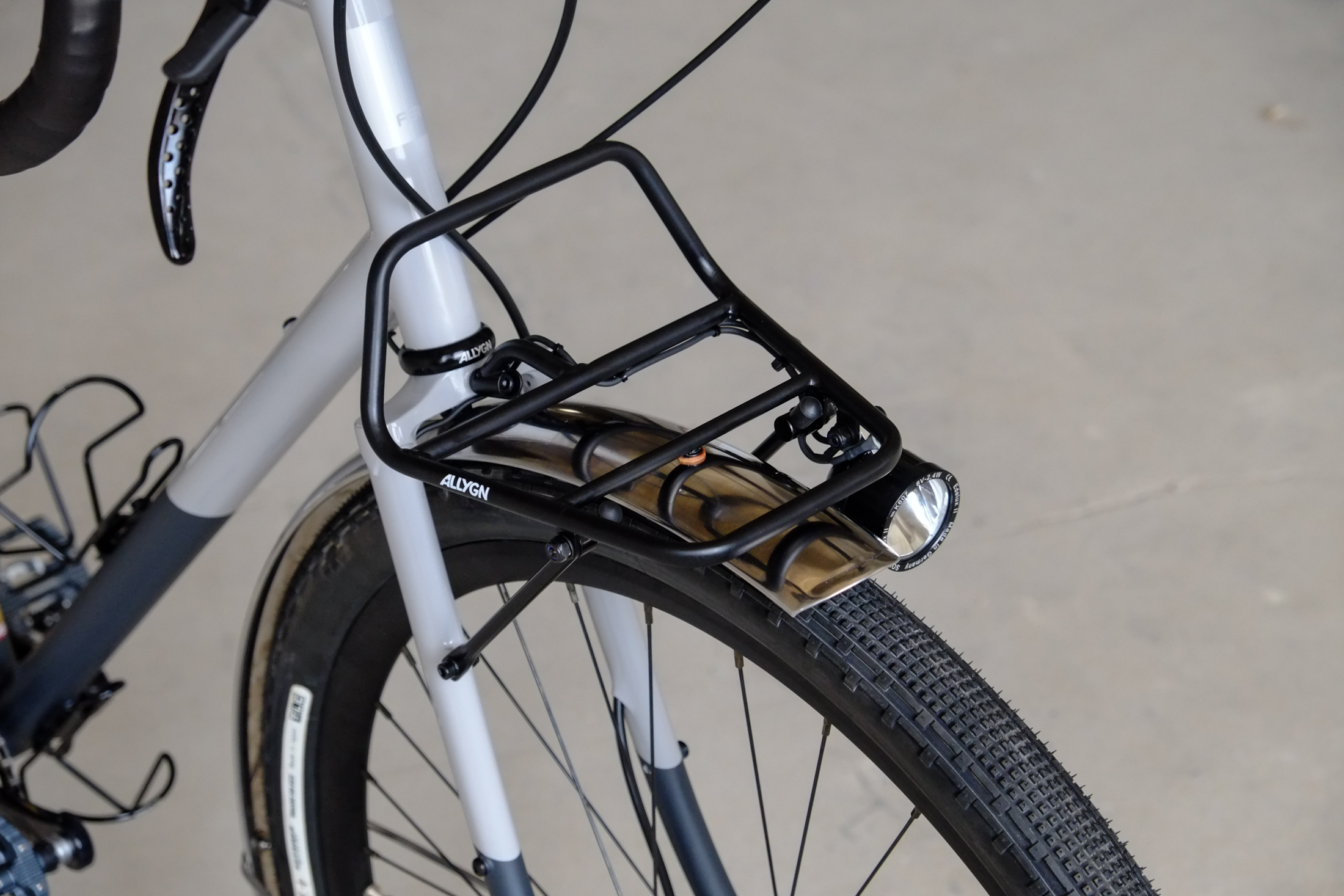 We created a very special bike for Sascha blending modern components such as direct mount flatmount TRP Hylex Disc brakes and 1x Gevenalle drivetrain with the classic silhouette of a fully equipped randonner bike. Wonderful parts made by our friends at Gilles Berthoud are clearly the icing on the cake! To make a really super versatile bike we build in enough clearance for super wide 700cx50mm tires so you can ride this monster really everywhere!