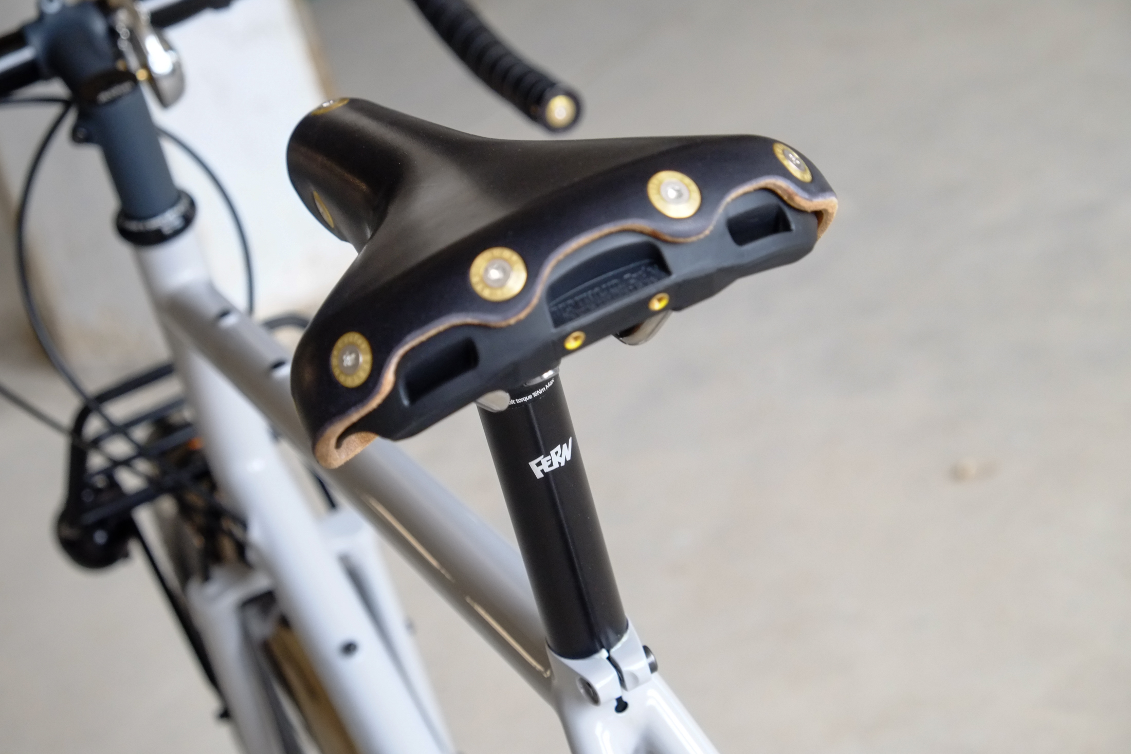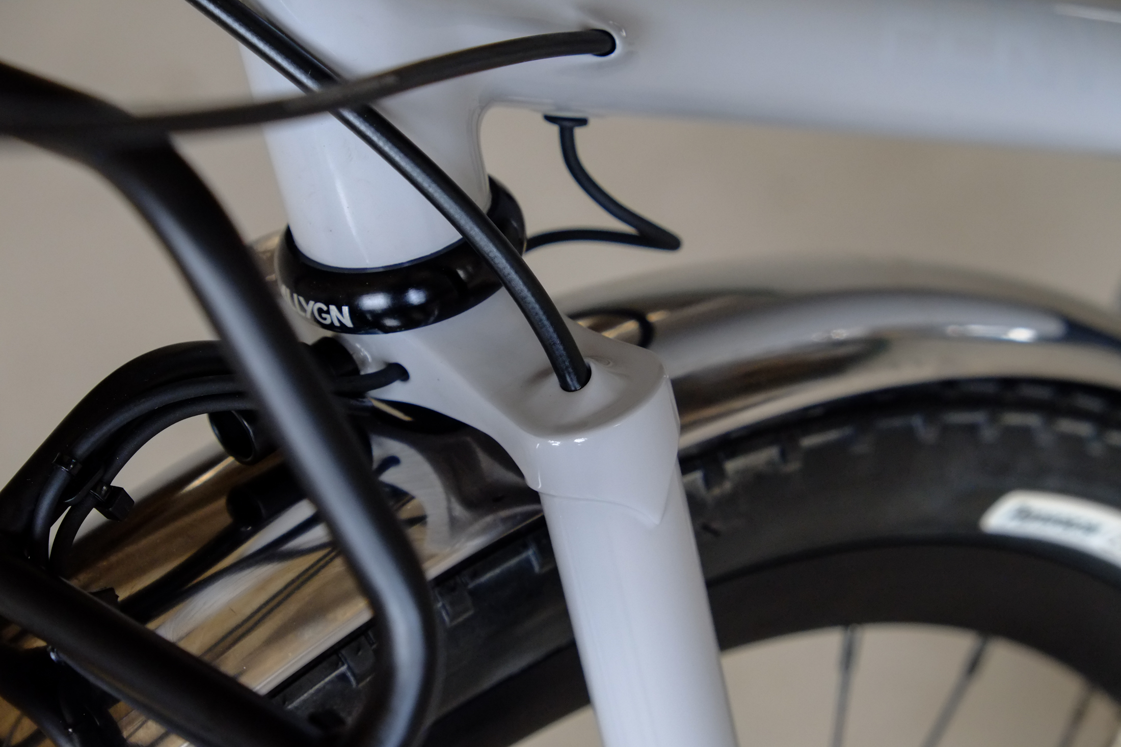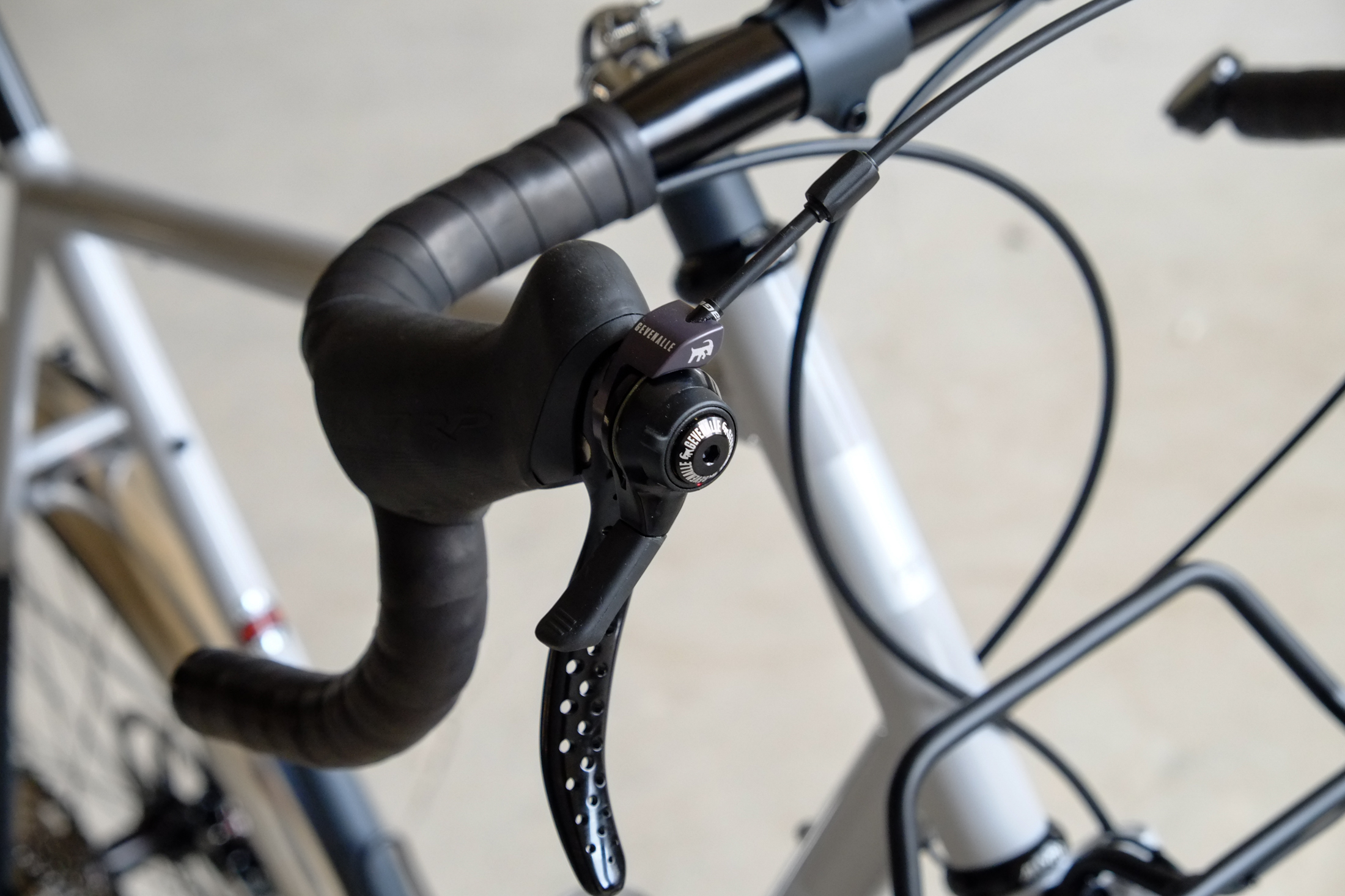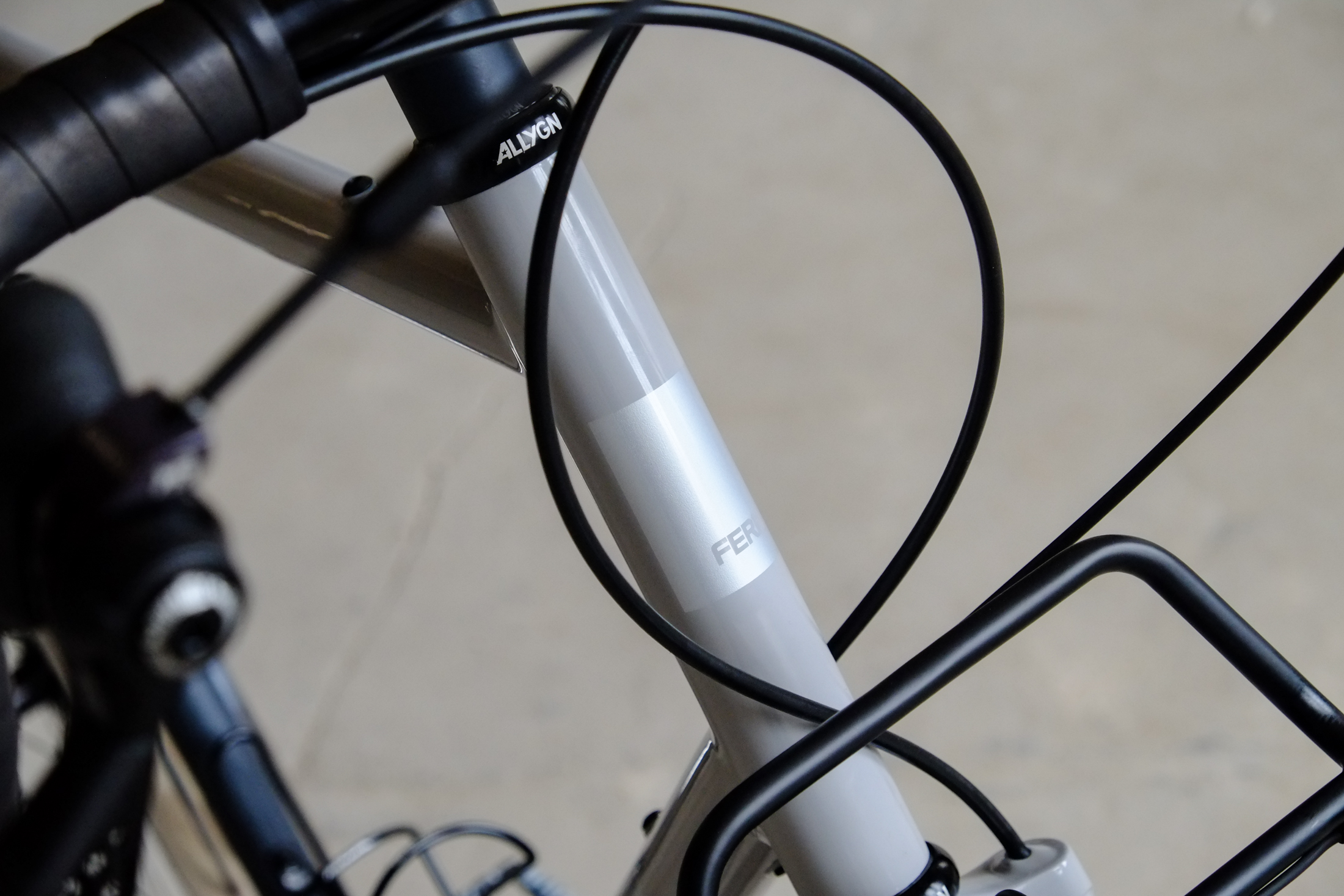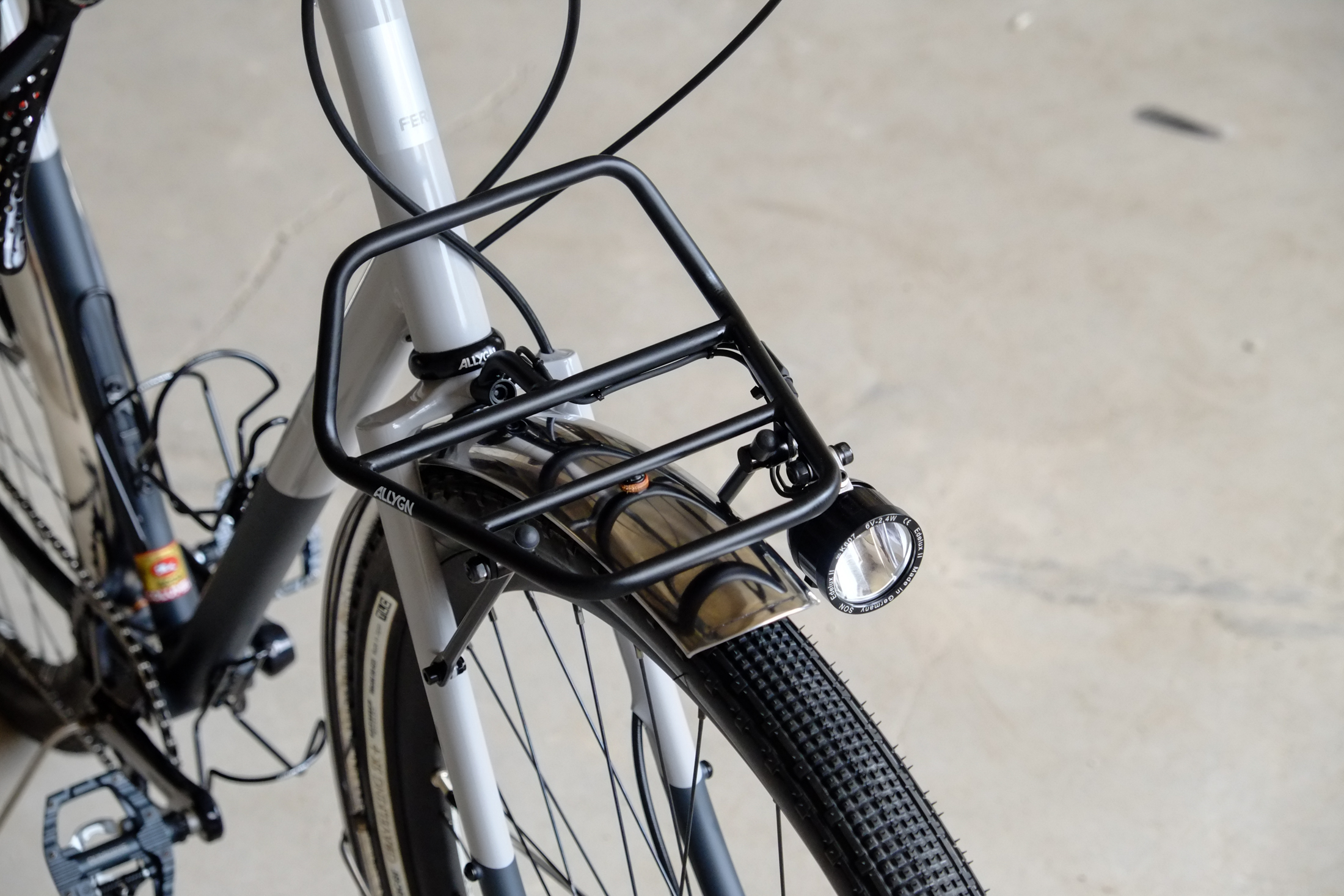 We created a very special bike for Sascha blending modern components such as direct mount flatmount TRP Hylex Disc brakes and 1x Gevenalle drivetrain with the classic silhouette of a fully equipped randonner bike. Wonderful parts made by our friends at Gilles Berthoud are clearly the icing on the cake! To make a really super versatile bike we build in enough clearance for super wide 700cx50mm tires so you can ride this monster really everywhere!