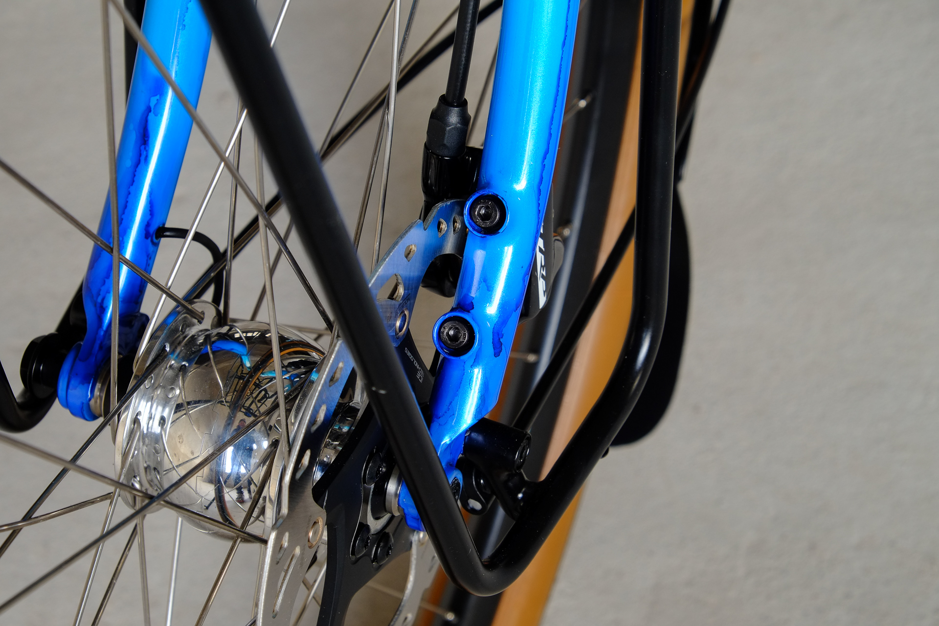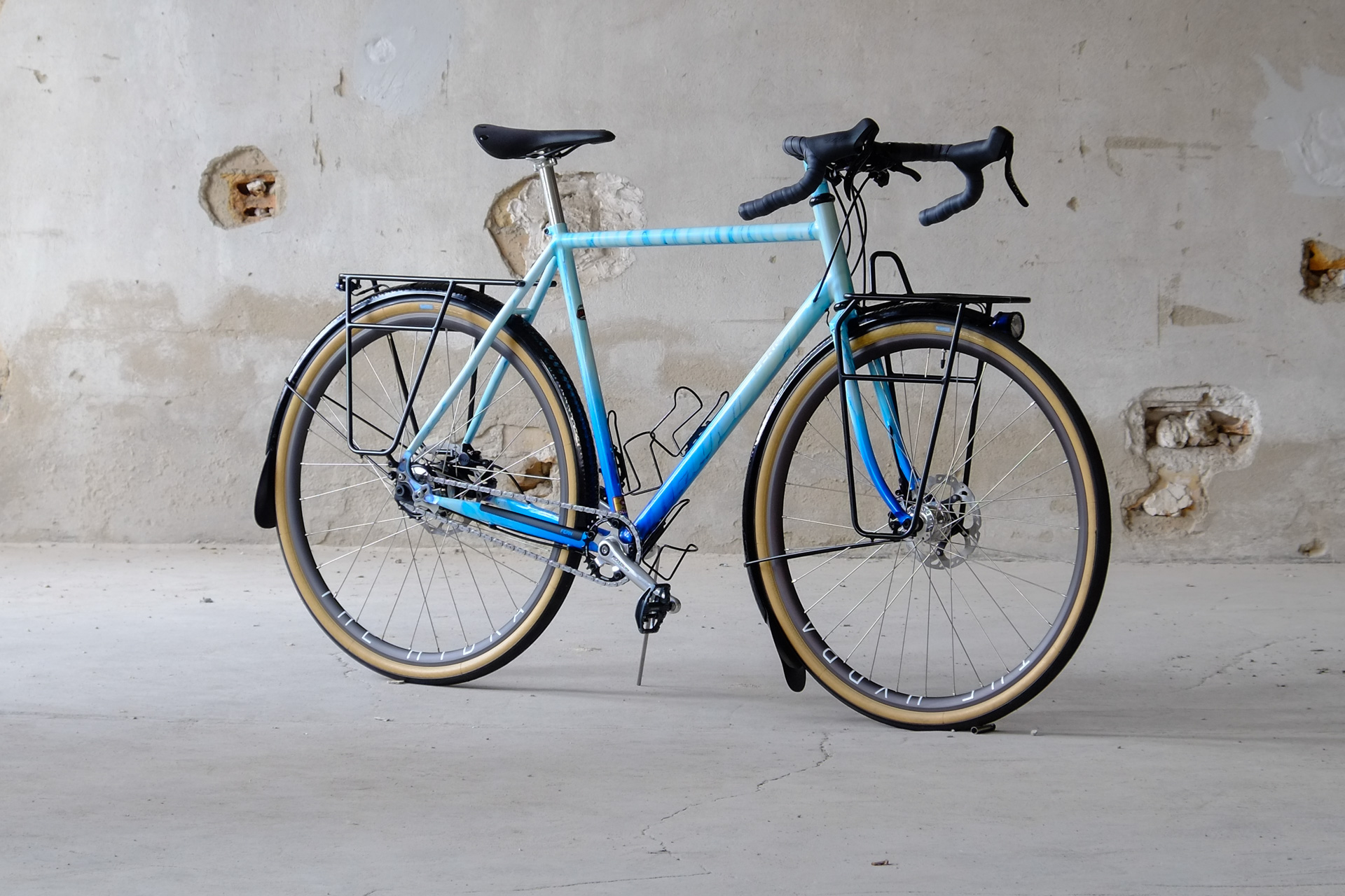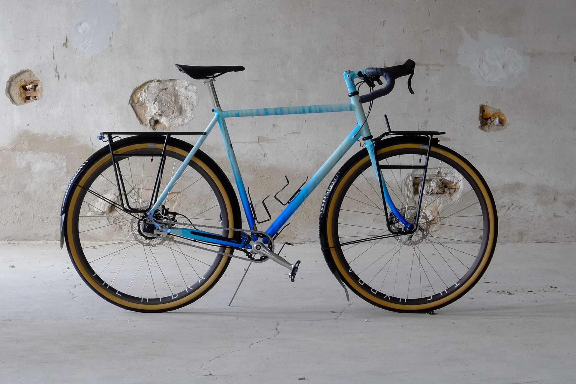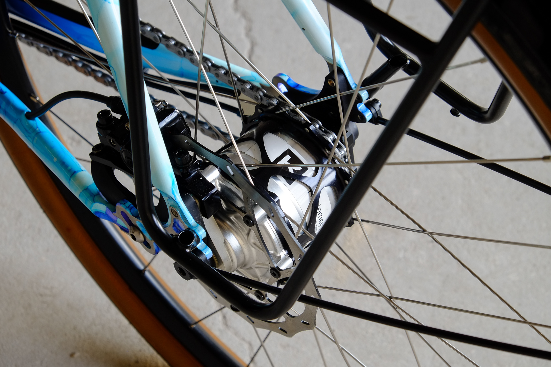 This amazing bike we created for Lilli who already owns the Traveleur showbike which we built in 2018. This new bike is a multi purpose Randonneur / Touring Bicycle which can be set up with two different size wheel sets, making it even more versatile. One is rolling on 700c x 35mm Bon Jon Pass Rene Herse tires mounted on H PLUS Son rims and the other one on 650B x 48mm Switchback Hill tires and DT Swiss XR-331 rims. Due to the amazing swap shell hub concept of the Kindernay 14 speed internally geared rear hub you can easily switch the wheelsets with just one rear hub for both wheelsets. Customized hydraulic shifters for smooth shifting action. TRP Hylex hydraulic disc brakes paired with GRX sublevers for save braking in very position.