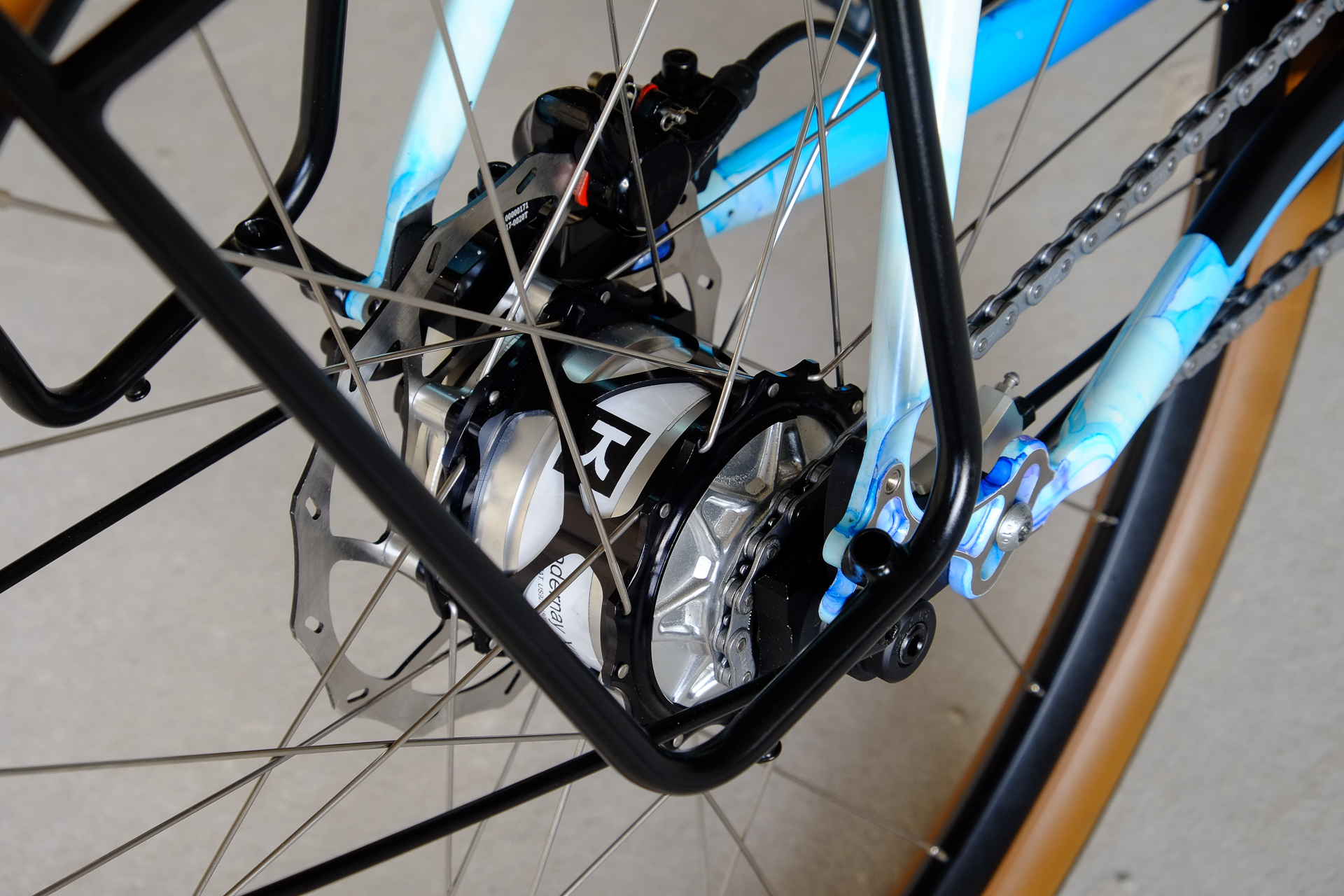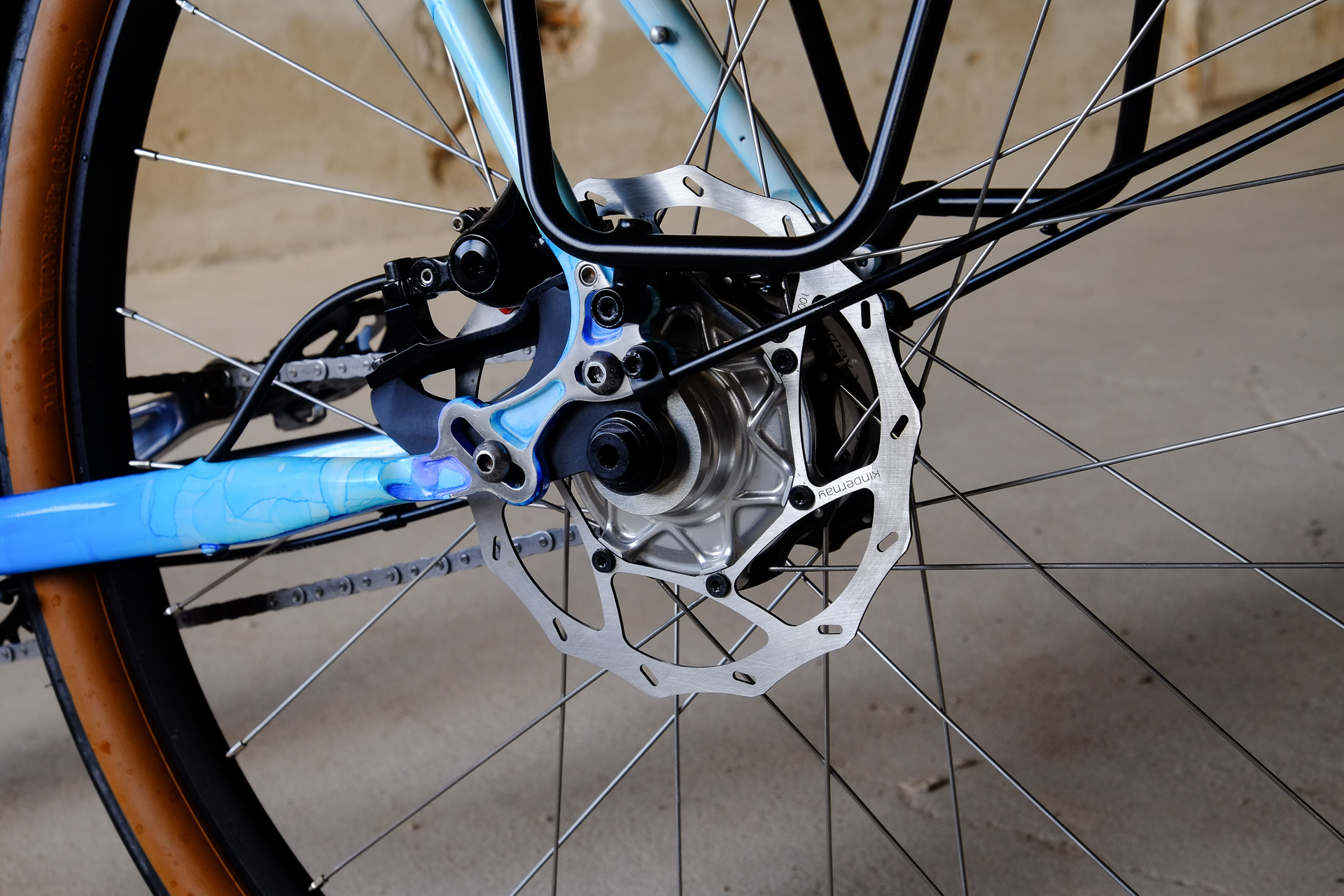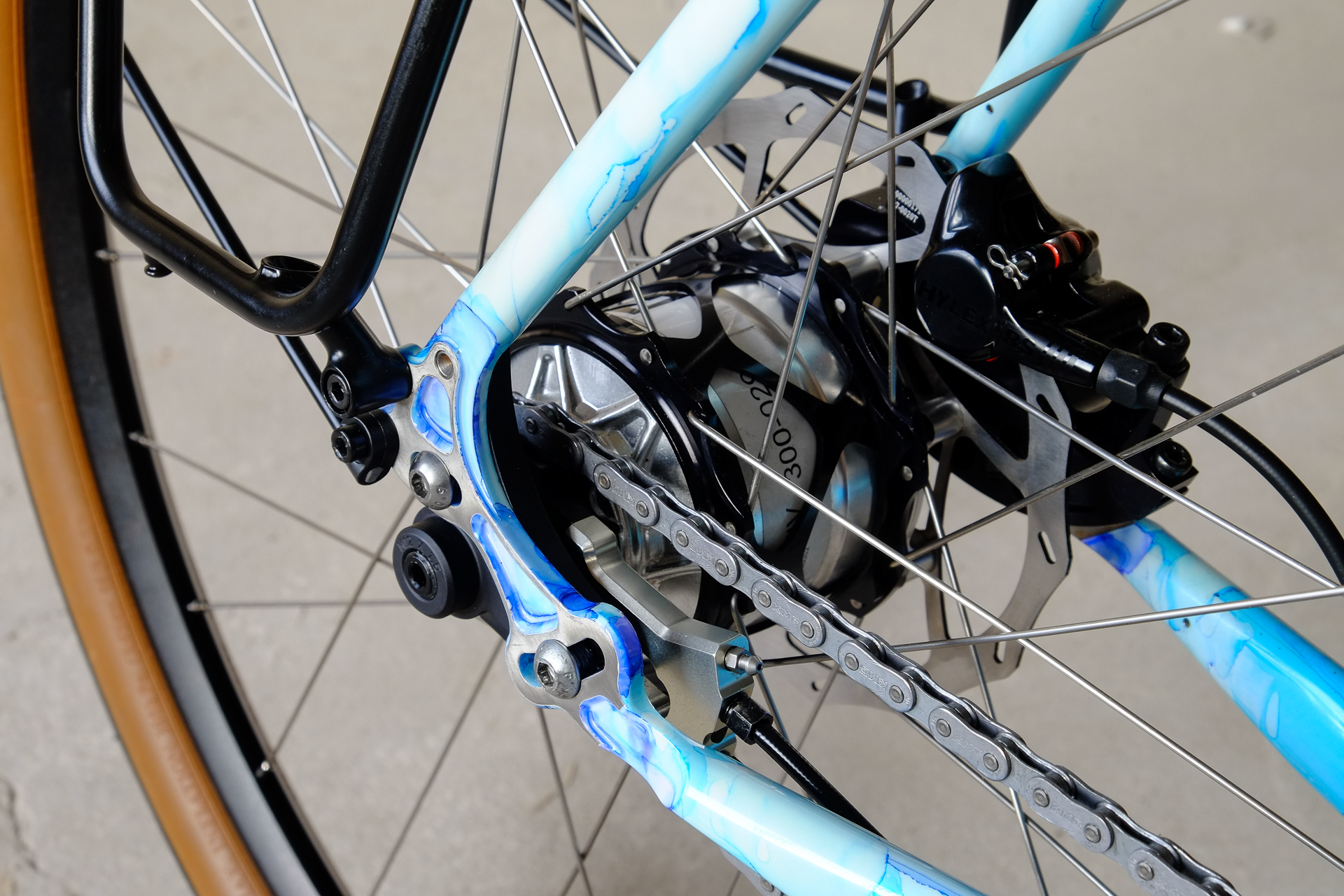 This amazing bike we created for Lilli who already owns the Traveleur showbike which we built in 2018. This new bike is a multi purpose Randonneur / Touring Bicycle which can be set up with two different size wheel sets, making it even more versatile. One is rolling on 700c x 35mm Bon Jon Pass Rene Herse tires mounted on H PLUS Son rims and the other one on 650B x 48mm Switchback Hill tires and DT Swiss XR-331 rims. Due to the amazing swap shell hub concept of the Kindernay 14 speed internally geared rear hub you can easily switch the wheelsets with just one rear hub for both wheelsets. Customized hydraulic shifters for smooth shifting action. TRP Hylex hydraulic disc brakes paired with GRX sublevers for save braking in very position.