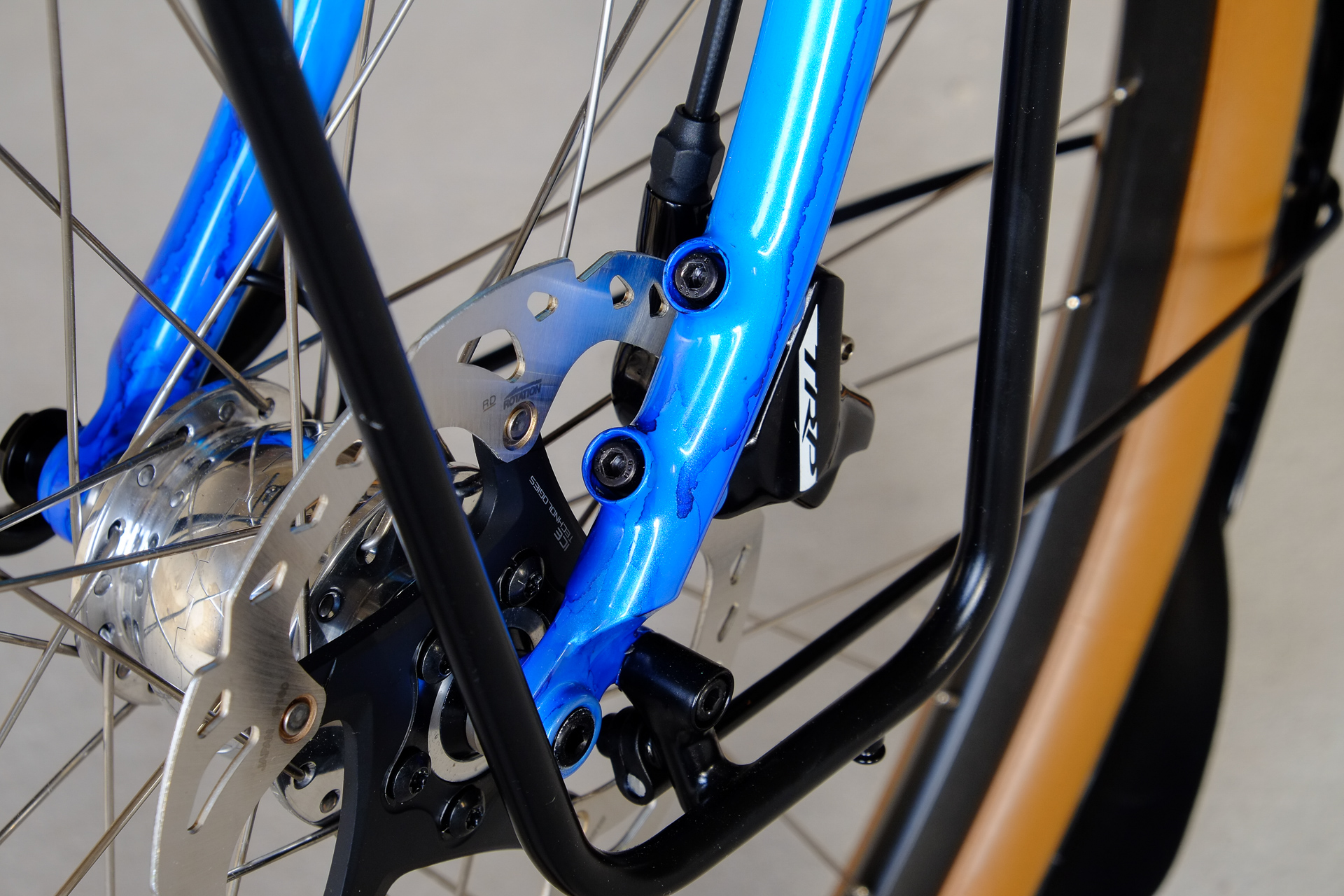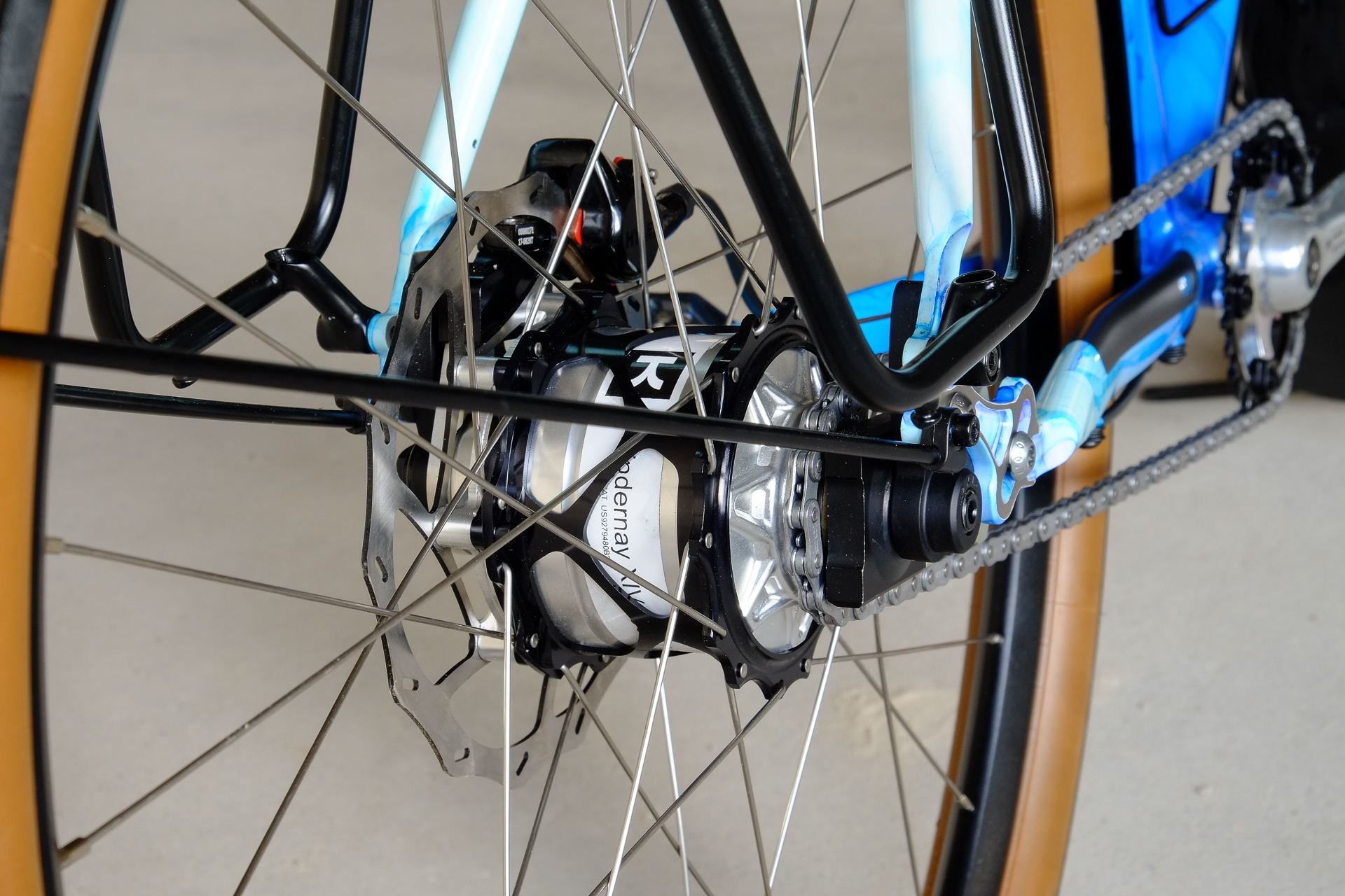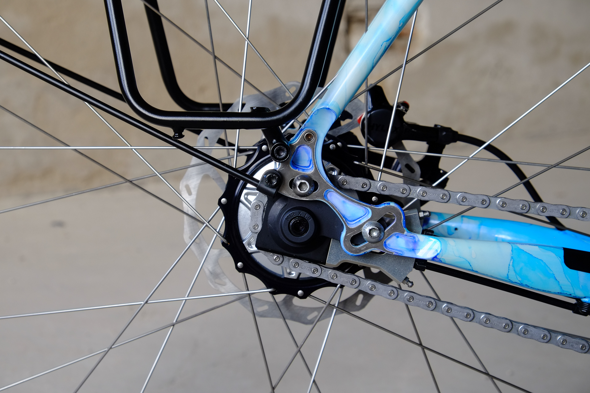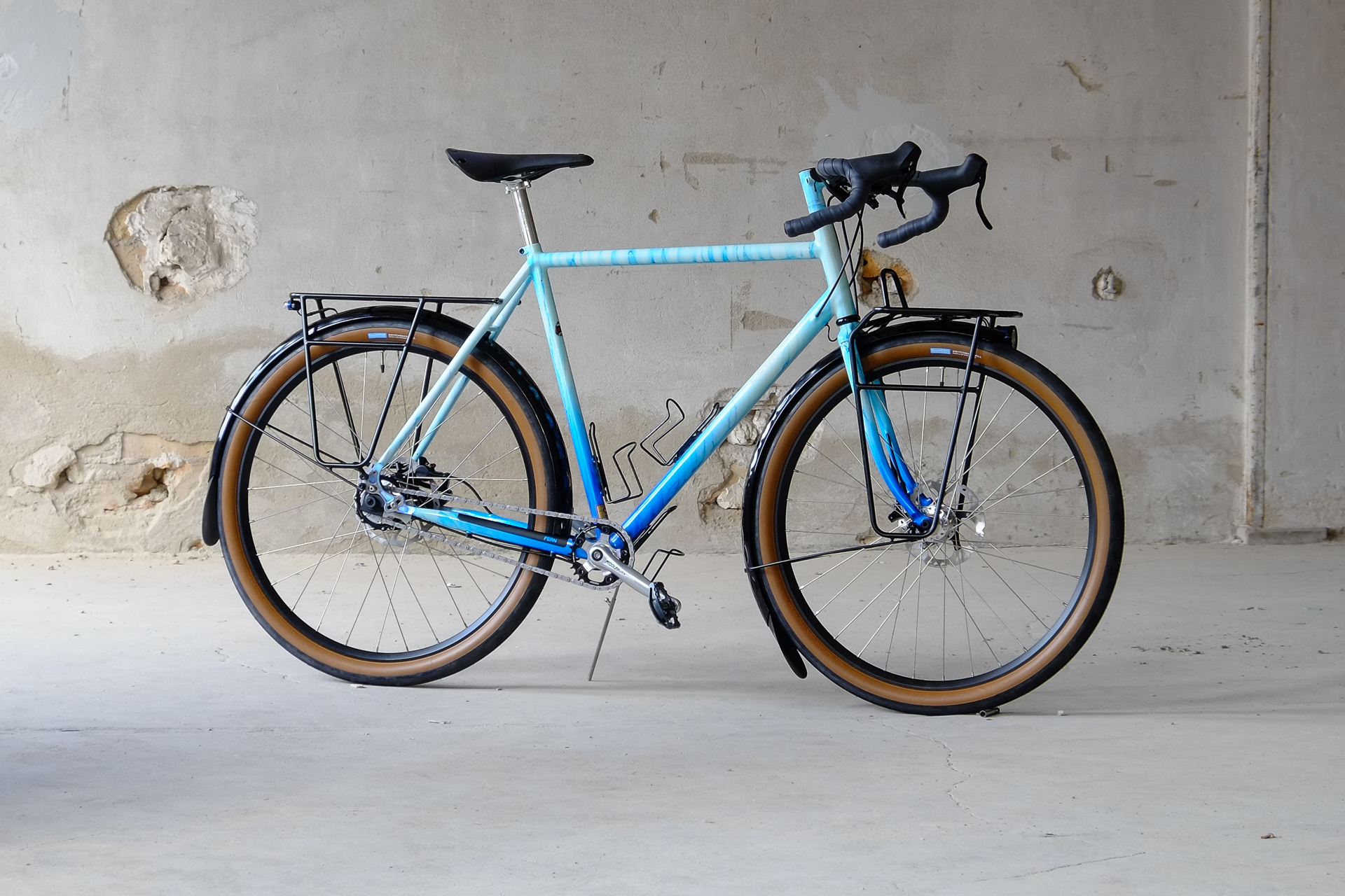 This amazing bike we created for Lilli who already owns the Traveleur showbike which we built in 2018. This new bike is a multi purpose Randonneur / Touring Bicycle which can be set up with two different size wheel sets, making it even more versatile. One is rolling on 700c x 35mm Bon Jon Pass Rene Herse tires mounted on H PLUS Son rims and the other one on 650B x 48mm Switchback Hill tires and DT Swiss XR-331 rims. Due to the amazing swap shell hub concept of the Kindernay 14 speed internally geared rear hub you can easily switch the wheelsets with just one rear hub for both wheelsets. Customized hydraulic shifters for smooth shifting action. TRP Hylex hydraulic disc brakes paired with GRX sublevers for save braking in very position.