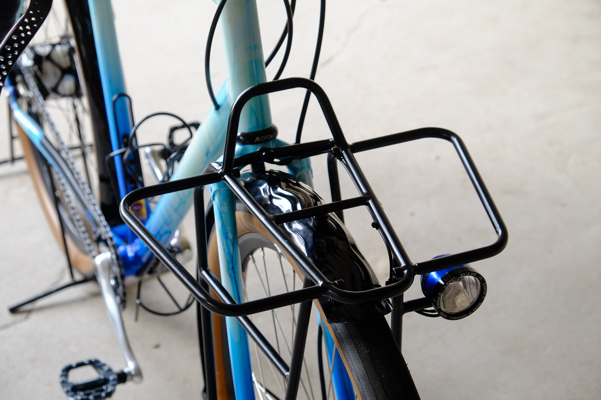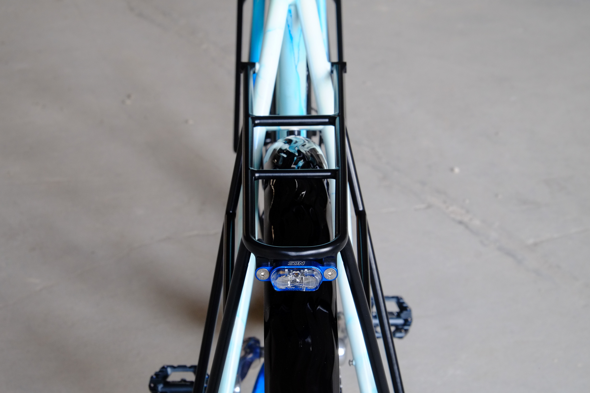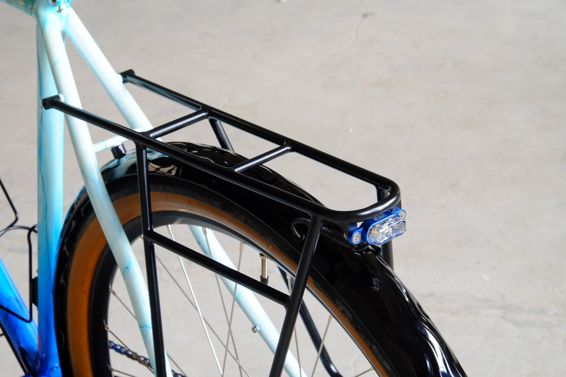 The bike is fully illuminated and electrified by SON (Schmidts Original Nabendynamo) components. Dry feet provided by Velo Orange with additional help of our friends at Ass Savers. Spinning by Middleburn, sitting on Brooks with Thomson, steering with our own brand's Allygn headset and ESI handlebartape for a sure grip.