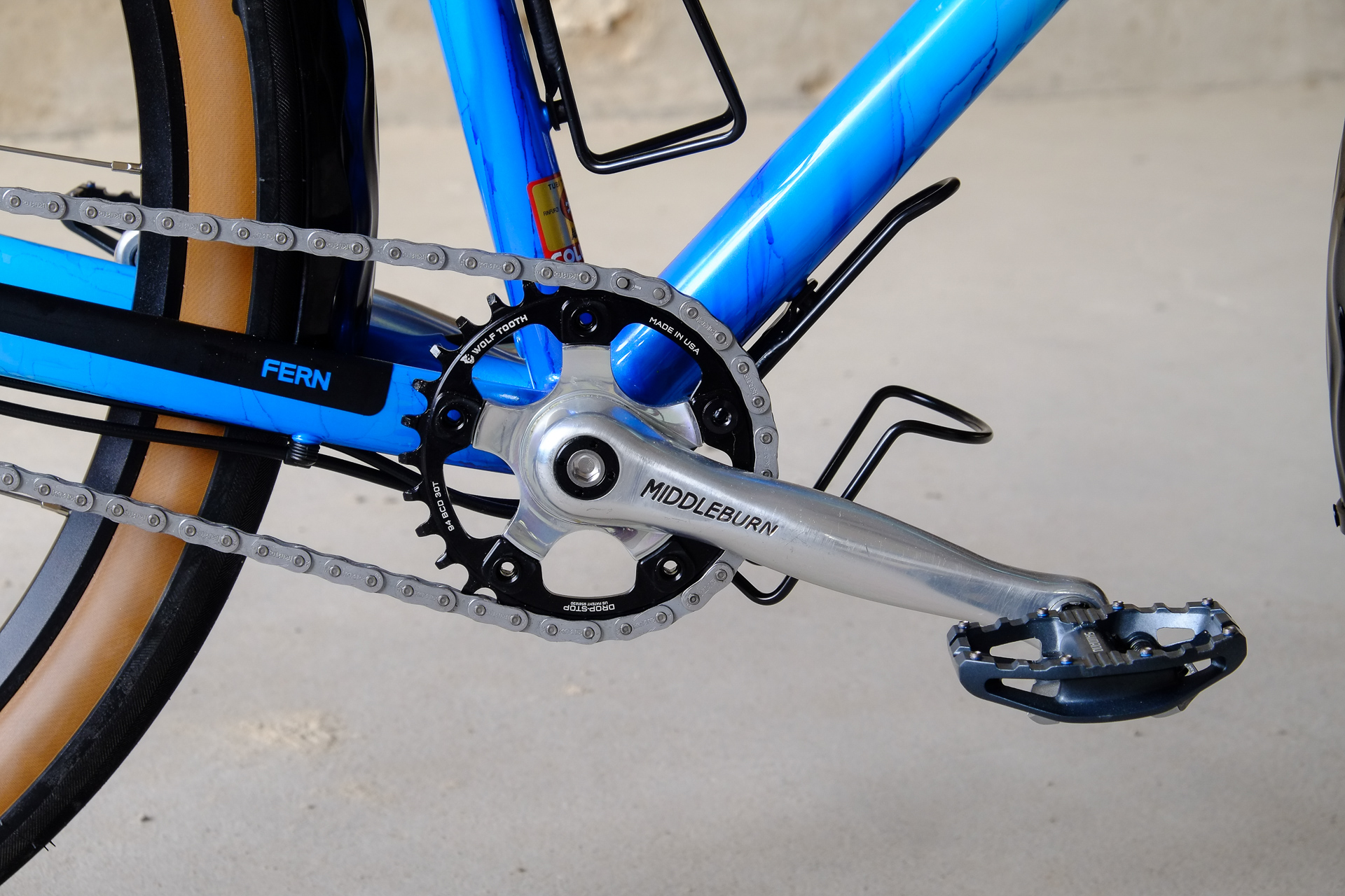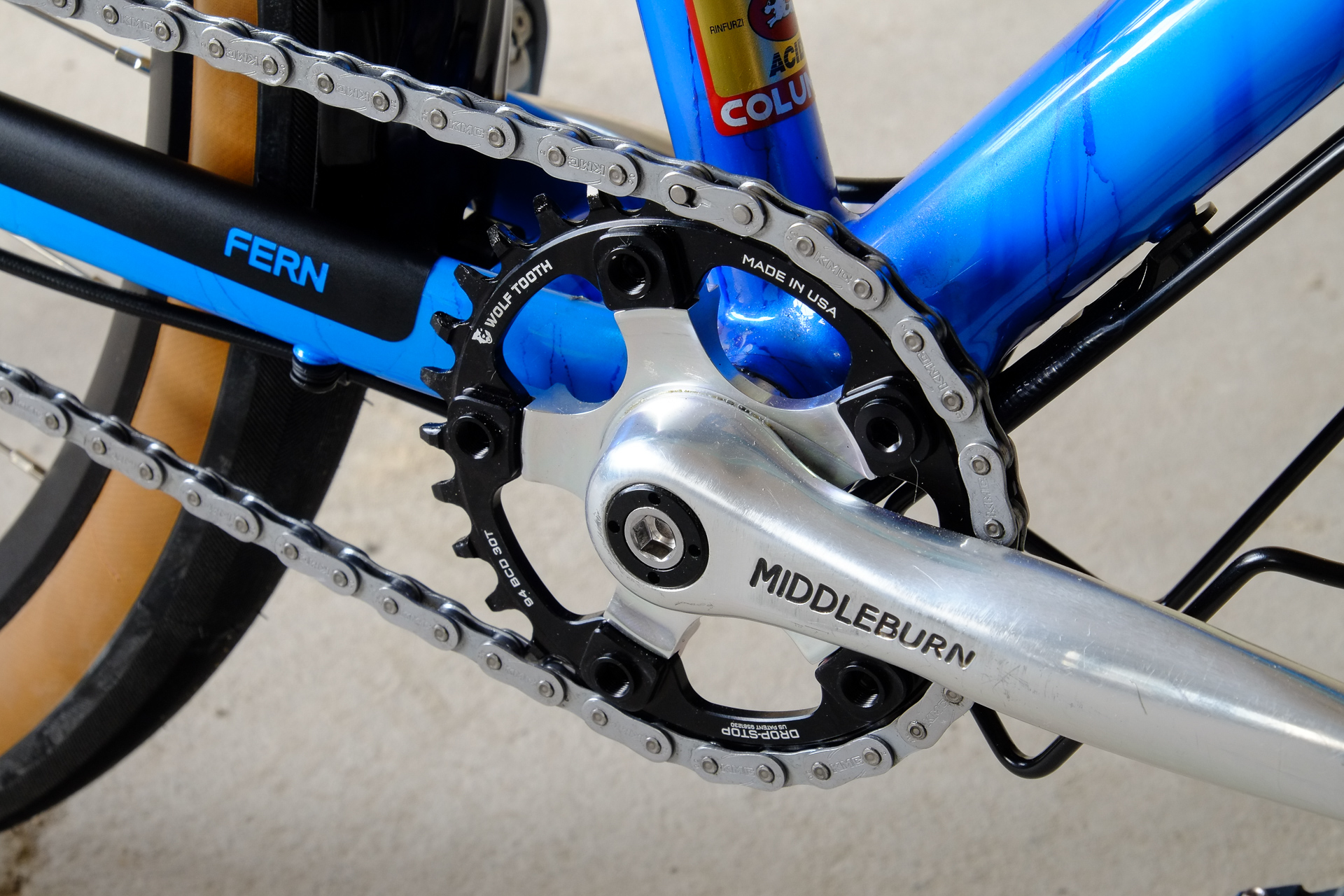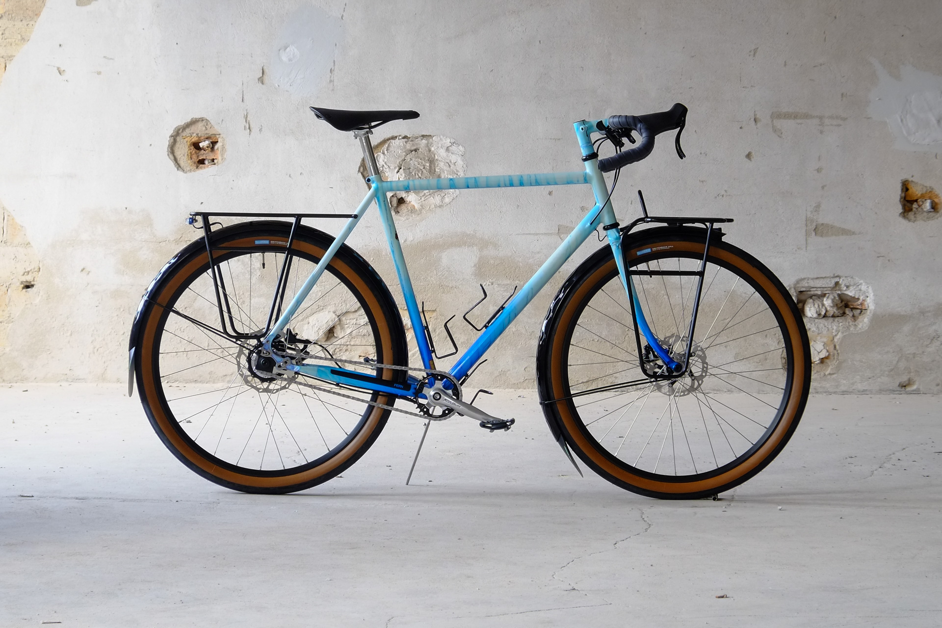 The bikes frame is made as usual only from the finest selection of Columbus tubes, including nice touches as fully internal cable routing and and very nice Paragon Rocker Dropouts. The Fork features Fern's own direct flatmount standard. Custom made Fern Deluxe Stem. All racks are custom made by Fern and only available for complete Fern Bicycles.