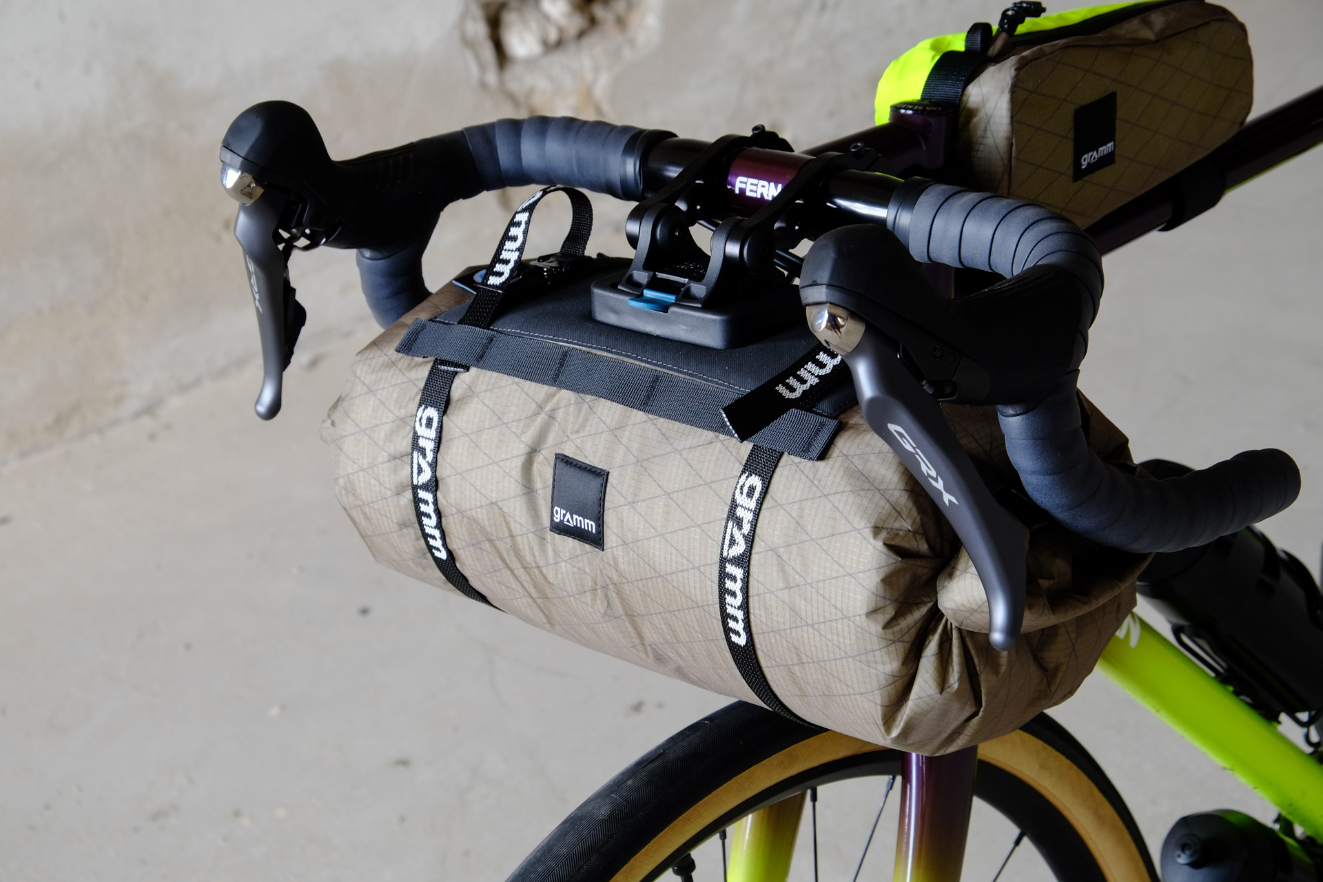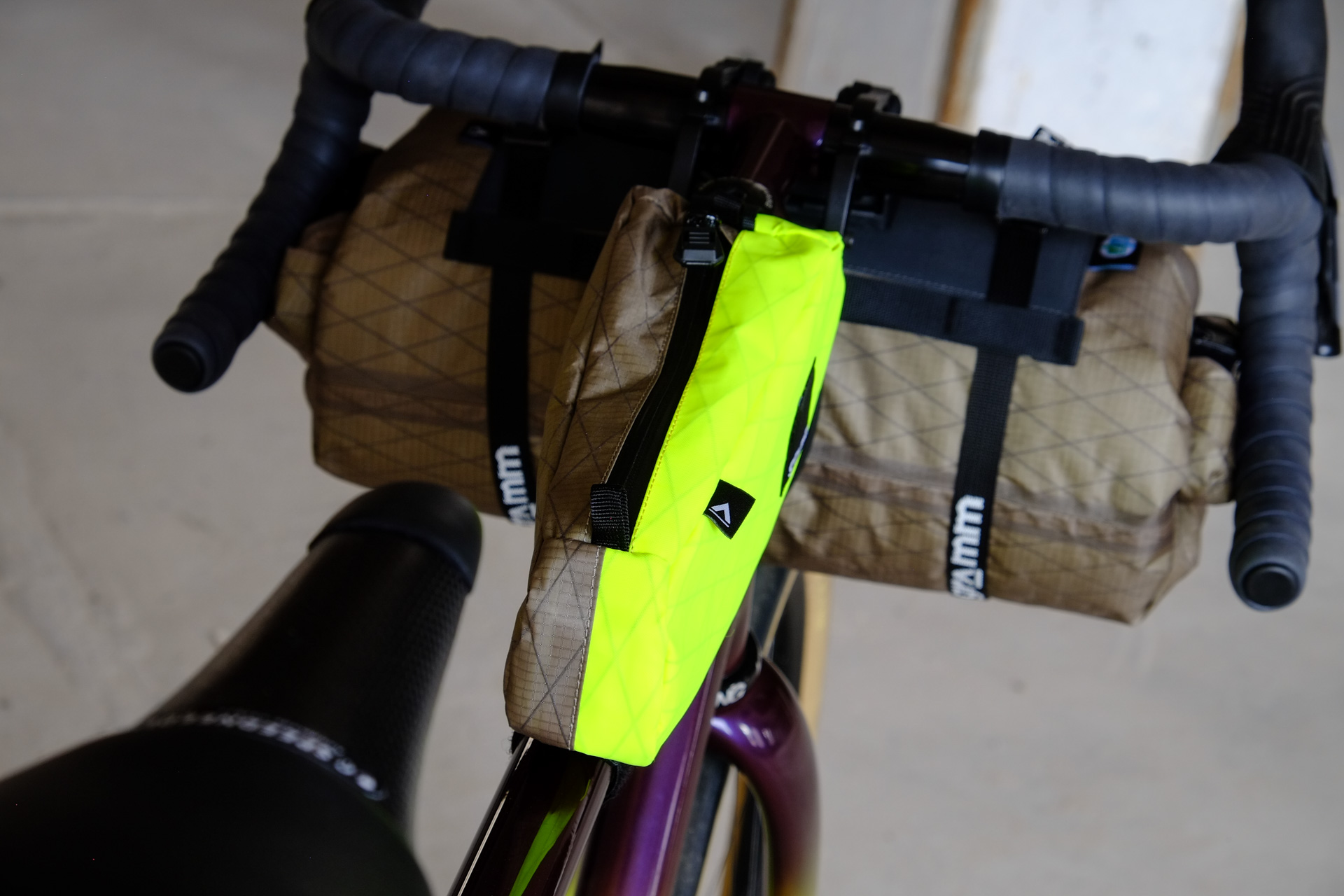 The bags Kristin from Gramm Tourpacking created for this bike are just amazing and feature a custom two-face top tube bag, matching seatbag and handlebar roll.