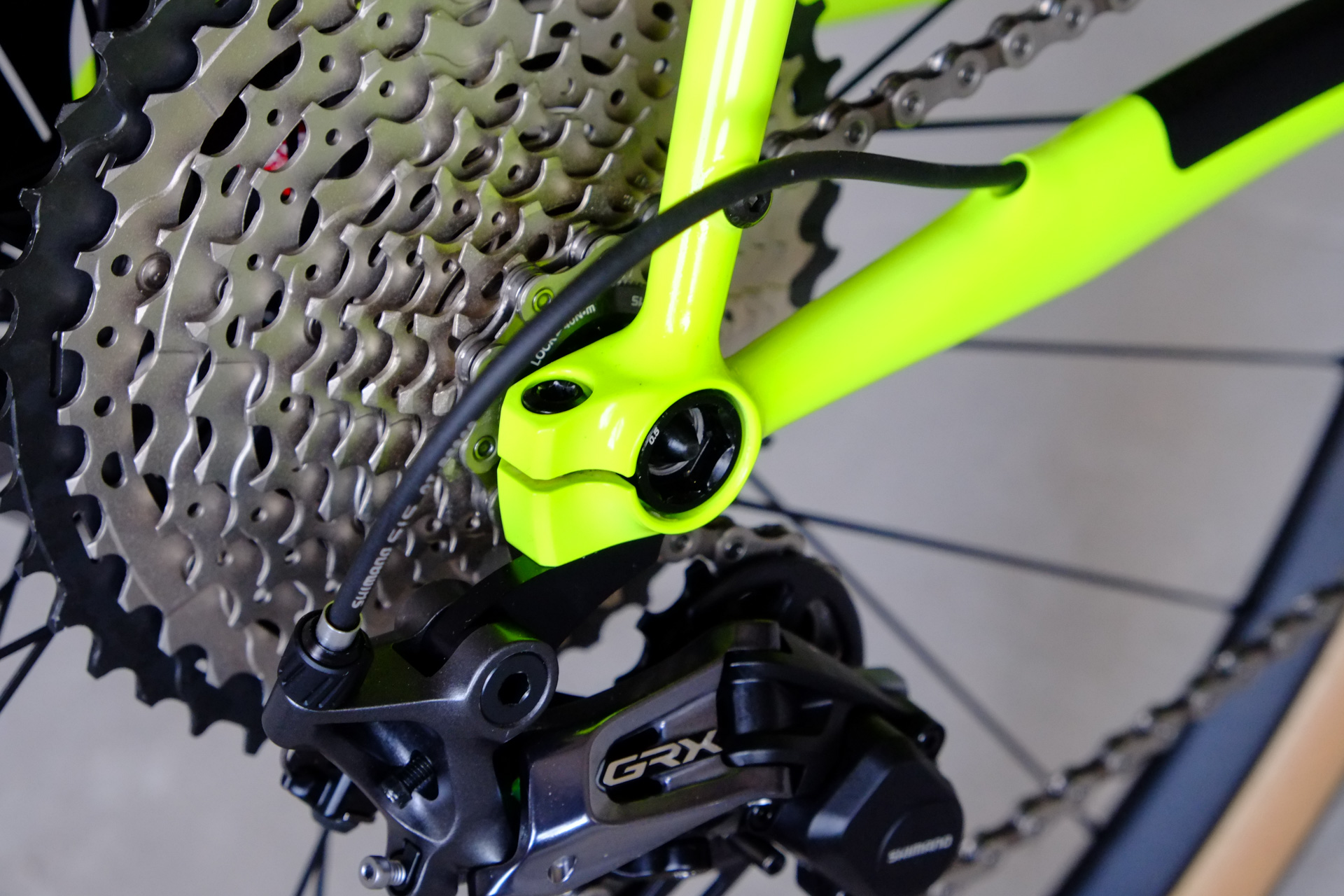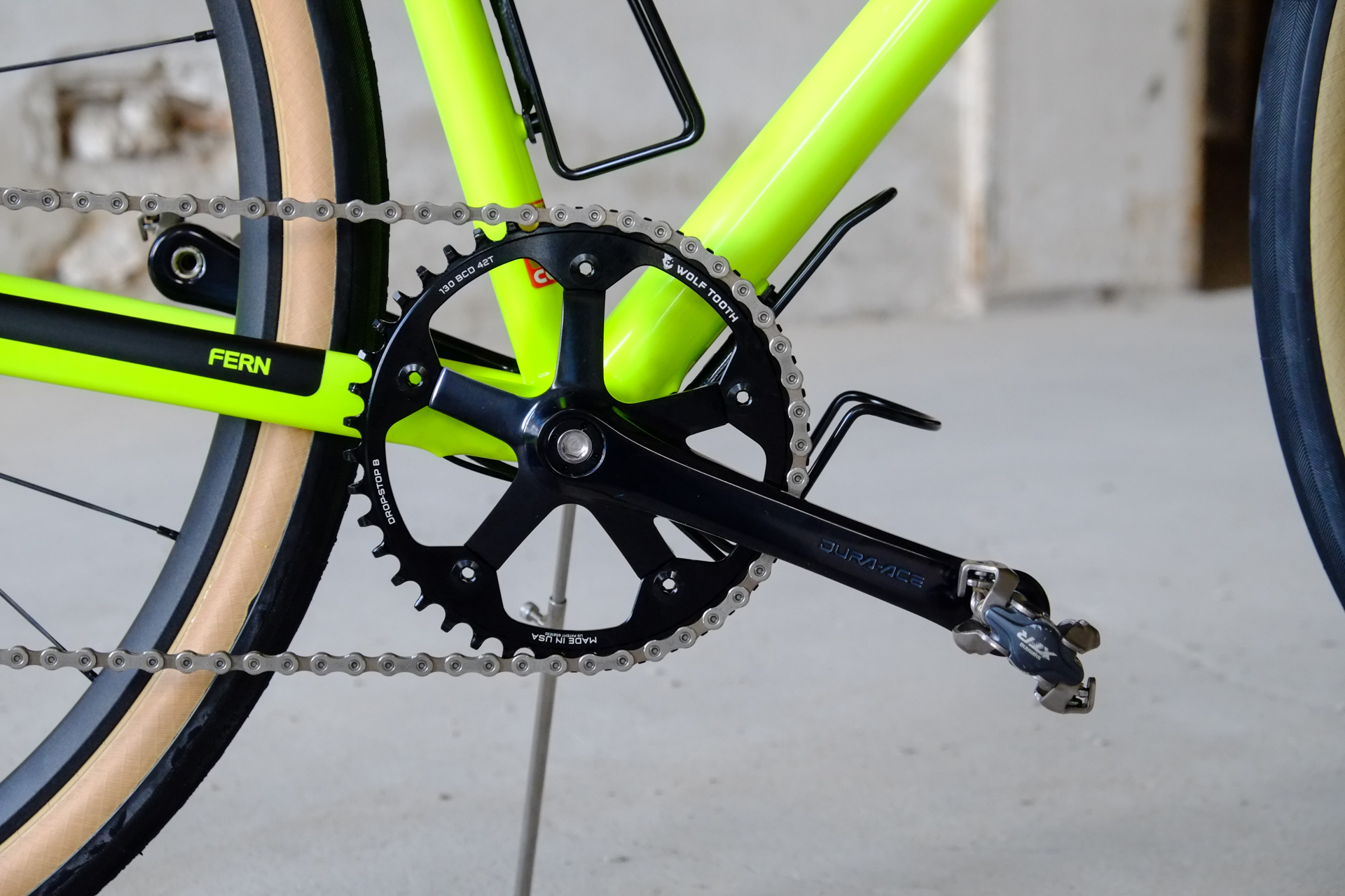 Smooth and super fast rolling on Rene Herse 700cx44mm Snoqalmie tires, Shimano GRX drivetrain is pimped up with our signature vintage Dura Ace crankset and BB, additional super light parts made by Tune bringing down the weight of this beast to 9.3kg!