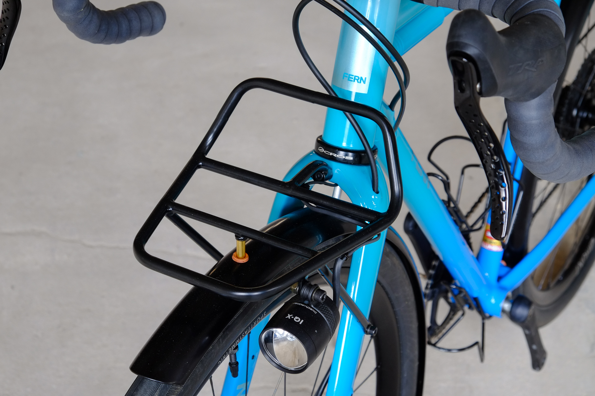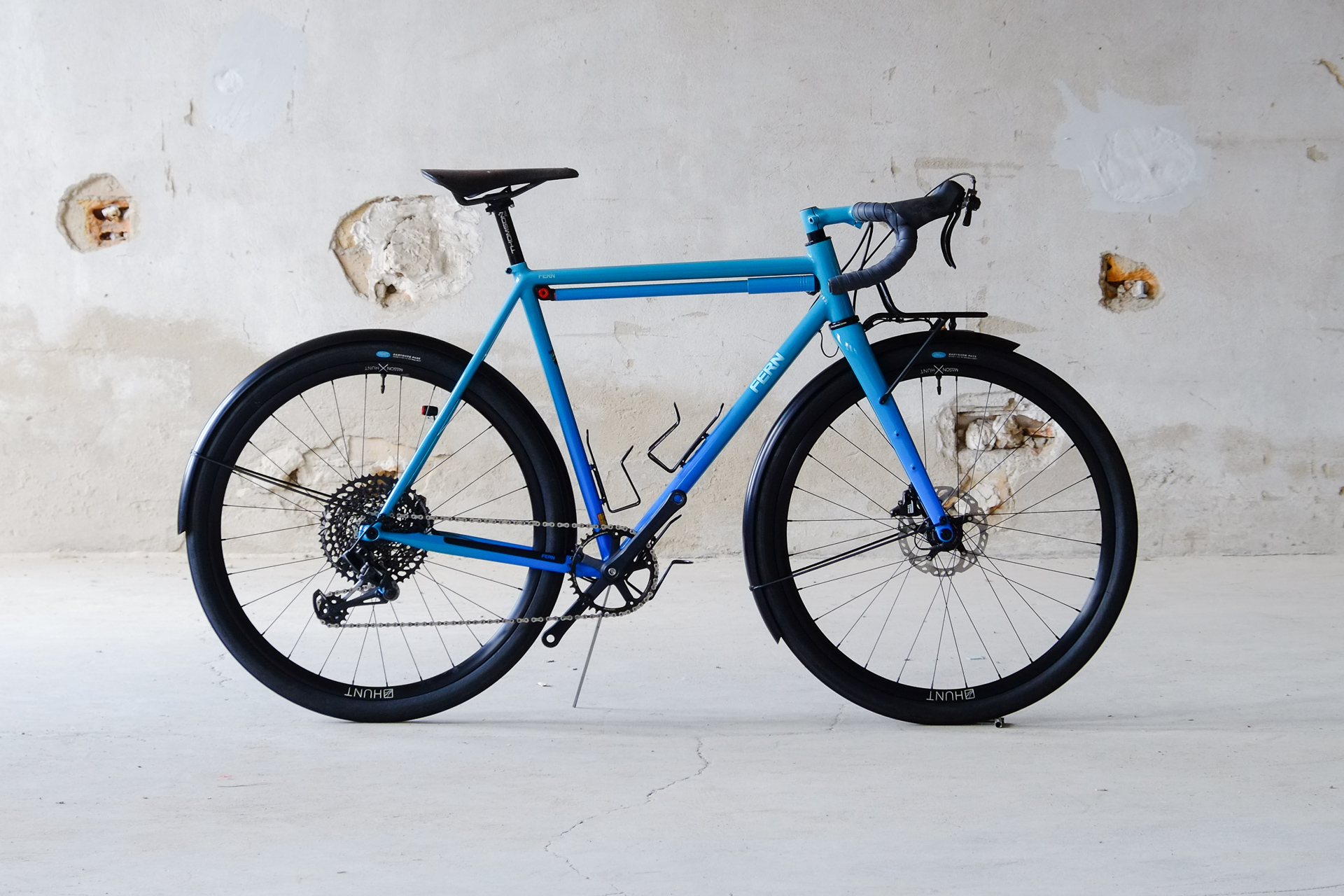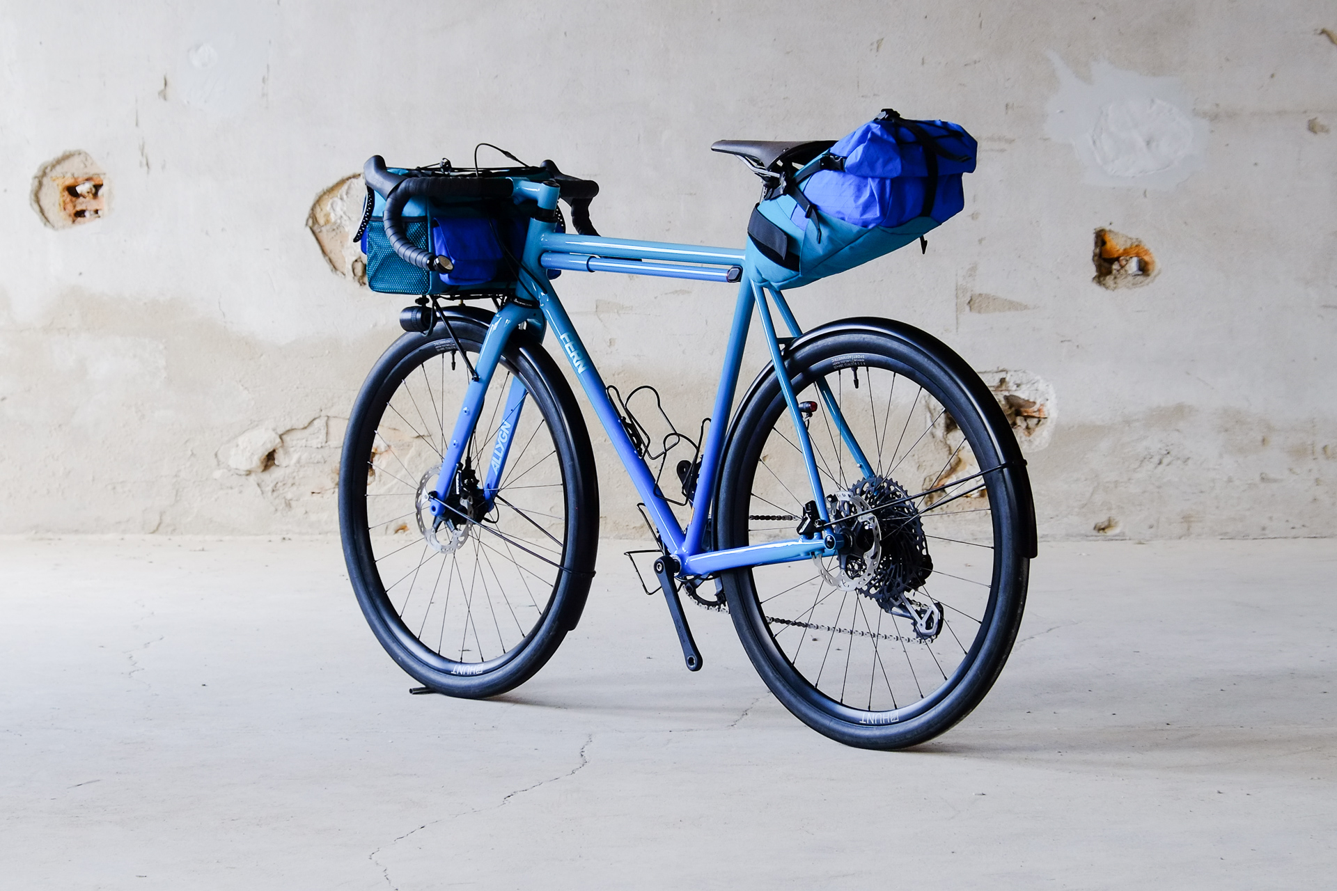 This is Daniel's finalized 650B Disc Chico, which he already successfully raced in a prototype state in the 2019 PBP edition. The bike is equipped with a prototype Allyn Components M.U.D. fork and a Allygn Diamond Front Rack. The fillet brazed frame is made only from the finest Columbus tubing and featuring our new 160mm flat direct mount standard on a Syntace X-12 through axle system. Fully internal cable routing. Hydraulic brake and shift action by Gevenalle, 1x12 Sram Eagle drivetrain spun fast with our trademark super low q-factor vintage Dura Ace crankset . Rolling ultra smooth on Hunt Wheels equipped with Rene Herse Baby Shoe Pass tires, mud protection by Velororange. Power supplied by SON deluxe hub dynamo and safety rear view mirror by our friends at Gilles Berthoud. Awesome Gramm Tourpacking bags, percfectly colour matching Velociao's vibrant paintjob.