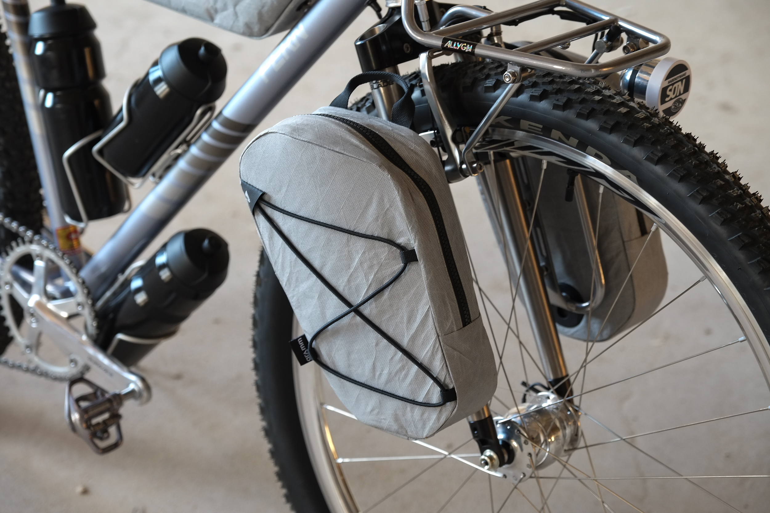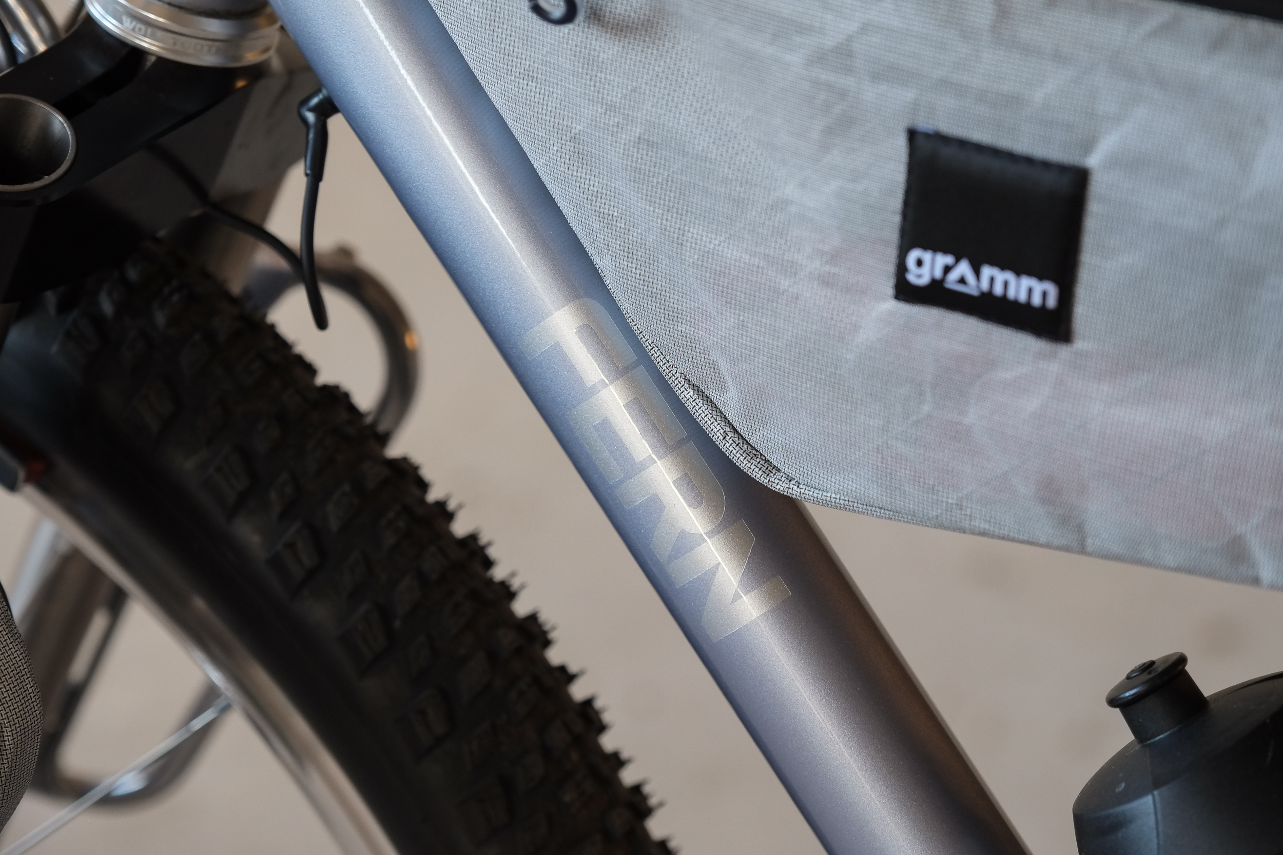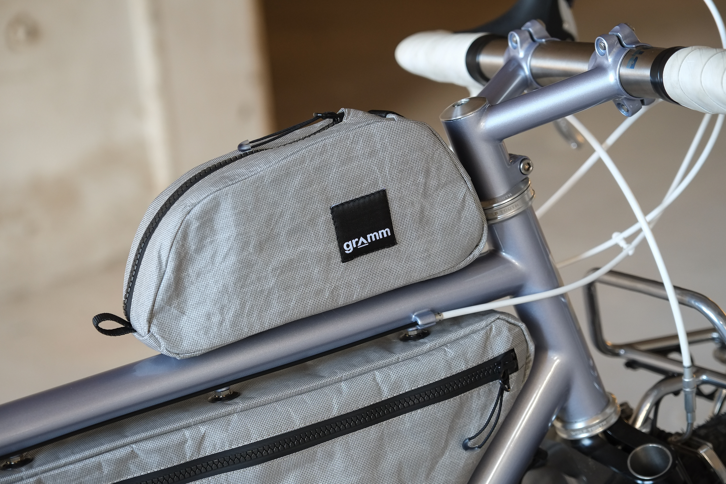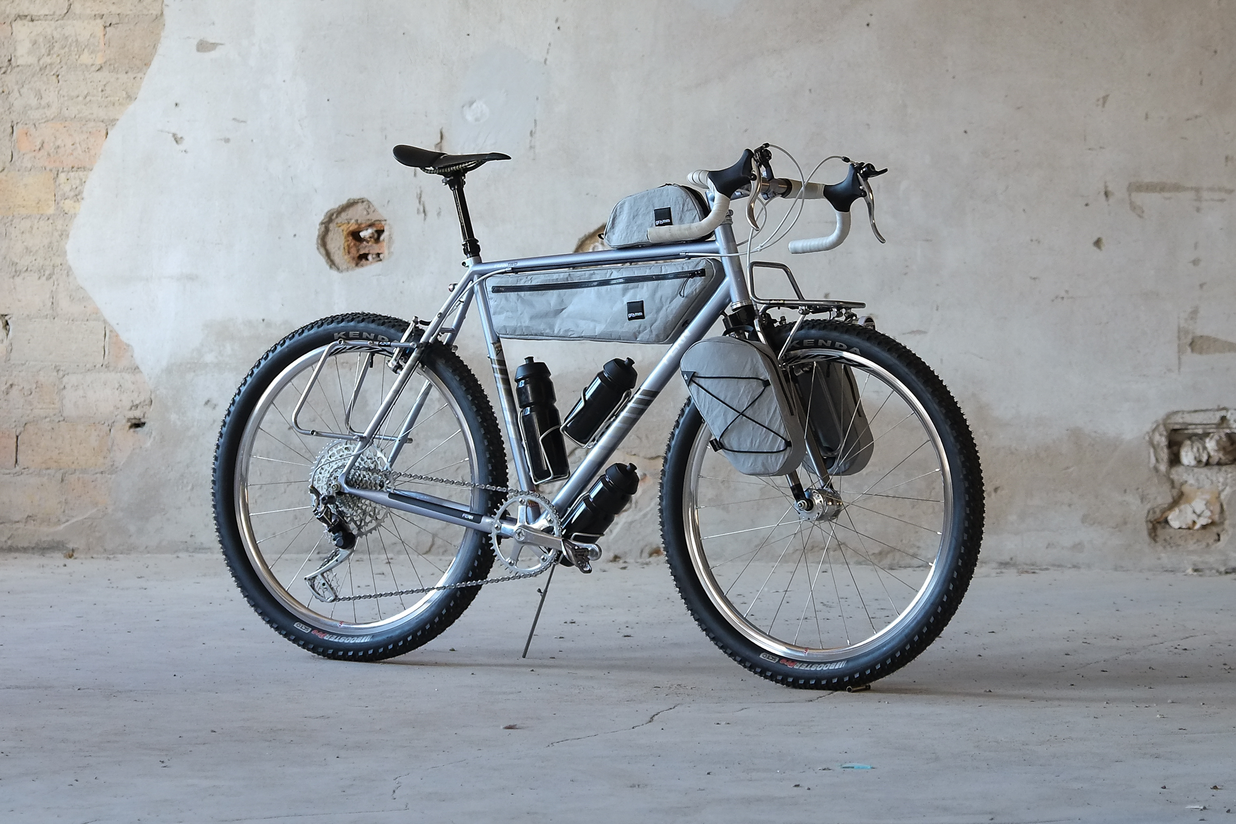 But the absolute icing on the cake of this bike is as usual and for sure the bags which are all created by my partner in all crimes, Tine of Gramm Tourpacking. They were all handmade here in Berlin from the absolute most exclusive Challenge Sailcloth materials and the silver color fabric just perfectly blends into this complete build.
