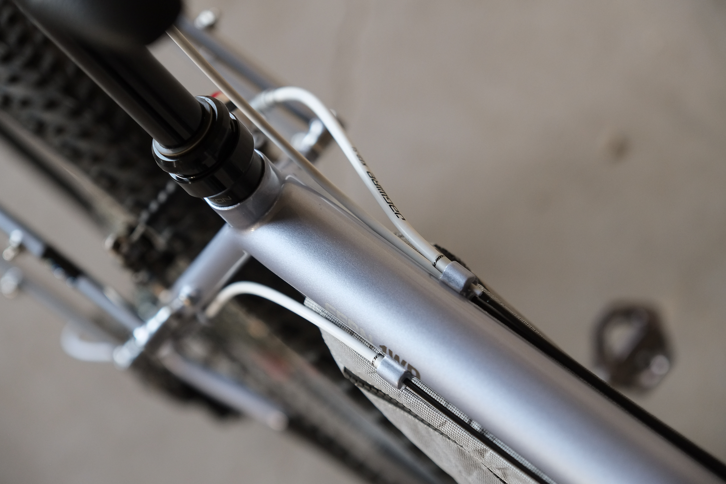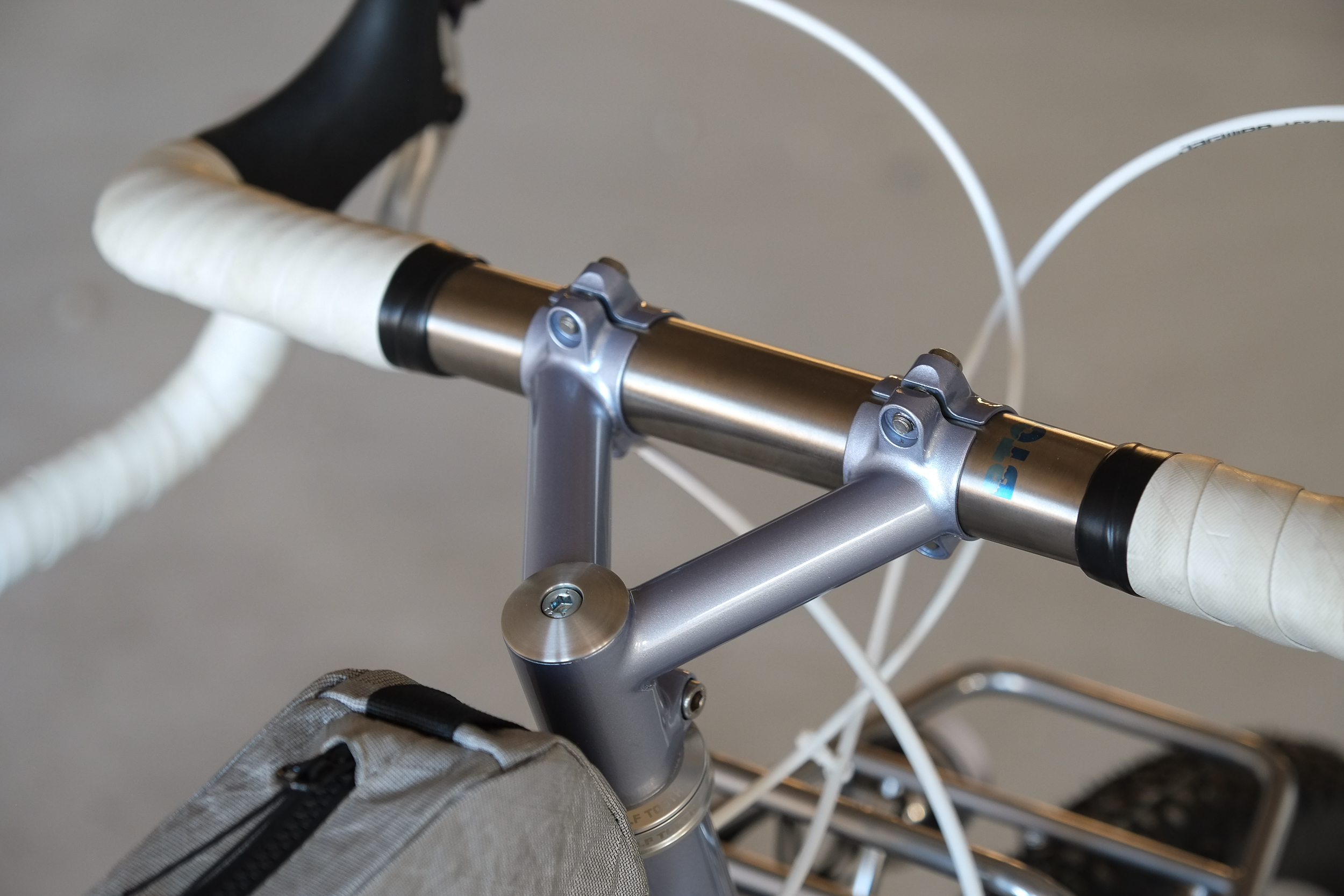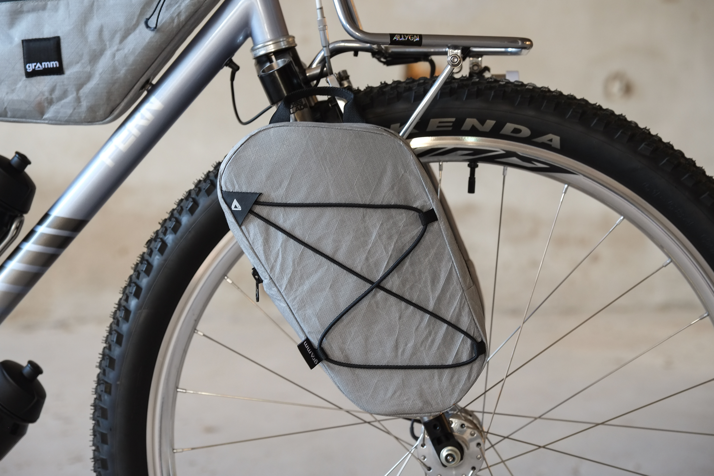 But the absolute icing on the cake of this bike is as usual and for sure the bags which are all created by my partner in all crimes, Tine of Gramm Tourpacking. They were all handmade here in Berlin from the absolute most exclusive Challenge Sailcloth materials and the silver color fabric just perfectly blends into this complete build.