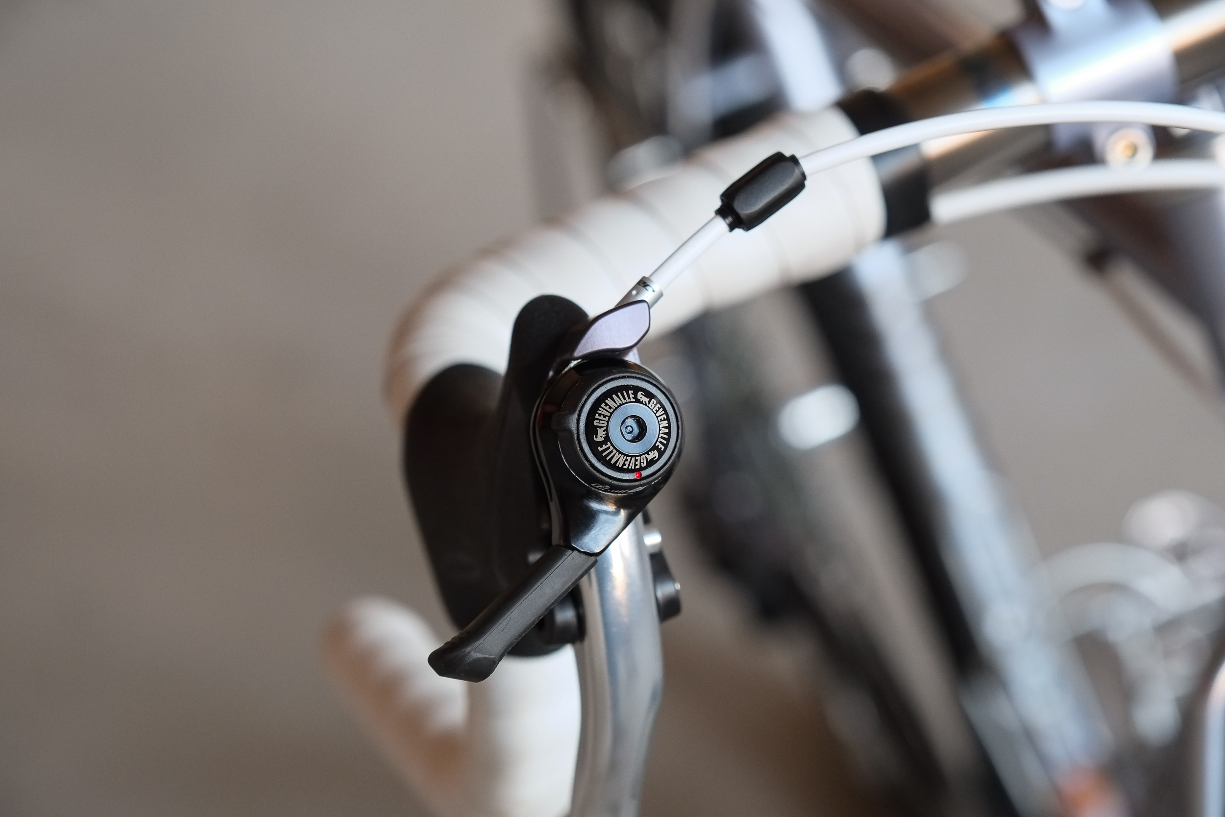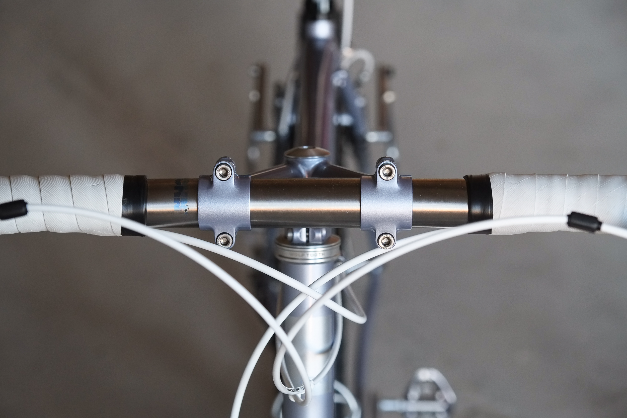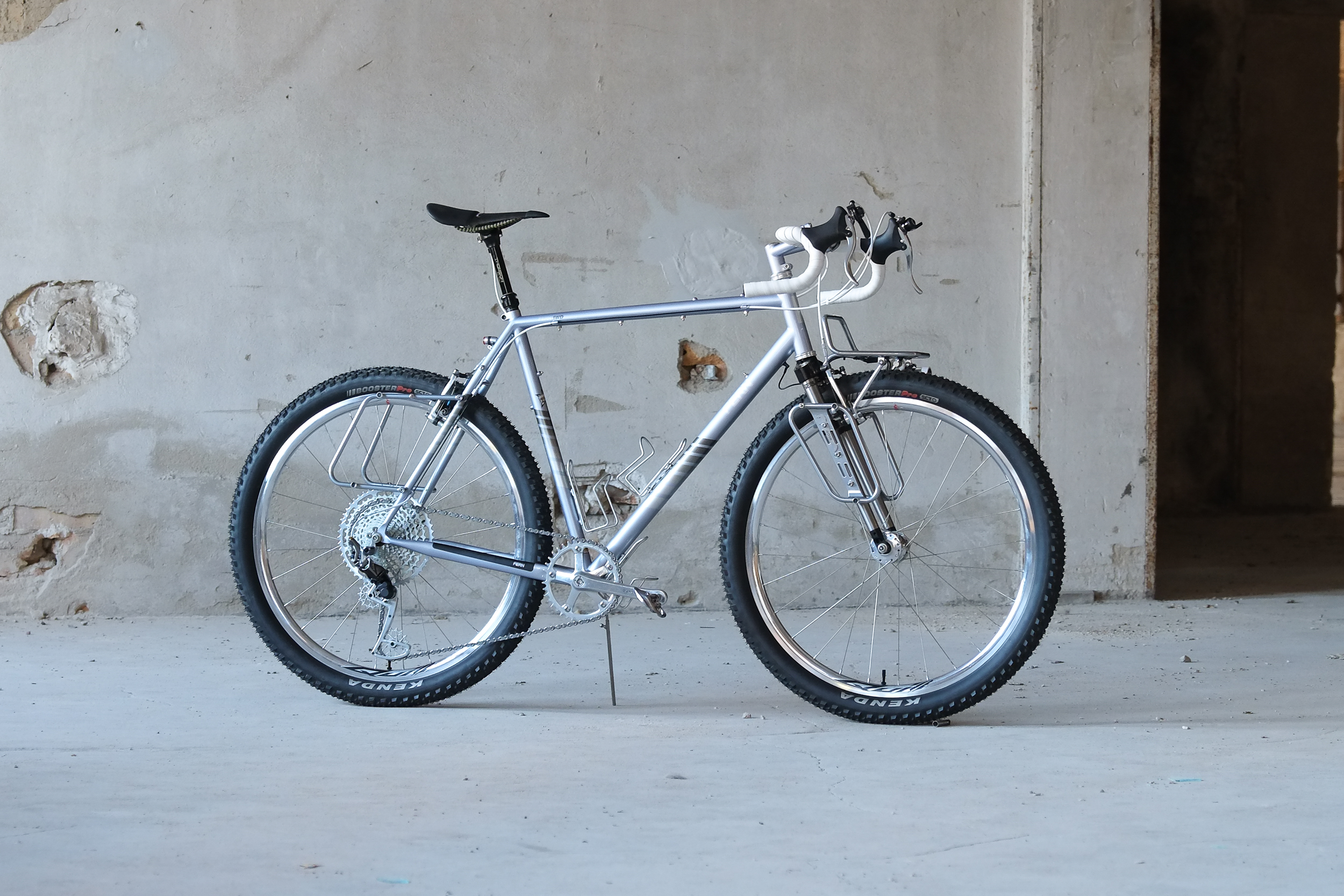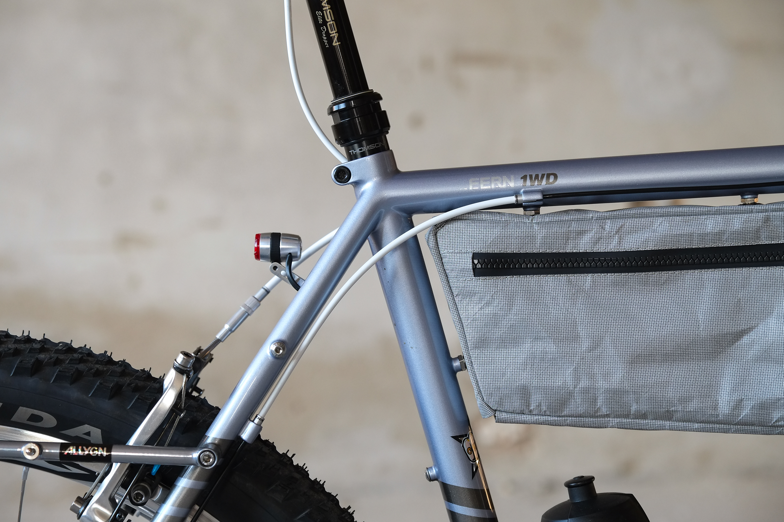 But the absolute icing on the cake of this bike is as usual and for sure the bags which are all created by my partner in all crimes, Tine of Gramm Tourpacking. They were all handmade here in Berlin from the absolute most exclusive Challenge Sailcloth materials and the silver color fabric just perfectly blends into this complete build.