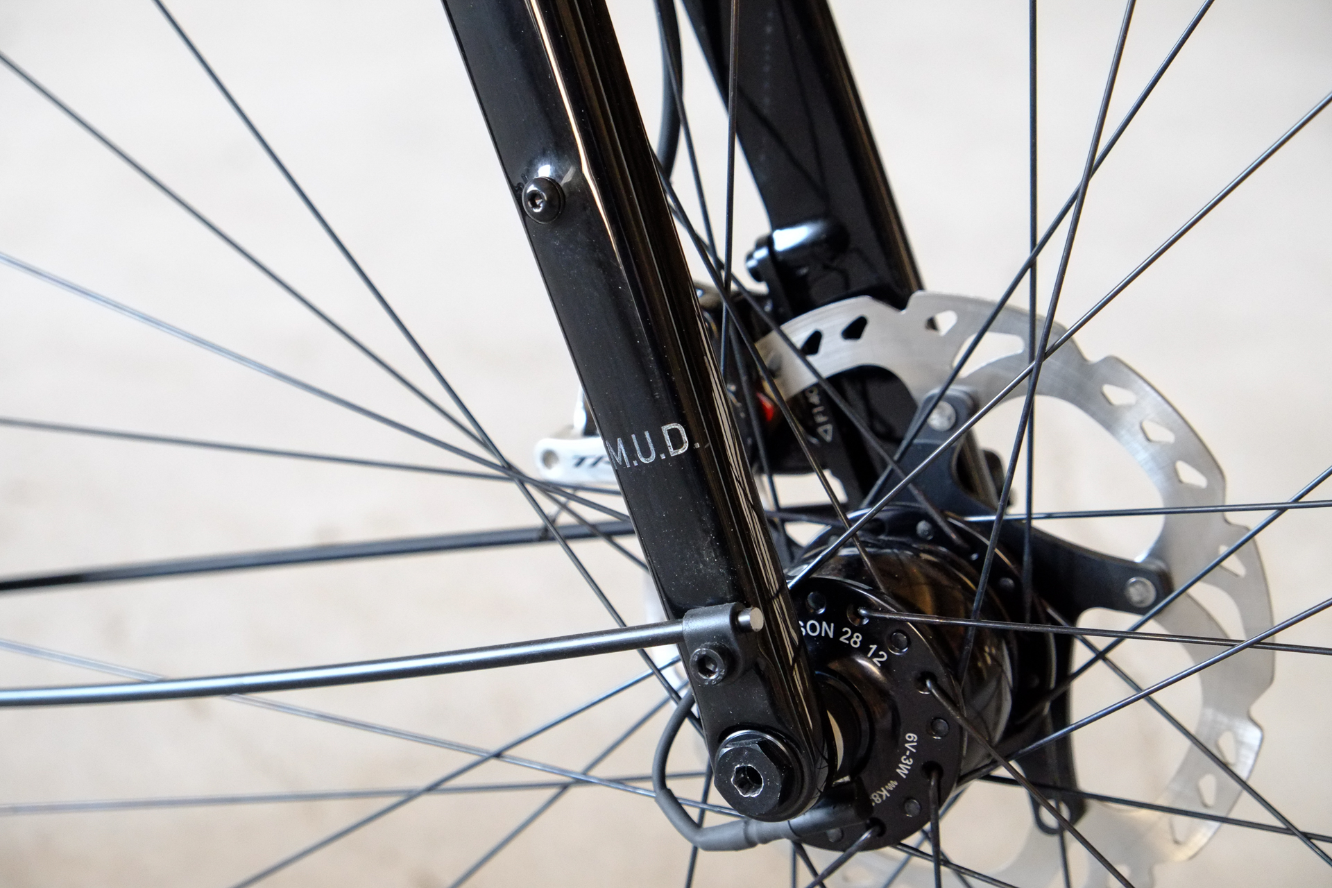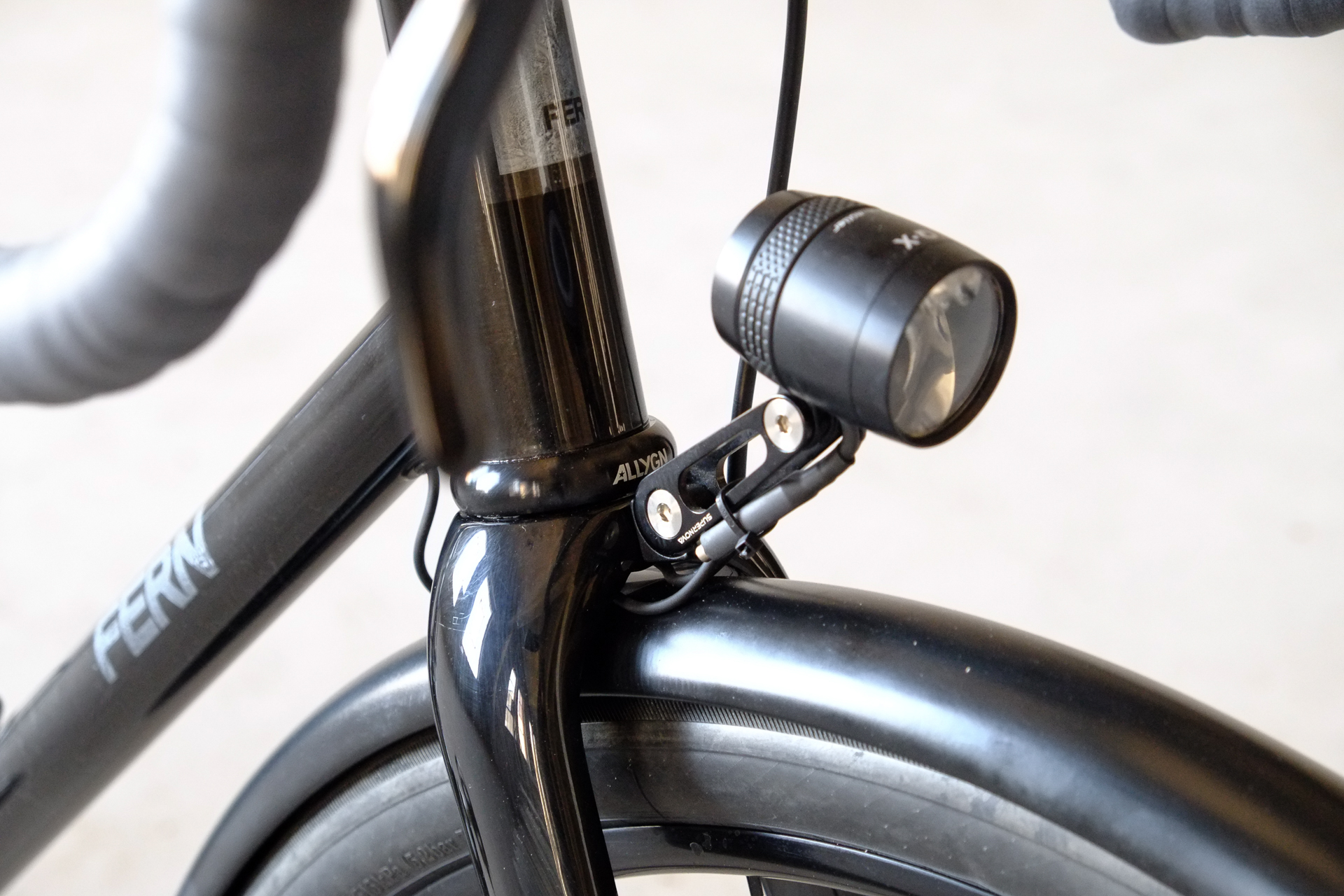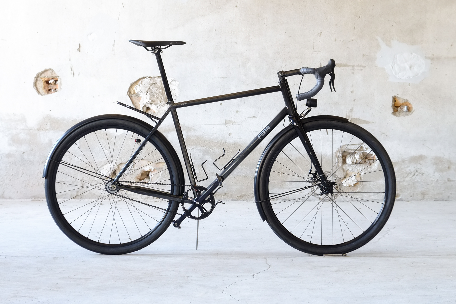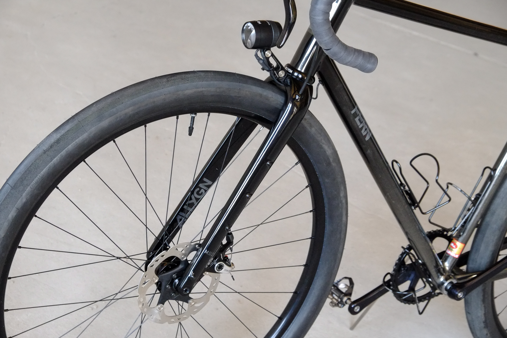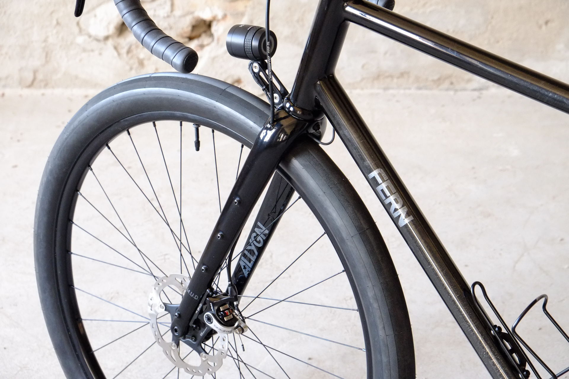 The bike is equipped with our brand new prototype Allygn M.U.D. carbon fork, which we completey designed and engineered here at Fern Bicycles. That fork gives you perfect clearance for tires up to 700cx55m, internal cable routing for SON hubdynamo and brake cable, all the mounts for fenders, anythingcages, lights, just everything. For more details go check our sister companies page www.allygn.de