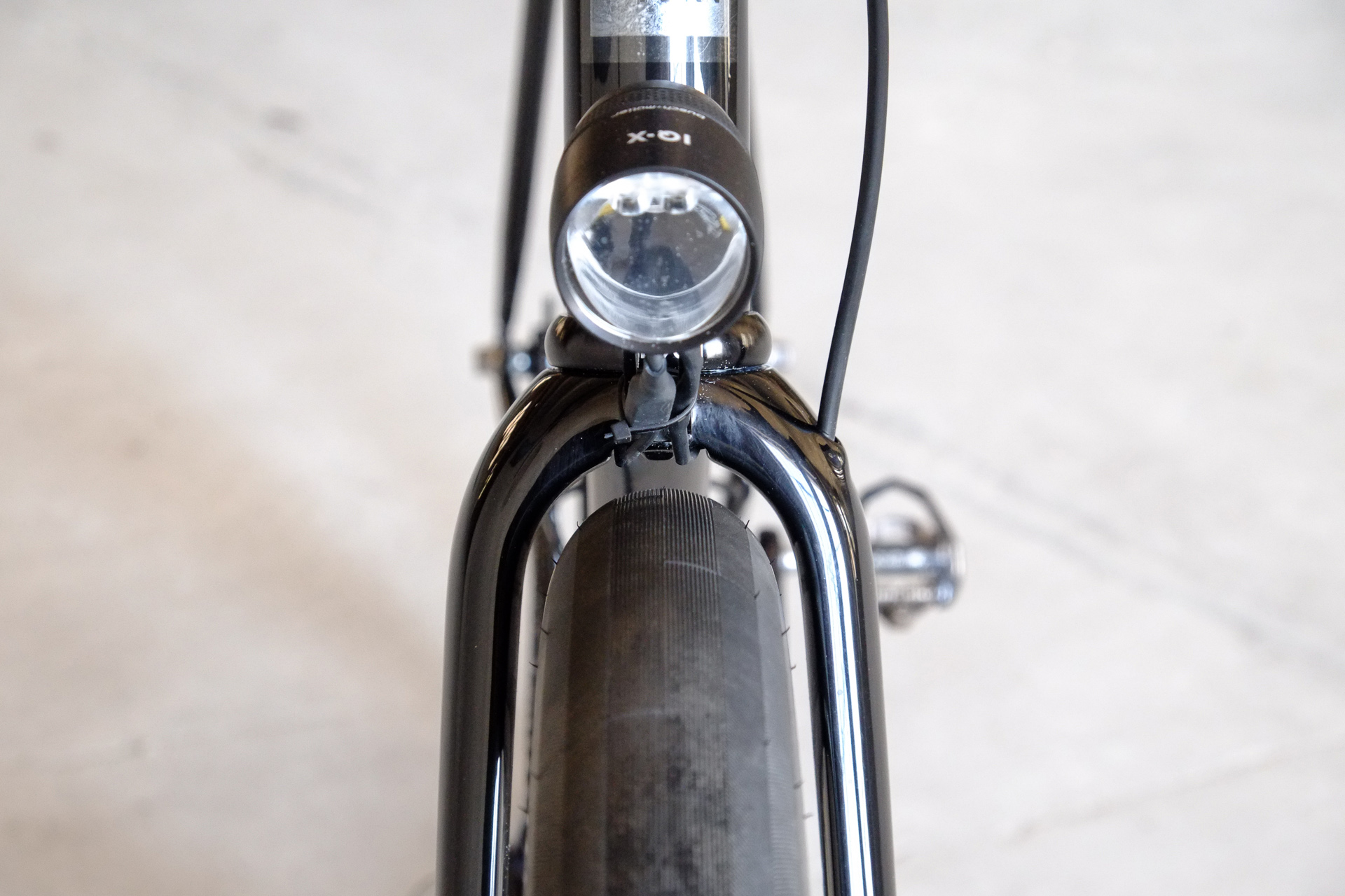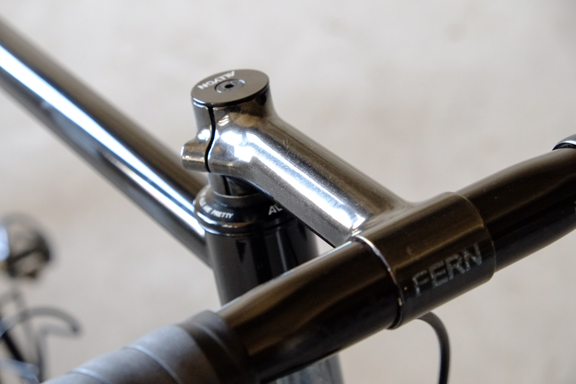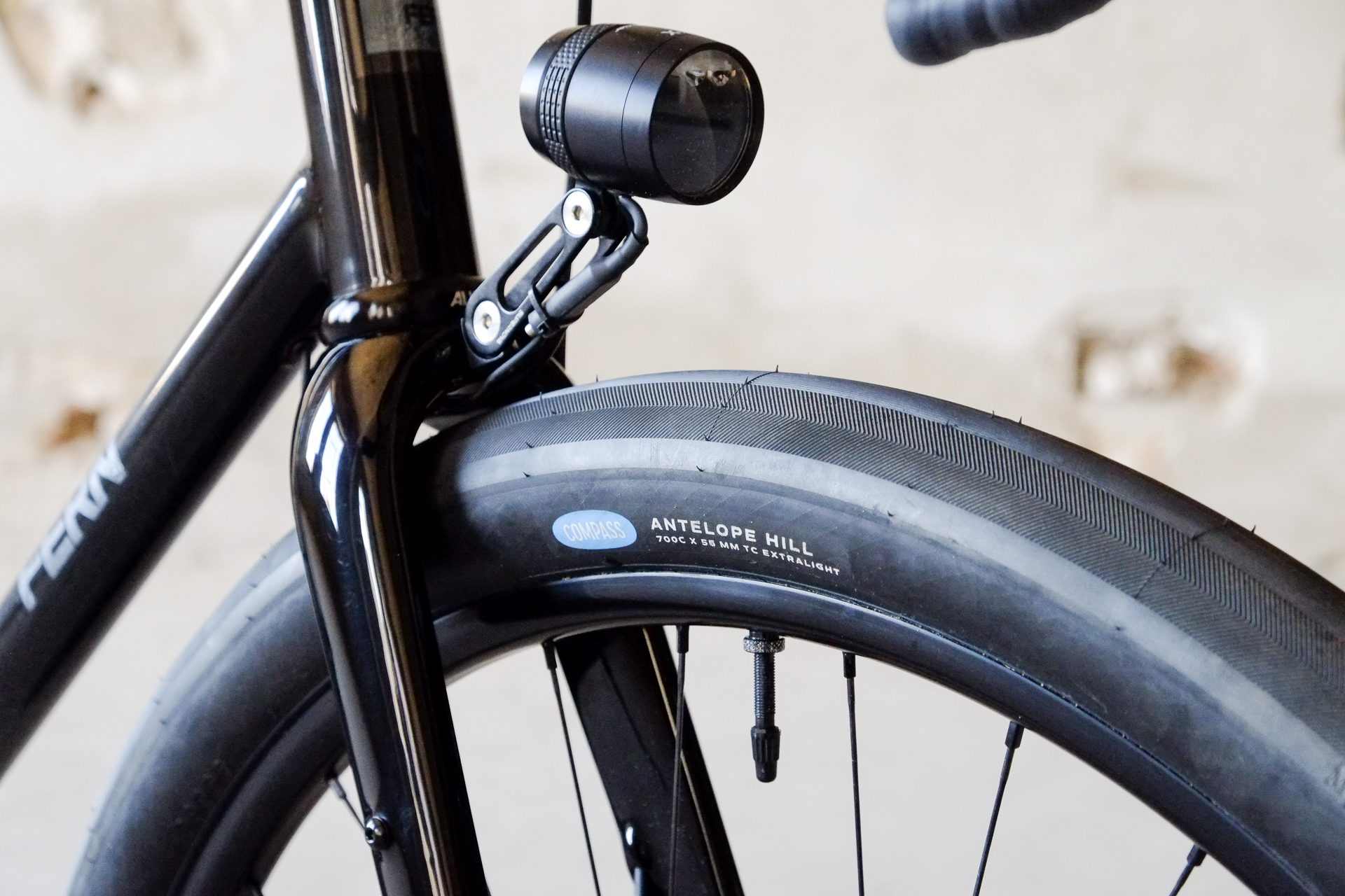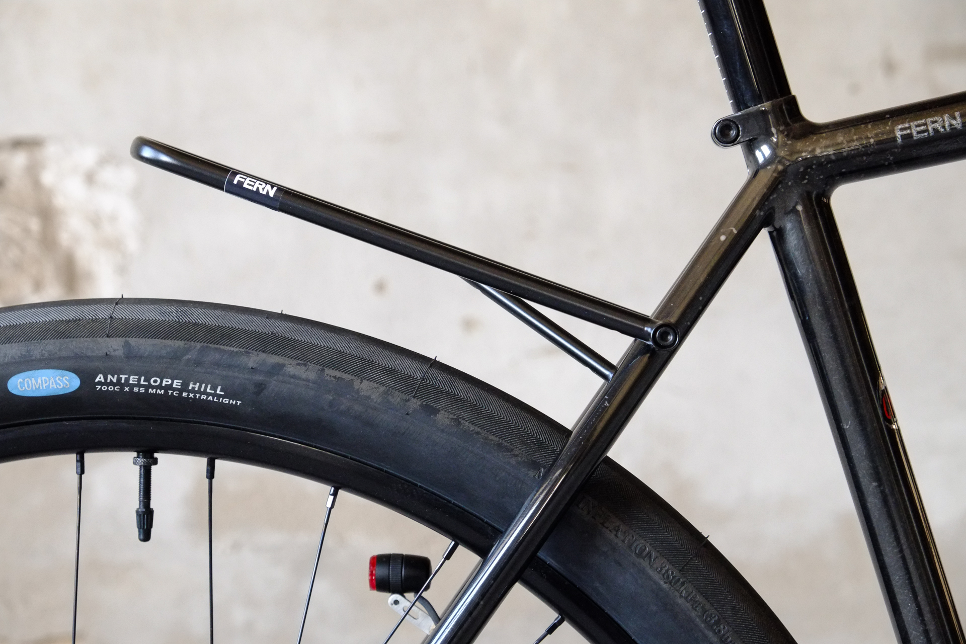The bike is equipped with our brand new prototype Allygn M.U.D. carbon fork, which we completey designed and engineered here at Fern Bicycles. That fork gives you perfect clearance for tires up to 700cx55m, internal cable routing for SON hubdynamo and brake cable, all the mounts for fenders, anythingcages, lights, just everything. For more details go check our sister companies page www.allygn.de