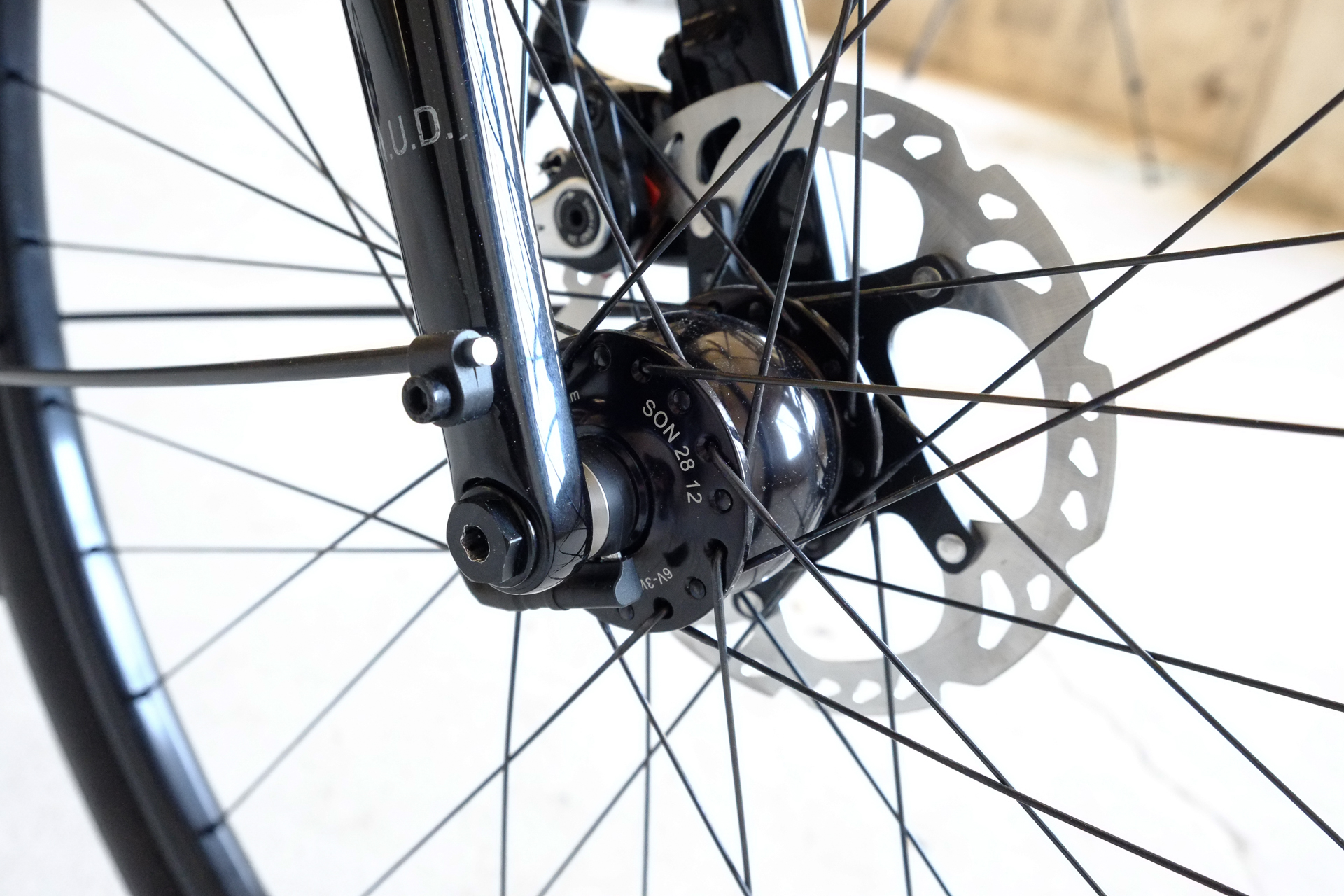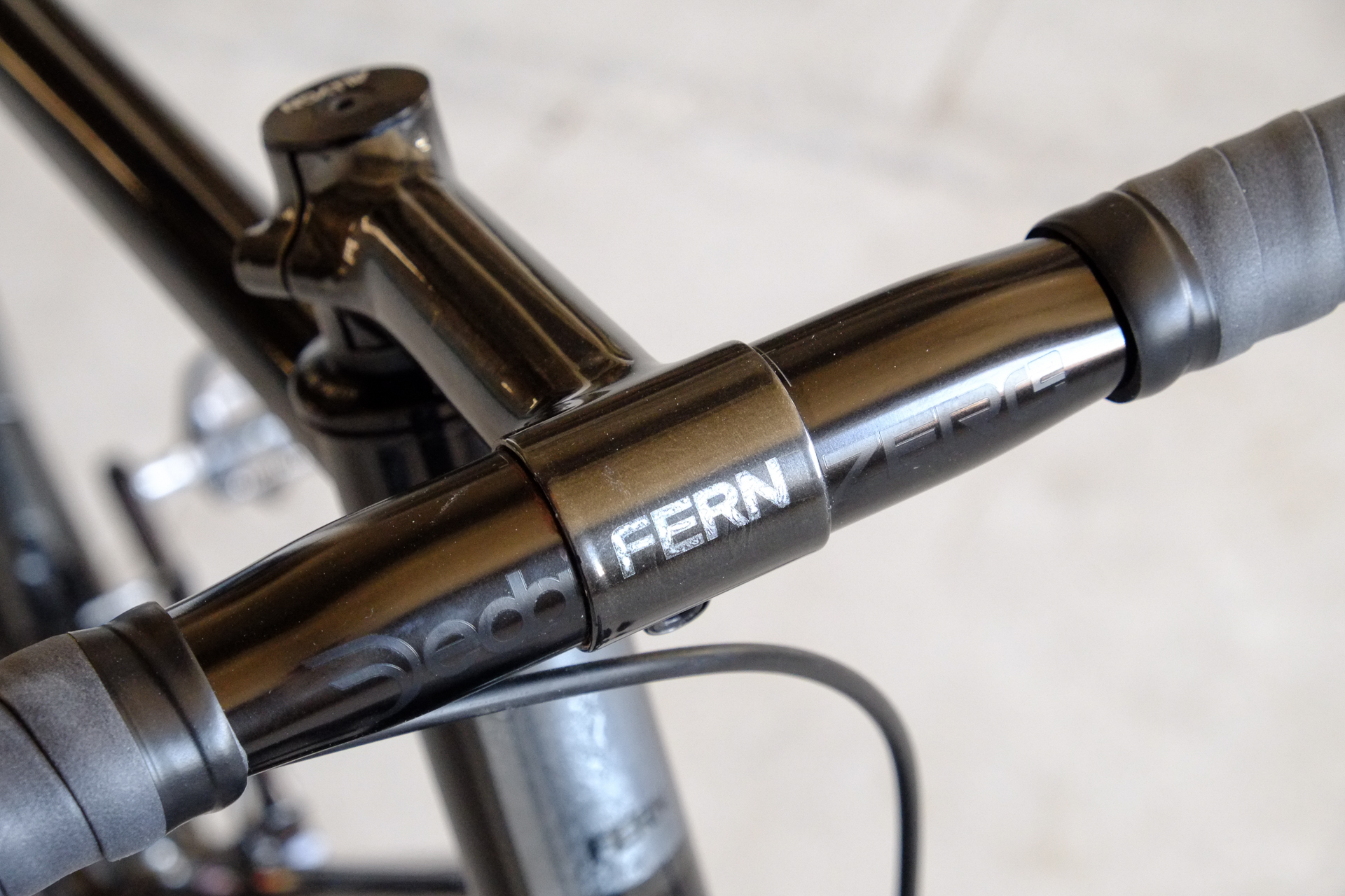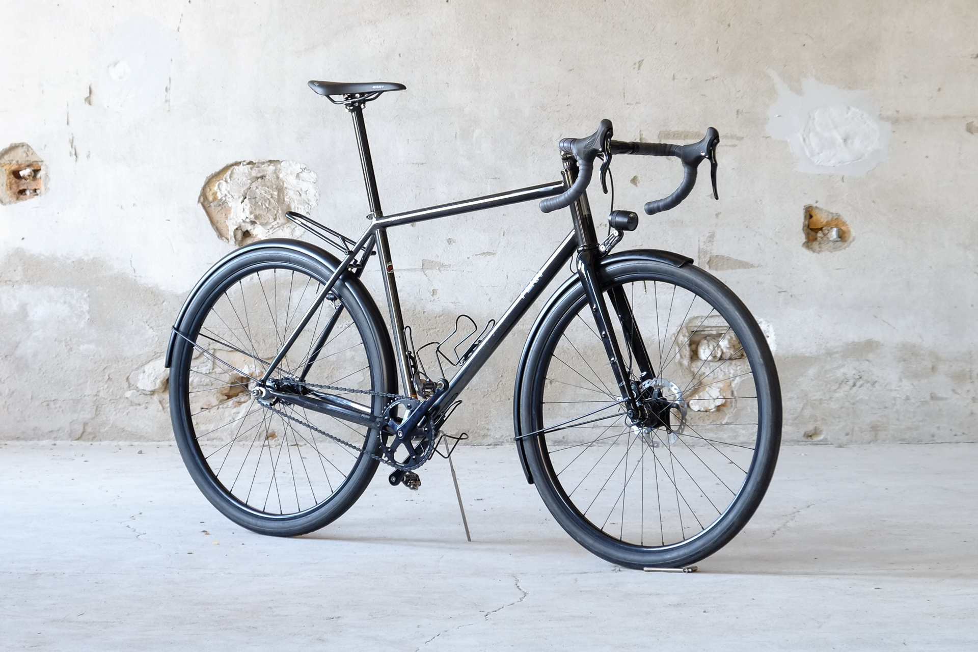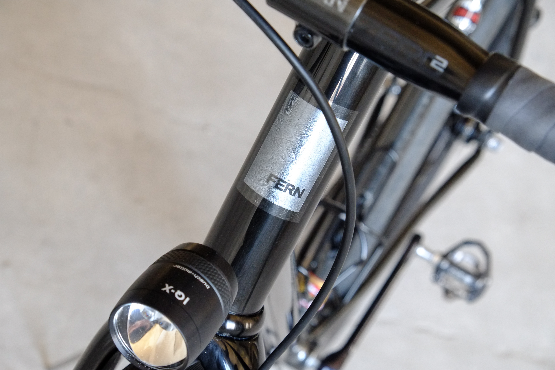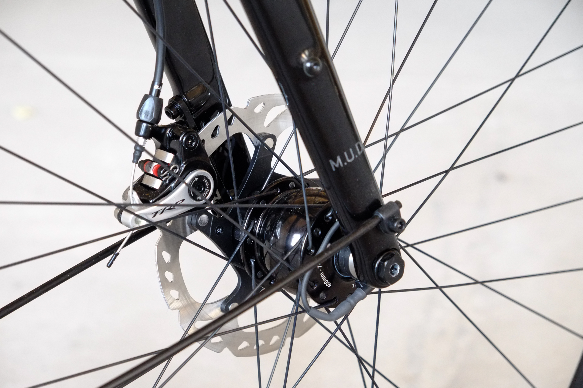 The bike is equipped with our brand new prototype Allygn M.U.D. carbon fork, which we completey designed and engineered here at Fern Bicycles. That fork gives you perfect clearance for tires up to 700cx55m, internal cable routing for SON hubdynamo and brake cable, all the mounts for fenders, anythingcages, lights, just everything. For more details go check our sister companies page www.allygn.de