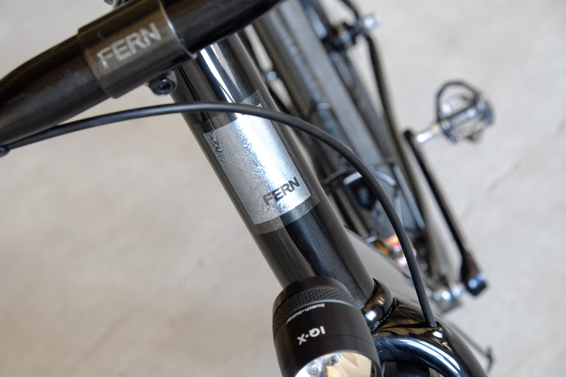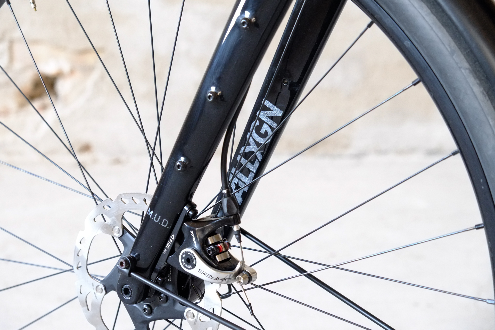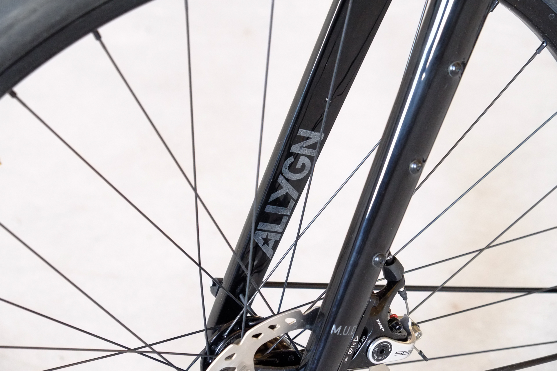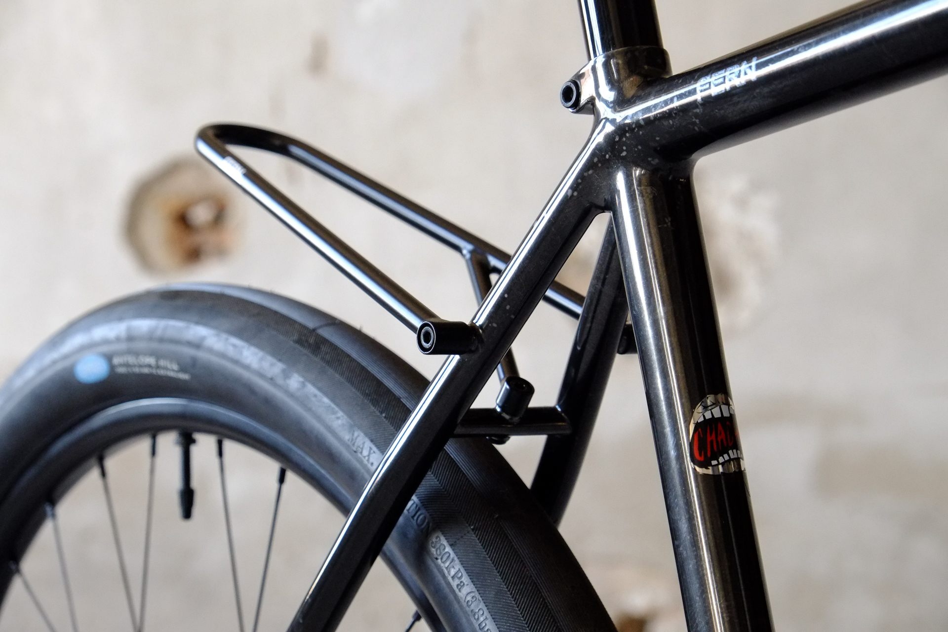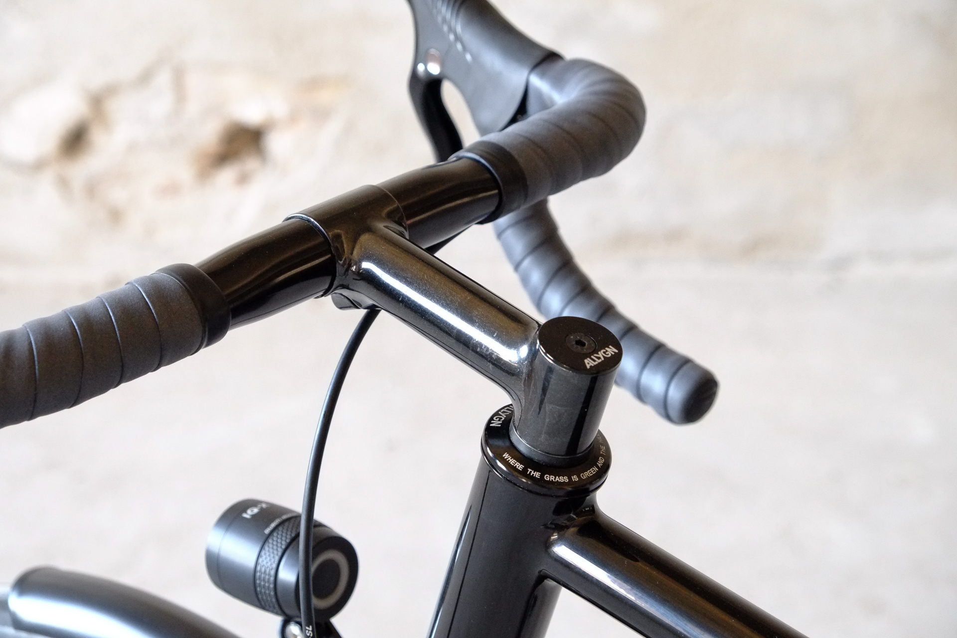 The bike is equipped with our brand new prototype Allygn M.U.D. carbon fork, which we completey designed and engineered here at Fern Bicycles. That fork gives you perfect clearance for tires up to 700cx55m, internal cable routing for SON hubdynamo and brake cable, all the mounts for fenders, anythingcages, lights, just everything. For more details go check our sister companies page www.allygn.de