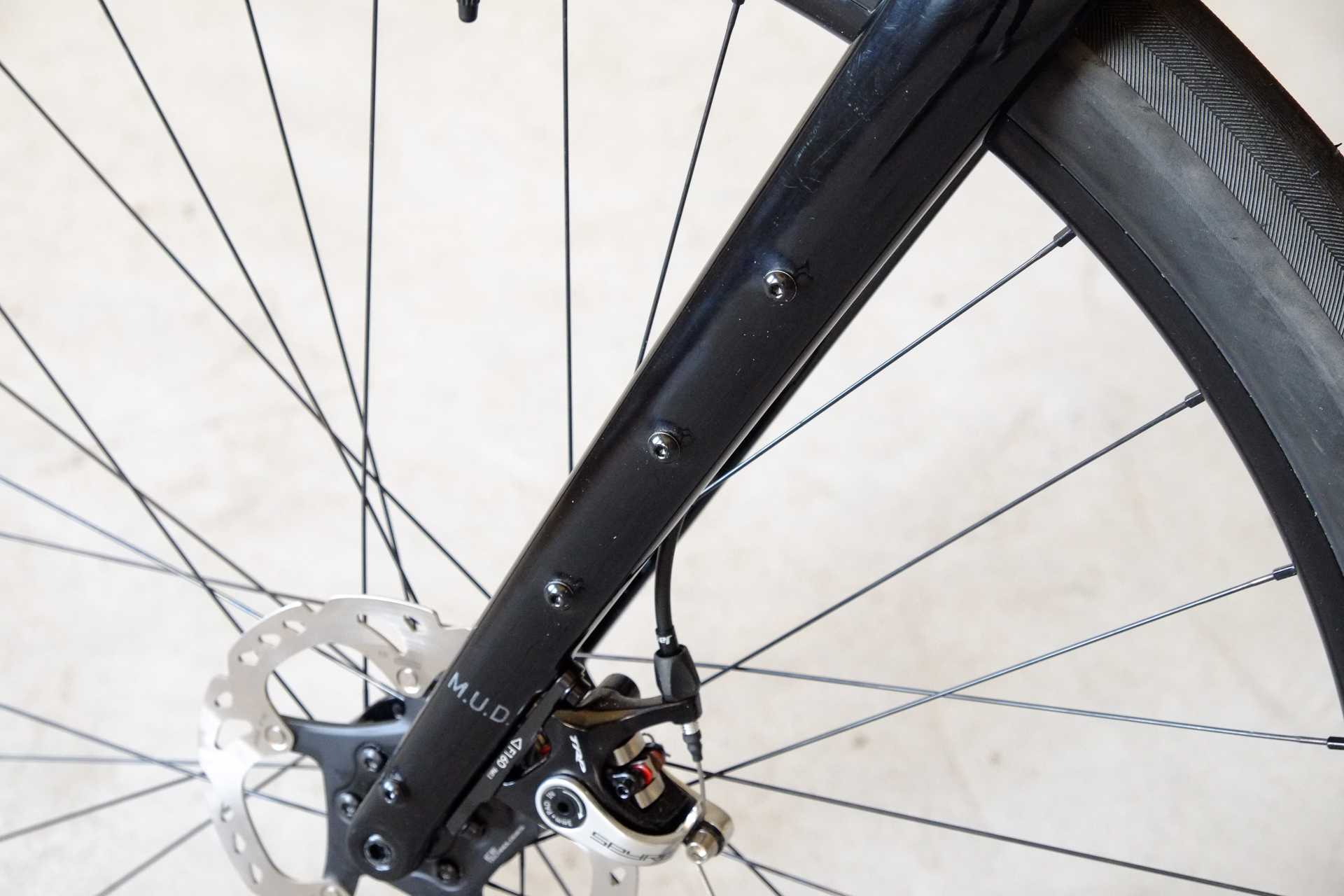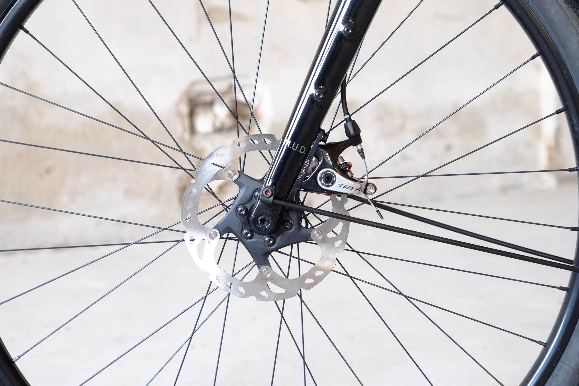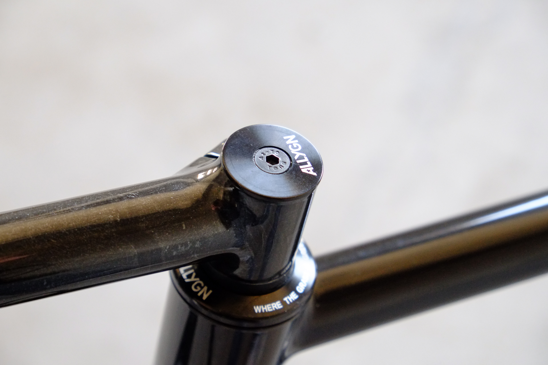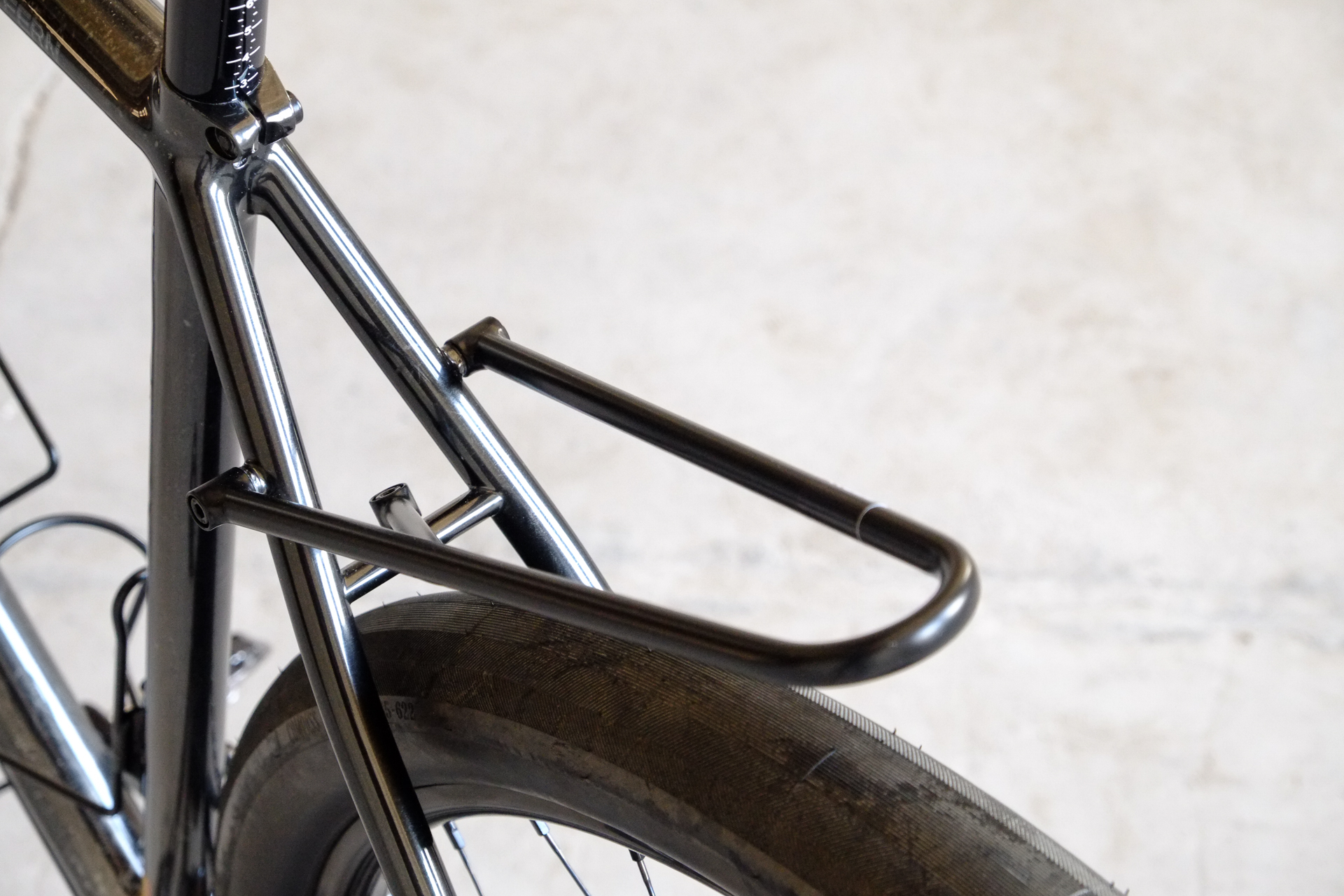 The bike is equipped with our brand new prototype Allygn M.U.D. carbon fork, which we completey designed and engineered here at Fern Bicycles. That fork gives you perfect clearance for tires up to 700cx55m, internal cable routing for SON hubdynamo and brake cable, all the mounts for fenders, anythingcages, lights, just everything. For more details go check our sister companies page www.allygn.de