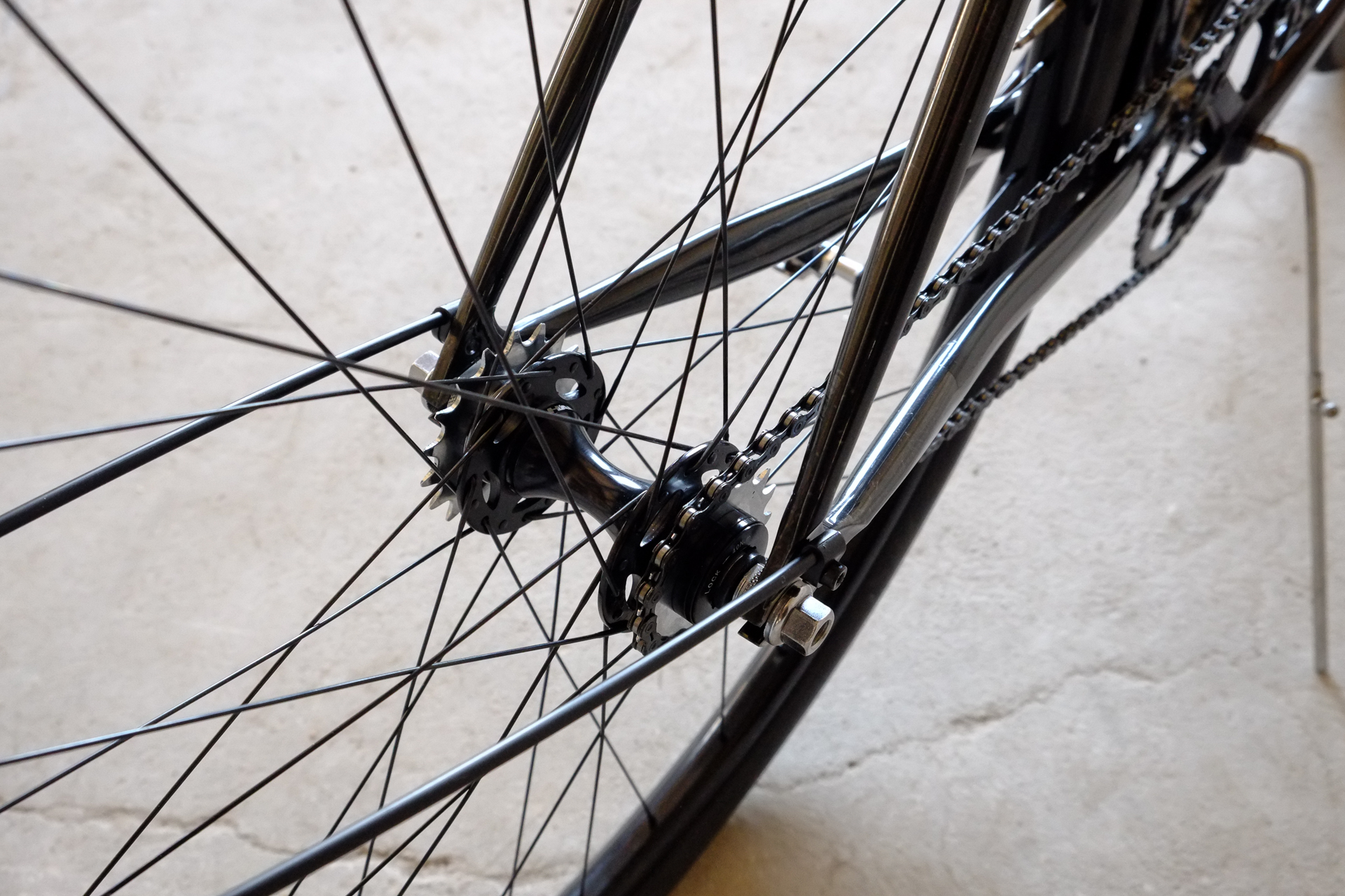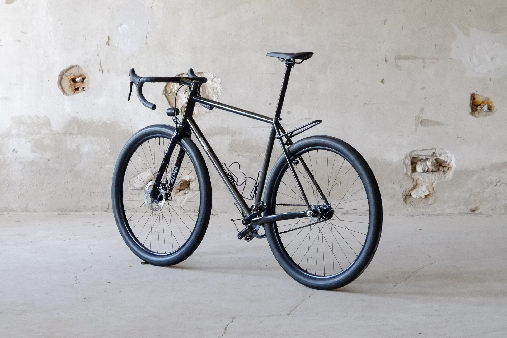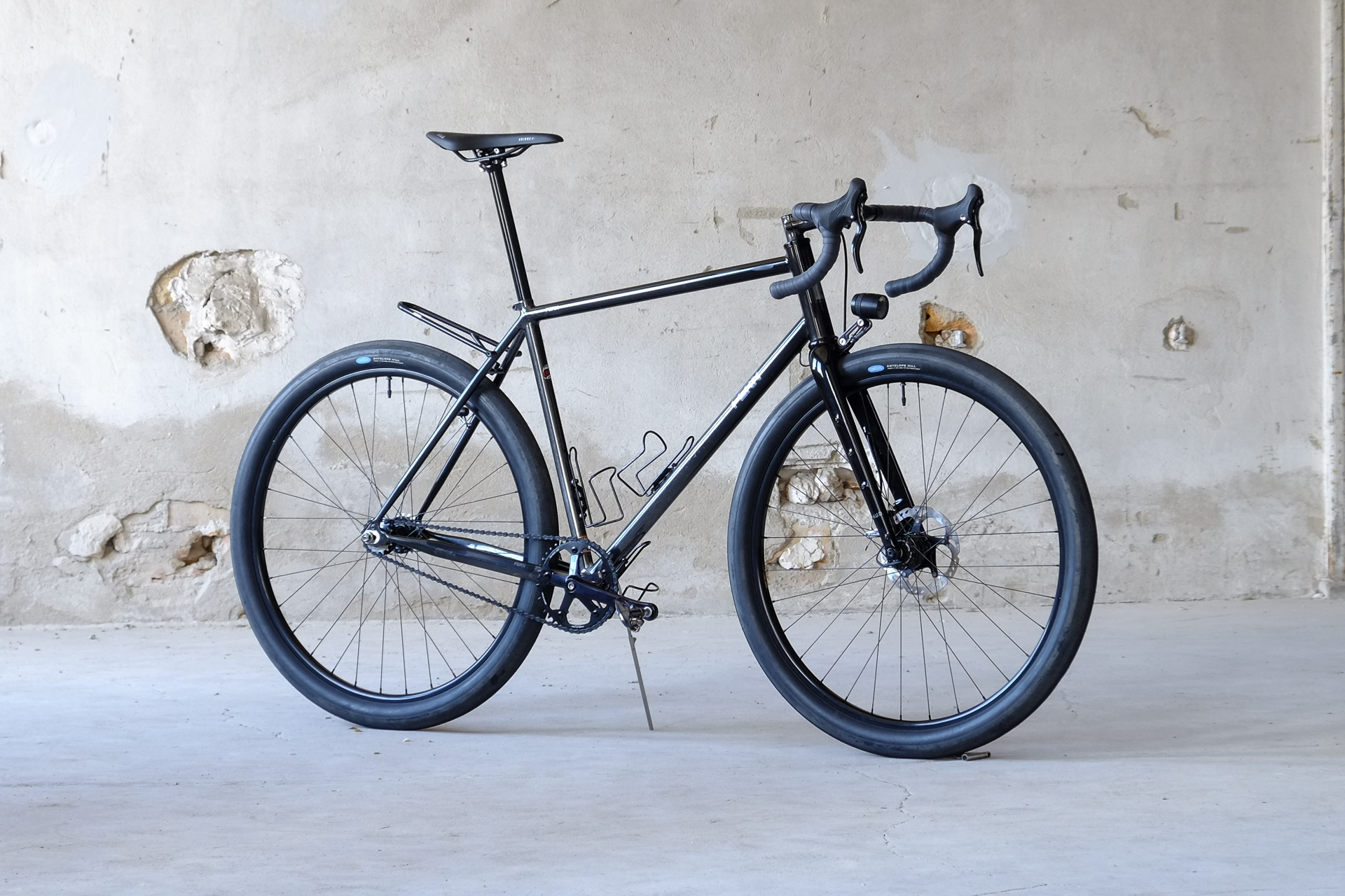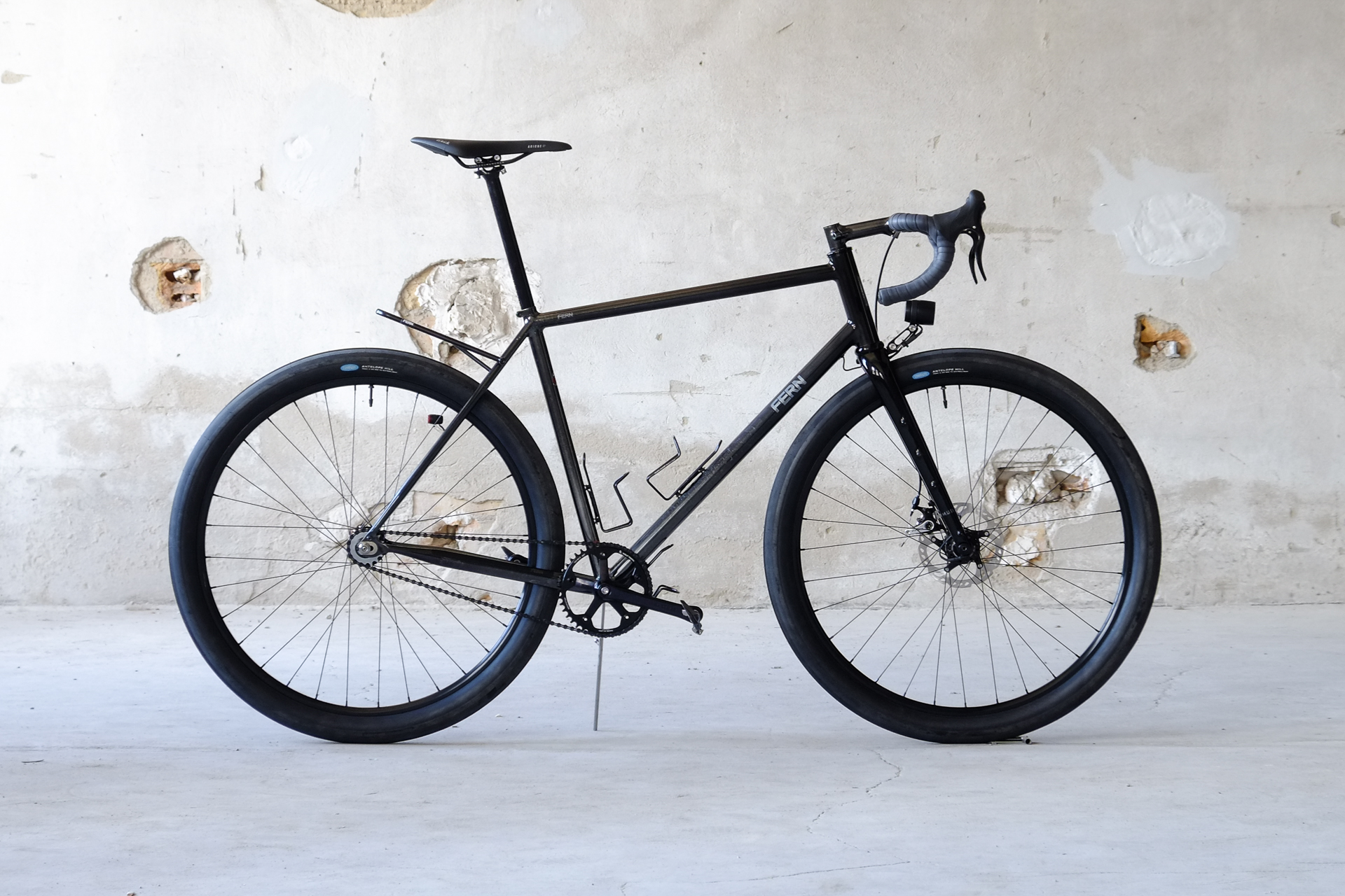 My good friend and best working mate ever Paul finally manged to design and build himself his long awaited dream bike. A type of bike which as far as I know does not exist yet. It is a flip flop fixed fixed gear offroad / gravel bike for really tough riding, equipped with Rene Herse super fat 700cx55mm Antelope Pass Tires which will allow you to float over any kind of terrain with ease. As soon the winter season starts and bad weather is coming, just swap the wheels, install the Gilles Berthoud fenders and you run fast and comfy on 44mm Snoqualmie Pass tires. This makes for the perfect commuter bike and winter training machine, helping to keep that spin in your legs and get ready for the next season.