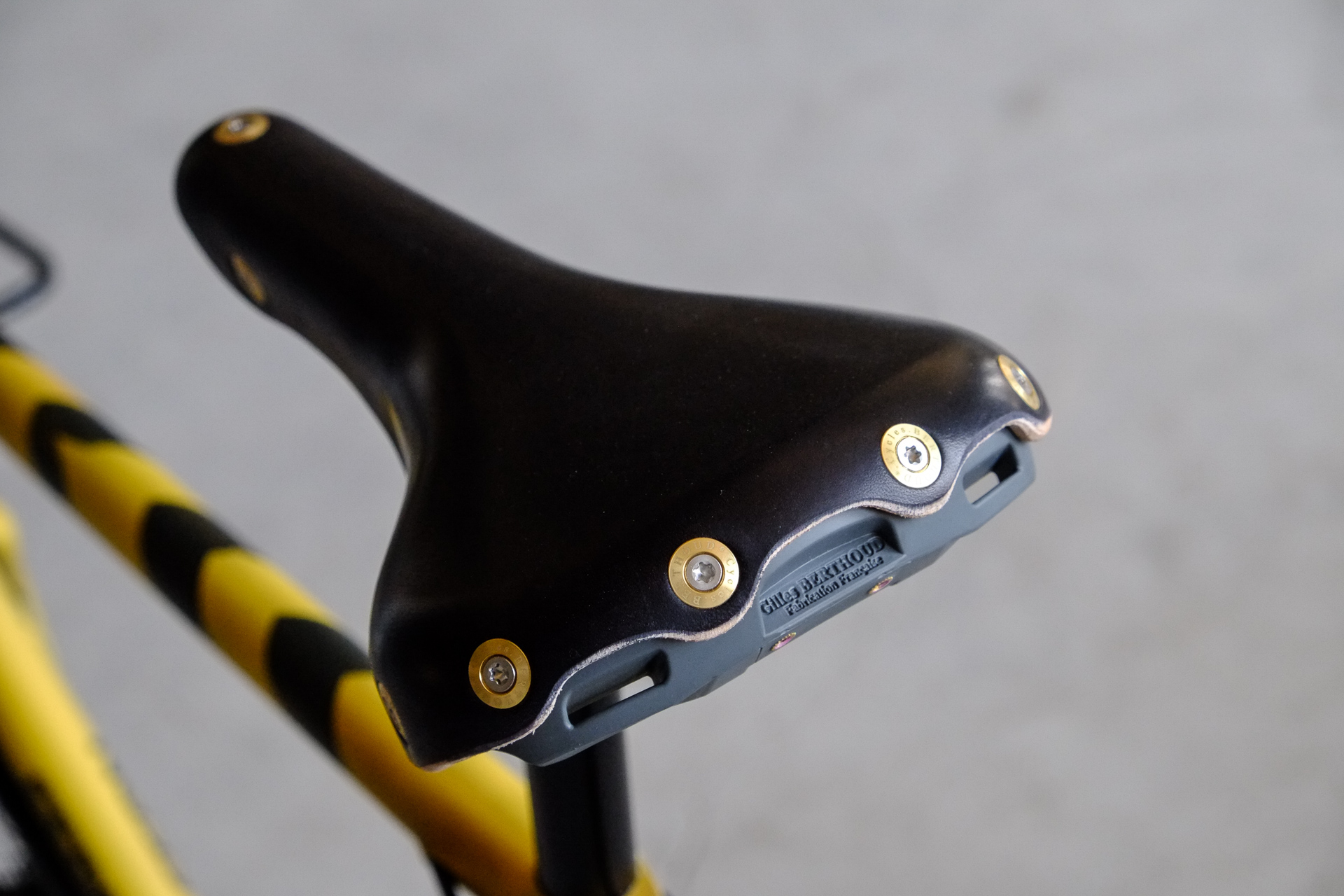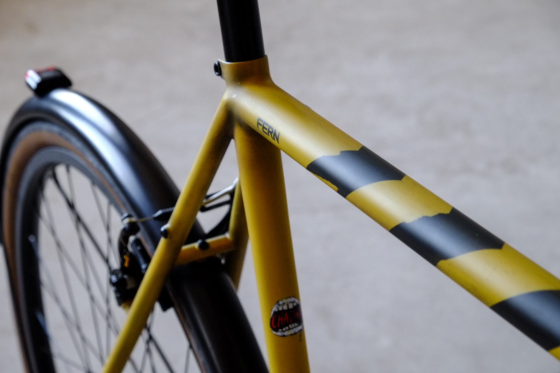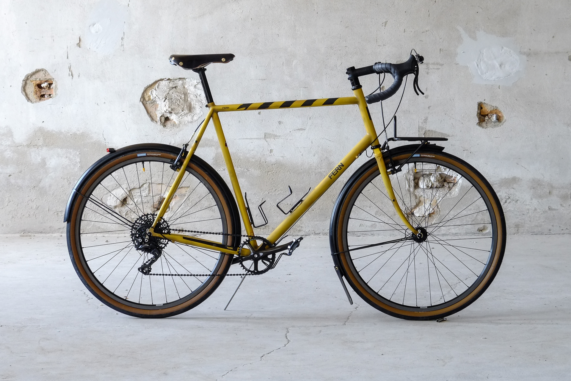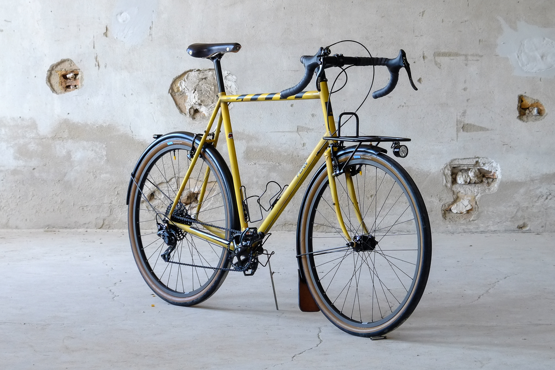 This bike is featuring a randonneur bike geometry, and is as always rolling super smooth on supple Rene Herse 44mm Snoqualmie Pass tires. Maximum speed and absolutely superior comfort on any kind of terrain, no matter if you go for racing on asphalt or for fun gravelriding off the road, the Chico 28 can do it all. The bike is equipped with a Gevenalle powered 1x11 Shimano drivetrain turned by a Wolftooth Drop Stop chainring mounted to a Sugino crank set. Fenders, Saddle and Mudflap made by our friends at Berthoud Cycles. Lights and power supply by SON , "Schmidt's Original Nabendynamo". Handmade frontrack by Fern. Let's hope earth's future will be brighter than in the movie and with this bike you found your big love Ruben!